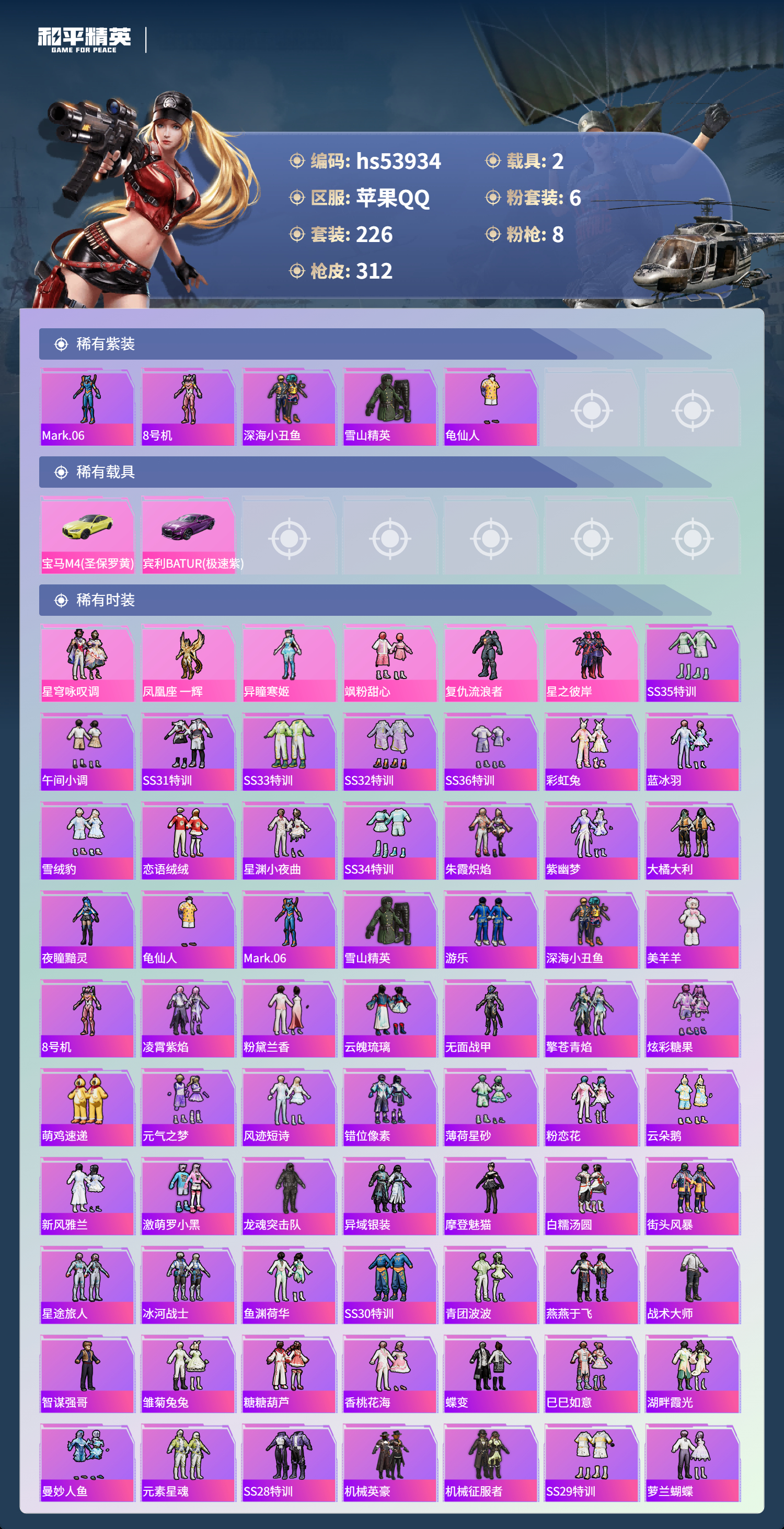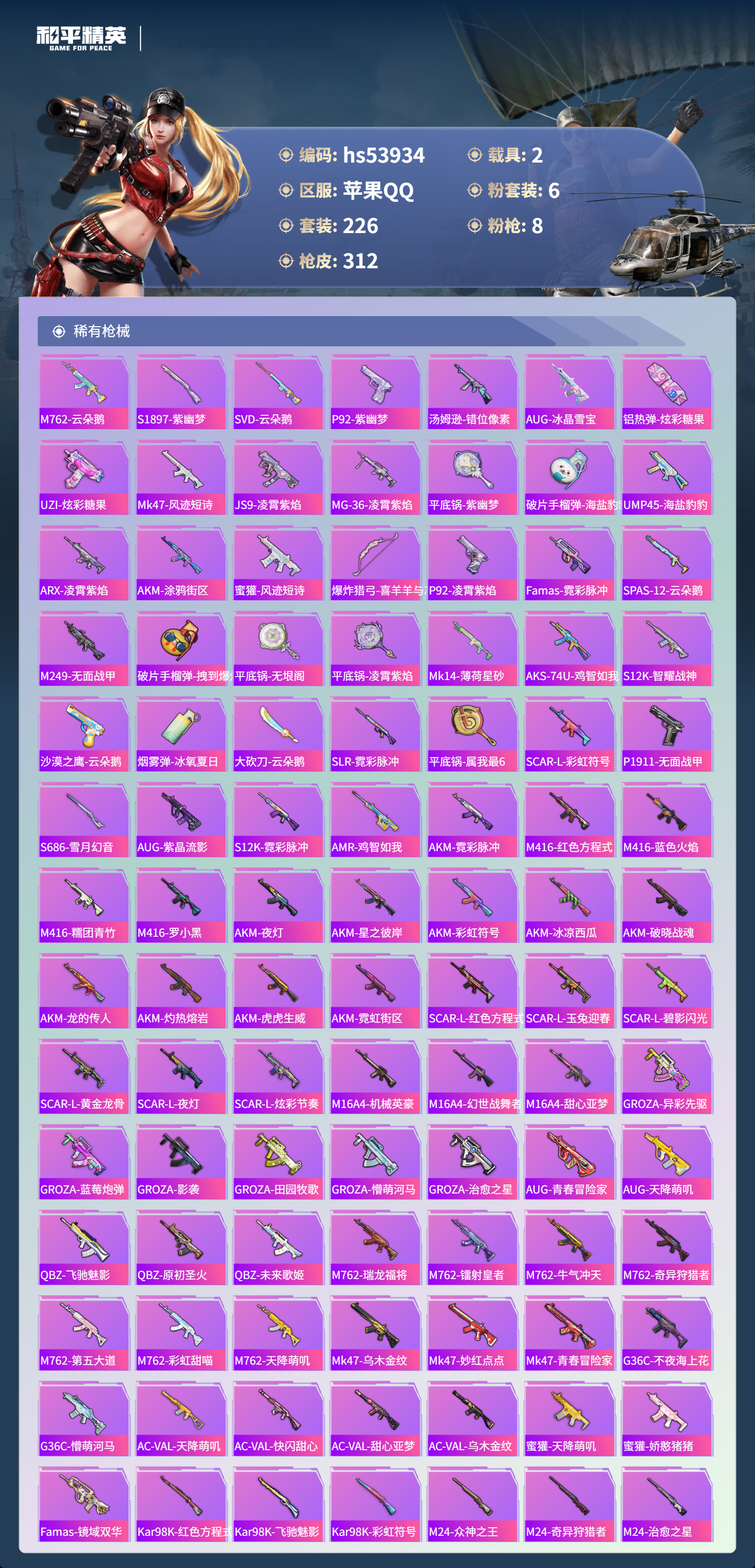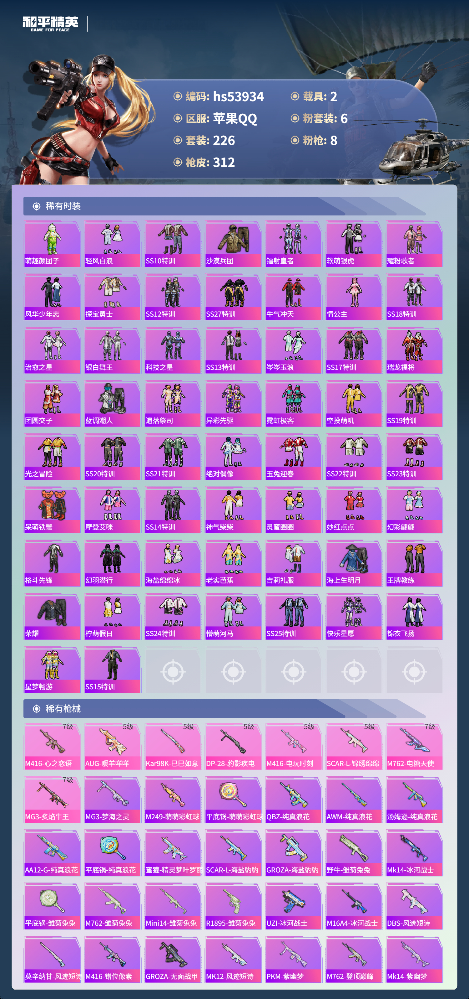 hs53934 苹果手q-24王牌印记-有战神框-6粉装-8特效呛-2载具-热力值-226套装-312呛皮-11卓越印记-10传奇印记【6粉装】套装-星之彼岸套装-飒粉甜心角色-凤凰座 一辉角色-异瞳寒姬角色-复仇流浪者套装-星穹咏叹调【8特效呛】m416-心之恋语/7级aug-暖羊咩咩/5级m416-电玩时刻/5级scar-l-锦绣绵绵/5级dp-28-豹影疾电