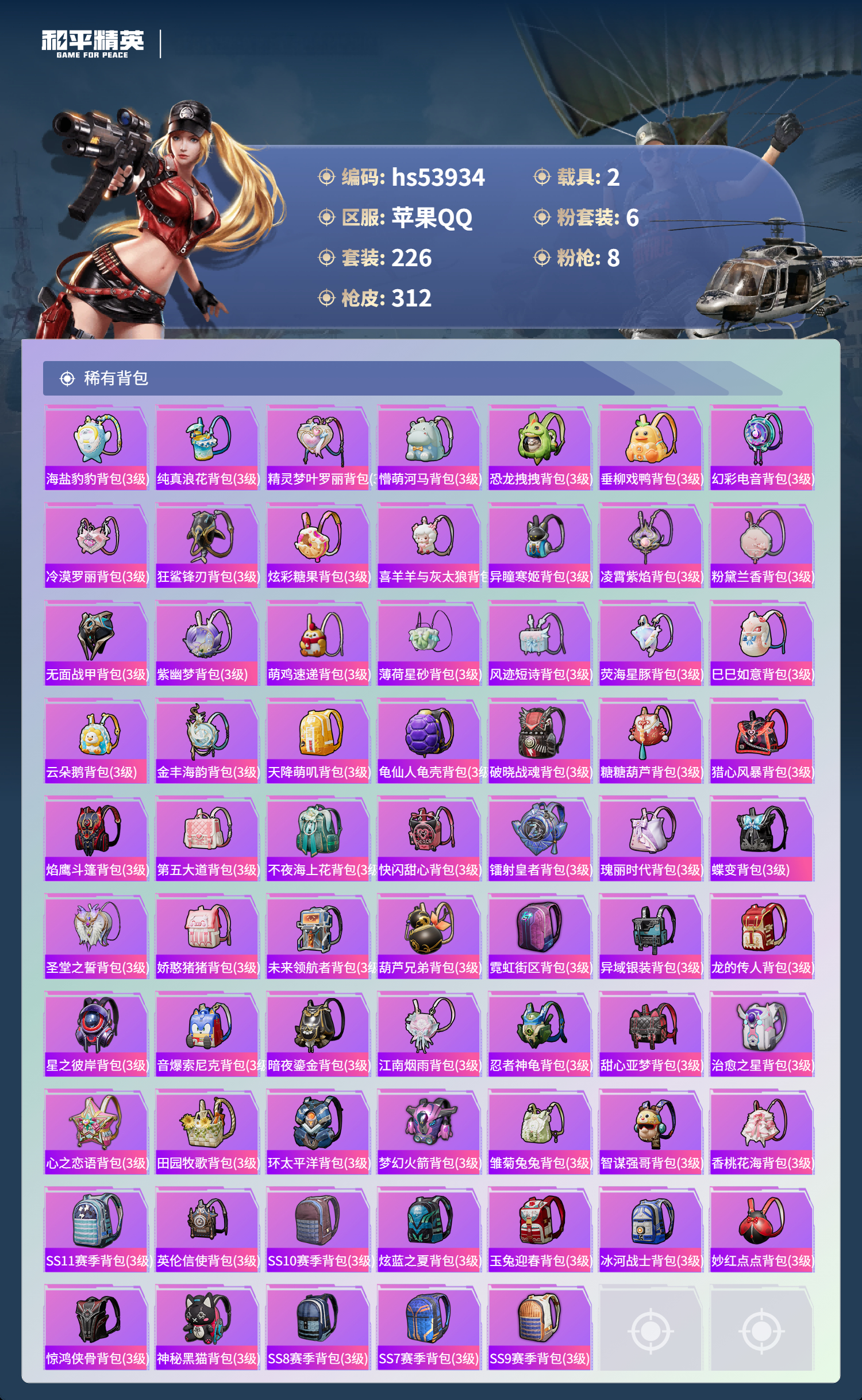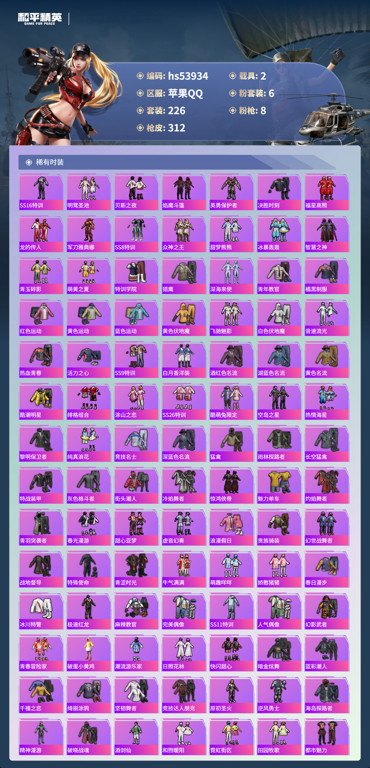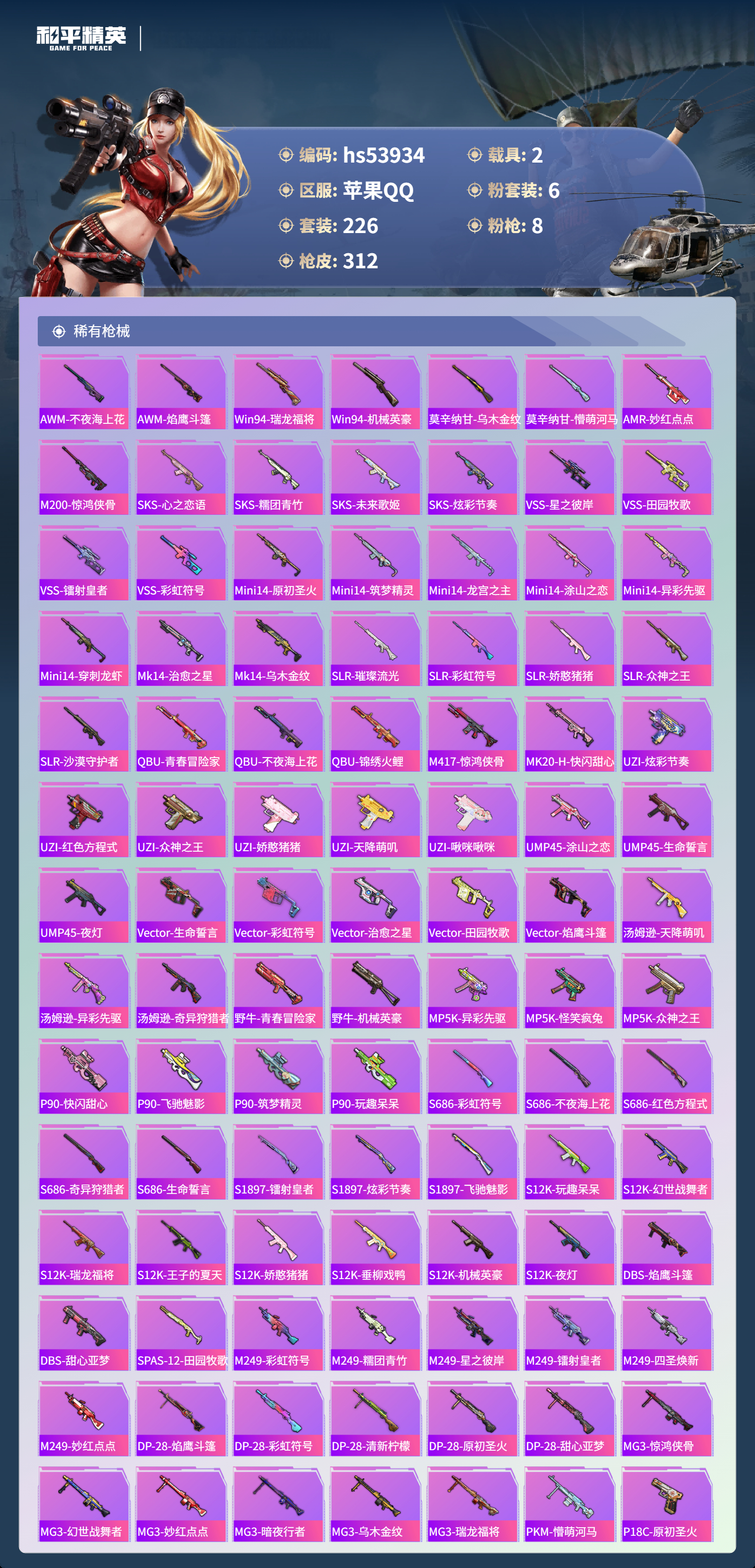 hs53934 苹果手q-24王牌印记-有战神框-6粉装-8特效呛-2载具-热力值-226套装-312呛皮-11卓越印记-10传奇印记【6粉装】套装-星之彼岸套装-飒粉甜心角色-凤凰座 一辉角色-异瞳寒姬角色-复仇流浪者套装-星穹咏叹调【8特效呛】m416-心之恋语/7级aug-暖羊咩咩/5级m416-电玩时刻/5级scar-l-锦绣绵绵/5级dp-28-豹影疾电