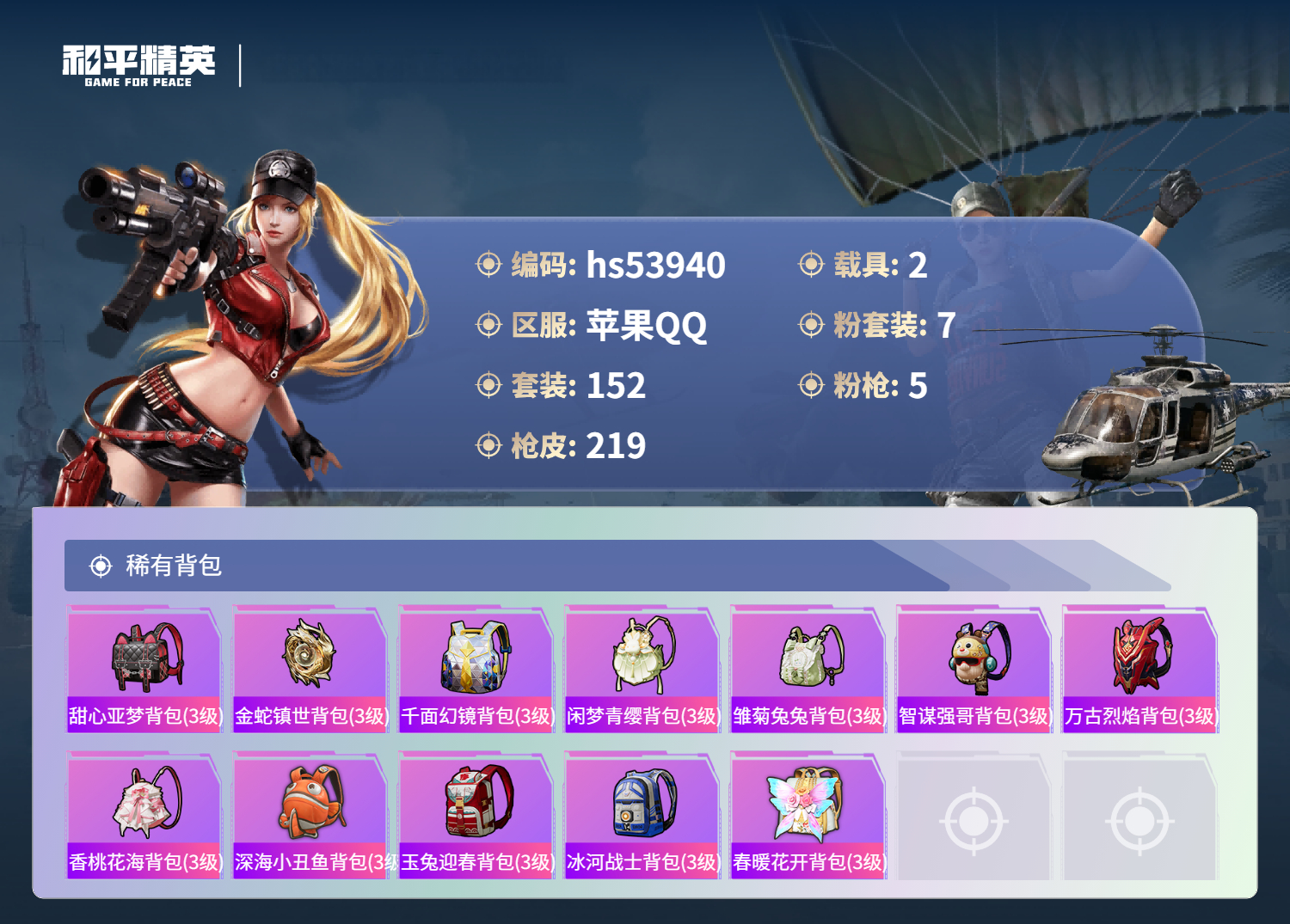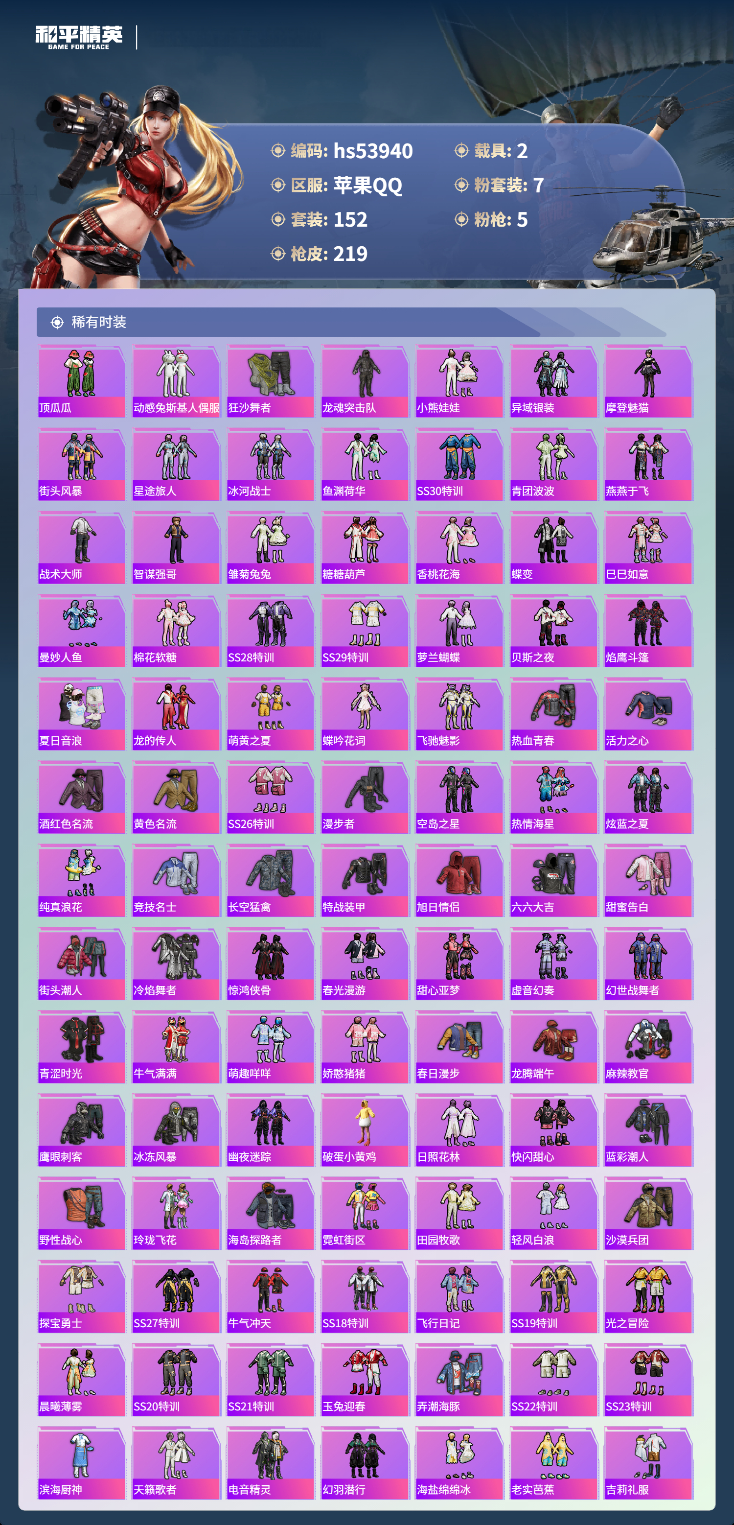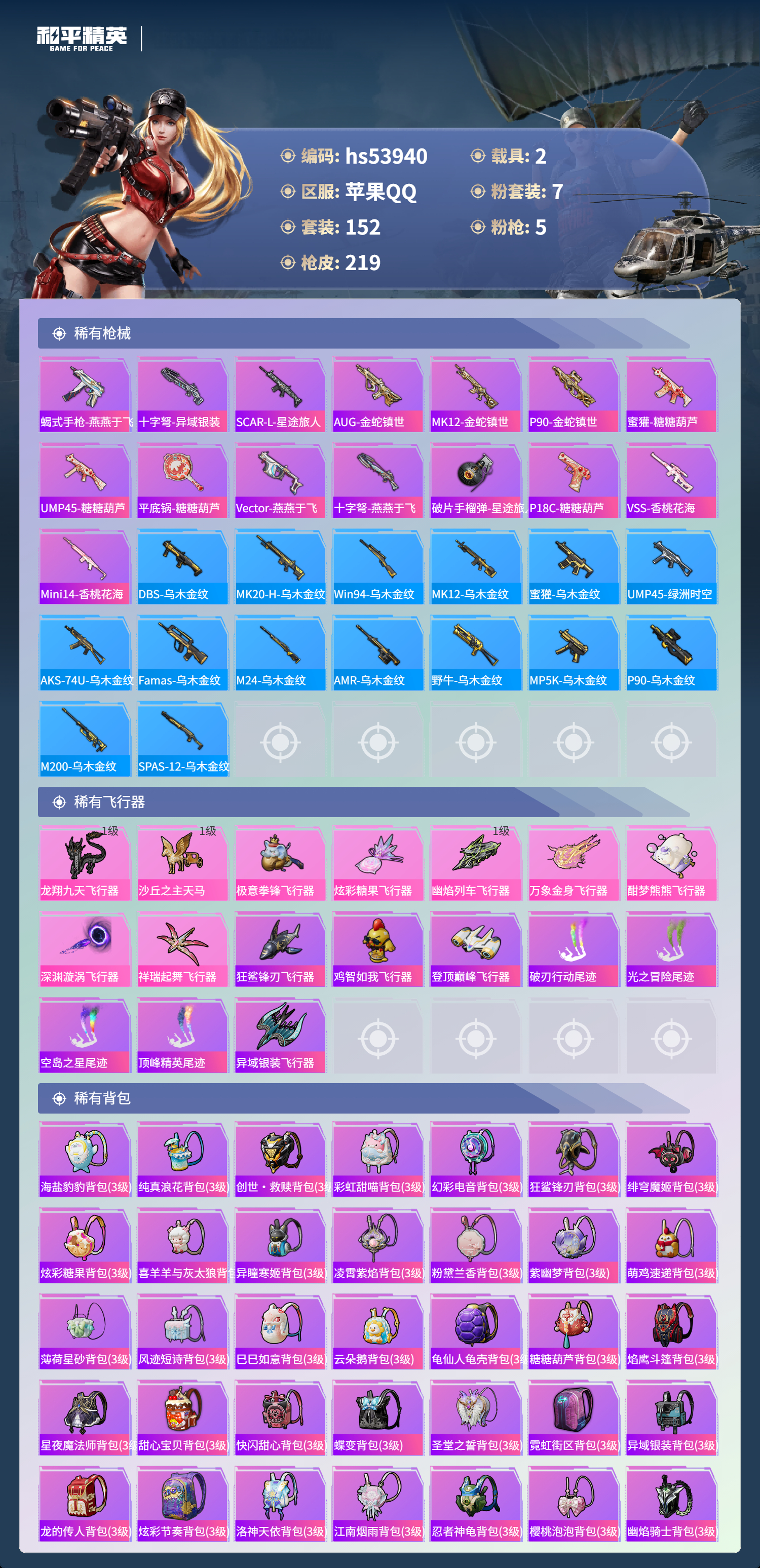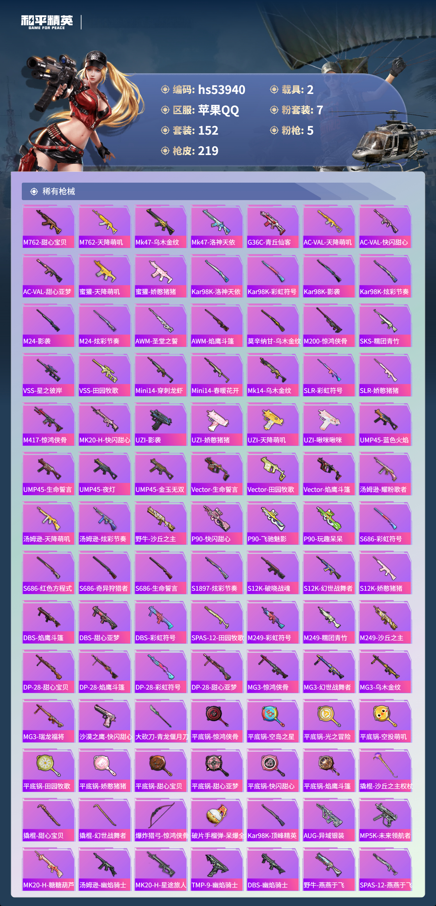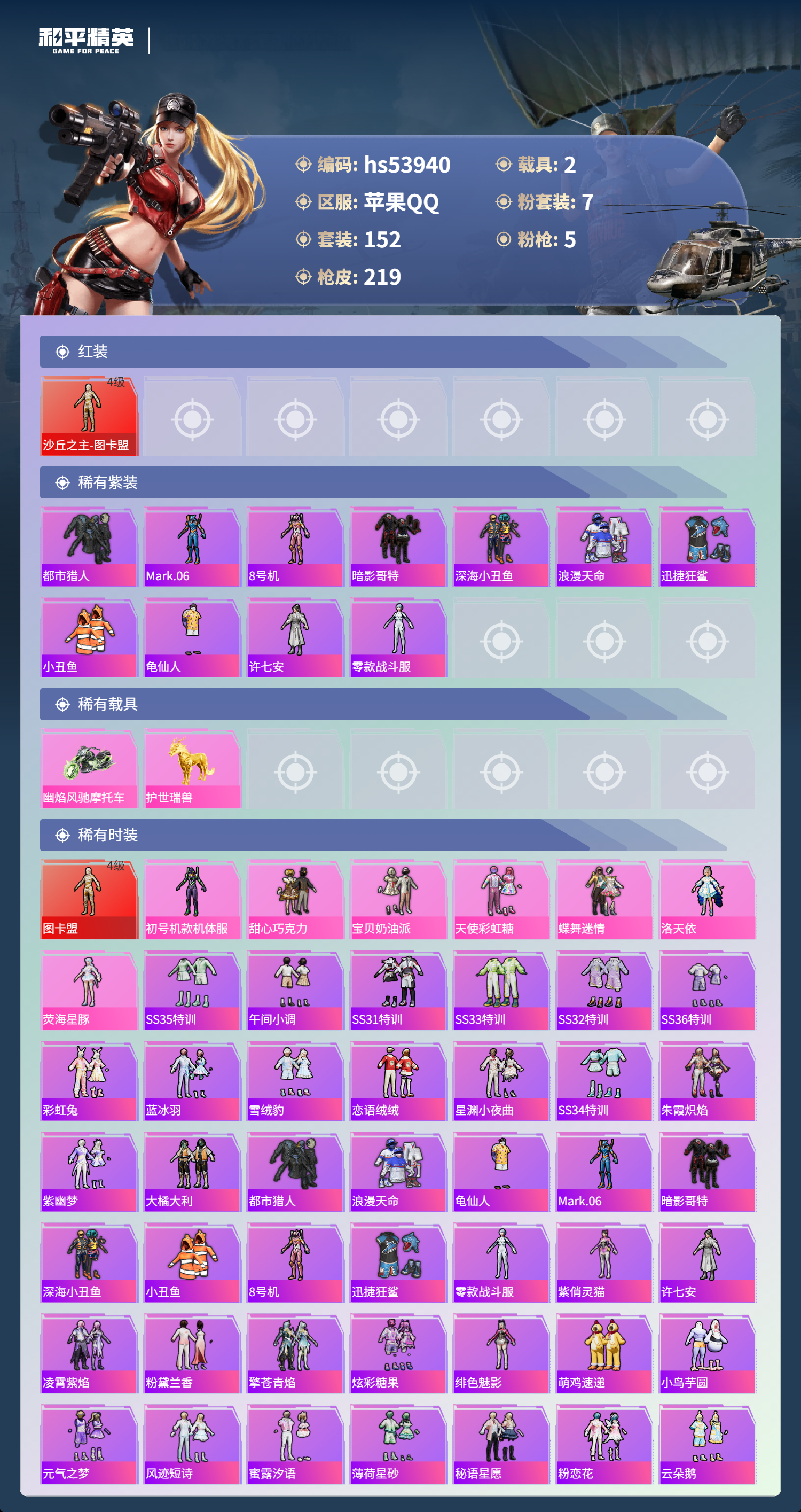hs53940 苹果手q-16王牌印记-1红装-7粉装-5特效呛-2载具-73281热力值-152套装-219呛皮【1红装】沙丘之主-图卡盟/4级【7粉装】角色-荧海星豚角色-洛天依套装-天使彩虹糖角色-初号机款机体服套装-甜心巧克力套装-宝贝奶油派套装-蝶舞迷情【5特效呛】m416-心之恋语/7级dp-28-豹影疾电/5级akm-幽焰骑士/3级ump45-宇宙意志/3级