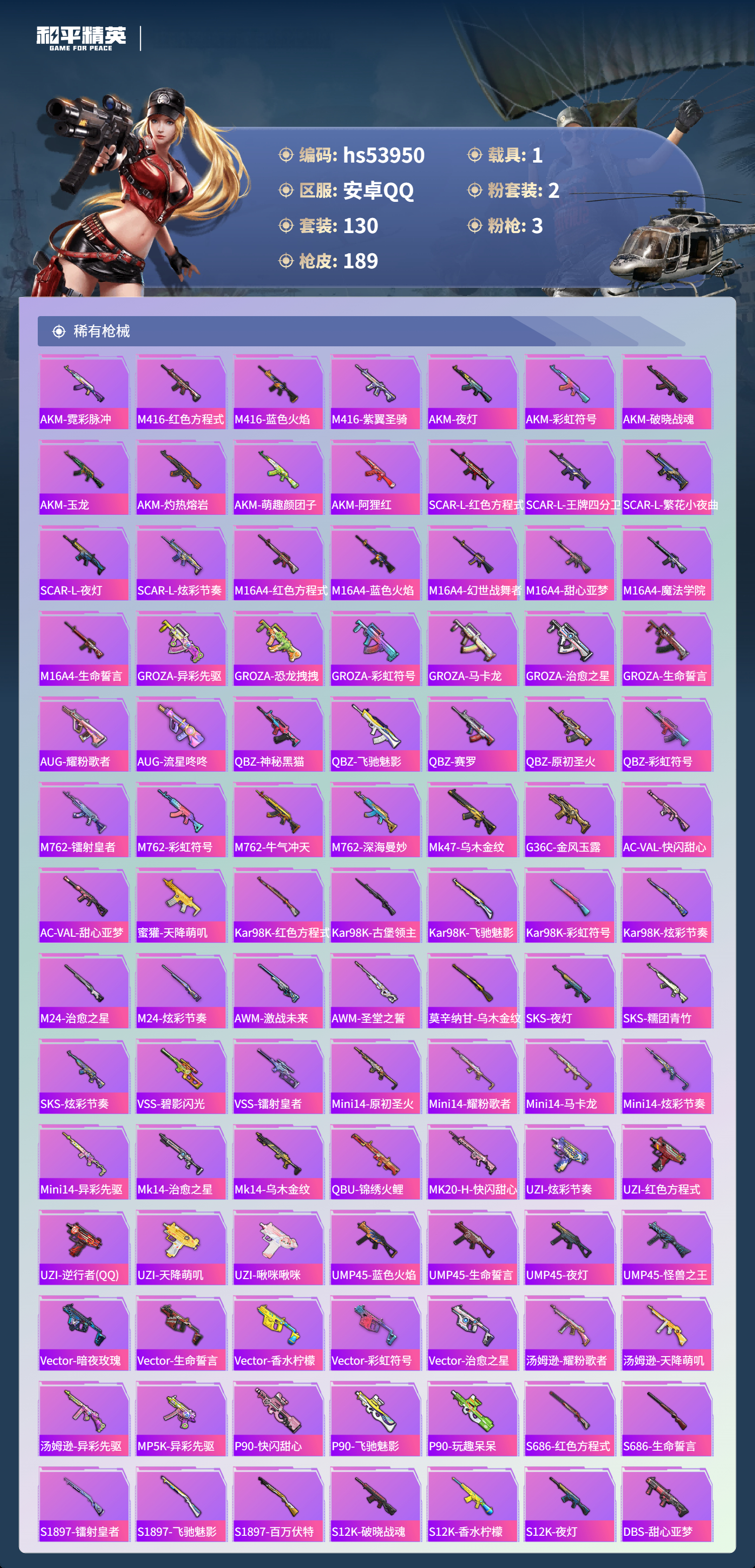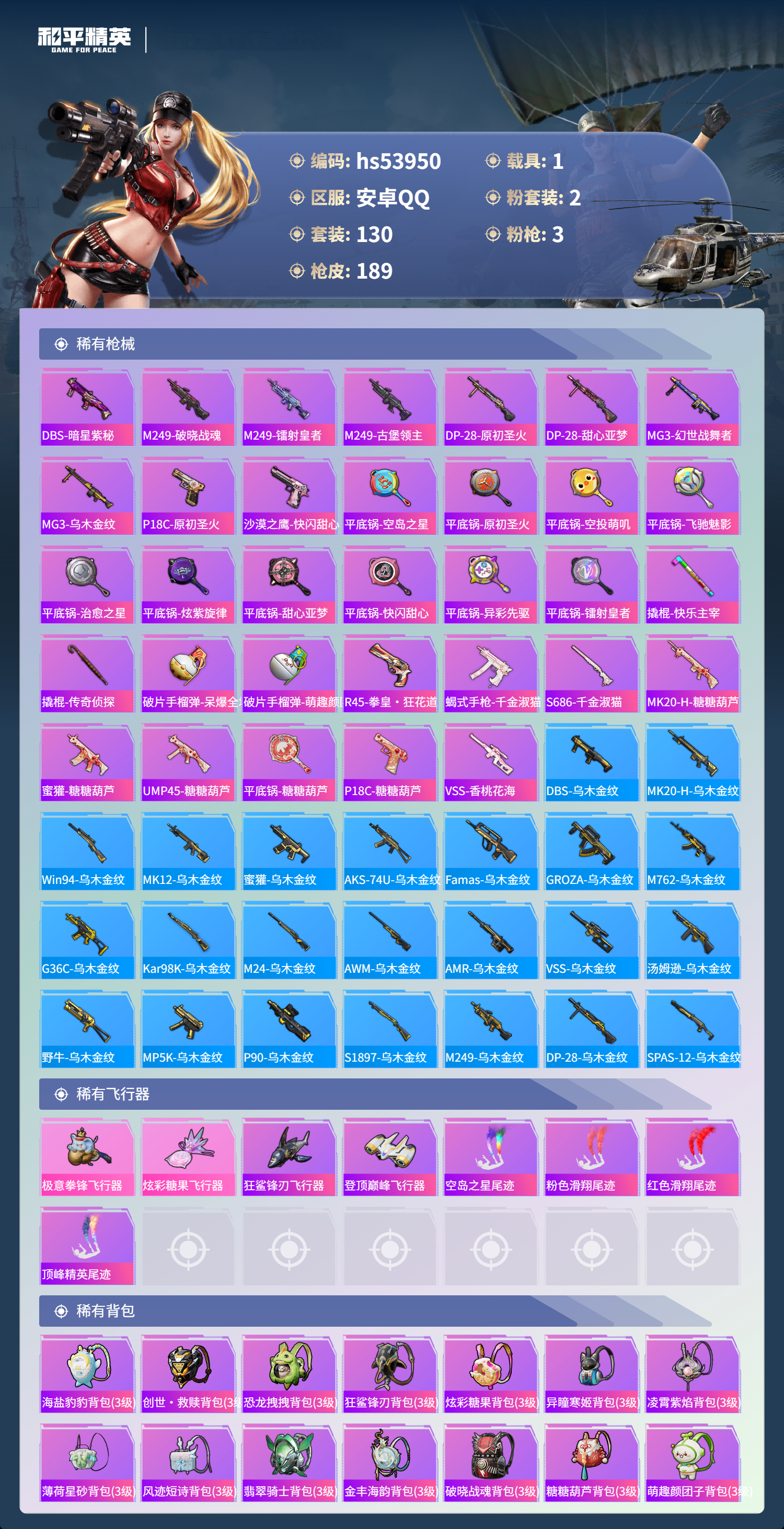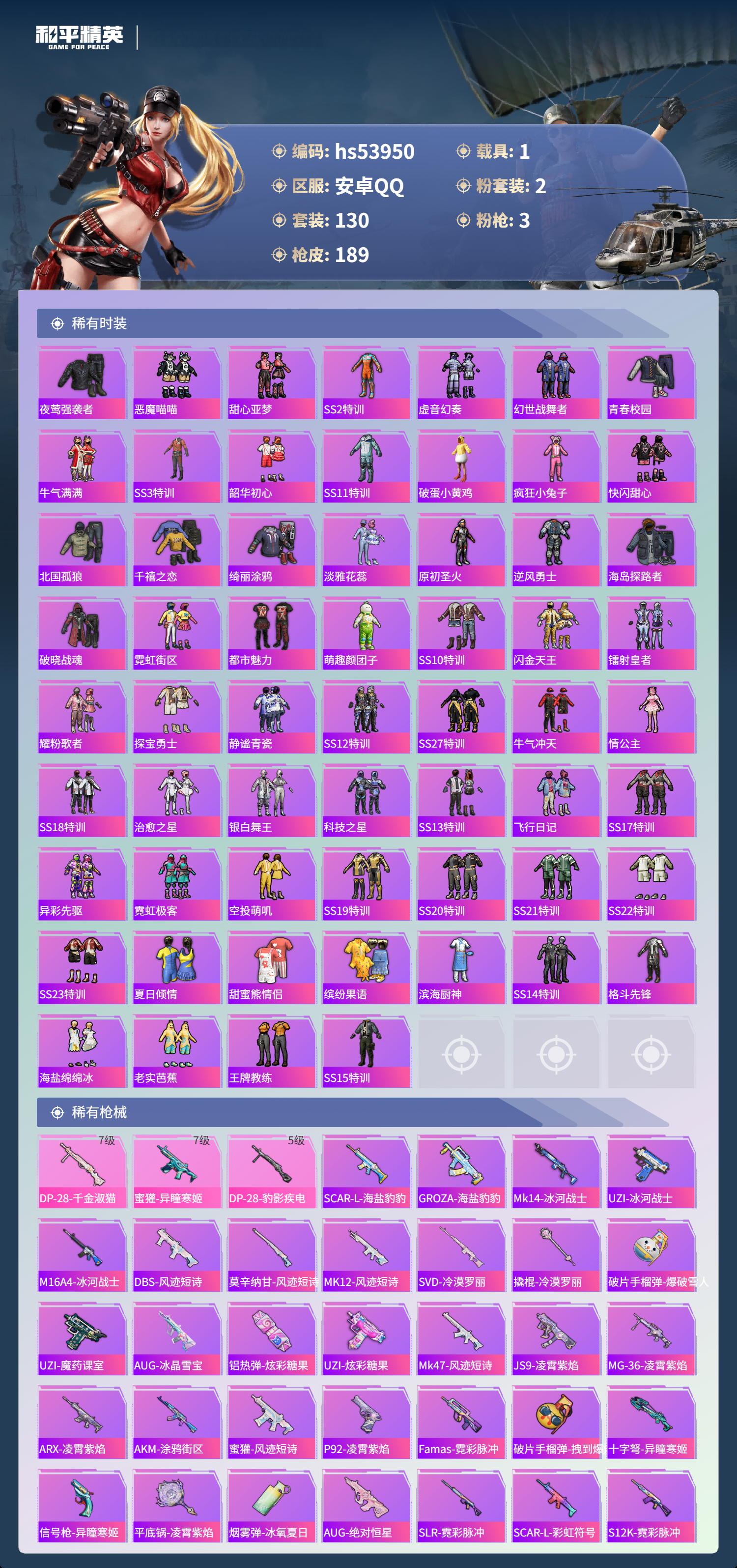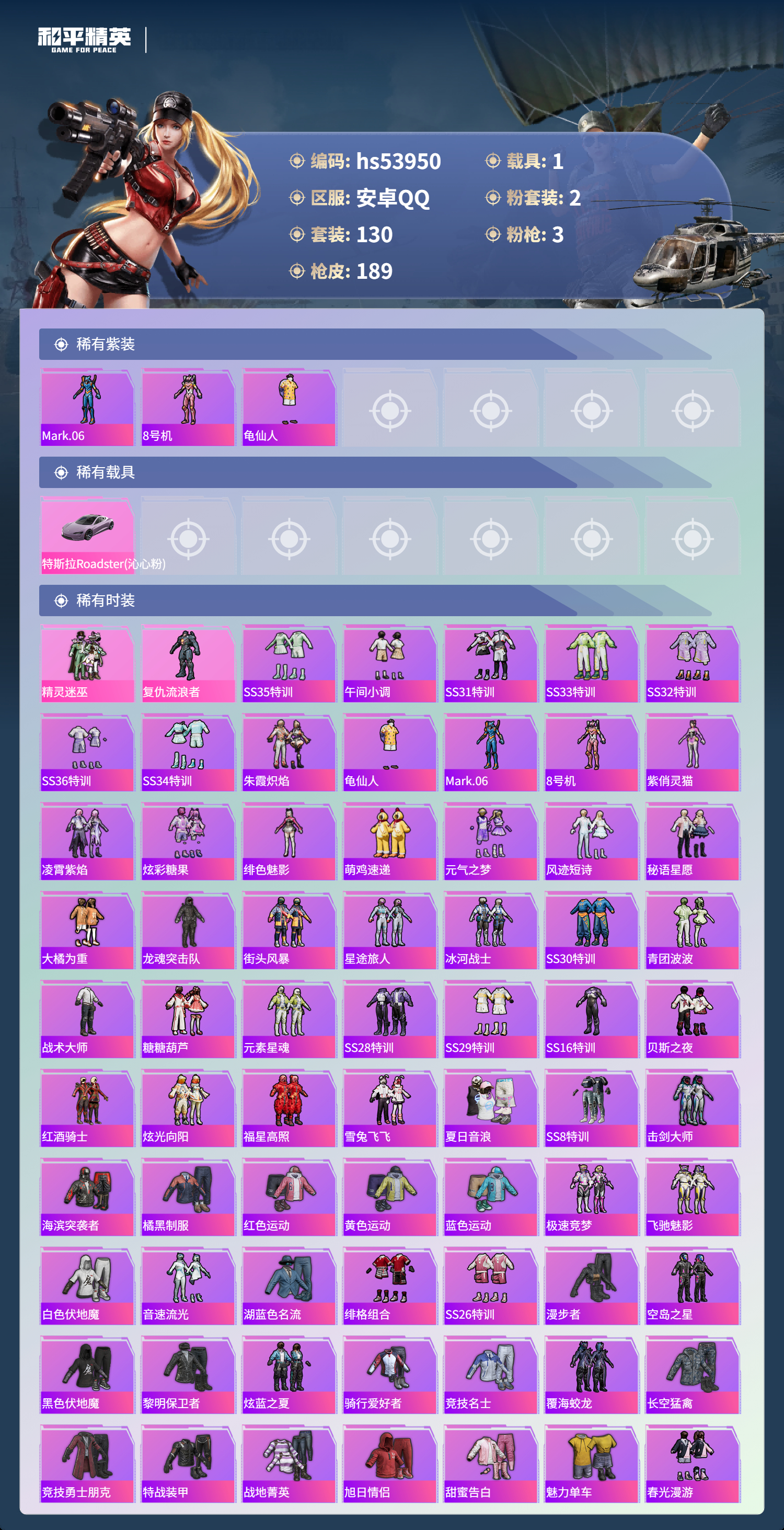 hs53950 安卓手q-10王牌印记-2粉装-3特效呛-1载具-57700热力值-130套装-189呛皮-3卓越印记-2传奇印记【2粉装】套装-精灵迷巫角色-复仇流浪者【3特效呛】蜜獾-异瞳寒姬/7级dp-28-千金淑猫/7级dp-28-豹影疾电/5级【3稀有紫装】mark.068号机龟仙人【1稀有载具】特斯拉roadster沁心粉【130稀有时装】ss35特训午间小调