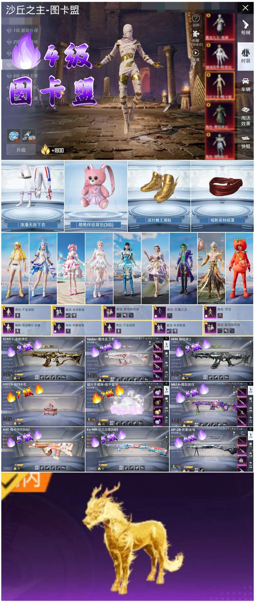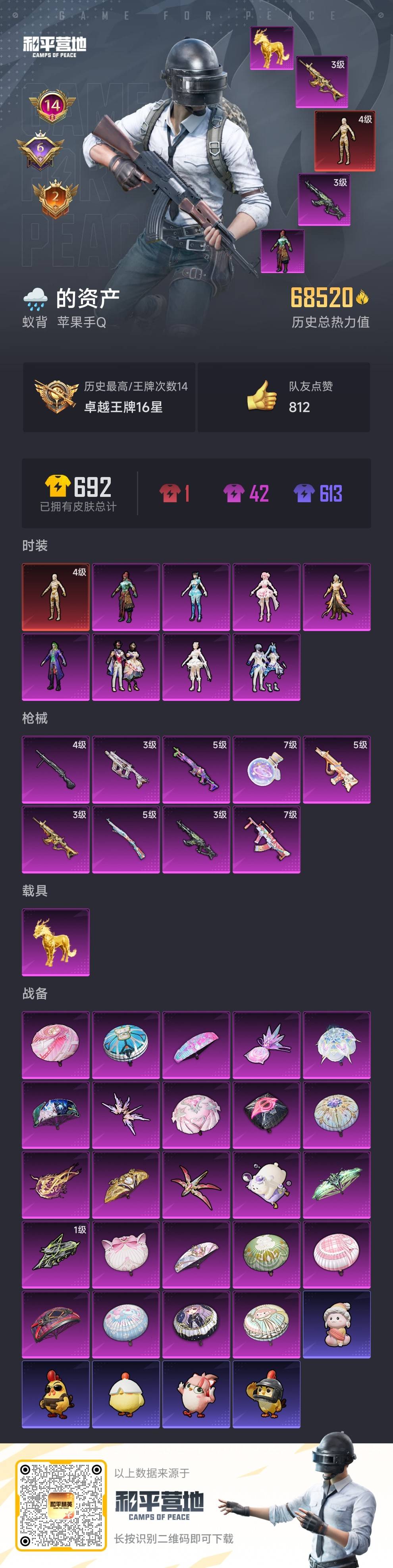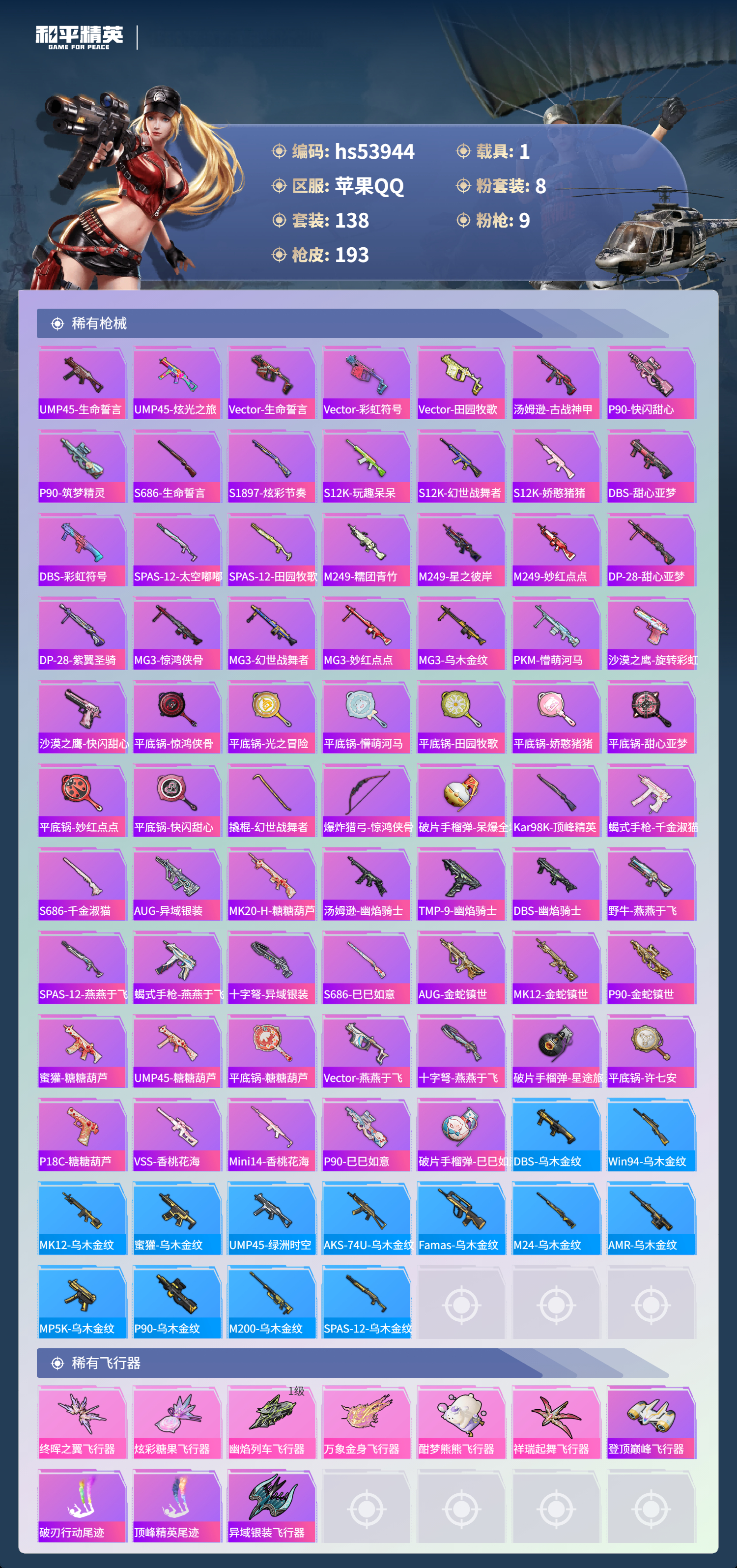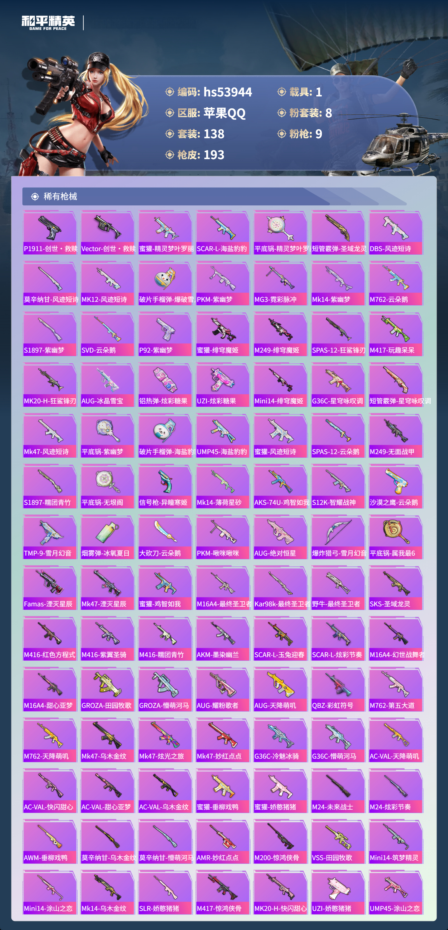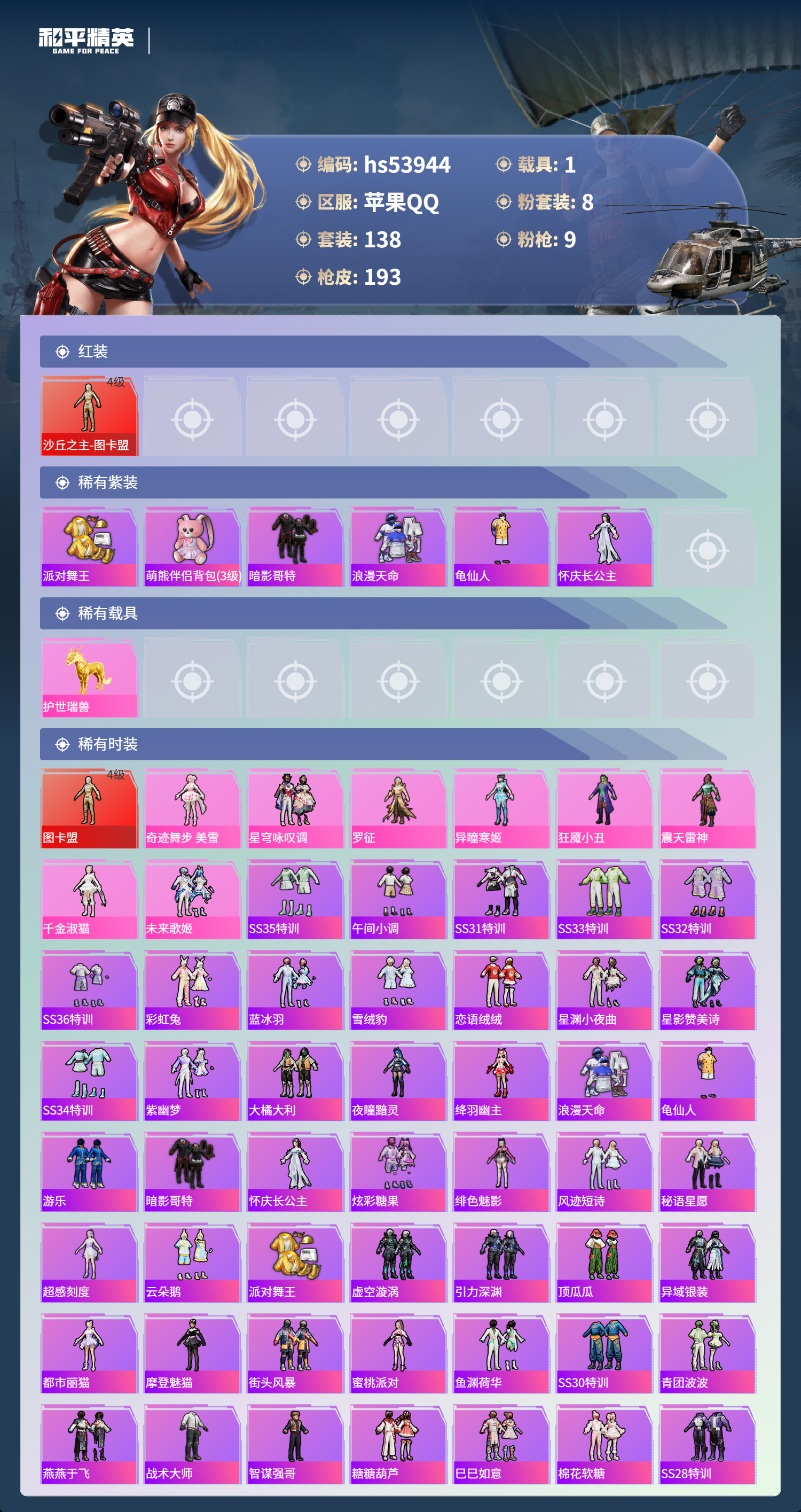 2319377苹果手q-14王牌印记-1红装-8粉装-9特效呛-1载具-68520热力值-138套装-193呛皮-6卓越印记-2传奇印记 【1红装】沙丘之主-图卡盟/4级 【8粉装】角色-异瞳寒姬套装-星穹咏叹调角色-罗征角色-千金淑猫角色-狂魇小丑套装-未来歌姬角色-震天雷神角色-奇迹舞步 美雪 【9特效呛】aug-暖羊咩咩/5级scar-l-金蛇镇世/3级kar98