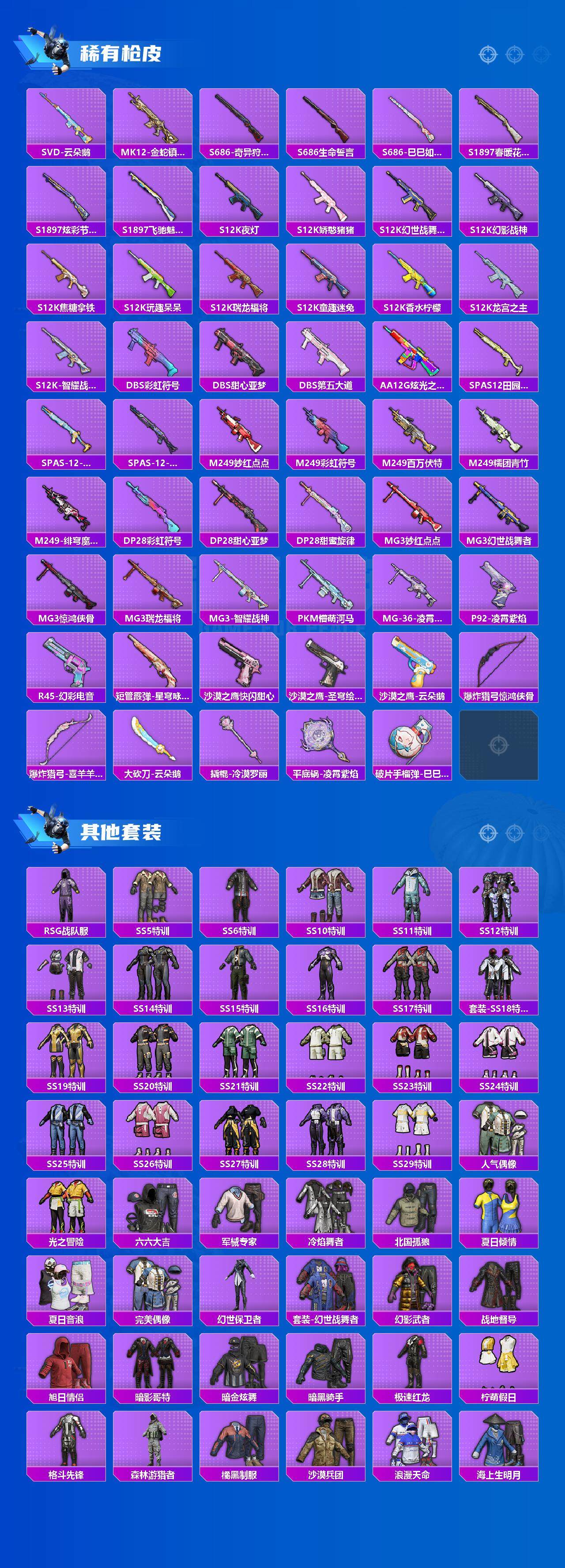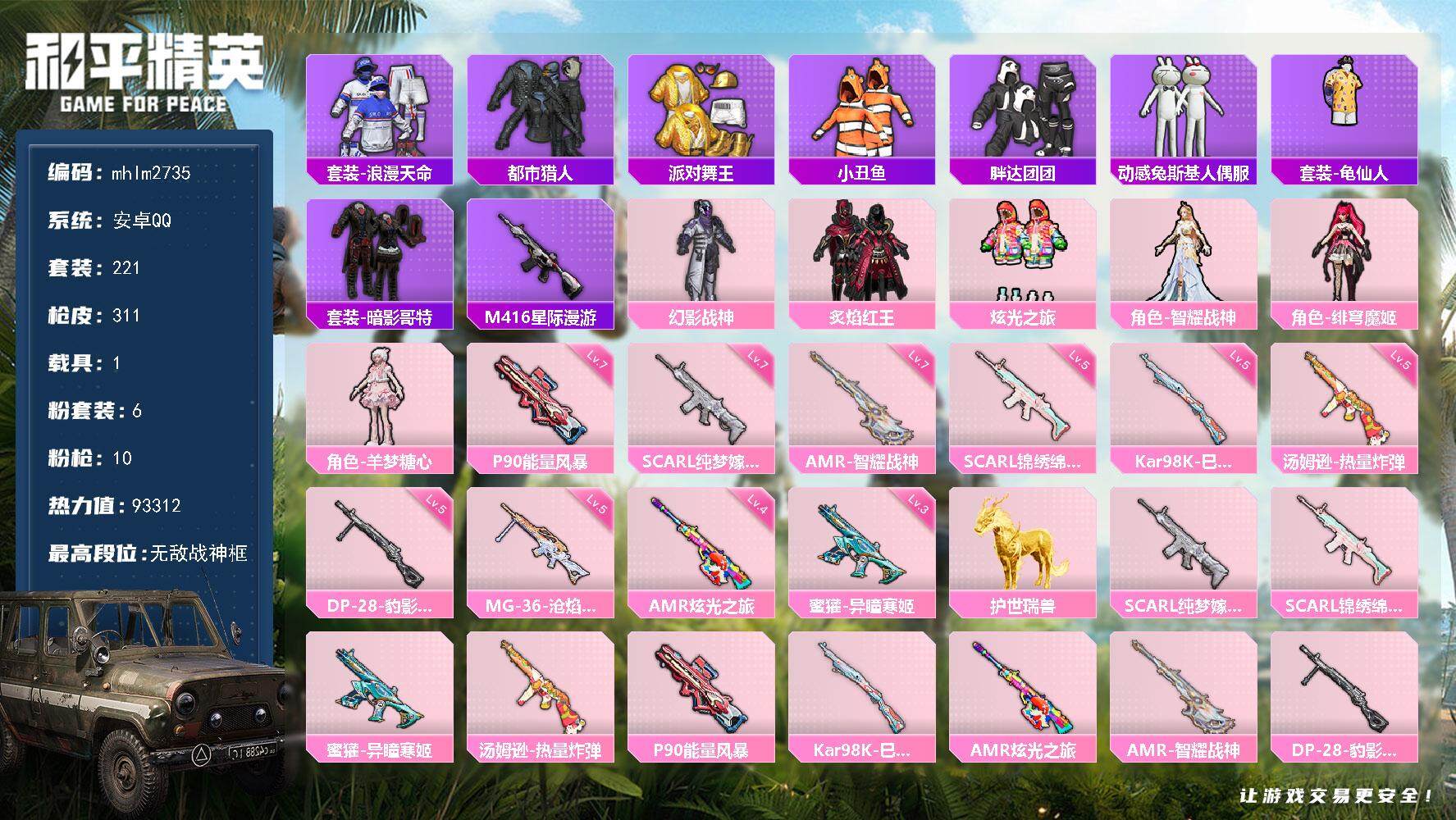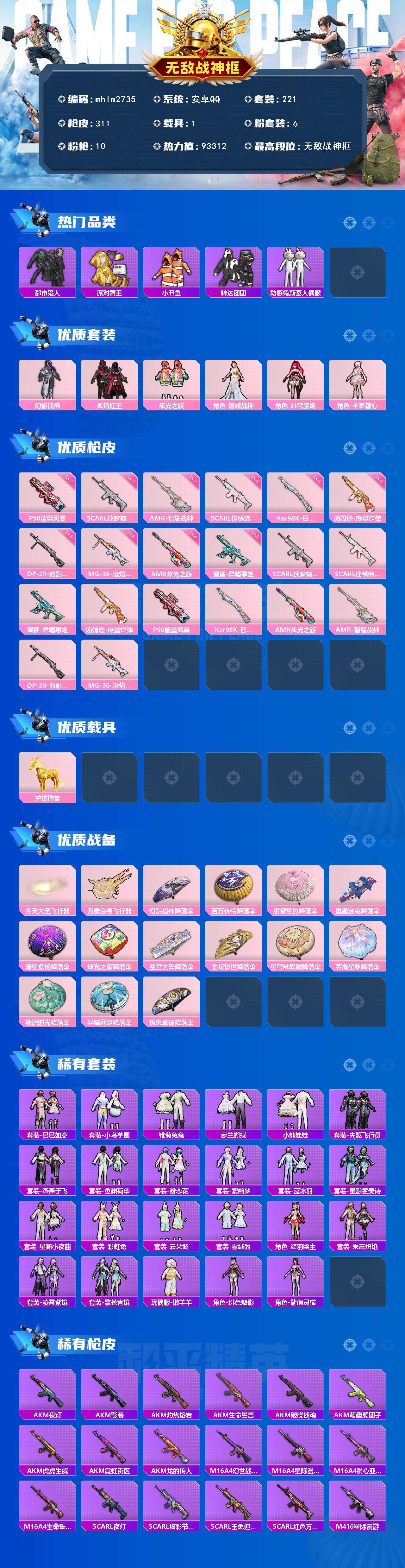 [14786827]【mhlm2735】安卓 手q-无敌战神框-6粉装-10特效呛-1载具-3粉色飞行器-93312热力值-21王牌印记-221套装-311呛皮 【热门品类】:套装-浪漫天命,套装-都市猎人,套装-派对舞王,套装-小丑鱼,套装-胖达团团,套装-动感兔斯基人偶服,套装-龟仙人,套装-暗影哥特,m416-星际漫游 【粉色套装】:粉装-幻影战神,粉装-炙焰红王,粉装-炫光之旅,角色-智耀战神,角色-绯穹魔姬,角色-羊梦糖心 【粉色呛皮等级】:scar-l-纯梦嫁纱七级,scar-l-锦绣绵绵五级,蜜獾-异瞳寒姬三级,汤姆逊-热量炸弹五级,p90-能量风暴七级,kar98k-巳巳如意五级,amr-炫光之旅四级,amr-智耀战神七级,dp-28-豹影疾电五级,mg-36-沧焰双生五级 【粉色载具】:护世瑞兽 【粉色呛皮】:scar-l-纯梦嫁纱,scar-l-锦绣绵绵,蜜獾-异瞳寒姬,汤姆逊-热量炸弹,p90-能量风暴,kar98k-巳巳如意,amr-炫光之旅,amr-智耀战神,dp-28-豹影疾电,mg-36-沧焰双生 【粉色飞行器】:齐天大圣飞行器,万象金身飞行器 【粉色降落伞】:幻影战神降落伞,百万伏特降落伞,甜蜜誓约降落伞,童趣迷兔降落伞,暗星紫秘降落伞,炫光之旅降落伞,圣堂之誓降落伞,金蛇镇世降落伞,星穹咏叹调降落伞,荧海星豚降落伞,桃源时光降落伞,异瞳寒姬降落伞,极意拳锋降落伞 【稀有套装】:套装-龟仙人,套装-巳巳如意,套装-小鸟芋圆,套装-雪国风尚,套装-雏菊兔兔,套装-萝兰蝴蝶,套装-小熊娃娃,套装-先驱飞行员,套装-燕燕于飞,套装-鱼渊荷华,套装-粉恋花,套装-紫幽梦,套装-蓝冰羽,套装-星影赞美诗,套装-星渊小夜曲,套装-彩虹兔,套装-云朵鹅,套装-雪绒豹,角色-绛羽幽主,套装-朱霞炽焰,套装-凌霄紫焰,套装-擎苍青焰,玩偶服-懒羊羊,角色-绯色魅影,角色-紫俏灵猫,套装-炫彩糖果 【稀有呛皮】:aug-冰晶雪宝,akm-夜灯,akm-影袭,akm-灼热熔岩,akm-生命誓言,akm-破晓战魂,akm-萌趣颜团子,akm-虎虎生威,akm-霓虹街区,akm-龙的传人,m16a4-幻世战舞者,m16a4-星际漫游,m16a4-甜心亚梦,m16a4-生命誓言,scar-l-夜灯,scar-l-炫彩节奏,scar-l-玉兔