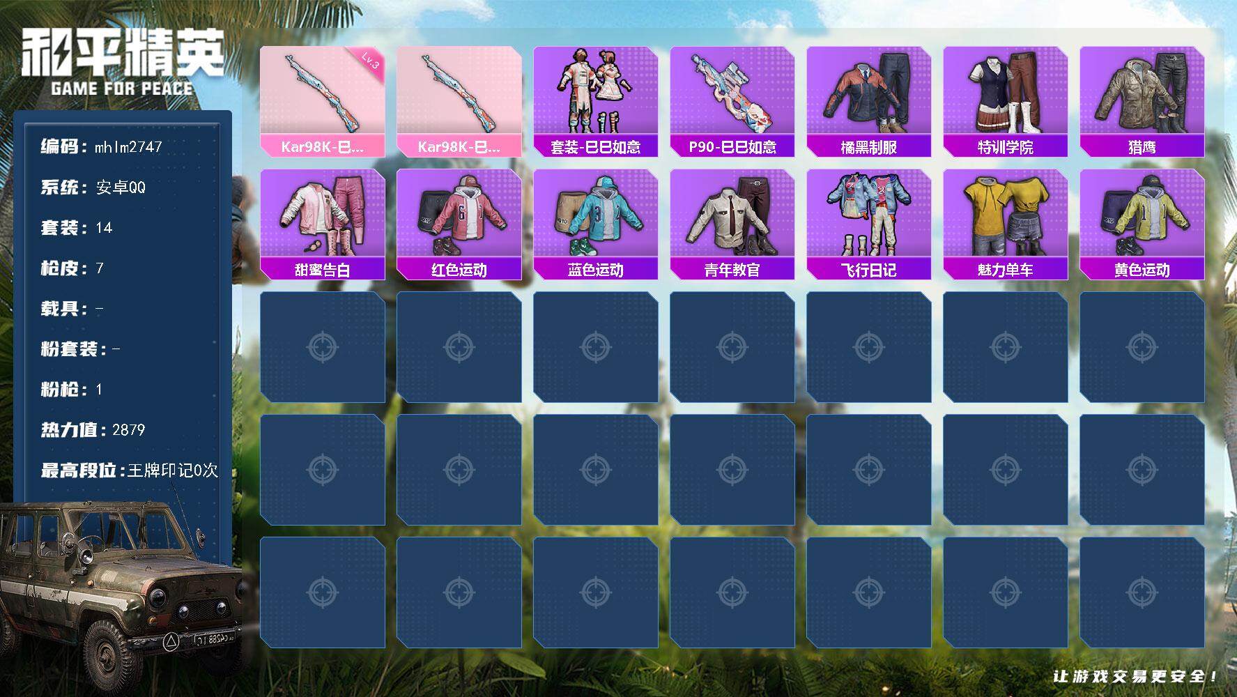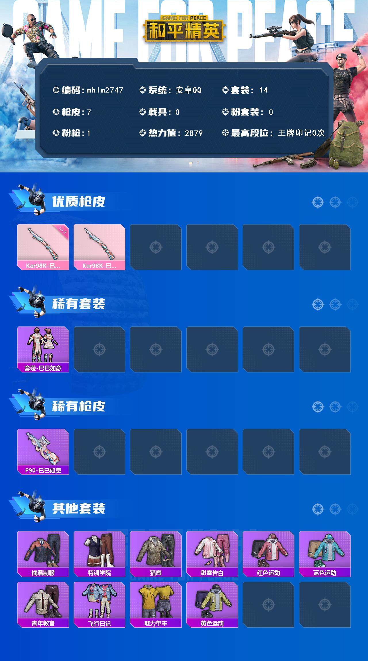 [14787809]【mhlm2747】安卓 手q-0粉装-1特效呛-0载具-1粉色飞行器-2879热力值-2王牌印记-14套装-7呛皮 【粉色呛皮等级】:kar98k-巳巳如意三级 【粉色呛皮】:kar98k-巳巳如意 【稀有套装】:套装-巳巳如意,套装-炫彩糖果 【稀有呛皮】:p90-巳巳如意 【其他套装】:套装-橘黑制服,套装-特训学院,套装-猎鹰,套装-甜蜜告白,套装-红色运动,套装-蓝色运动,套装-青年教官,套装-飞行日记,套装-魅力单车,套装-黄色运动 【营地id】:1028330651