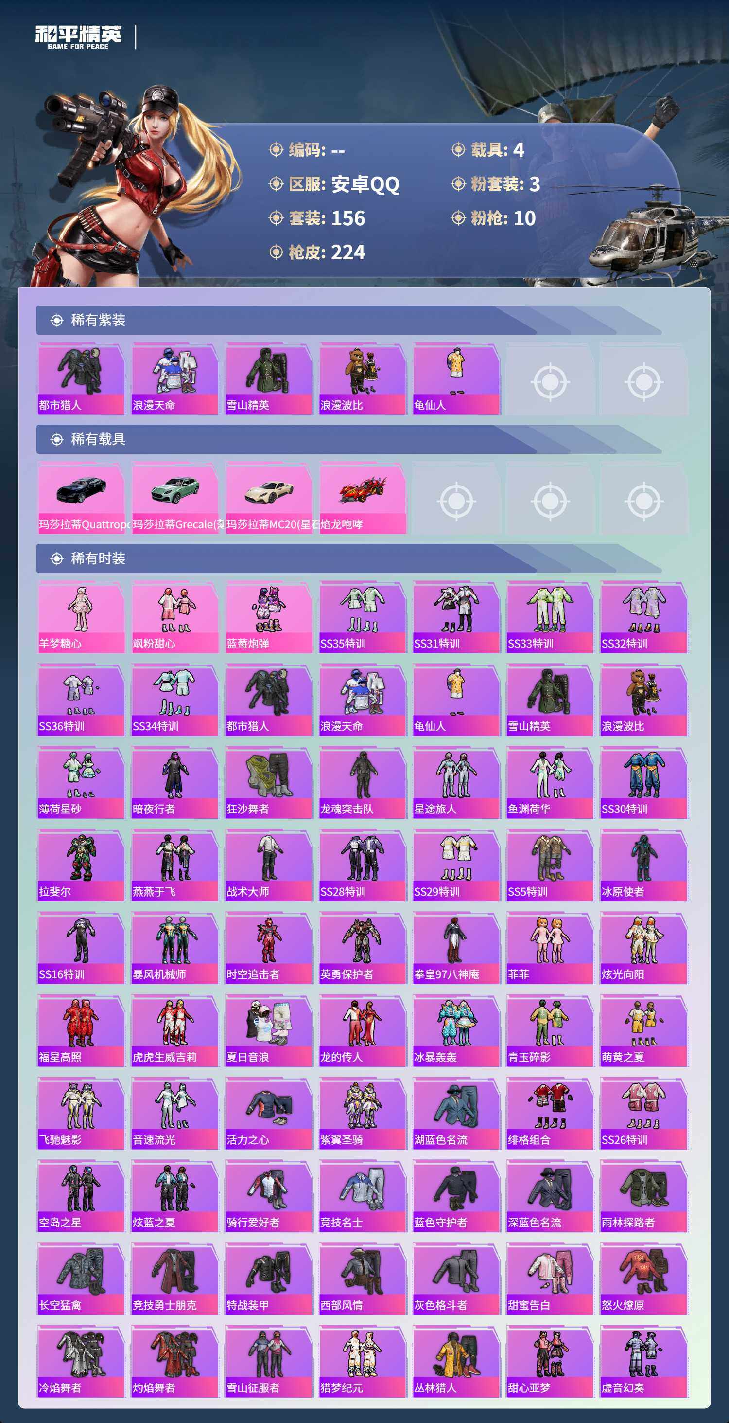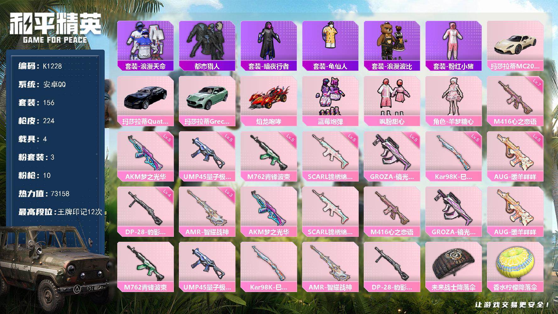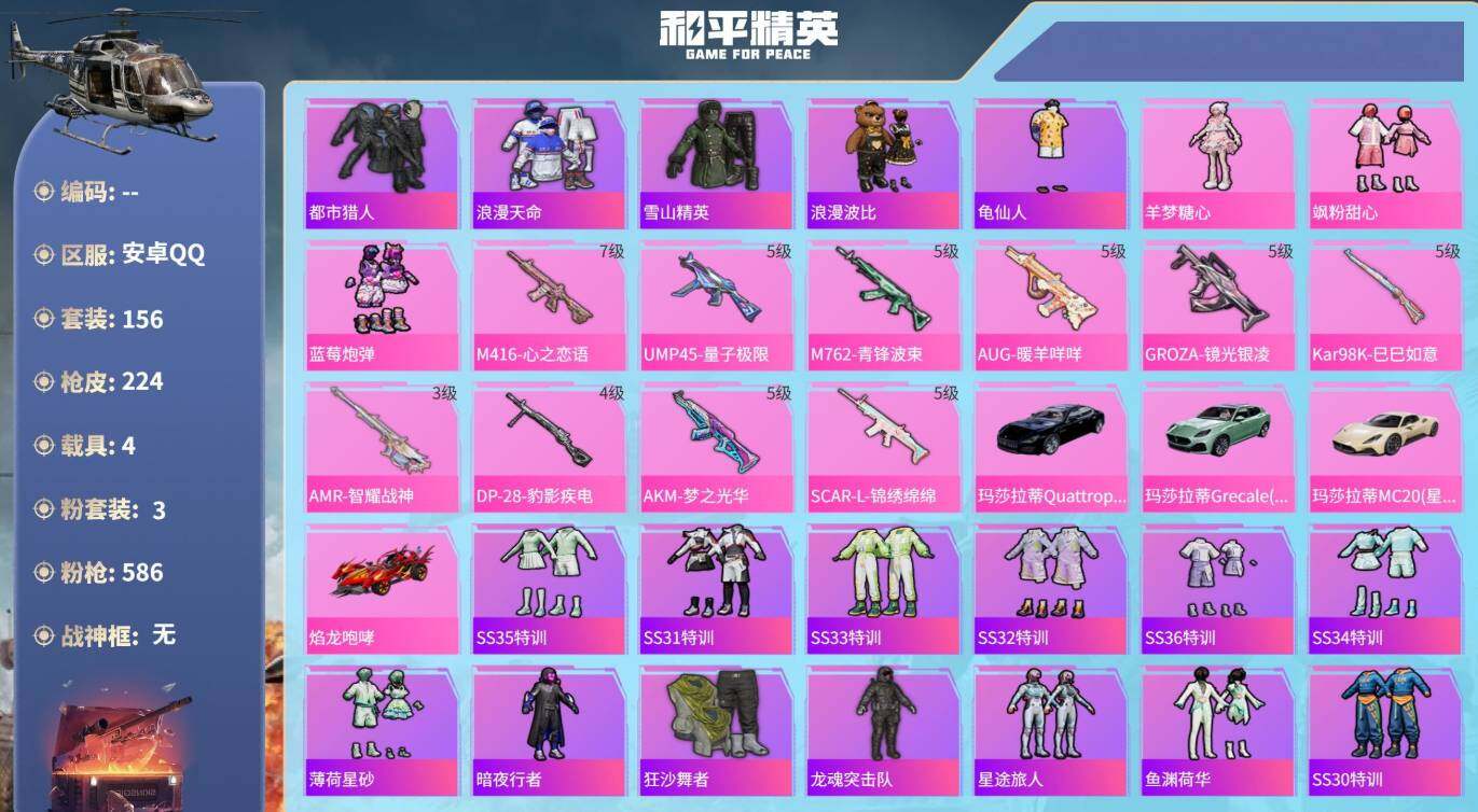 [14795840]k1228/可二次/安卓qq/3粉装-10特效呛-4载具-0粉色飞行器-73158热力值-12王牌印记-156套装-224呛皮 【热门品类】:套装-浪漫天命,套装-都市猎人,套装-暗夜行者,套装-龟仙人,套装-浪漫波比,套装-粉红小猪 【粉色载具】:玛莎拉蒂mc20(星石白),玛莎拉蒂quattropte(夜幕蓝),玛莎拉蒂grecale(薄荷绿),焰龙咆哮 【粉色套装】:粉装-蓝莓炮弹,粉装-飒粉甜心,角色-羊梦糖心 【粉色呛皮等级】:akm-梦之光华五级,scar-l-锦绣绵绵五级,m416-心之恋语七级,groza-镜光银凌五级,aug-暖羊咩咩五级,m762-青锋波束五级,ump45-量子极限五级,kar98k-巳巳如意五级,amr-智耀战神三级,dp-28-豹影疾电四级 【粉色呛皮】:akm-梦之光华,scar-l-锦绣绵绵,m416-心之恋语,groza-镜光银凌,aug-暖羊咩咩,m762-青锋波束,ump45-量子极限,kar98k-巳巳如意,amr-智耀战神,dp-28-豹影疾电 【粉色降落伞】:未来战士降落伞,香水柠檬降落伞,洛神天依降落伞,环太平洋降落伞,垂柳戏鸭降落伞,桃夭倾城降落伞,炫光之旅降落伞,守护天翼降落伞