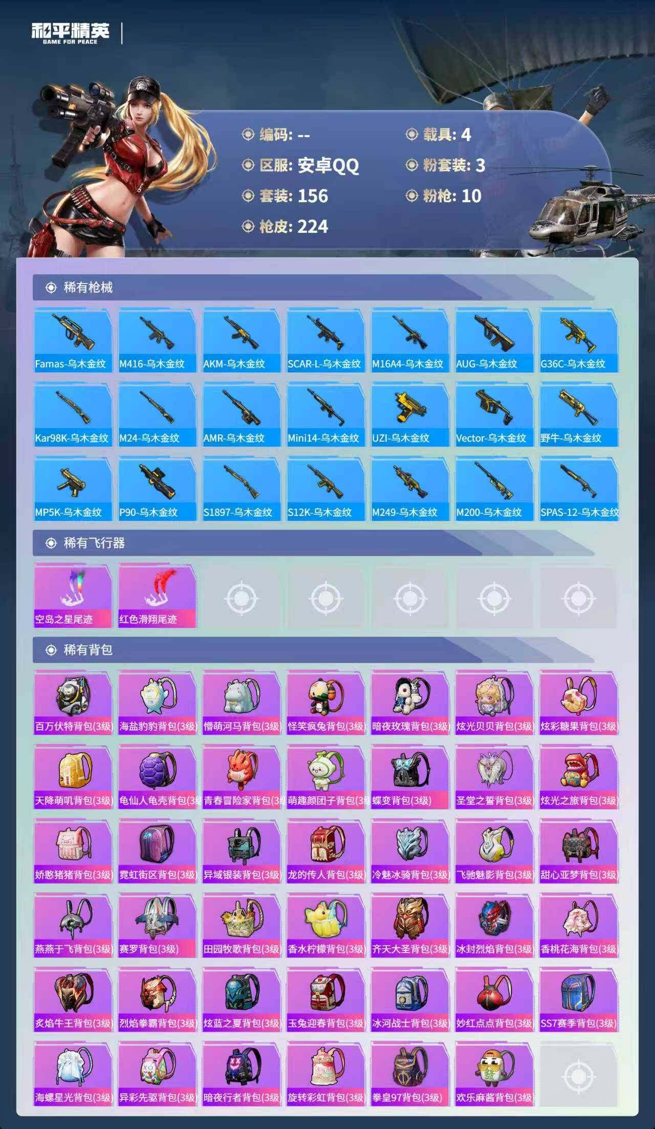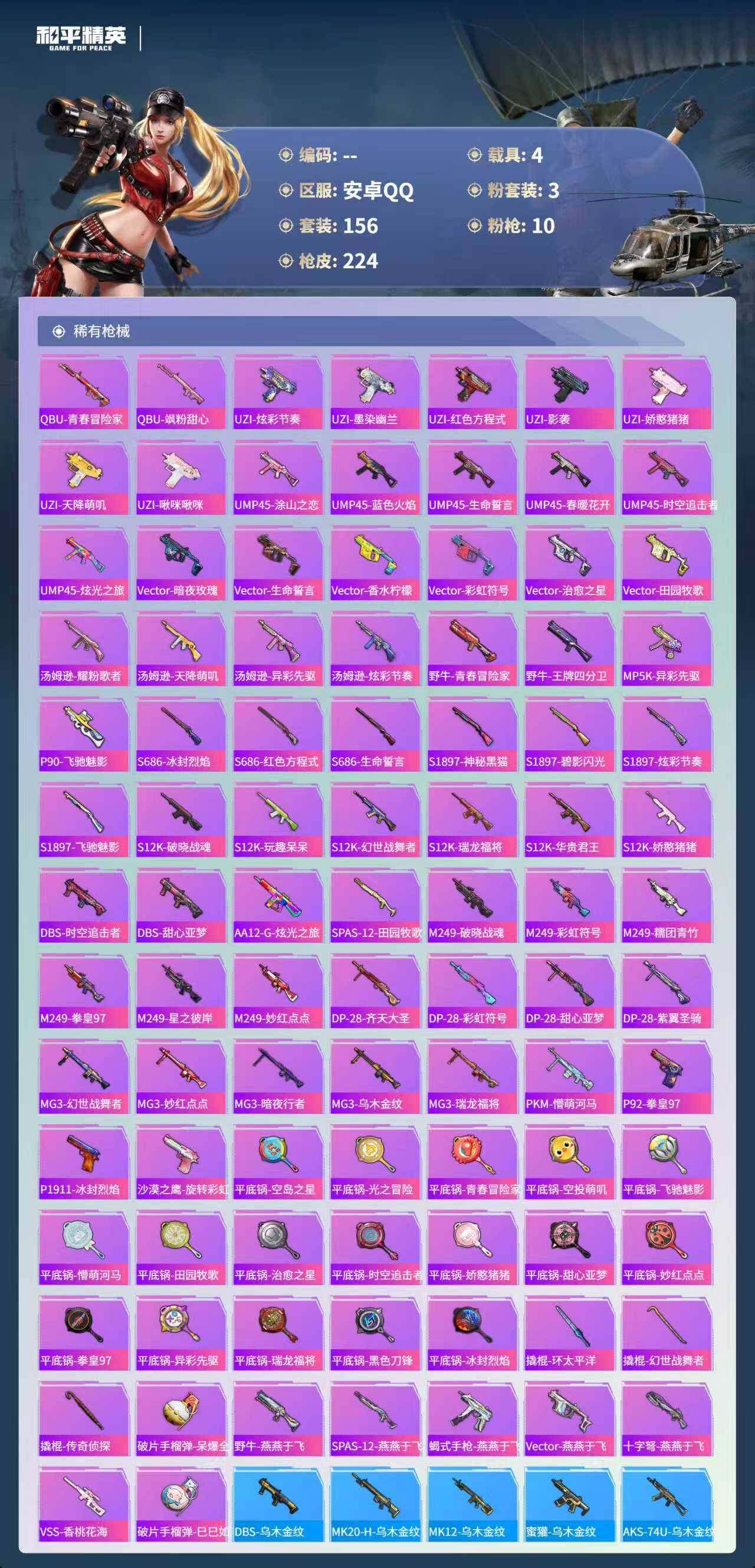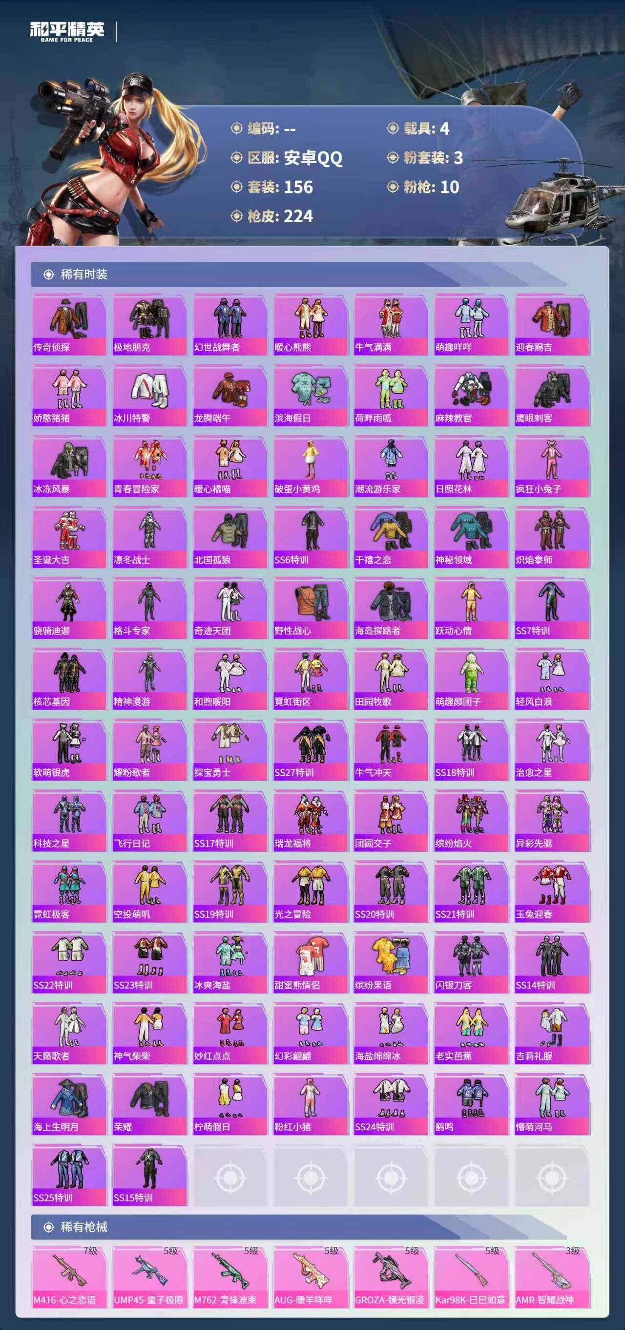 [14795840]k1228/可二次/安卓qq/3粉装-10特效呛-4载具-0粉色飞行器-73158热力值-12王牌印记-156套装-224呛皮 【热门品类】:套装-浪漫天命,套装-都市猎人,套装-暗夜行者,套装-龟仙人,套装-浪漫波比,套装-粉红小猪 【粉色载具】:玛莎拉蒂mc20(星石白),玛莎拉蒂quattropte(夜幕蓝),玛莎拉蒂grecale(薄荷绿),焰龙咆哮 【粉色套装】:粉装-蓝莓炮弹,粉装-飒粉甜心,角色-羊梦糖心 【粉色呛皮等级】:akm-梦之光华五级,scar-l-锦绣绵绵五级,m416-心之恋语七级,groza-镜光银凌五级,aug-暖羊咩咩五级,m762-青锋波束五级,ump45-量子极限五级,kar98k-巳巳如意五级,amr-智耀战神三级,dp-28-豹影疾电四级 【粉色呛皮】:akm-梦之光华,scar-l-锦绣绵绵,m416-心之恋语,groza-镜光银凌,aug-暖羊咩咩,m762-青锋波束,ump45-量子极限,kar98k-巳巳如意,amr-智耀战神,dp-28-豹影疾电 【粉色降落伞】:未来战士降落伞,香水柠檬降落伞,洛神天依降落伞,环太平洋降落伞,垂柳戏鸭降落伞,桃夭倾城降落伞,炫光之旅降落伞,守护天翼降落伞