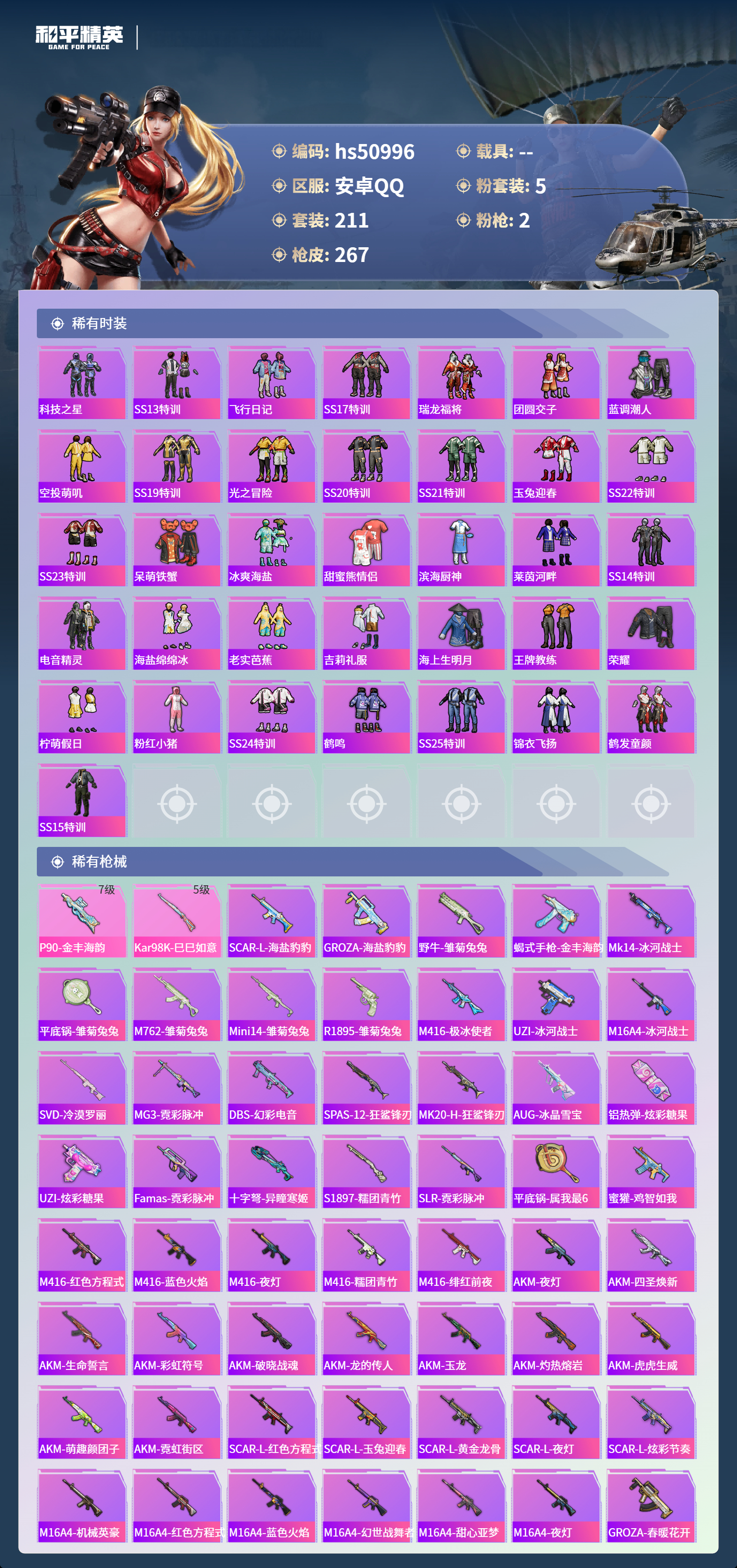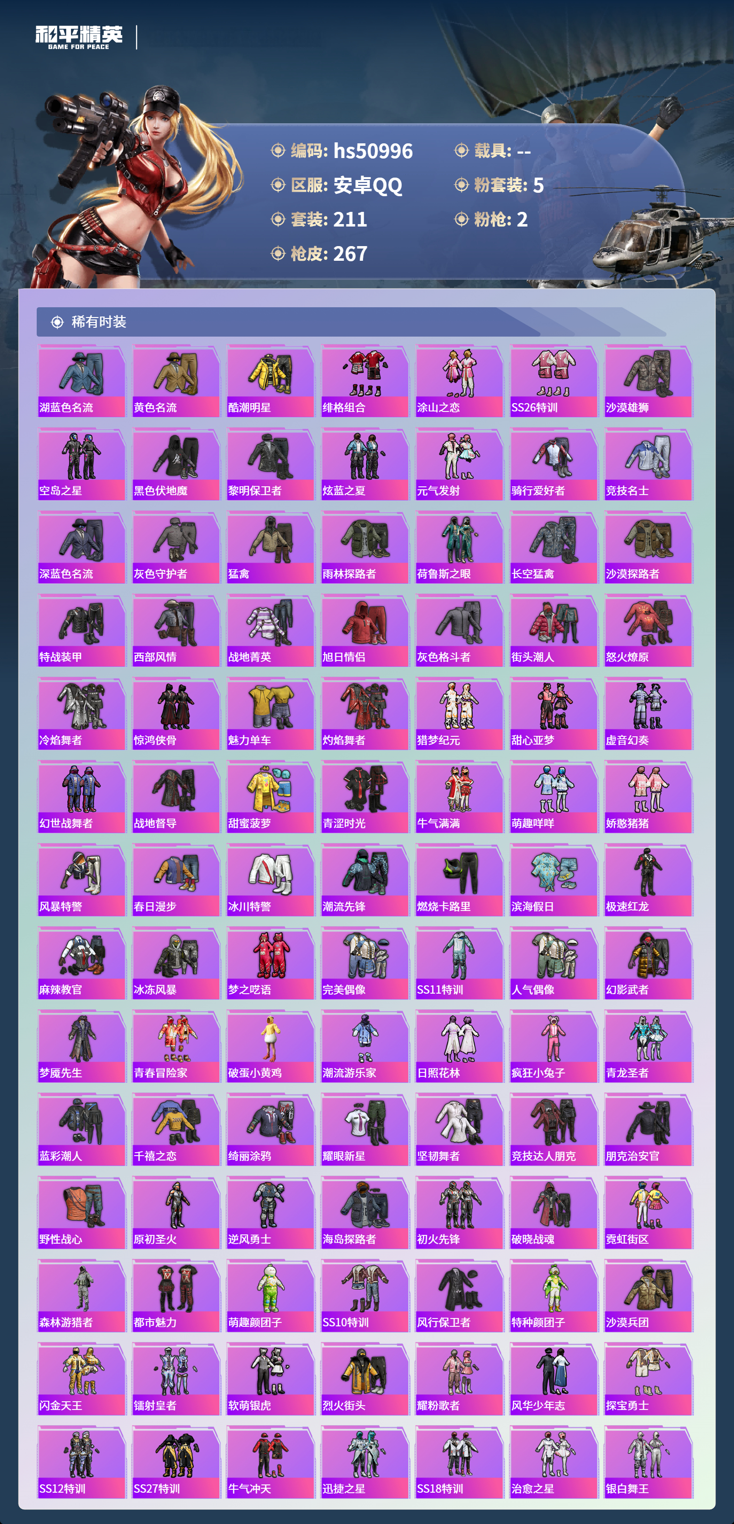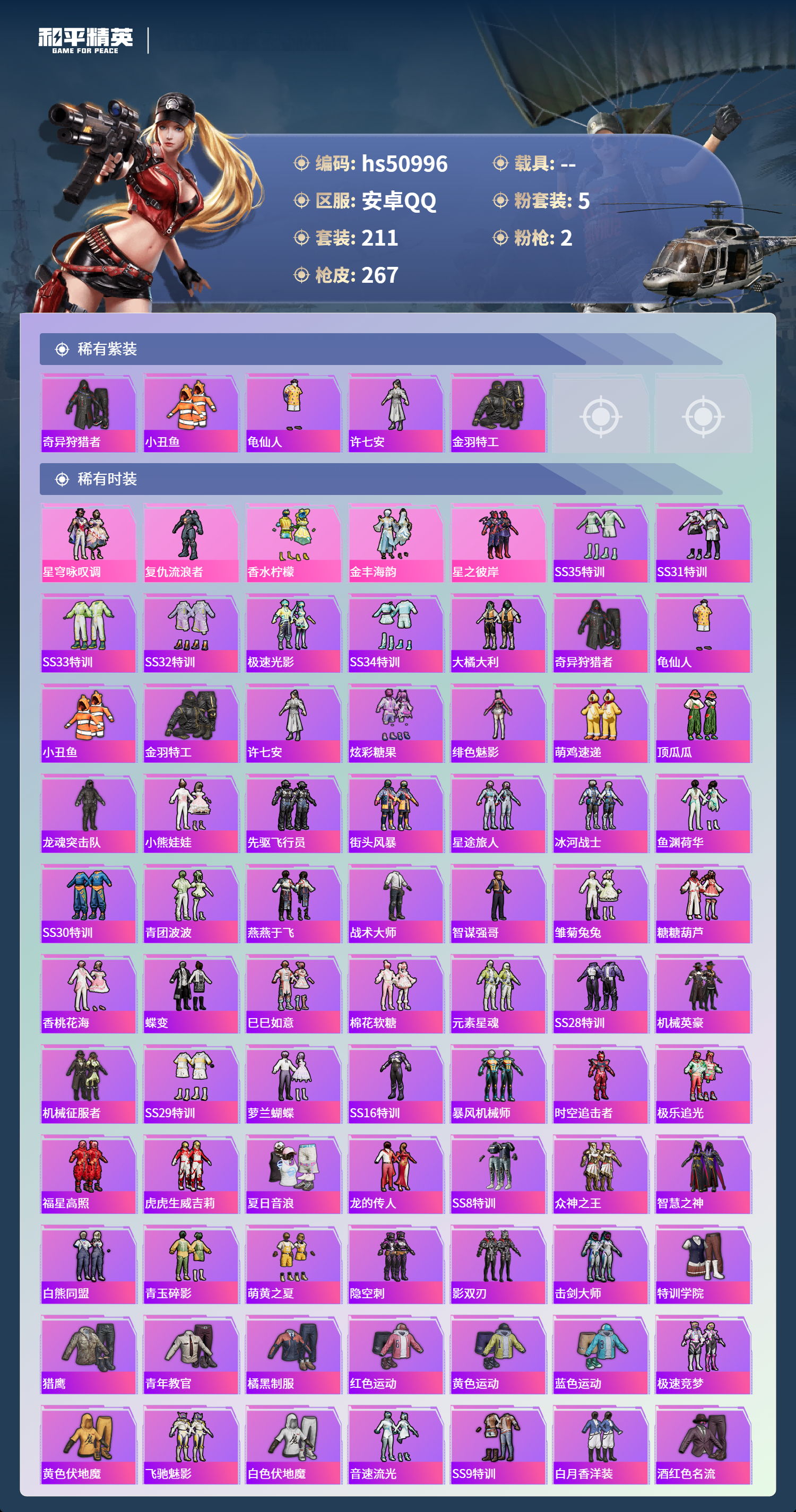 hs50996 安卓手q-19王牌印记-5粉装-2特效呛-82622热力值-211套装-267呛皮-4卓越印记-3传奇印记【5粉装】套装-香水柠檬套装-金丰海韵套装-星之彼岸套装-星穹咏叹调角色-复仇流浪者【2特效呛】kar98k-巳巳如意/5级p90-金丰海韵/7级【5稀有紫装】奇异狩猎者小丑鱼龟仙人许七安金羽特工【211稀有时装】星穹咏叹调ss35特训ss31特训