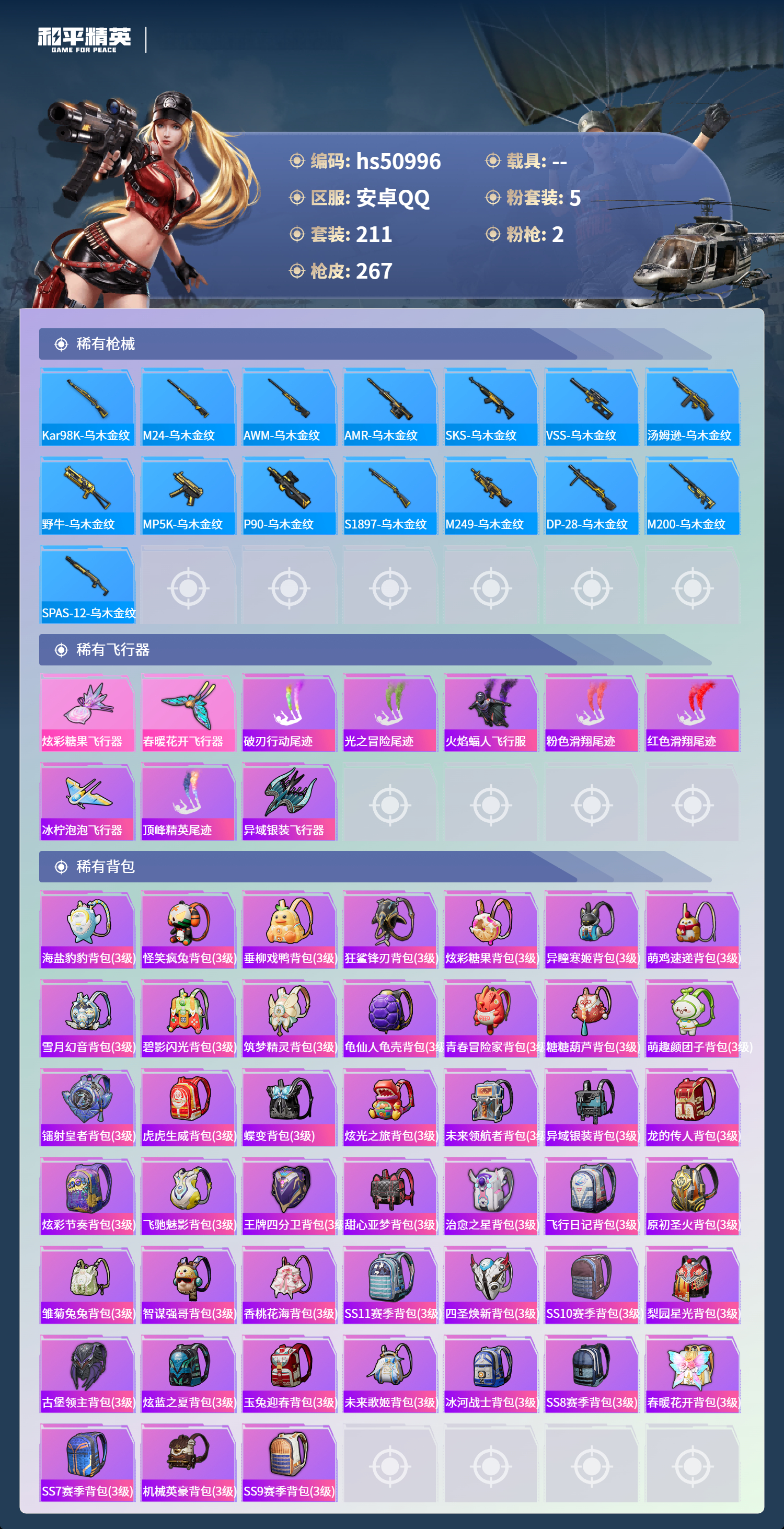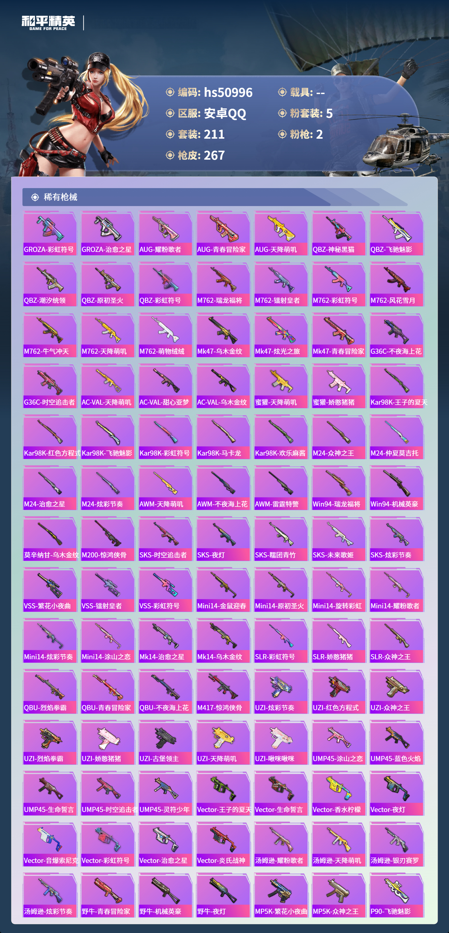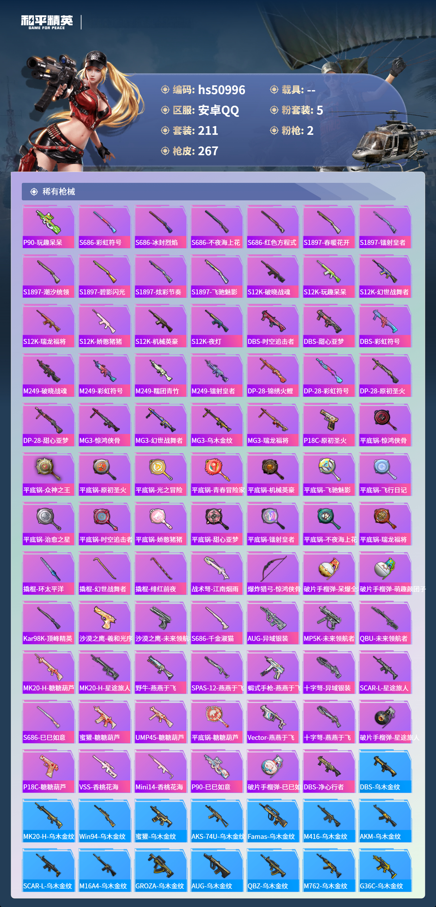 hs50996 安卓手q-19王牌印记-5粉装-2特效呛-82622热力值-211套装-267呛皮-4卓越印记-3传奇印记【5粉装】套装-香水柠檬套装-金丰海韵套装-星之彼岸套装-星穹咏叹调角色-复仇流浪者【2特效呛】kar98k-巳巳如意/5级p90-金丰海韵/7级【5稀有紫装】奇异狩猎者小丑鱼龟仙人许七安金羽特工【211稀有时装】星穹咏叹调ss35特训ss31特训