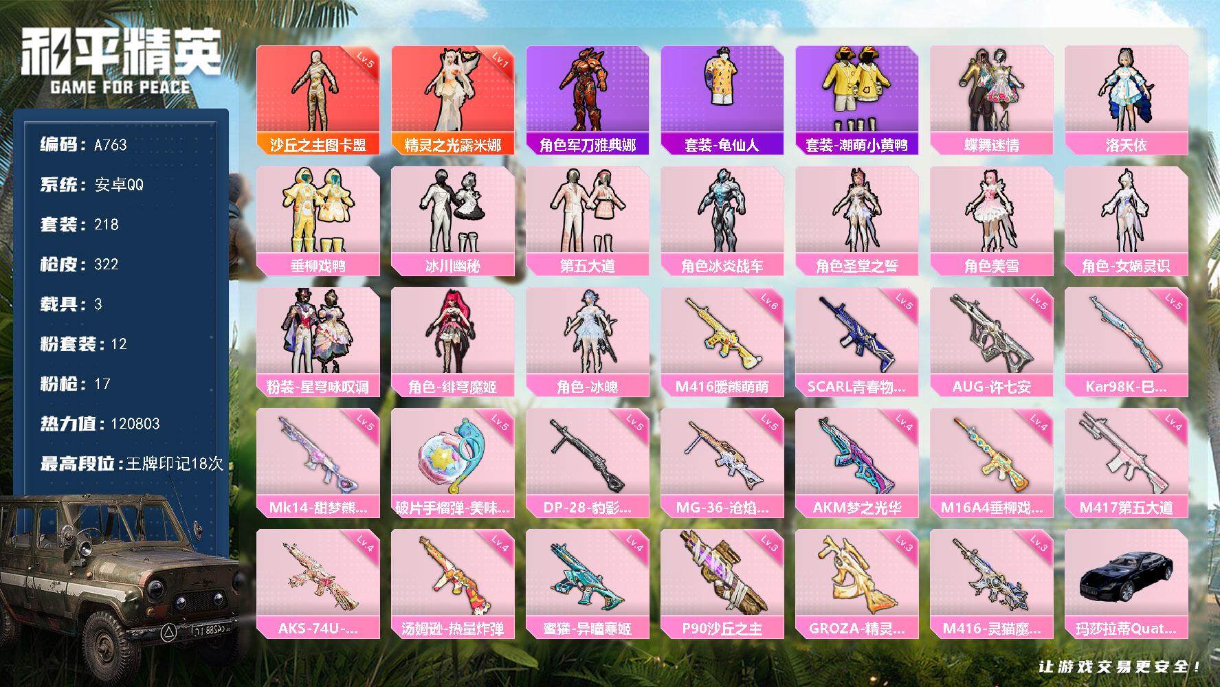 [14709365]安卓【极品神装号/2套绝世印记/18王牌印记/沙丘之主-图卡盟五级/精灵之光-露米娜一级/洛天依/2神装-12粉装-17特效呛-3载具-8粉色飞行器】 手q120803热力值-18王牌印记-218套装-322呛皮 【红色神装等级】:精灵之光-露米娜一级,沙丘之主-图卡盟五级 【红色角色神装】:精灵之光-露米娜,沙丘之主-图卡盟 【热门品类】:角色-军刀雅典娜,套装-龟仙人,套装-潮萌小黄鸭 【粉色套装】:粉装-蝶舞迷情,角色-洛天依,粉装-垂柳戏鸭,粉装-冰川幽秘,粉装-第五大道,角色-冰炎战车,角色-圣堂之誓,角色-美雪,角色-女娲灵识,粉装-星穹咏叹调,角色-绯穹魔姬,角色-冰魄 【粉色呛皮等级】:akm-梦之光华四级,m16a4-垂柳戏鸭四级,scar-l-青春物语五级,m416-暖熊萌萌六级,m416-灵猫魔法师三级,groza-精灵之光三级,aug-许七安五级,蜜獾-异瞳寒姬四级,汤姆逊-热量炸弹四级,aks-74u-星穹咏叹调四级,p90-沙丘之主三级,kar98k-巳巳如意五级,mk14-甜梦熊击五级,m417-第五大道四级,dp-28-豹影疾电五级,mg-36-沧焰双生五级,破片手留单-美味星星糖五级 【粉色载具】:玛莎拉蒂quattropte(夜幕蓝),时空跃影(星辉银),黑曜夜骑 【粉色呛皮】:akm-梦之光华,m16a4-垂柳戏鸭,scar-l-青春物语,m416-暖熊萌萌,m416-灵猫魔法师,groza-精灵之光,aug-许七安,蜜獾-异瞳寒姬,汤姆逊-热量炸弹,aks-74u-星穹咏叹调,p90-沙丘之主,kar98k-巳巳如意,mk14-甜梦熊击,m417-第五大道,dp-28-豹影疾电,mg-36-沧焰双生,破片手留单-美味星星糖 【粉色飞行器】:酣梦熊熊飞行器,沙丘之主天马,曦光华影飞行器,御兔特攻飞行器,灵猫魔法师飞行器,桃源时光飞行器 【粉色降落伞】:春暖花开降落伞,神秘黑猫降落伞,四圣焕新降落伞,激战未来降落伞,林间仙鹿降落伞,洛神天依降落伞,妙趣可丽降落伞,闪光银龙降落伞,环太平洋降落伞,暖熊萌萌降落伞,绒雪飘舞降落伞,垂柳戏鸭降落伞,暗夜鎏金降落伞,第五大道降落伞,莲影清波降落伞,圣堂之誓降落伞,沙丘之主降落伞,巴啦啦小魔仙降落伞
