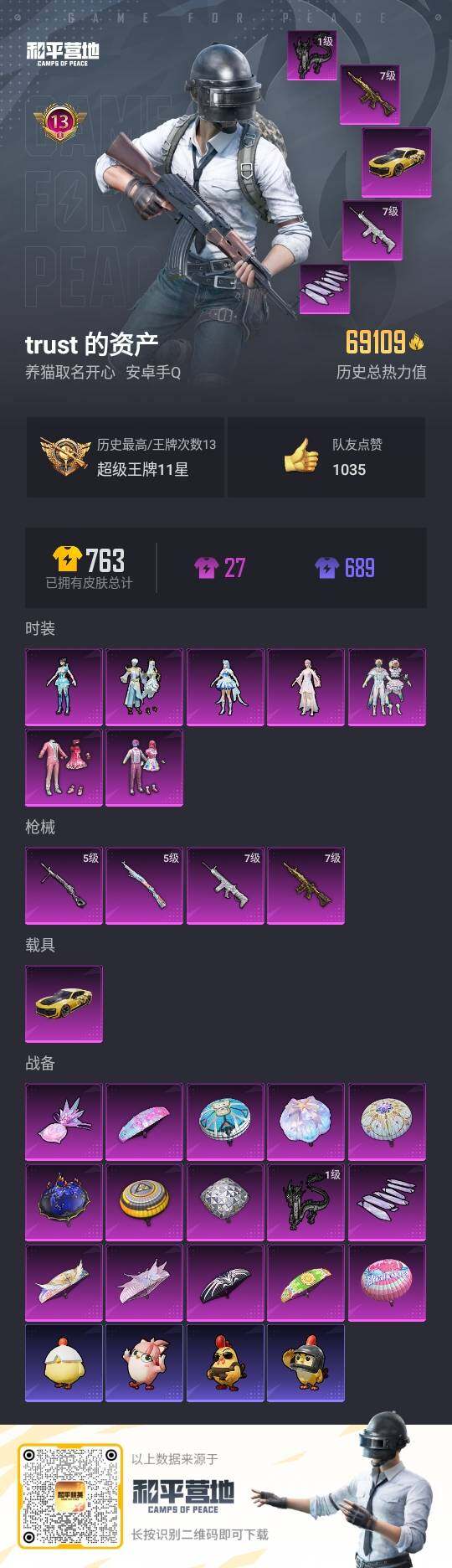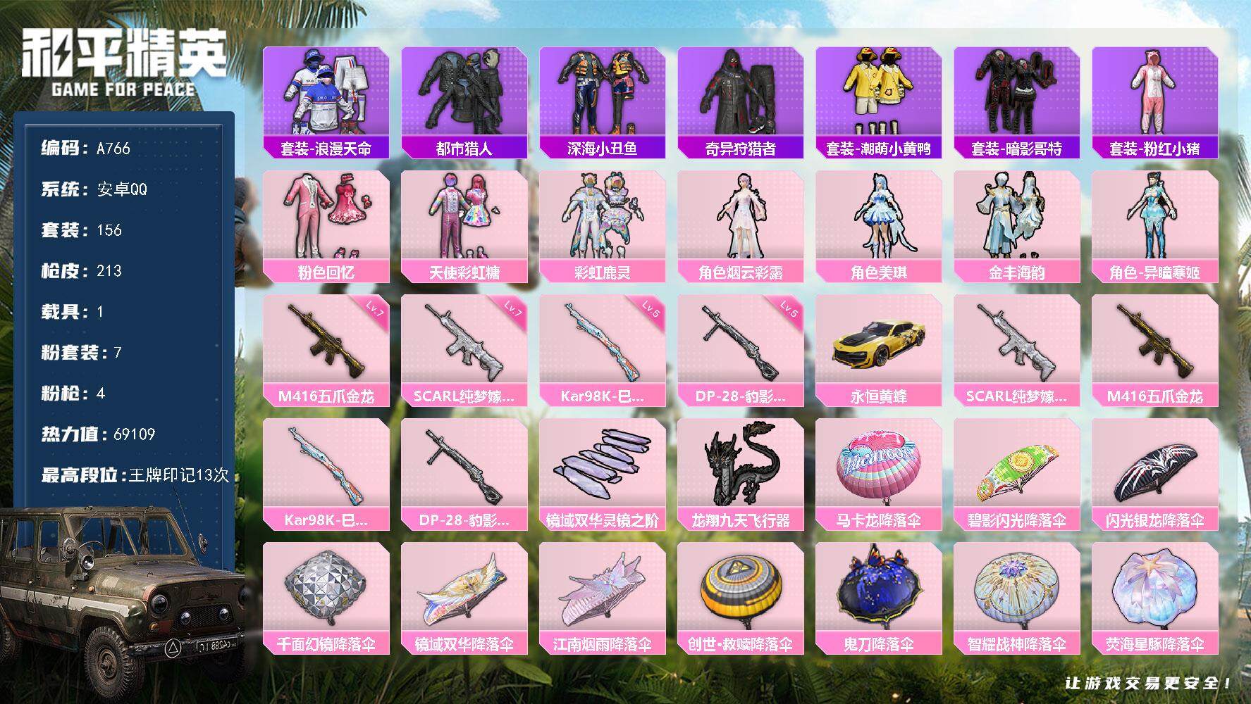 [14709884]安卓【小号/13王牌印记/都市猎人/暗影哥特/百万伏特背包/7粉装-4满特效呛-1载具-3粉色飞行器】 手q69109热力值-13王牌印记-156套装-213呛皮 【热门品类】:套装-浪漫天命,套装-都市猎人,套装-深海小丑鱼,套装-奇异狩猎者,套装-潮萌小黄鸭,套装-暗影哥特,套装-粉红小猪 【粉色套装】:粉装-粉色回忆,粉装-天使彩虹糖,粉装-彩虹鹿灵,角色-烟云彩露,角色-美琪,粉装-金丰海韵,角色-异瞳寒姬 【粉色呛皮等级】:scar-l-纯梦嫁纱七级,m416-五爪金龙七级,kar98k-巳巳如意五级,dp-28-豹影疾电五级 【粉色载具】:永恒黄蜂 【粉色呛皮】:scar-l-纯梦嫁纱,m416-五爪金龙,kar98k-巳巳如意,dp-28-豹影疾电 【粉色飞行器】:镜域双华-灵镜之阶,龙翔九天飞行器 【粉色降落伞】:马卡龙降落伞,碧影闪光降落伞,闪光银龙降落伞,千面幻镜降落伞,镜域双华降落伞,江南烟雨降落伞,创世·救赎降落伞,鬼刀降落伞,智耀战神降落伞,荧海星豚降落伞,异瞳寒姬降落伞 【稀有套装】:套装-巳巳如意,套装-燕燕于飞,套装-鱼渊荷华,角色-海琴烟,角色-瑰梦爱神,套装-极速光影,套装-炫彩糖果 【稀有呛皮】:aug-冰晶雪宝,akm-夜灯,akm-彩虹符号,akm-影袭,akm-破晓战魂,akm-萌趣颜团子,akm-虎虎生威,akm-龙的传人,m16a4-夜灯,m16a4-幻世战舞者,m16a4-甜心亚梦,m16a4-红色方程式,scar-l-炫彩节奏,scar-l-玉兔迎春,scar-l-碧影闪光,scar-l-红色方程式,scar-l-银河战甲,m416-夜灯,m416-滑板小狐,m416-糯团青竹,m416-红色方程式,m416-绯红前夜,m416-蓝色火焰,groza-异彩先驱,groza-影袭,groza-治愈之星,groza-田园牧歌,groza-银河战甲,aug-天降萌叽,aug-幻影战神,aug-甜蜜菠萝,aug-耀粉歌者,q-原初圣火,q-彩虹符号,q-飞驰魅影,m762-天降萌叽,m762-奇异狩猎者,m762-彩虹符号,m762-牛气冲天,m762-瑞龙福将,m762-绯红前夜,m762-镭射皇者,m762-登顶巅峰,mk47-妙红点点,g36c-镜域双华,g36c-暗夜玫瑰,ac-v