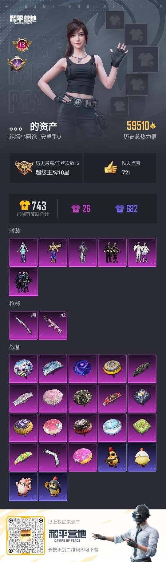 [14650369]安卓【小号/13王牌印记/小丑鱼/蓝螳螂/百万伏特背包/6粉装-2满特效呛-1粉色飞行器】 手q59510热力值-13王牌印记-146套装-210呛皮 【热门品类】:套装-浪漫天命,套装-小丑鱼,套装-奇异狩猎者,套装-龟仙人,角色-mark.06 【粉色套装】:粉装-幻影战神,粉装-暗夜玫瑰,粉装-寒光使者,粉装-暗夜鎏金,角色-光极星,角色-异瞳寒姬 【粉色呛皮等级】:m762-甜蜜誓约七级,kar98k-巳巳如意五级 【粉色呛皮】:m762-甜蜜誓约,kar98k-巳巳如意 【粉色飞行器】:天之羽翼飞行器 【粉色降落伞】:百万伏特降落伞,甜蜜誓约降落伞,蓝莓炮弹降落伞,碧影闪光降落伞,恐龙拽拽降落伞,冷魅冰骑降落伞,炙焰牛王降落伞,旋转彩虹降落伞,青空秋雨降落伞,歌者泠鸢降落伞,暗夜鎏金降落伞,圣堂之誓降落伞,繁龙极客降落伞,创世·救赎降落伞,宇宙意志降落伞,雪月幻音降落伞,幻彩电音降落伞 【稀有套装】:套装-龟仙人,套装-巳巳如意,套装-雏菊兔兔,套装-萝兰蝴蝶,套装-糖糖葫芦,套装-青团波波,角色-光矢逐梦 【稀有呛皮】:akm-2p战斗服款,akm-彩虹符号,akm-影袭,akm-海渊国主,akm-灼热熔岩,akm-王牌投手,akm-百万伏特,akm-破晓战魂,akm-虎虎生威,akm-霓虹街区,m16a4-幻世战舞者,m16a4-甜心亚梦,scar-l-夏日绵绵冰,scar-l-甜蜜誓约,scar-l-碧影闪光,scar-l-红色方程式,m416-夜灯,m416-月影鸳鸯,m416-糯团青竹,m416-红色方程式,m416-蓝色火焰,groza-异彩先驱,groza-影袭,groza-懵萌河马,groza-田园牧歌,aug-圣光天使,aug-耀粉歌者,aug-月影灵韵,q-飞驰魅影,m762-奇异狩猎者,m762-彩虹甜喵,m762-瑞龙福将,mk47-妙红点点,mk47-百万伏特,g36c-懵萌河马,g36c-炙焰牛王,g36c-青丘仙客,ac-val-天降萌叽,ac-val-彩虹甜喵,ac-val-快闪甜心,ac-val-甜心亚梦,ac-val-闲梦青缨,蜜獾-千面幻镜,蜜獾-天降萌叽,蜜獾-娇憨猪猪,uzi-啾咪啾咪,uzi-娇憨猪猪,uzi-影袭,uzi-炫彩节奏,uzi-金玉无双,uzi-月影灵韵,ump45-夜灯,ump4