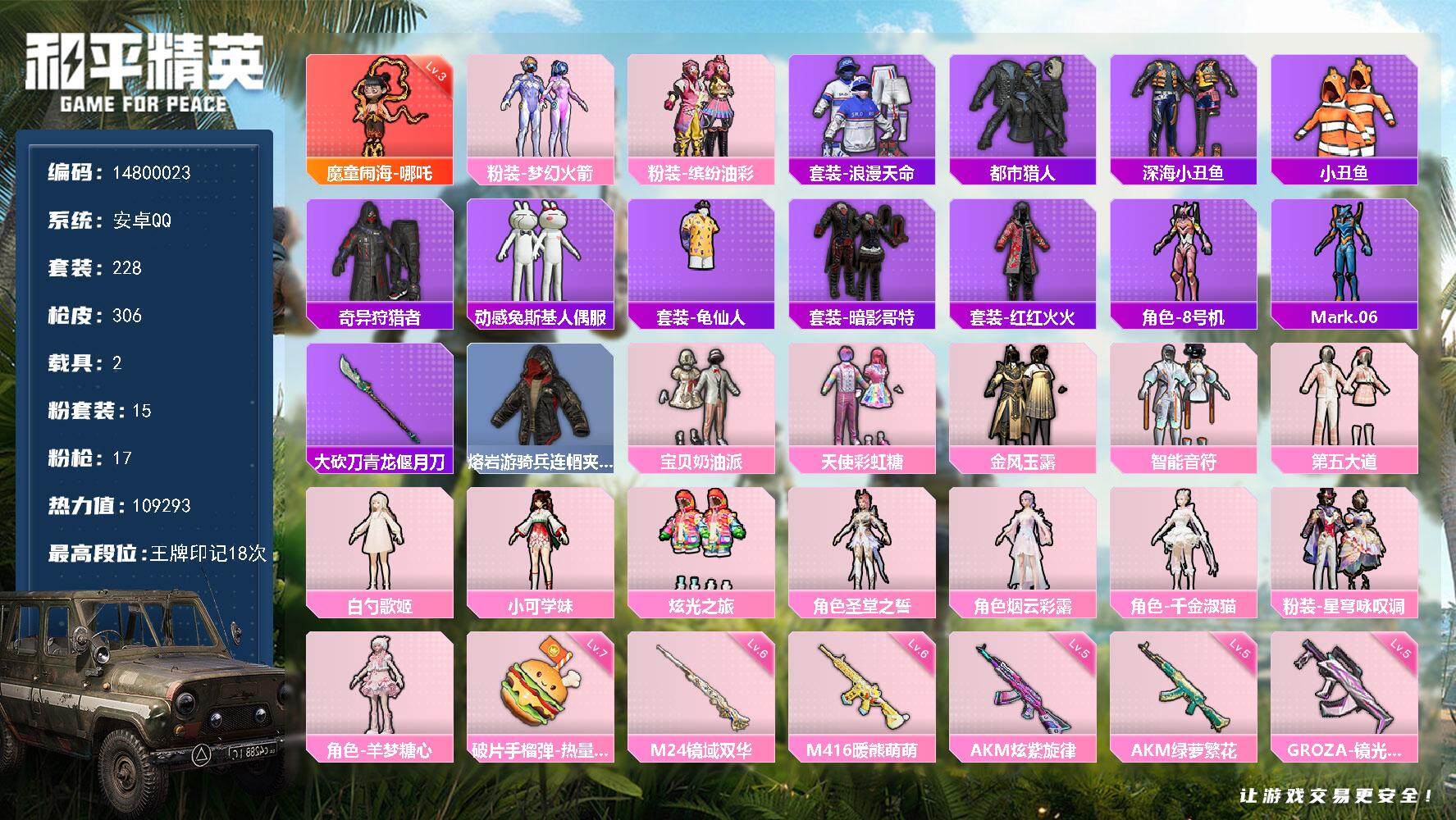 [14800281]das7858 可二次实名 安卓q-1红装4稀有2载具15粉装17特效呛22热门228套装306呛皮 109293热力值 18印记 历史卓越王牌20星 魔童闹海-哪吒 3级 都市猎人 梦幻火箭 宝贝奶油派 天使彩虹糖 缤纷油彩 【1红装】 魔童闹海-哪吒 3级 【4稀有】 奇异狩猎者 awm-黄金龙骨 都市猎人 浪漫天命 【2载具】 时空跃影星辉银 星梦玉骢 【15粉装】 圣堂之誓 梦幻火箭 宝贝奶油派 天使彩虹糖 千金淑猫 金风玉露 烟云彩露 炫光之旅 星穹咏叹调 羊梦糖心 白勺歌姬 小可学妹 智能音符 缤纷油彩 第五大道 【17特效呛】 m416-五爪金龙 1级 scar-l-金蛇镇世 3级 p90-魔童闹海敖丙 3级 akm-炫紫旋律 5级 akm-绿萝繁花 5级 kar98k-巳巳如意 5级 dp-28-豹影疾电 5级 aug-暖羊咩咩 5级 p90-能量风暴 1级 m200-梦海之灵 3级 mk14-精灵梦叶罗丽 4级 m24-镜域双华 6级 groza-镜光银凌 5级 m416-暖熊萌萌 6级 m24-莲影清波 1级 scar-l-青春物语 2级 破片手留单-热量炸弹 7级 【22热门】 8号机 mark.06 小丑鱼 龟仙人 浪漫假日 雪山精英 动感兔斯基 爱崽白熊 呆萌铁蟹 鹰眼刺客 迅捷狂鲨 深海小丑鱼 jteam战队服 暗影哥特 狂沙舞者 漫步者 破蛋小黄鸡 弄潮海豚 akm-奇异狩猎者 m762-奇异狩猎者 m24-奇异狩猎者 s686-奇异狩猎者 【5飞行器】 龙翔九天飞行器 梦幻火箭飞行器 深渊漩涡飞行器 拂晓神骑飞行器 黄族统领飞行器 【4头盔】 梦幻火箭头盔 甜心宝贝头盔 金风玉露头盔 深海小丑鱼头盔 【6背包】 梦幻火箭背包 甜心宝贝背包 金风玉露背包 放客神游背包 萌熊伴侣背包 深海小丑鱼背包
