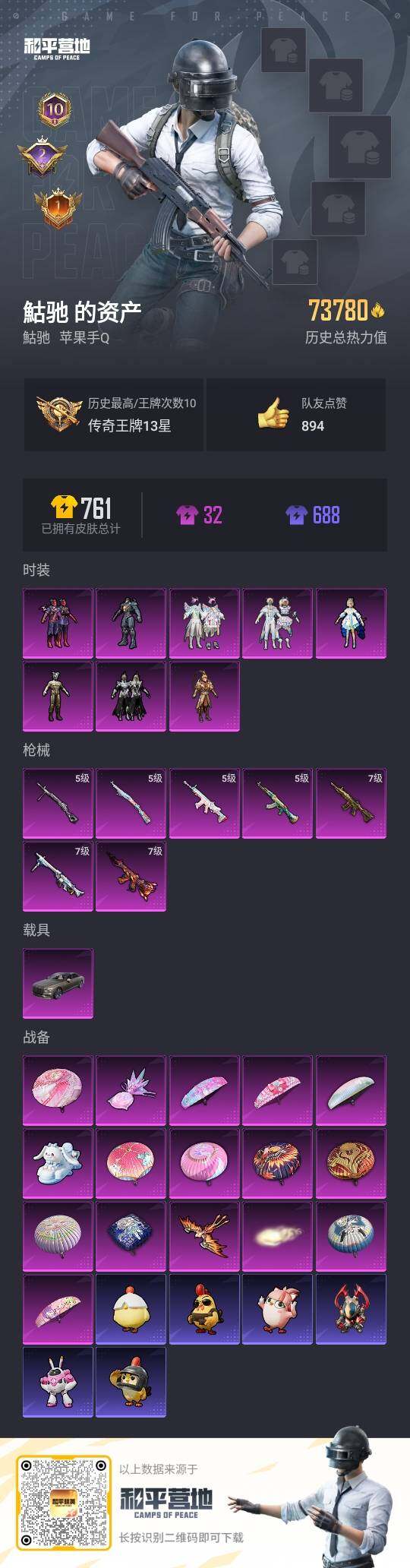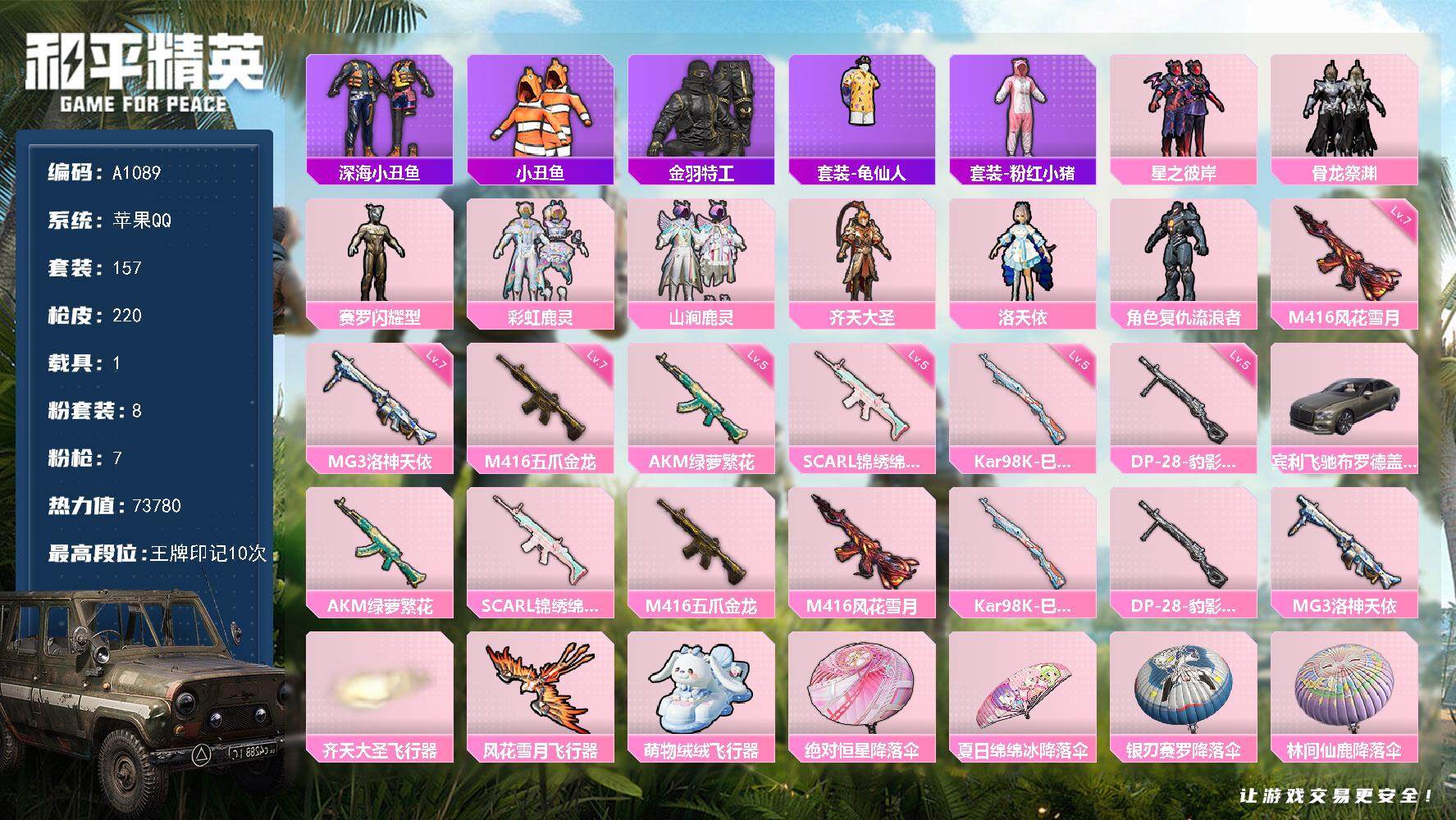 [14801844]苹果 【男神号 骨龙祭渊 赛罗闪耀型 齐天大圣,m416-五爪金龙七级 )m416-风花雪月七级 ,mg3-洛神天依七级 宾利飞驰(布罗德盖棕双色)】手q-8粉装-7特效呛-1载具-4粉色飞行器-73780热力值-10王牌印记-157套装-220呛皮 【热门品类】:套装-深海小丑鱼,套装-小丑鱼,套装-金羽特工,套装-龟仙人,套装-粉红小猪 【粉色套装】:粉装-,粉装-骨龙祭渊,角色-赛罗闪耀型,粉装-彩虹鹿灵,粉装-山涧鹿灵,粉装-齐天大圣,角色-洛天依,角色-复仇流浪者 【粉色呛皮等级】:akm-绿萝繁花五级,scar-l-锦绣绵绵五级,m416-五爪金龙七级,m416-风花雪月七级,kar98k-巳巳如意五级,dp-28-豹影疾电五级,mg3-洛神天依七级 【粉色载具】:宾利飞驰(布罗德盖棕双色) 【粉色呛皮】:akm-绿萝繁花,scar-l-锦绣绵绵,m416-五爪金龙,m416-风花雪月,kar98k-巳巳如意,dp-28-豹影疾电,mg3-洛神天依 【粉色飞行器】:齐天大圣飞行器,风花雪月飞行器,萌物绒绒飞行器 【粉色降落伞】:绝对恒星降落伞,夏日绵绵冰降落伞,银刃赛罗降落伞,林间仙鹿降落伞,齐天大圣降落伞,洛神天依降落伞,风花雪月降落伞,海渊国主降落伞,旋转彩虹降落伞,莲影清波降落伞,樱桃泡泡降落伞 【稀有套装】:套装-龟仙人,套装-巳巳如意,角色-俏兔智灵,角色-时希公主,套装-朱霞炽焰,套装-凌霄紫焰,玩偶服-喜羊羊,套装-炫彩糖果 【稀有呛皮】:akm-彩虹符号,akm-星之彼岸,akm-海渊国主,akm-生命誓言,akm-虎虎生威,akm-霓虹街区,akm-龙的传人,m16a4-幻世战舞者,m16a4-甜心亚梦,m16a4-莲影清波,scar-l-夜灯,scar-l-暗夜玫瑰,scar-l-玉兔迎春,scar-l-粉锦千层,scar-l-黄金龙骨,scar-l-龙宫之主,m416-夜灯,m416-暗夜行者,m416-月影鸳鸯,m416-糯团青竹,m416-蓝色火焰,groza-2b战斗服款,groza-异彩先驱,groza-彩虹符号,groza-影袭,groza-林间仙鹿,groza-治愈之星,groza-田园牧歌,groza-蓝莓炮弹,aug-2p战斗服款,aug-焰龙焚天,q-彩虹符号,q-