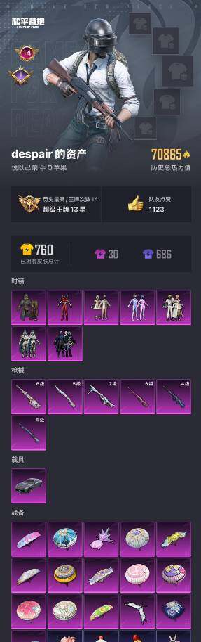 [14804583]苹果 【都市猎人 梦幻火箭 暗影哥特 红螳螂 】手q-7粉装-6特效呛-1载具-2粉色飞行器-70865热力值-14王牌印记-158套装-209呛皮 【热门品类】:粉装-梦幻火箭,套装-浪漫天命,套装-都市猎人,套装-奇异狩猎者,套装-龟仙人,套装-暗影哥特 【粉色套装】:粉装-极限特训,粉装-宝贝奶油派,粉装-梦幻火箭,粉装-银龙傲海,粉装-暗夜玫瑰,角色-2号机款机体服,粉装-筑梦精灵 【粉色呛皮等级】:kar98k-巳巳如意五级,m24-暗星紫秘六级,slr-暗夜玫瑰四级,amr-智耀战神六级,mg3-洛神天依七级 【粉色载具】:兰博基尼estoque(银翼灰) 【粉色呛皮】:kar98k-暗翼战神,kar98k-巳巳如意,m24-暗星紫秘,slr-暗夜玫瑰,amr-智耀战神,mg3-洛神天依 【粉色飞行器】:天之羽翼飞行器 【粉色降落伞】:梦幻火箭降落伞,暗夜玫瑰降落伞,洛神天依降落伞,碧影闪光降落伞,筑梦精灵降落伞,旋转彩虹降落伞,第五大道降落伞,圣堂之誓降落伞,创世·救赎降落伞,月影灵韵降落伞,智耀战神降落伞,圣斗士星矢降落伞,异瞳寒姬降落伞 【稀有套装】:套装-龟仙人,套装-炽纹蛇影,套装-巳巳如意,套装-雪国风尚,套装-糖糖葫芦,套装-青团波波,套装-棉花软糖,角色-都市丽猫,套装-燕燕于飞,套装-鱼渊荷华,套装-紫幽梦,套装-蓝冰羽,角色-猎影月神,套装-炫彩糖果 【稀有呛皮】:akm-夜灯,akm-彩虹符号,akm-影袭,akm-百万伏特,akm-破晓战魂,akm-筑梦精灵,akm-萌趣颜团子,akm-虎虎生威,akm-霓虹街区,akm-龙的传人,m16a4-幻世战舞者,m16a4-甜心亚梦,m16a4-红色方程式,m16a4-蓝色火焰,scar-l-炫彩节奏,scar-l-玉兔迎春,scar-l-红色方程式,scar-l-黄金龙骨,m416-糯团青竹,m416-紫翼圣骑,m416-红色方程式,m416-蓝色火焰,groza-异彩先驱,groza-彩虹符号,groza-影袭,groza-懵萌河马,groza-治愈之星,groza-田园牧歌,groza-青春物语,aug-天降萌叽,aug-幻影战神,aug-青春冒险家,q-彩虹符号,q-洛神天依,q-神秘黑猫,q-飞驰魅影,m762-天降萌叽,m762-奇异狩猎
