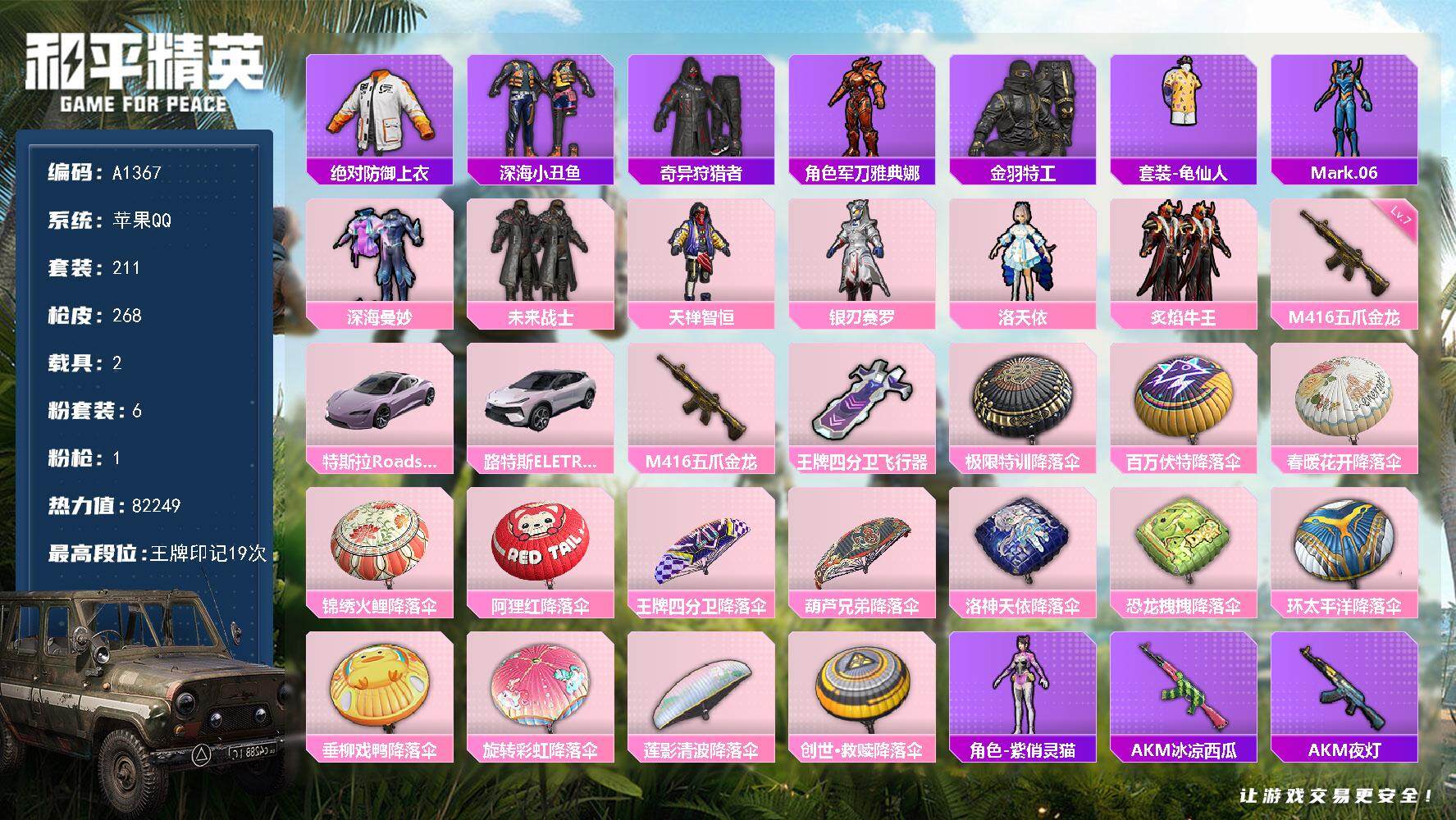 [14808194]苹果【男神号 深海曼妙 未来战士 银刃赛罗 洛天依 m416-五爪金龙七级 特斯拉roadster(沁心粉),路特斯eletre(花绽灰】 手q-6粉装-1特效呛-2载具-1粉色飞行器-82249热力值-19王牌印记-211套装-268呛皮 【热门品类】:绝对防御上衣,套装-深海小丑鱼,套装-奇异狩猎者,角色-军刀雅典娜,套装-金羽特工,套装-龟仙人,角色-mark.06 【粉色套装】:粉装-深海曼妙,粉装-未来战士,粉装-天禅智恒,粉装-银刃赛罗,角色-洛天依,粉装-炙焰牛王 【粉色呛皮等级】:m416-五爪金龙七级 【粉色载具】:特斯拉roadster(沁心粉),路特斯eletre(花绽灰) 【粉色呛皮】:m416-五爪金龙 【粉色飞行器】:王牌四分卫飞行器 【粉色降落伞】:极限特训降落伞,百万伏特降落伞,春暖花开降落伞,锦绣火鲤降落伞,阿狸红降落伞,王牌四分卫降落伞,葫芦兄弟降落伞,洛神天依降落伞,恐龙拽拽降落伞,环太平洋降落伞,垂柳戏鸭降落伞,旋转彩虹降落伞,莲影清波降落伞,创世·救赎降落伞 【稀有套装】:套装-龟仙人,角色-紫俏灵猫 【稀有呛皮】:akm-冰凉西瓜,akm-夜灯,akm-彩虹符号,akm-星之信仰,akm-春暖花开,akm-灼热熔岩,akm-环太平洋,akm-生命誓言,akm-百万伏特,akm-破晓战魂,akm-萌趣颜团子,akm-虎虎生威,akm-霓虹街区,akm-龙的传人,m16a4-凝视深渊,m16a4-夜灯,m16a4-幻世战舞者,m16a4-机械英豪,m16a4-甜心亚梦,m16a4-红色方程式,m16a4-蓝色火焰,m16a4-魔法学院,scar-l-夜灯,scar-l-炫彩节奏,scar-l-玉兔迎春,scar-l-生命誓言,scar-l-致命红樱,scar-l-雷霆特警,scar-l-黄金龙骨,m416-动感兔斯基,m416-夜灯,m416-潮汐统领,m416-糯团青竹,m416-红色方程式,m416-绯红前夜,m416-蓝色火焰,groza-异彩先驱,groza-彩虹符号,groza-影袭,groza-恐龙拽拽,groza-懵萌河马,groza-治愈之星,groza-生命誓言,groza-田园牧歌,groza-银河战甲,groza-雷霆特警,aug-2p战斗服款,aug-天降萌叽,aug-青春冒险家,aug-魔法