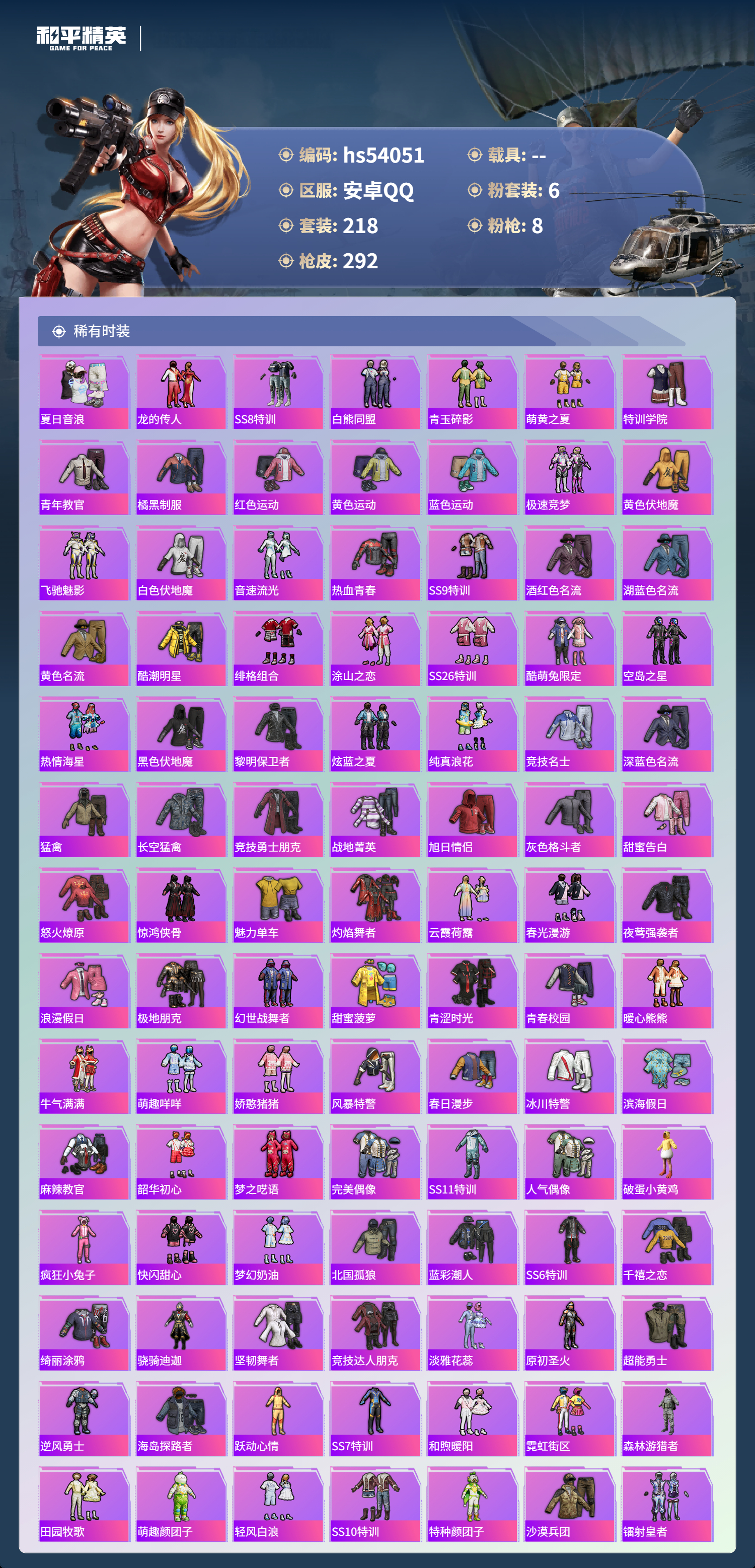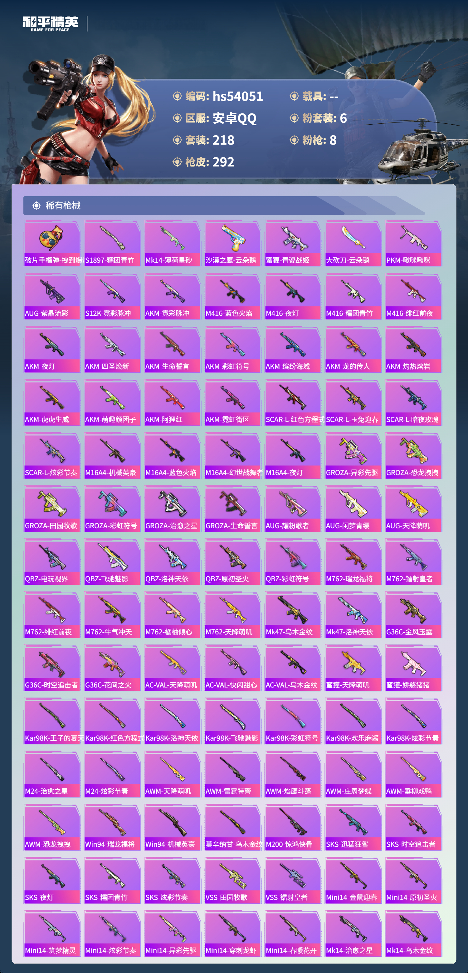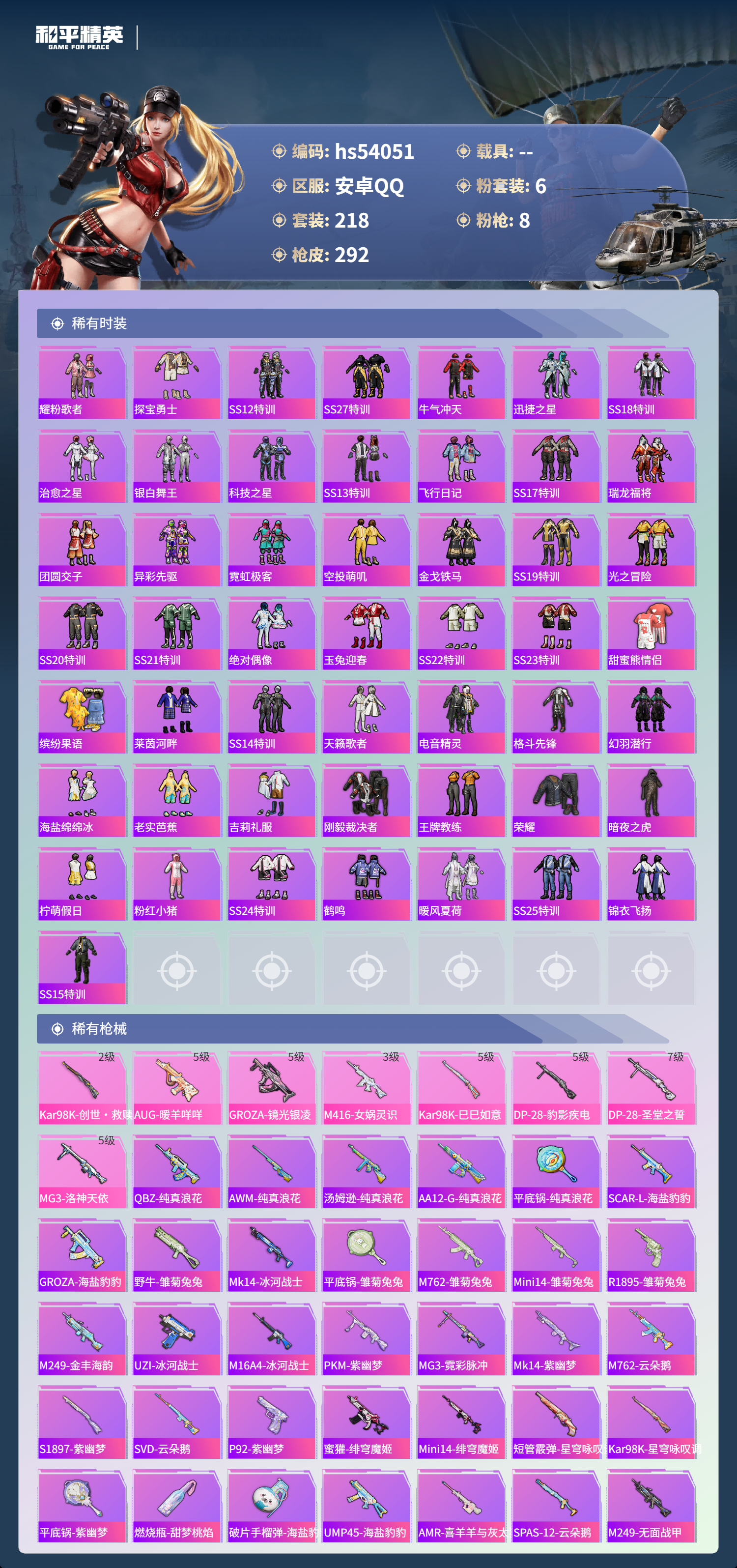 hs54051 安卓手q-13王牌印记-1红装-6粉装-8特效呛-99406热力值-218套装-292呛皮-3卓越印记-1传奇印记【1红装】镜域双华-欧若拉/4级【6粉装】套装-闲梦青缨套装-缤纷油彩套装-蜜语绒猫套装-恐龙拽拽角色-洛天依角色-樱桃泡泡【8特效呛】mg3-洛神天依/5级dp-28-圣堂之誓/7级m416-女娲灵识/3级kar98k-创世·救赎/2级kar9