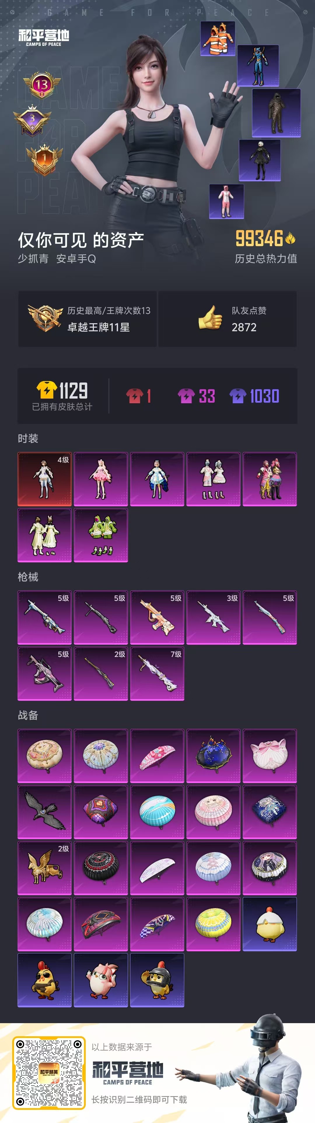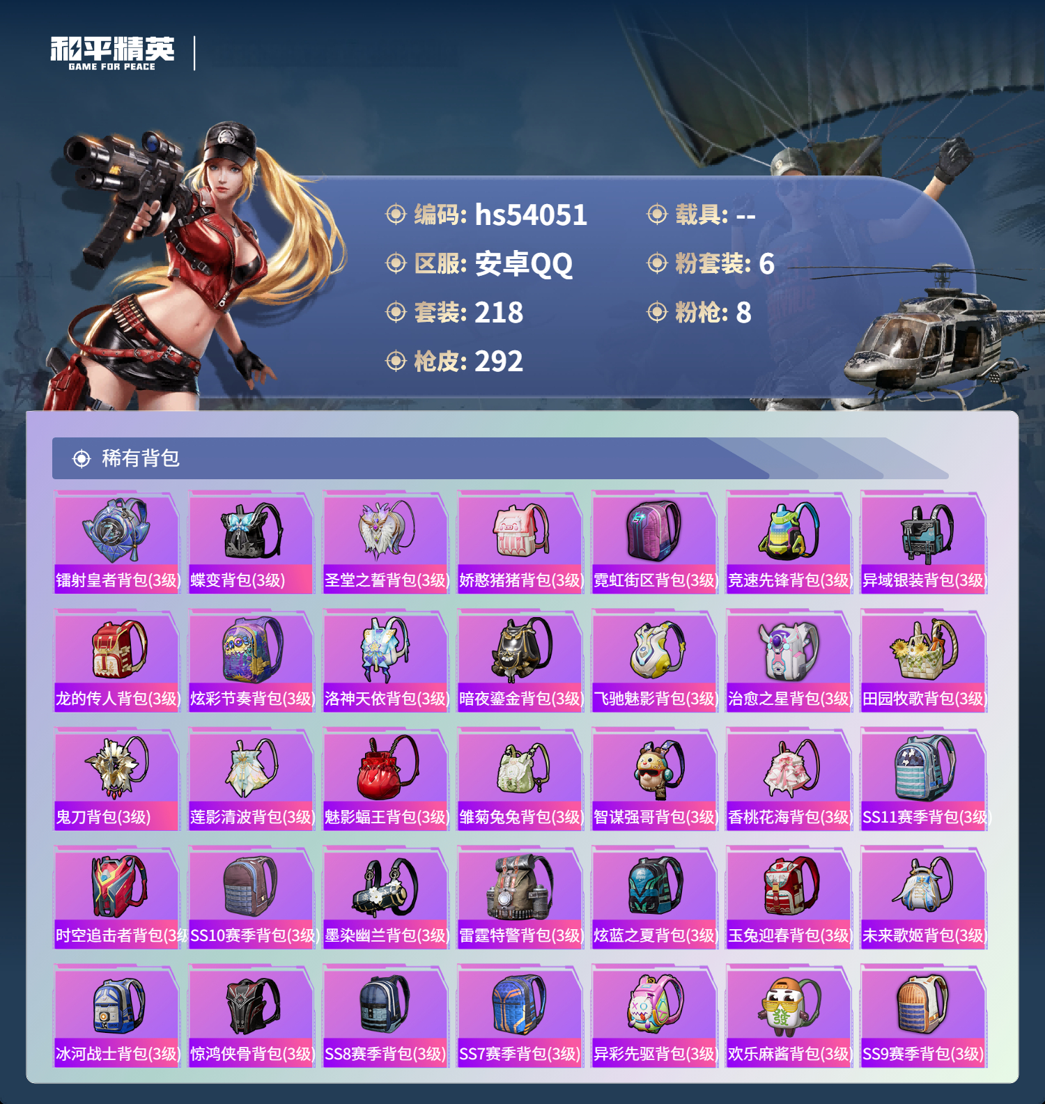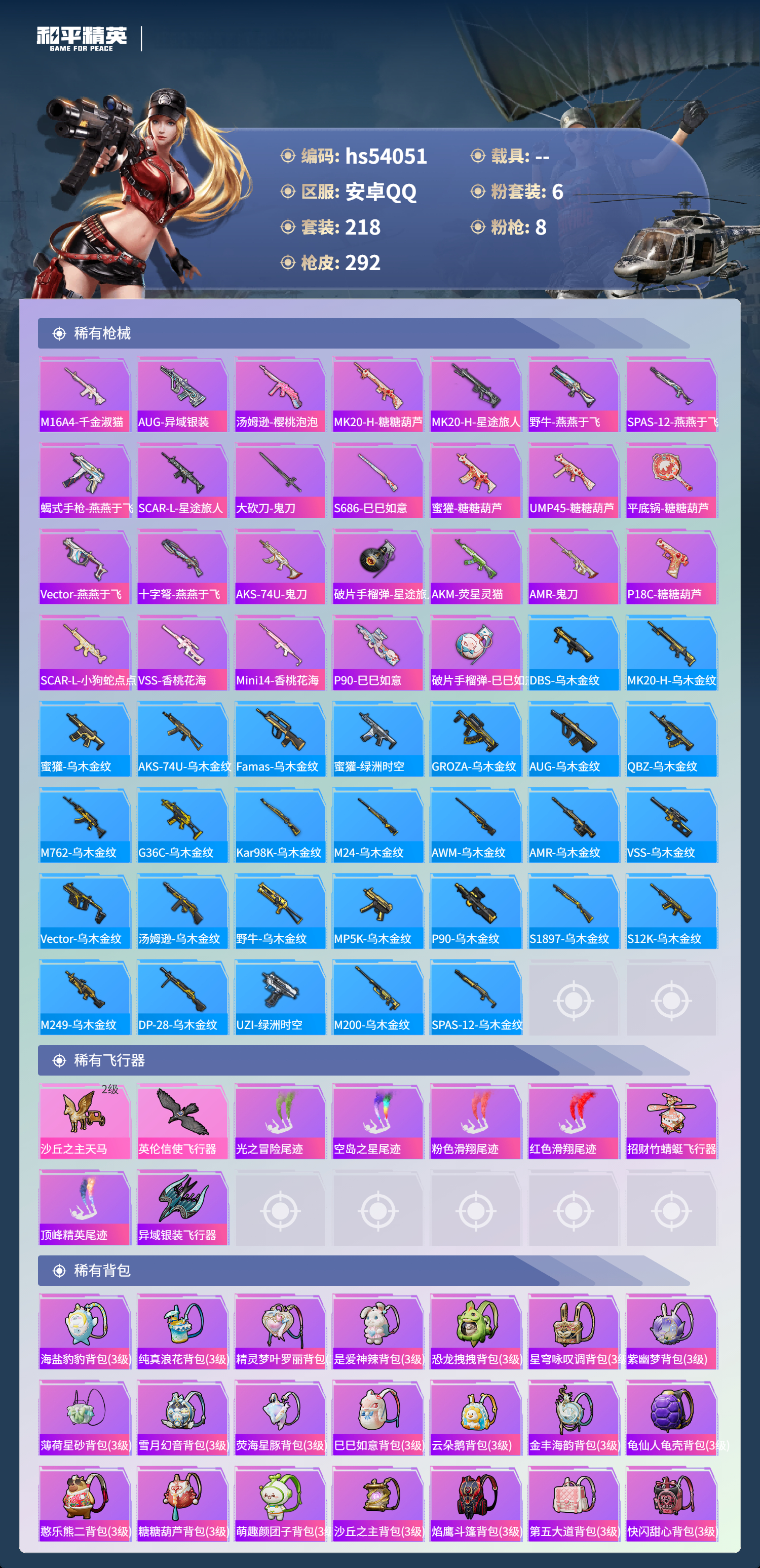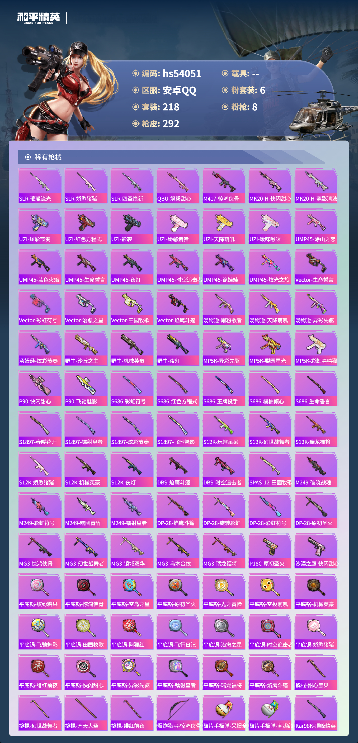 hs54051 安卓手q-13王牌印记-1红装-6粉装-8特效呛-99406热力值-218套装-292呛皮-3卓越印记-1传奇印记【1红装】镜域双华-欧若拉/4级【6粉装】套装-闲梦青缨套装-缤纷油彩套装-蜜语绒猫套装-恐龙拽拽角色-洛天依角色-樱桃泡泡【8特效呛】mg3-洛神天依/5级dp-28-圣堂之誓/7级m416-女娲灵识/3级kar98k-创世·救赎/2级kar9
