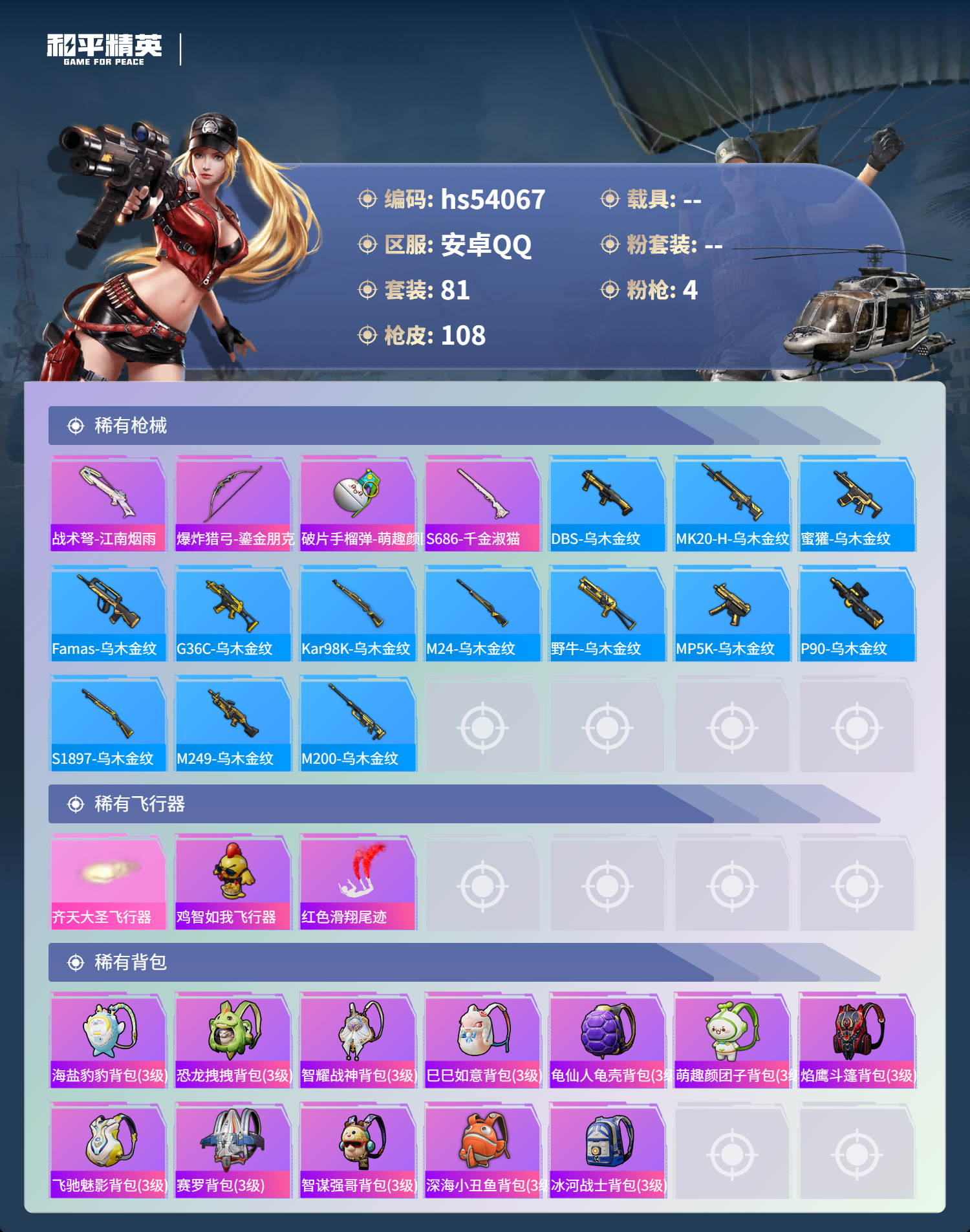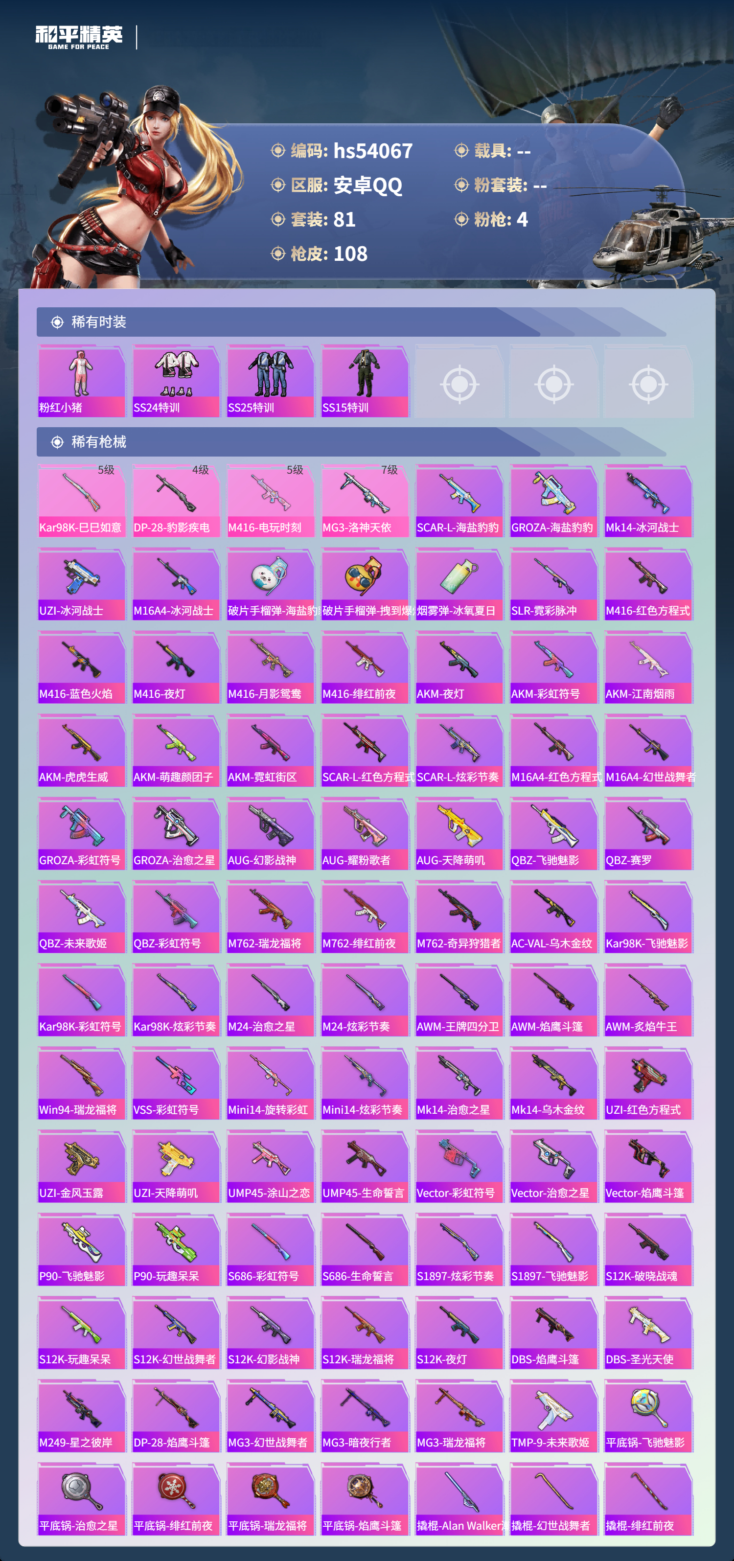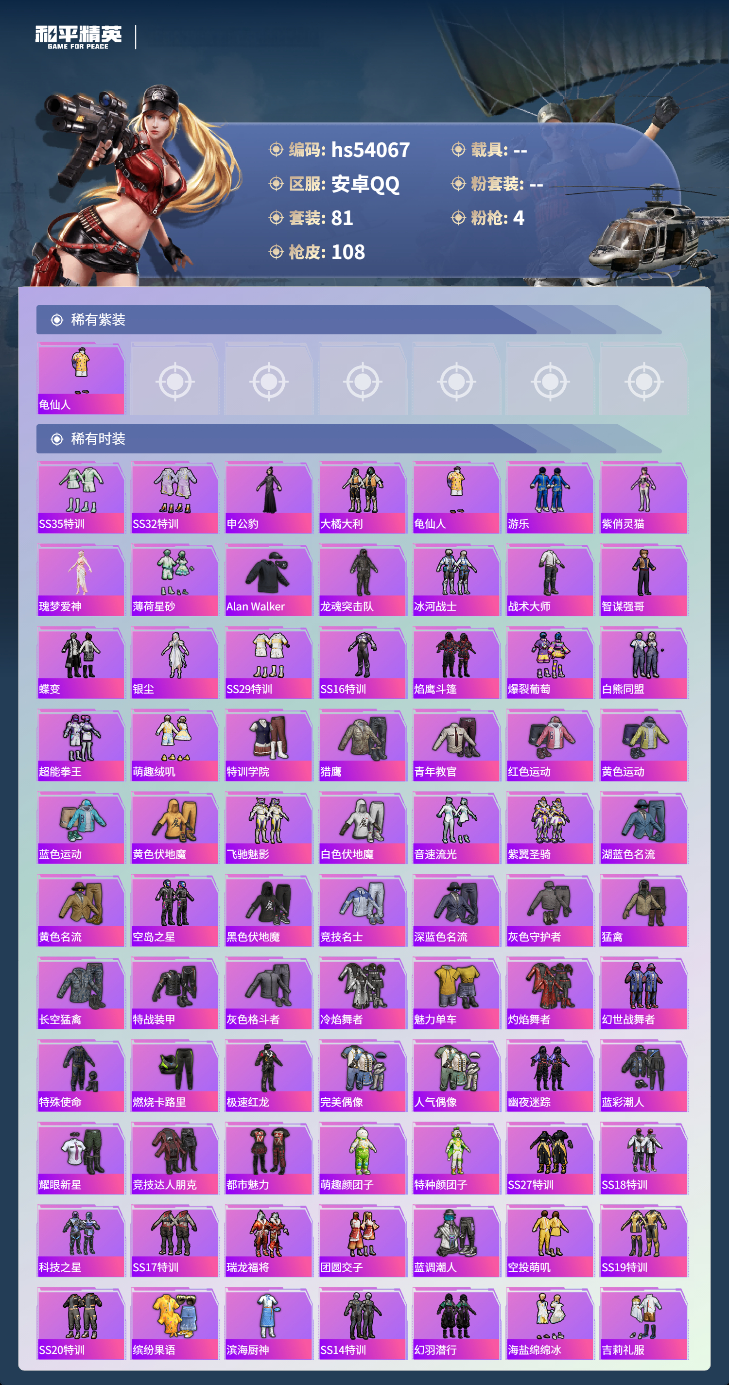 hs54067 安卓手q-2王牌印记-4特效呛-30484热力值-81套装-108呛皮【4特效呛】mg3-洛神天依/7级kar98k-巳巳如意/5级dp-28-豹影疾电/4级m416-电玩时刻/5级【1稀有紫装】龟仙人【81稀有时装】ss35特训ss32特训申公豹大橘大利龟仙人游乐紫俏灵猫瑰梦爱神薄荷星砂alan walker龙魂突击队冰河战士战术大师智谋强哥