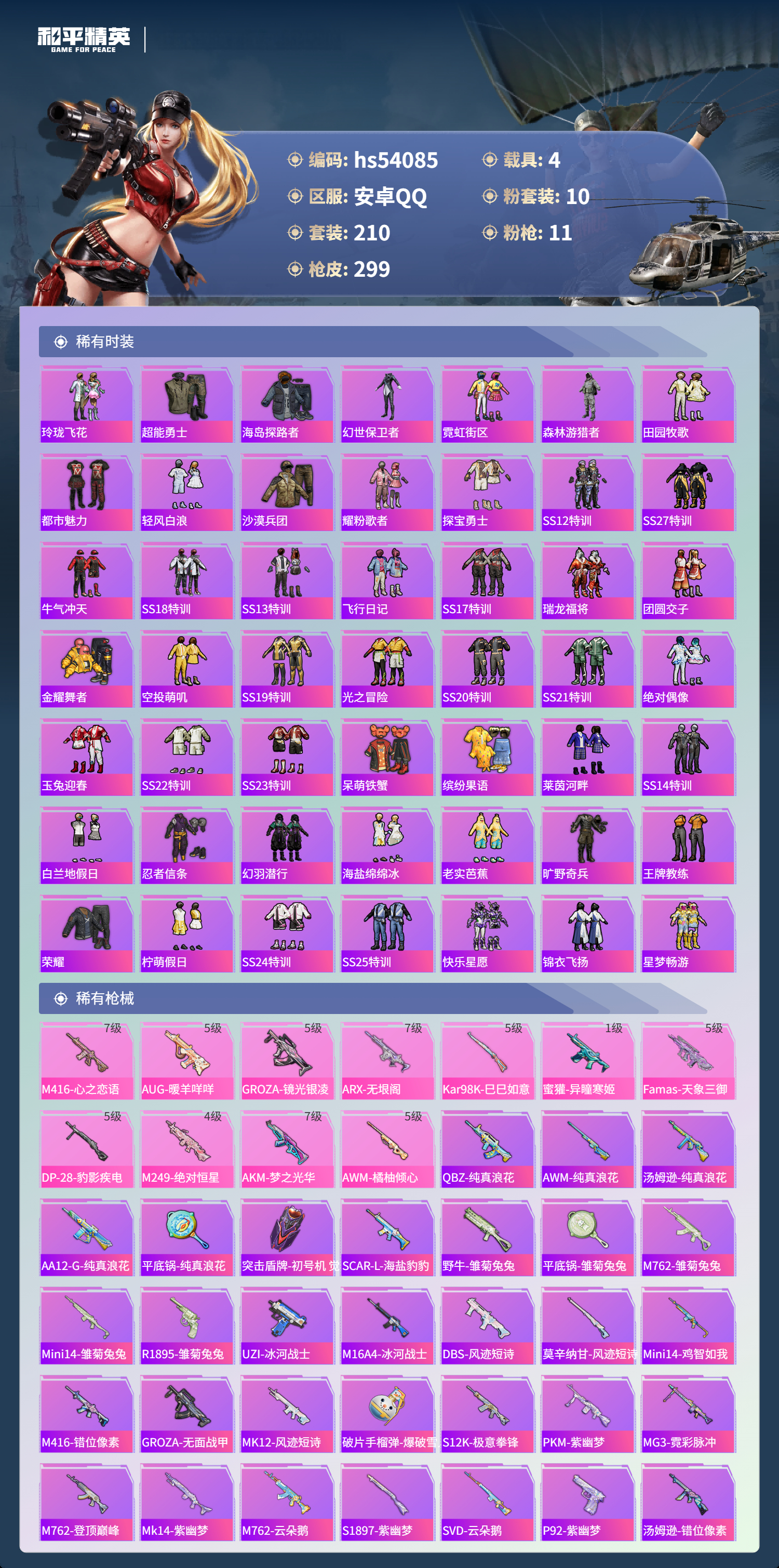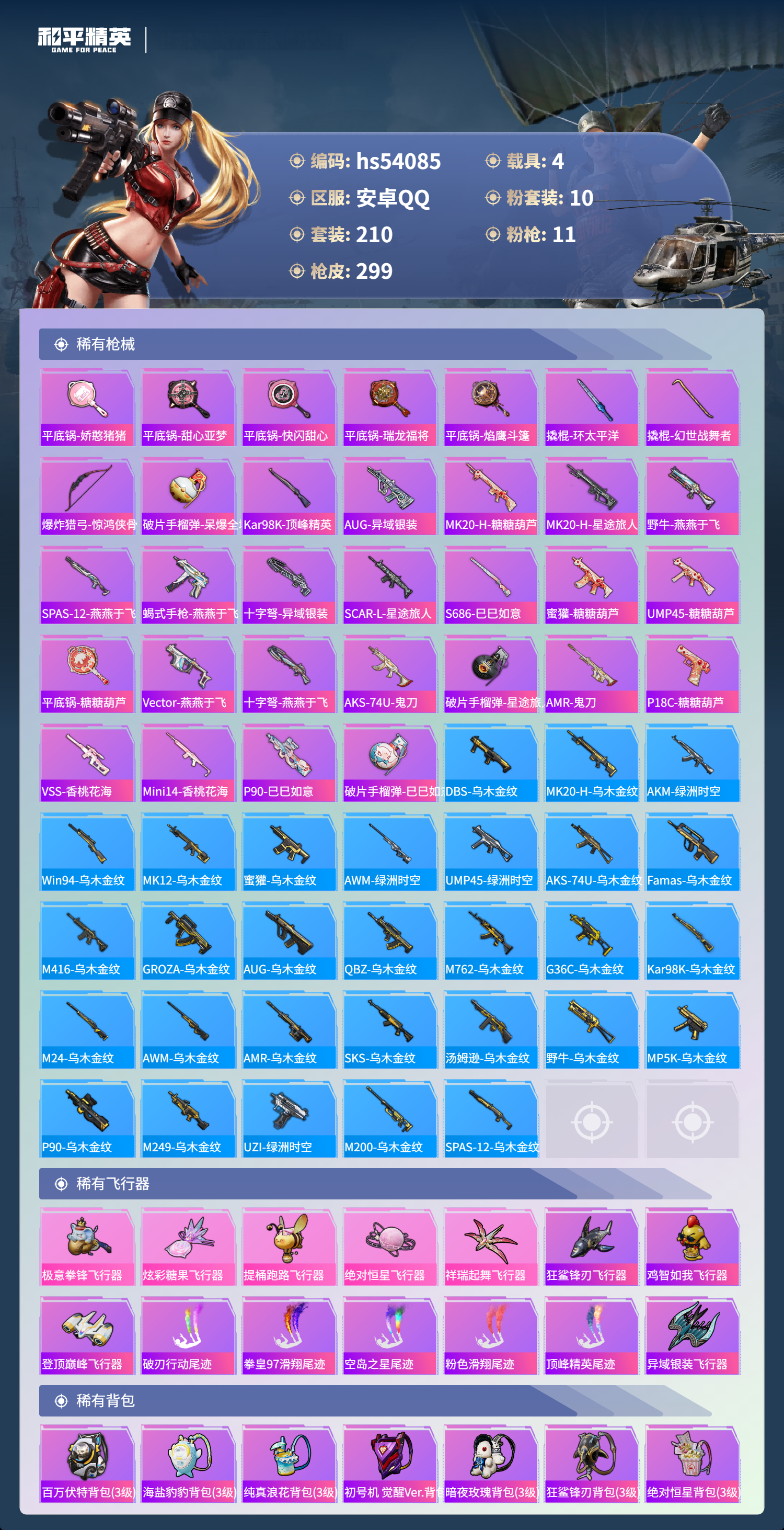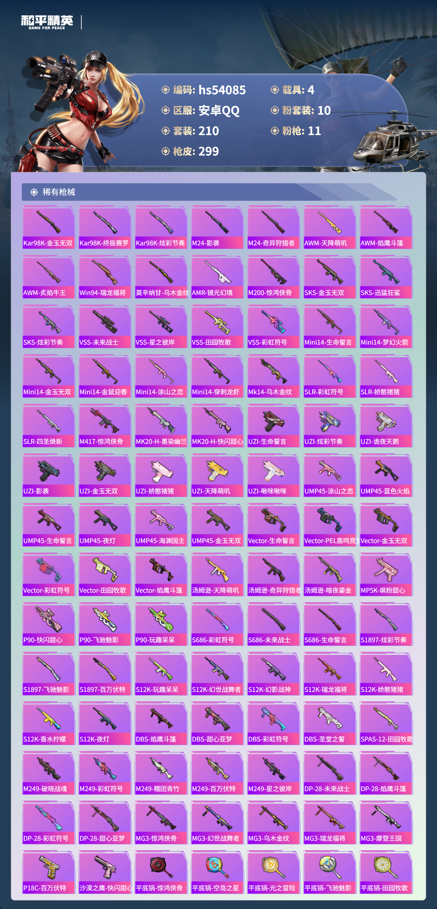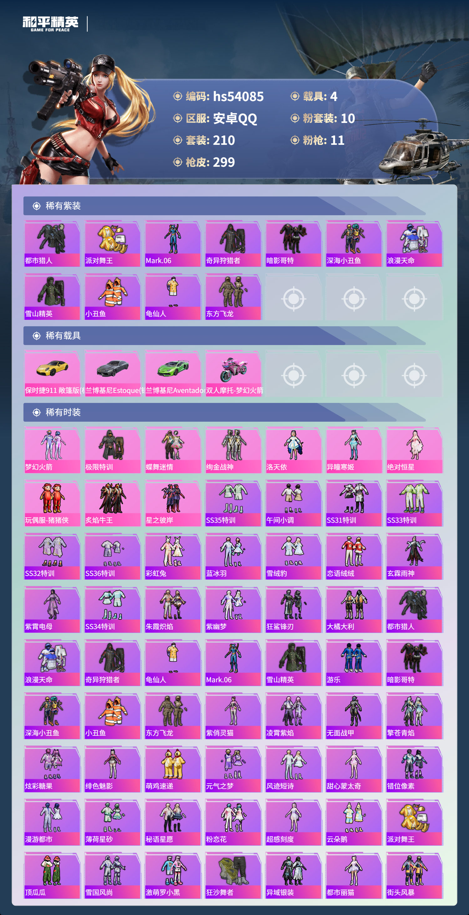 hs54085 安卓手q-15王牌印记-10粉装-11特效呛-4载具-96953热力值-210套装-299呛皮-1卓越印记-1传奇印记【10粉装】角色-异瞳寒姬套装-蝶舞迷情套装-梦幻火箭角色-洛天依套装-极限特训套装-炙焰牛王玩偶服-猪猪侠套装-星之彼岸套装-绚金战神角色-绝对恒星【11特效呛】蜜獾-异瞳寒姬/1级aug-暖羊咩咩/5级famas-天象三御/5级awm