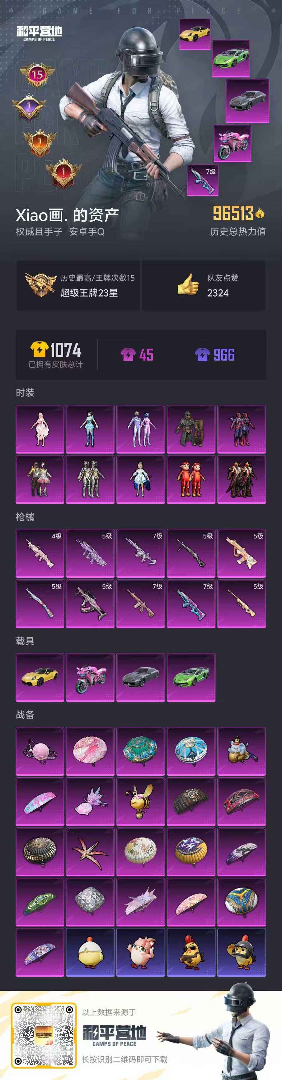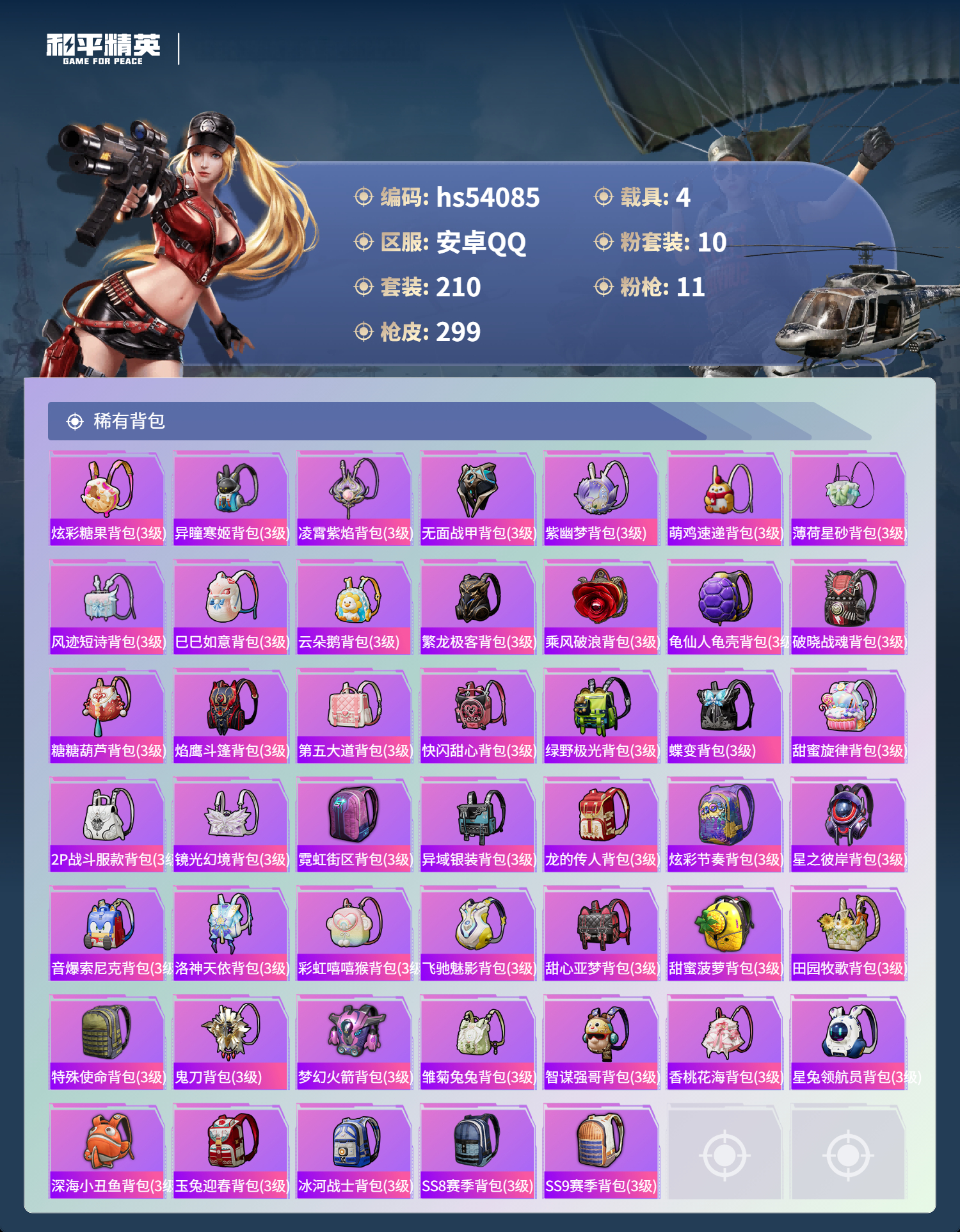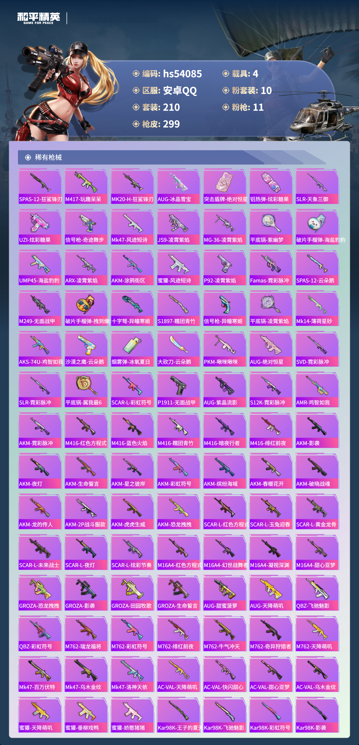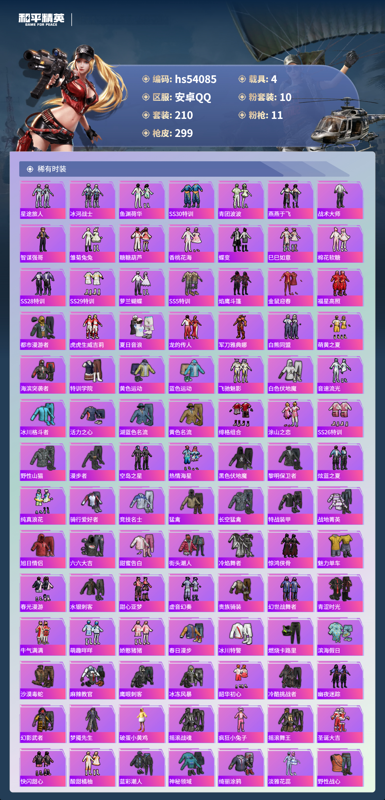 hs54085 安卓手q-15王牌印记-10粉装-11特效呛-4载具-96953热力值-210套装-299呛皮-1卓越印记-1传奇印记【10粉装】角色-异瞳寒姬套装-蝶舞迷情套装-梦幻火箭角色-洛天依套装-极限特训套装-炙焰牛王玩偶服-猪猪侠套装-星之彼岸套装-绚金战神角色-绝对恒星【11特效呛】蜜獾-异瞳寒姬/1级aug-暖羊咩咩/5级famas-天象三御/5级awm