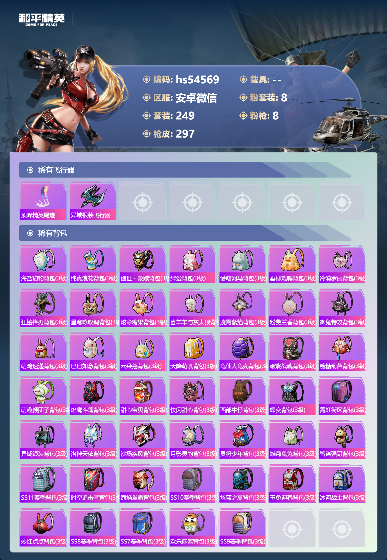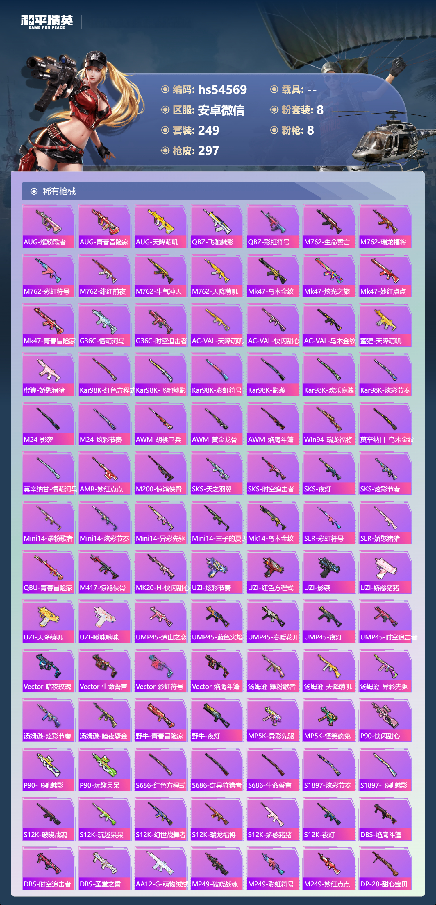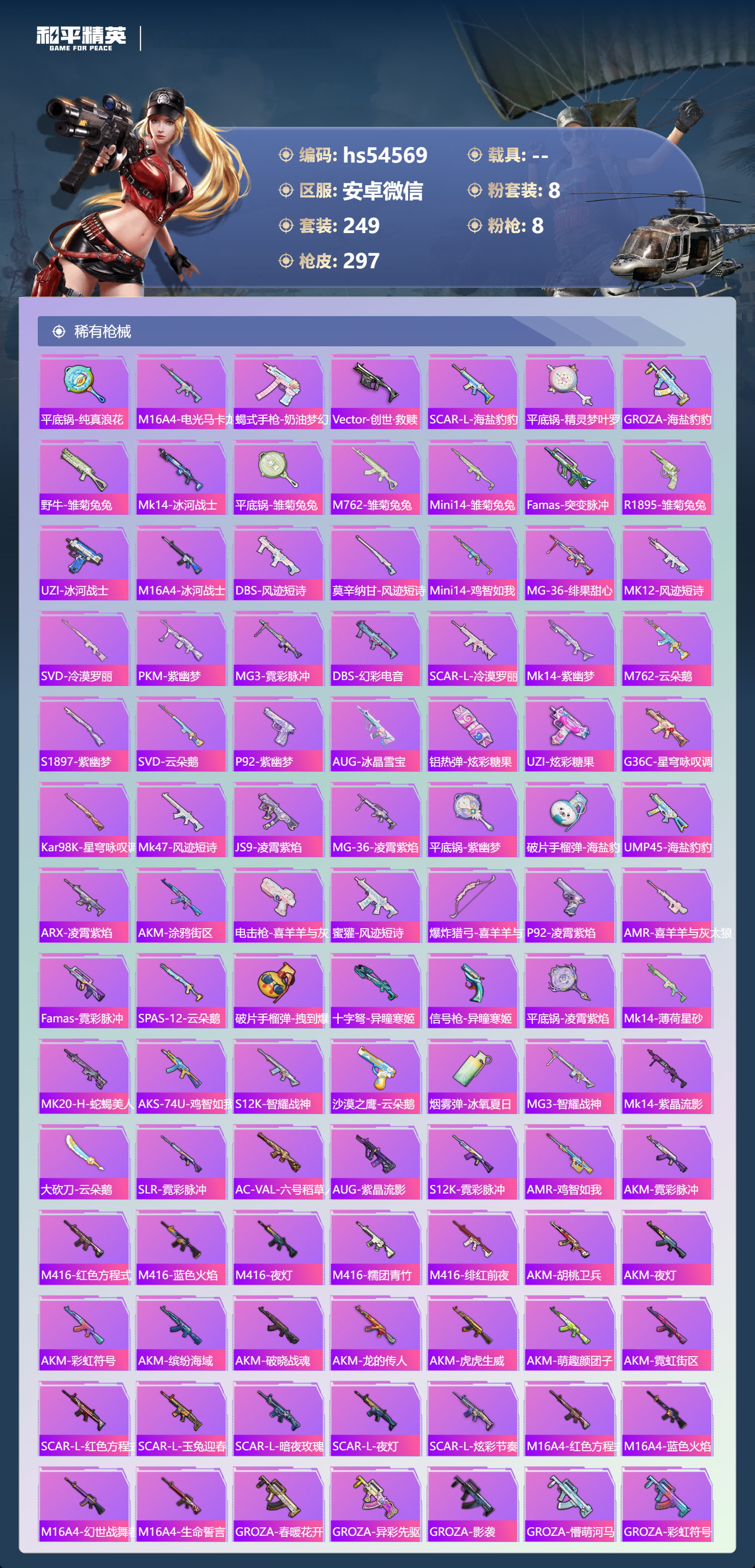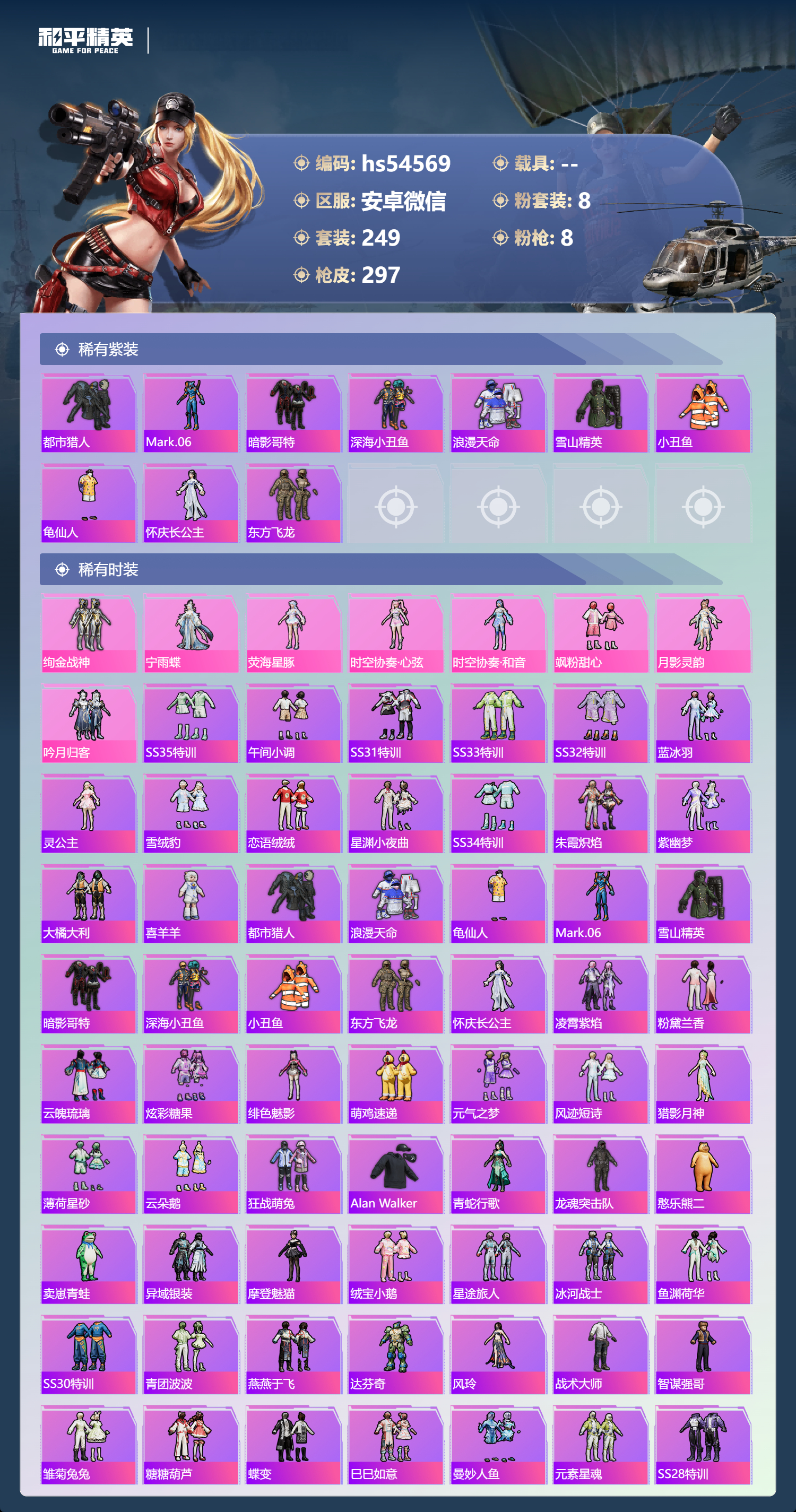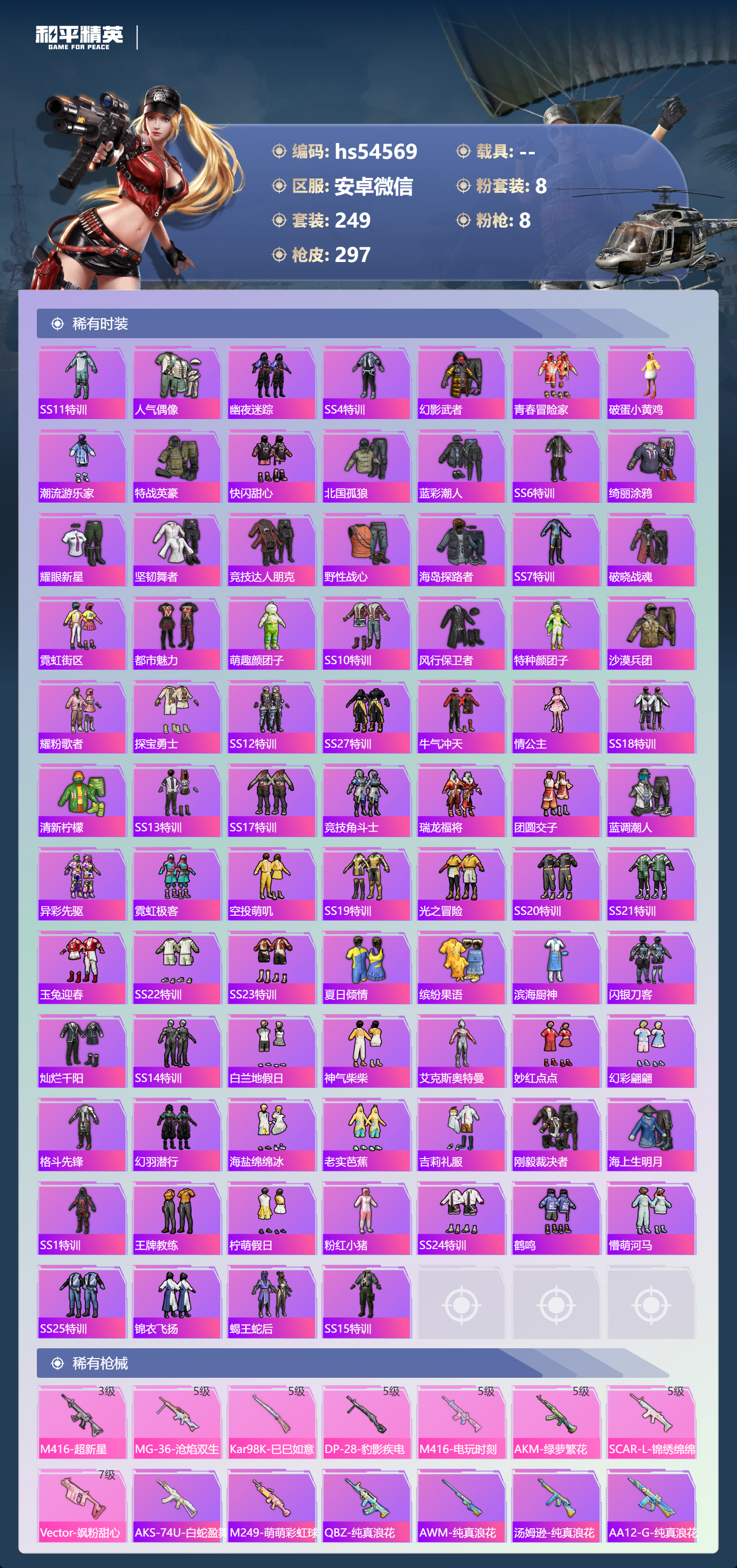 hs54569安卓微信-17王牌印记-8粉装-8特效呛-91017热力值-249套装-297呛皮-2卓越印记-1传奇印记【8粉装】套装-吟月归客套装-飒粉甜心套装-绚金战神角色-宁雨蝶时空协奏·心弦角色-荧海星豚时空协奏·和音角色-月影灵韵【8特效呛】m416-超新星/3级scar-l-锦绣绵绵/5级mg-36-沧焰双生/5级akm-绿萝繁花/5级kar98k-巳巳如意/