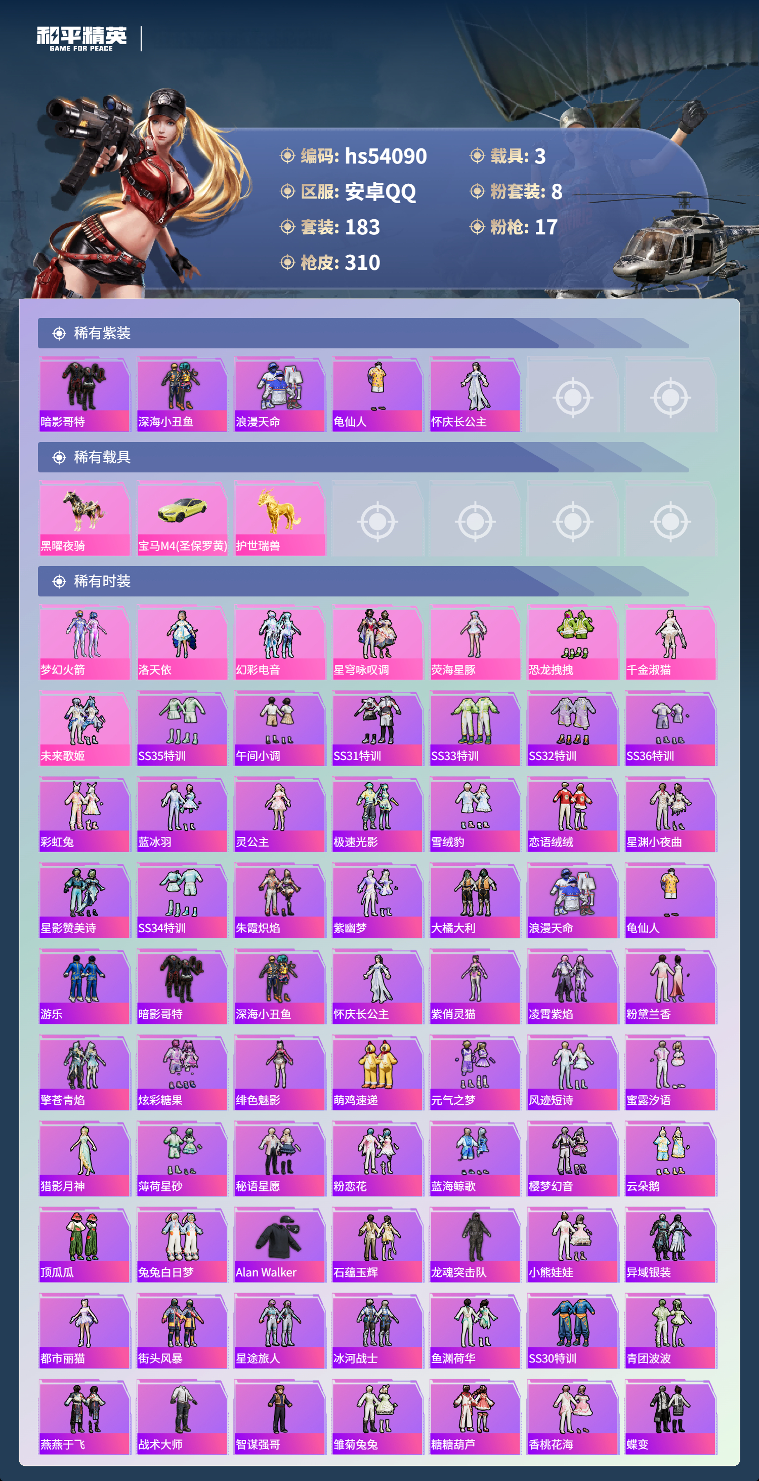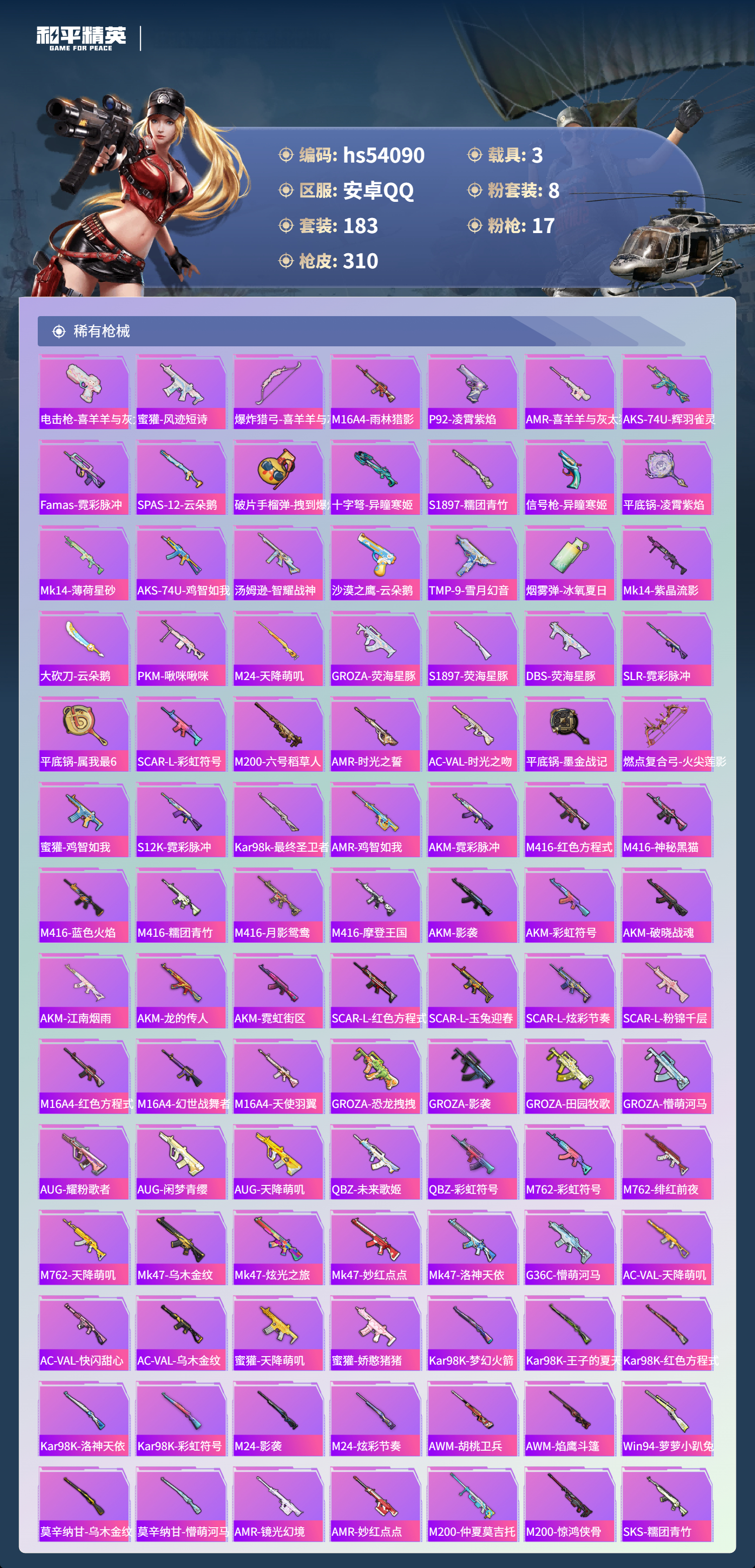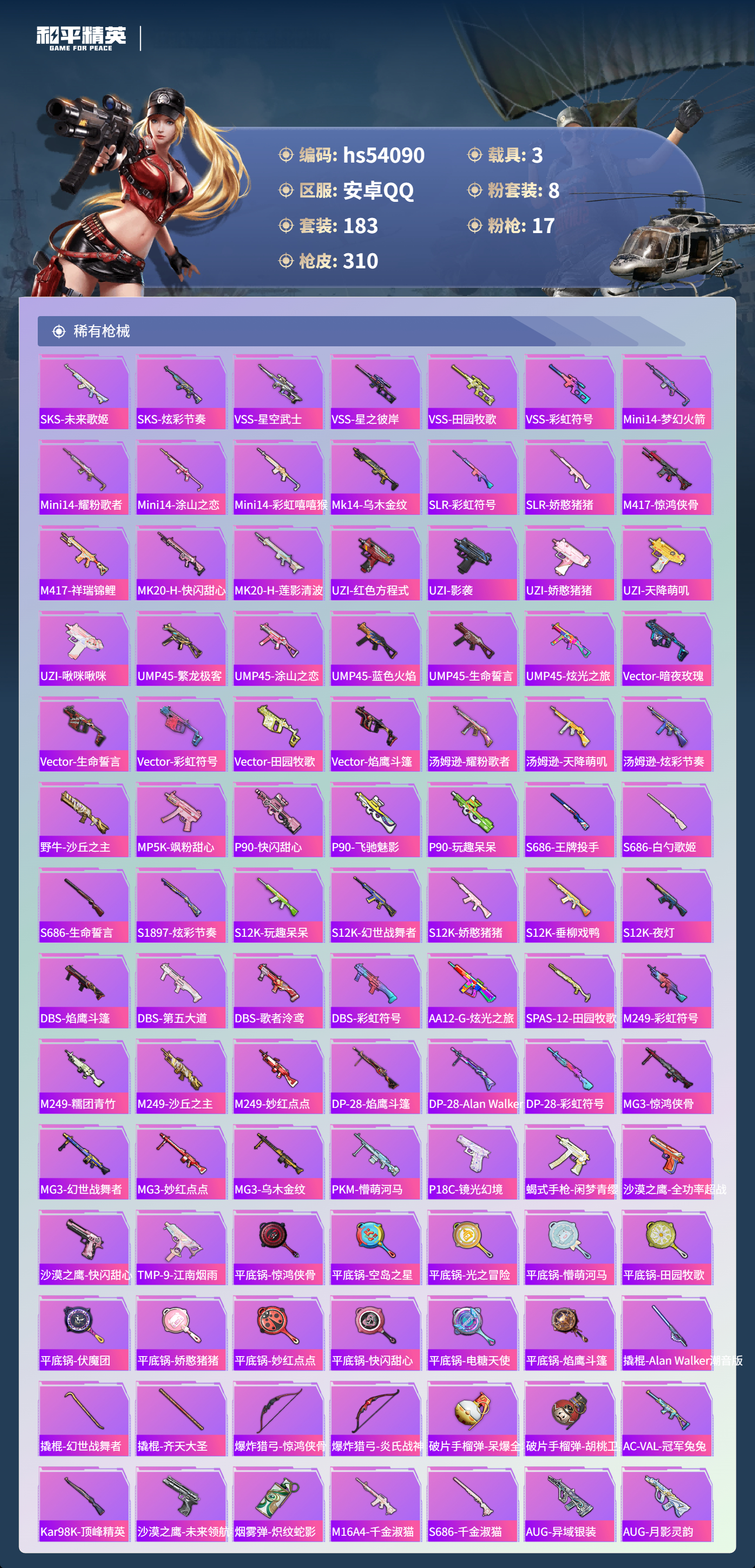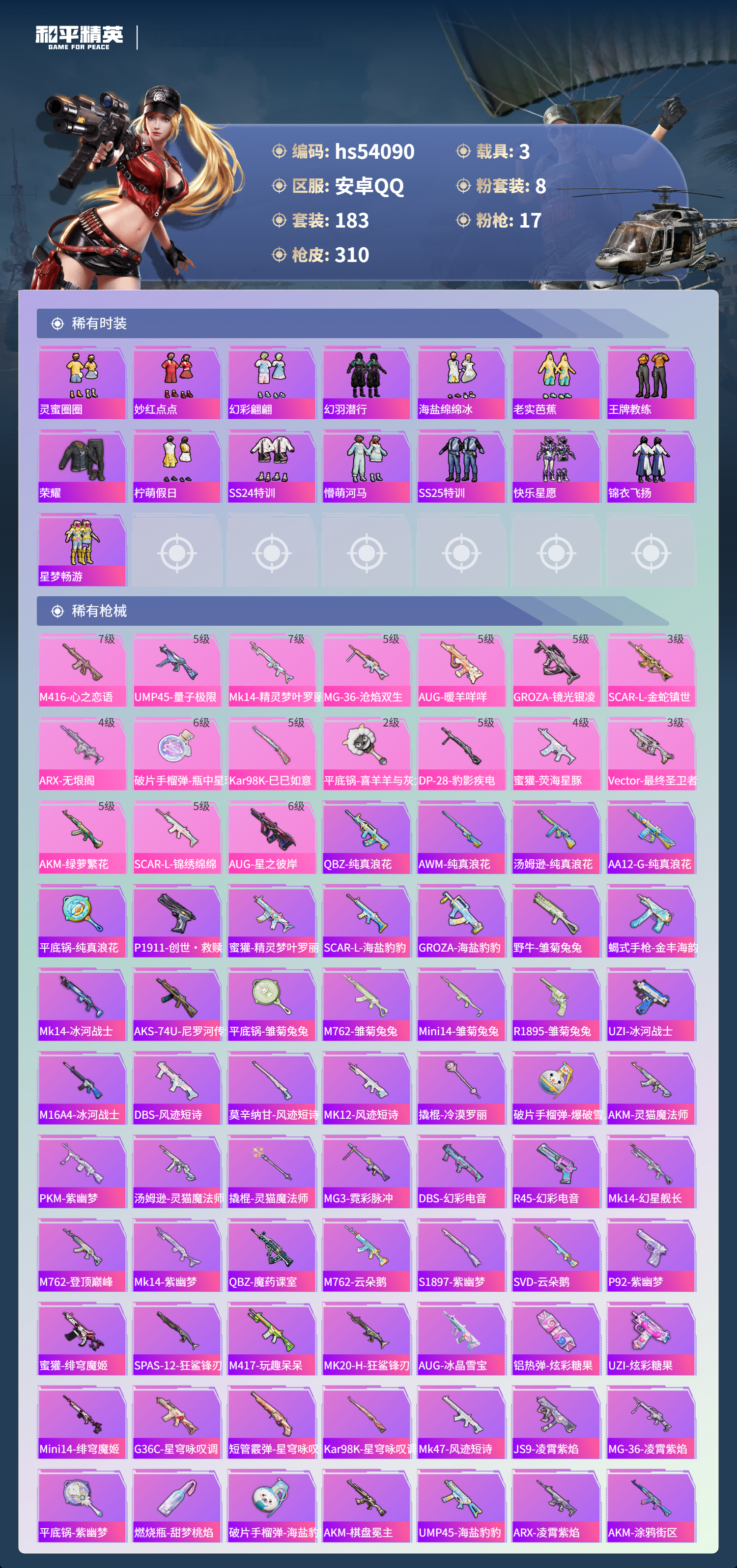 hs54090 安卓手q-15王牌印记-8粉装-17特效呛-3载具-热力值-183套装-310呛皮-4卓越印记【8粉装】角色-千金淑猫套装-梦幻火箭套装-未来歌姬角色-荧海星豚角色-洛天依套装-恐龙拽拽套装-星穹咏叹调套装-幻彩电音【17特效呛】groza-镜光银凌/5级scar-l-锦绣绵绵/5级kar98k-巳巳如意/5级mg-36-沧焰双生/5级aug-