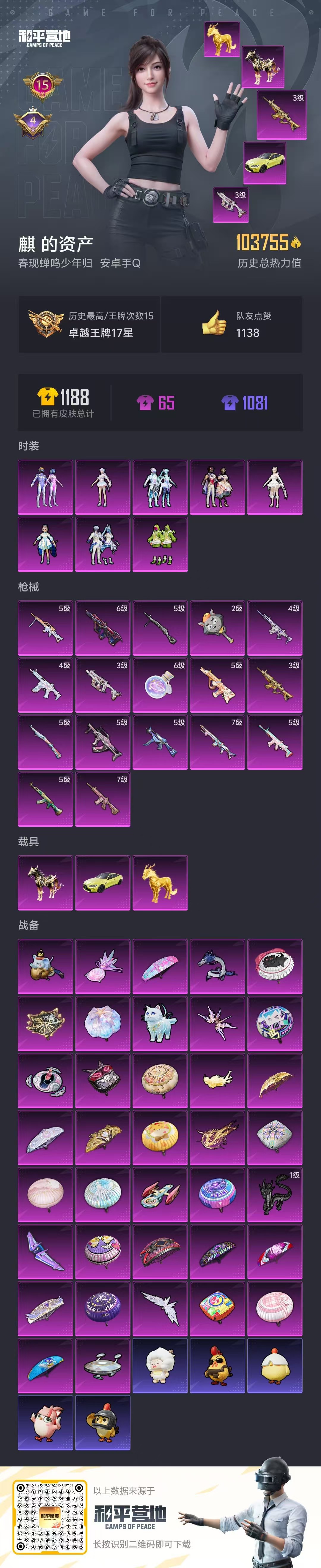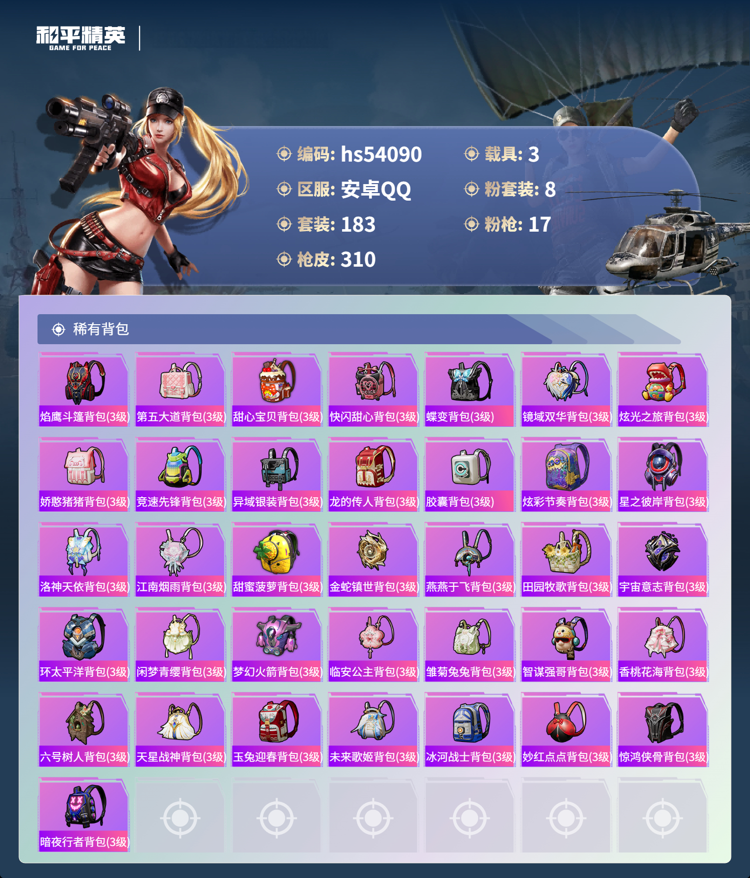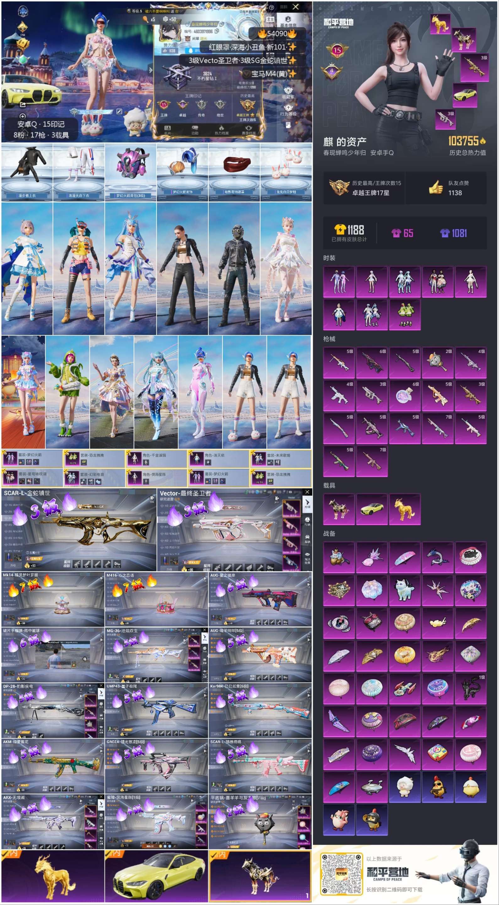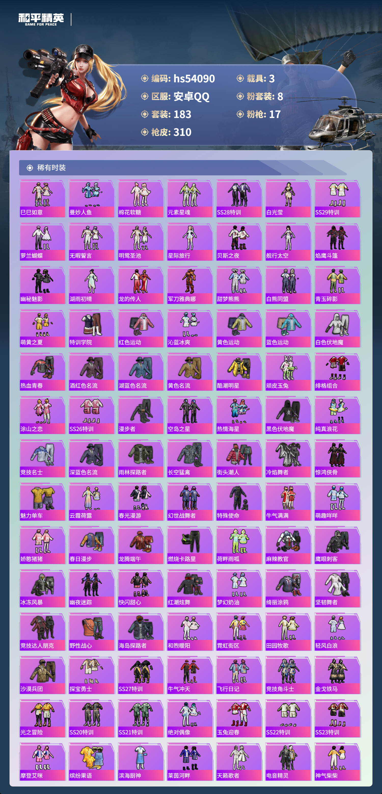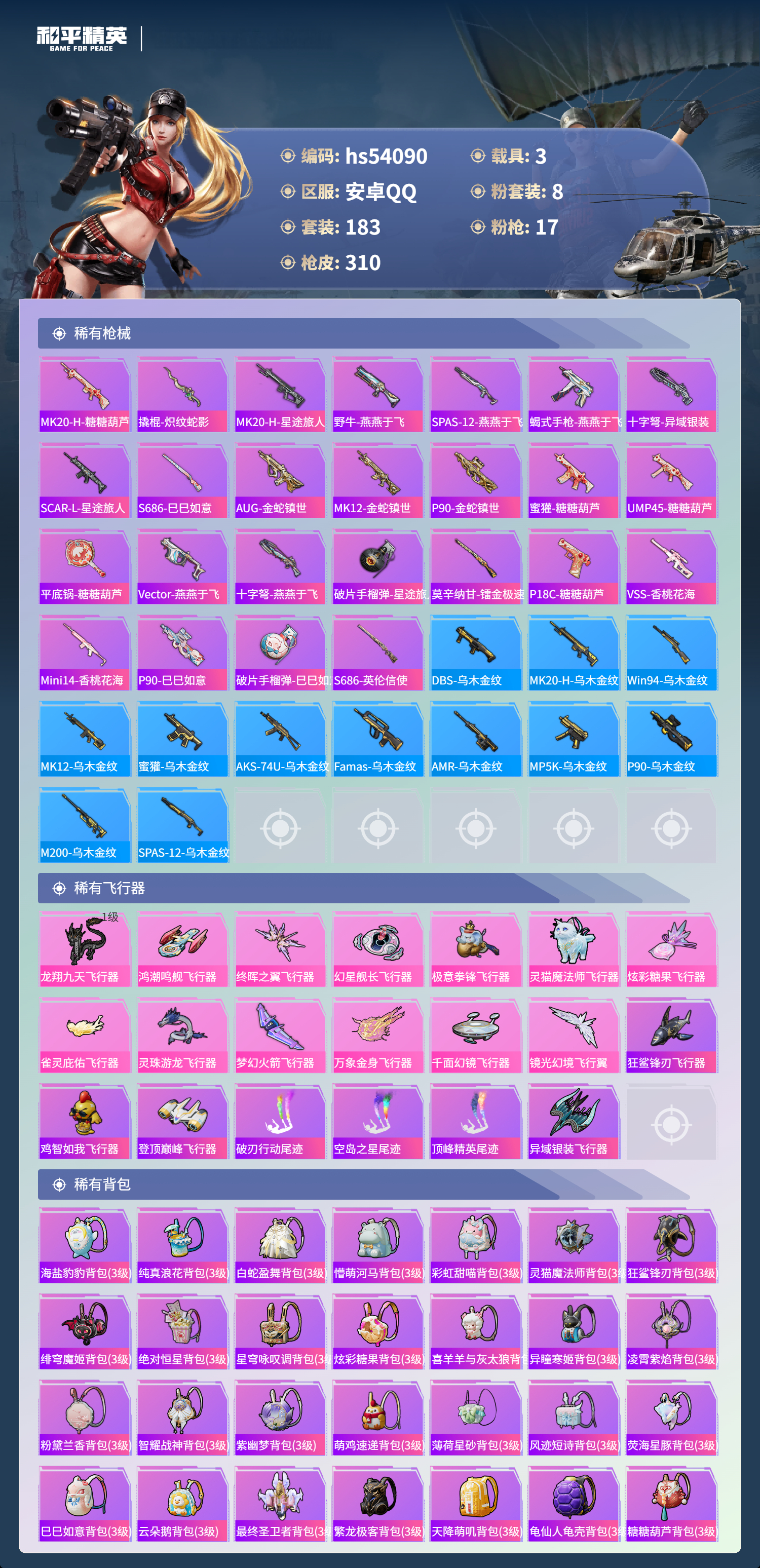 hs54090 安卓手q-15王牌印记-8粉装-17特效呛-3载具-热力值-183套装-310呛皮-4卓越印记【8粉装】角色-千金淑猫套装-梦幻火箭套装-未来歌姬角色-荧海星豚角色-洛天依套装-恐龙拽拽套装-星穹咏叹调套装-幻彩电音【17特效呛】groza-镜光银凌/5级scar-l-锦绣绵绵/5级kar98k-巳巳如意/5级mg-36-沧焰双生/5级aug-