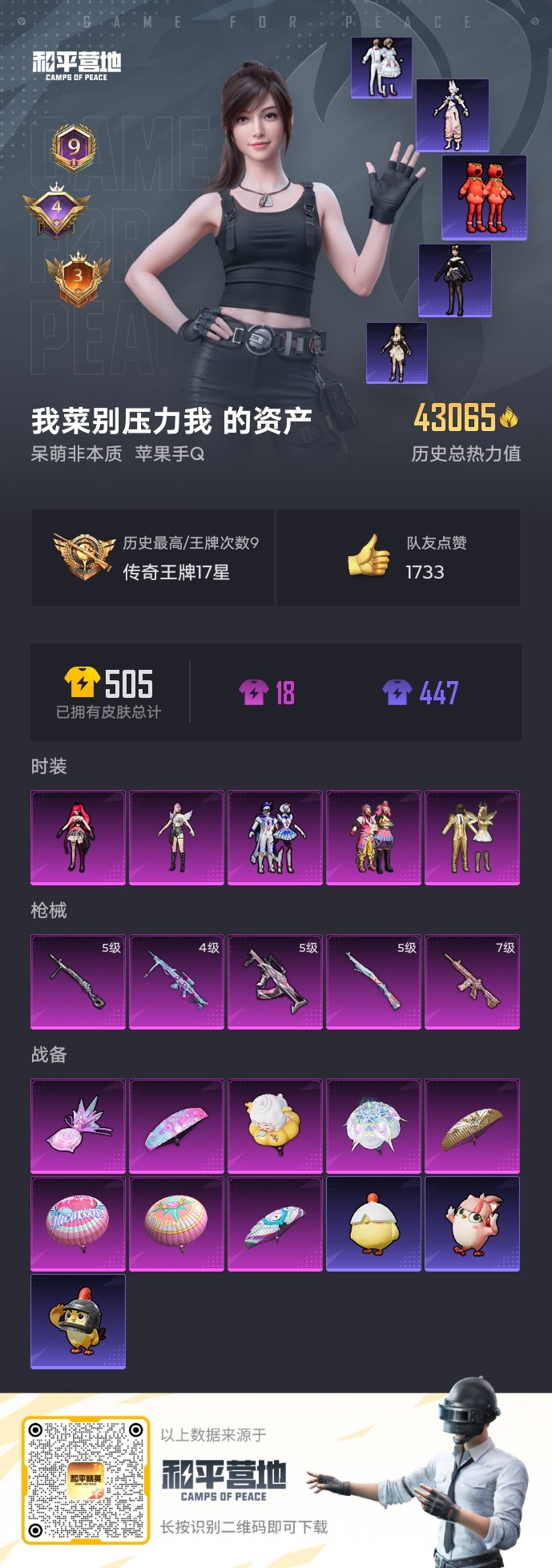 【和平精英】【txhp5075】5粉装,5特效呛,0载具,历史最高段位:传奇王牌17星 王牌印记9次 热力值:43065,111套装,135呛械,148装备,88战备;套装:套装-金属狂野,套装-缤纷油彩,套装-星空之魅,角色-茉莉星,角色-绯穹魔姬,套装-青年教官,套装-黄色运动,套装-黄色伏地魔,套装-白色伏地魔,套装-骑行爱好者,套装-竞技名士,套装-黄色名流,套装-长空猛禽,套装-霸义无双,套装-缤纷假日,套装-浪漫假日,套装-特殊使命,套装-迎春赐吉,套装-燃烧卡路里,套装-幻影武者,套装-蓝彩潮人,套装-千禧之恋,套装-魅力单车,套装-绮丽涂鸦,套装-耀眼新星,套装-野性战魂,套装-超能勇士,套装-森林游猎者,套装-雪山精英,套装-极地朋克,套装-幻世战舞者,套装-蓝调潮人,套装-暗影哥特,套装-呆萌铁蟹,套装-夏日倾情,套装-甜蜜熊情侣,套装-青涩时光,套装-缤纷果语,套装-冰川特警,套装-耀动青春,套装-青涩年华,套装-灿烂千阳,套装-粉红小猪,套装-破蛋小黄鸡,套装-机械征服者,套装-鹤鸣,套装-暗夜契约,套装-纯白誓言,套装-众神之王,套装-智慧之神,套装-ss9特训,套装-顽皮玉兔,套装-elg战队服,套装-蓝甜马卡龙,套装-牛气满满,套装-白糯汤圆,套装-朱雀圣者,套装-原初圣火,套装-逆风勇士,套装-战术大师,套装-ss12特训,套装-牛气冲天,套装-ss18特训,套装-耀粉歌者,套装-ss13特训,套装-吉莉礼服,套装-空投萌叽,套装-ss19特训,套装-炫蓝之夏,套装-ss20特训,套装-ss21特训,套装-红熊茄茄,套装-玉兔迎春,套装-香榭午后,套装-青玉碎影,套装-ss25特训,套装-惊鸿侠骨,套装-锦衣飞扬,套装-龙的传人,套装-ss26特训,套装-云魄琉璃,套装-ss27特训,套装-ss28特训,角色-白光莹,套装-海盐绵绵冰,套装-异域银装,角色-摩登魅猫,角色-俏兔智灵,套装-ss31特训,套装-鱼渊荷华,套装-燕燕于飞,套装-紫幽梦,套装-粉恋花,套装-ss33特训,套装-巳巳如意,套装-ss32特训,套装-蓝冰羽,套装-顶瓜瓜,套装-大橘大利,套装-炫彩糖果,玩偶服-懒羊羊,套装-元气之梦,套装-ss34特训,套装-擎苍青焰,套装-朱霞炽焰,套装-凌霄紫焰,套装-薄荷星砂,套装-ss35特训,套装-粉黛兰香,套装-ss36特训,套装-萌鸡速递;呛皮:7级m416-心之恋语,m416-神秘黑猫,m416-糯团青竹,scar-l-红色方程式,scar-l-炫彩节奏,scar-l-彩虹符号,scar-l-玉兔迎春,scar-l-海盐豹豹,aug-甜蜜菠萝,aug-耀粉歌者,aug-异域银装,aug-金蛇镇世,aug-冰晶雪宝,aug-紫晶流影,akm-灼热熔岩,akm-玉龙,akm-破晓战魂,akm-四圣焕新,akm-涂鸦街区,akm-彩虹符号,akm-龙的传人,akm-霓彩脉冲,akm-绿洲时空,m762-牛气冲天,m762-彩虹符号,m762-天降萌叽,arx-凌霄紫焰,q-原初圣火,q-彩虹符号,q-乌木金纹,5级groza-镜光银凌,groza-马卡龙,famas-霓彩脉冲,famas-乌木金纹,蜜獾-天降萌叽,蜜獾-精灵梦叶罗丽,蜜獾-乌木金纹,m16a4-夜灯,m16a4-机械英豪,ac-val-天降萌叽,win94-机械英豪,win94-乌木金纹,m200-惊鸿侠骨,m200-乌木金纹,amr-鸡智如我,amr-喜羊羊与灰太狼,amr-乌木金纹,m24-众神之王,m24-乌木金纹,5级kar98k-巳巳如意,kar98k-炫彩节奏,awm-乌木金纹,mk14-乌木金纹,mk14-猪猪侠,mk14-紫幽梦,mk14-薄荷星砂,mk14-紫晶流影,slr-众神之王,slr-四圣焕新,slr-霓彩脉冲,m417-惊鸿侠骨,mini14-金鼠迎春,mini14-原初圣火,mini14-炫彩节奏,mk20-h-狂鲨锋刃,vss-乌木金纹,sks-心之恋语,mk12-乌木金纹,mp5k-众神之王,mp5k-乌木金纹,汤姆逊-炫彩节奏,汤姆逊-天降萌叽,汤姆逊-乌木金纹,p90-飞驰魅影,p90-巳巳如意,p90-乌木金纹,vect-生命誓言,vect-燕燕于飞,ump45-蓝色火焰,ump45-生命誓言,ump45-诡娃娃,ump45-海盐豹豹,野牛-机械英豪,野牛-燕燕于飞,野牛-乌木金纹,aks-74u-乌木金纹,js9-凌霄紫焰,uzi-众神之王,uzi-匠心至美oppo,uzi-天降萌叽,uzi-啾咪啾咪,uzi-炫彩糖果,dbs-幻彩电音,dbs-月影灵韵,dbs-乌木金纹,s1897-紫幽梦,s1897-糯团青竹,s12k-夜灯,s12k-机械英豪,s12k-幻世战舞者,s12k-霓彩脉冲,s686-红色方程式,s686-生命誓言,s686-巳巳如意,spas-12-燕燕于飞,spas-12-狂鲨锋刃,pkm-紫幽梦,m249-四圣焕新,m249-彩虹符号,4级mg-36-幻彩电音,mg-36-凌霄紫焰,5级dp-28-豹影疾电,dp-28-原初圣火,mg3-惊鸿侠骨,电击呛-喜羊羊与灰太狼,p92-紫幽梦,p92-凌霄紫焰,信号呛-异瞳寒姬,蝎式手呛-燕燕于飞,p18c-原初圣火,平底锅-众神之王,平底锅-炫紫旋律,平底锅-机械英豪,平底锅-原初圣火,平底锅-惊鸿侠骨,平底锅-紫幽梦,平底锅-无垠阁,平底锅-凌霄紫焰,十子怒-燕燕于飞,十子怒-异域银装,爆炸猎弓-惊鸿侠骨,铝热弹-炫彩糖果,破片手留单-拽到爆炸,破片手留单-巳巳如意,破片手留单-爆破雪人;降落伞:炫彩糖果飞行器,异域银装飞行器,破刃行动尾迹,鸡智如我飞行器,登顶巅峰飞行器; 详情看图【小女号】9印记-4.3w热力值-5粉-5特 猪妹/金属狂野/番茄/俏兔智灵 满级心之恋语