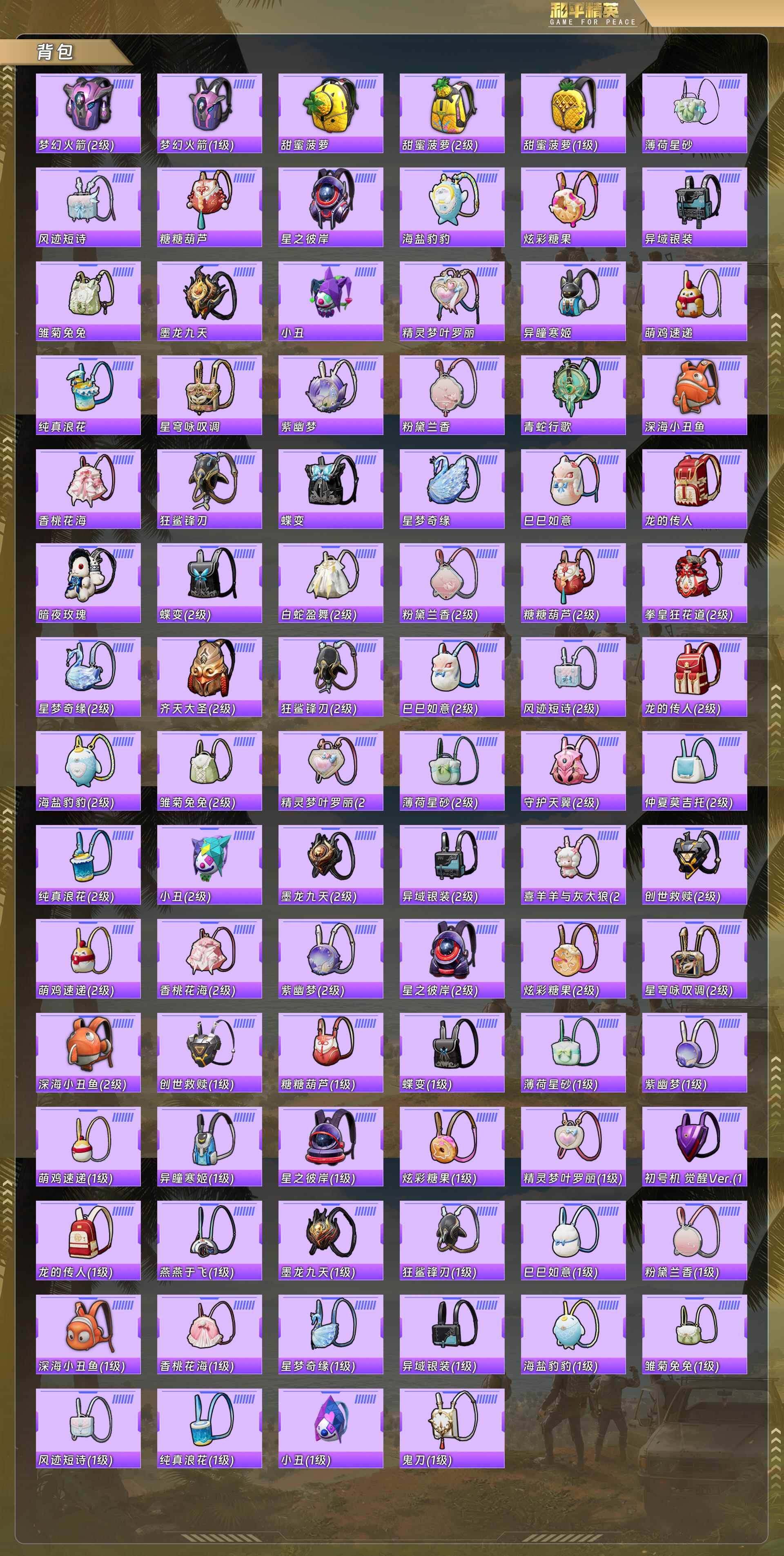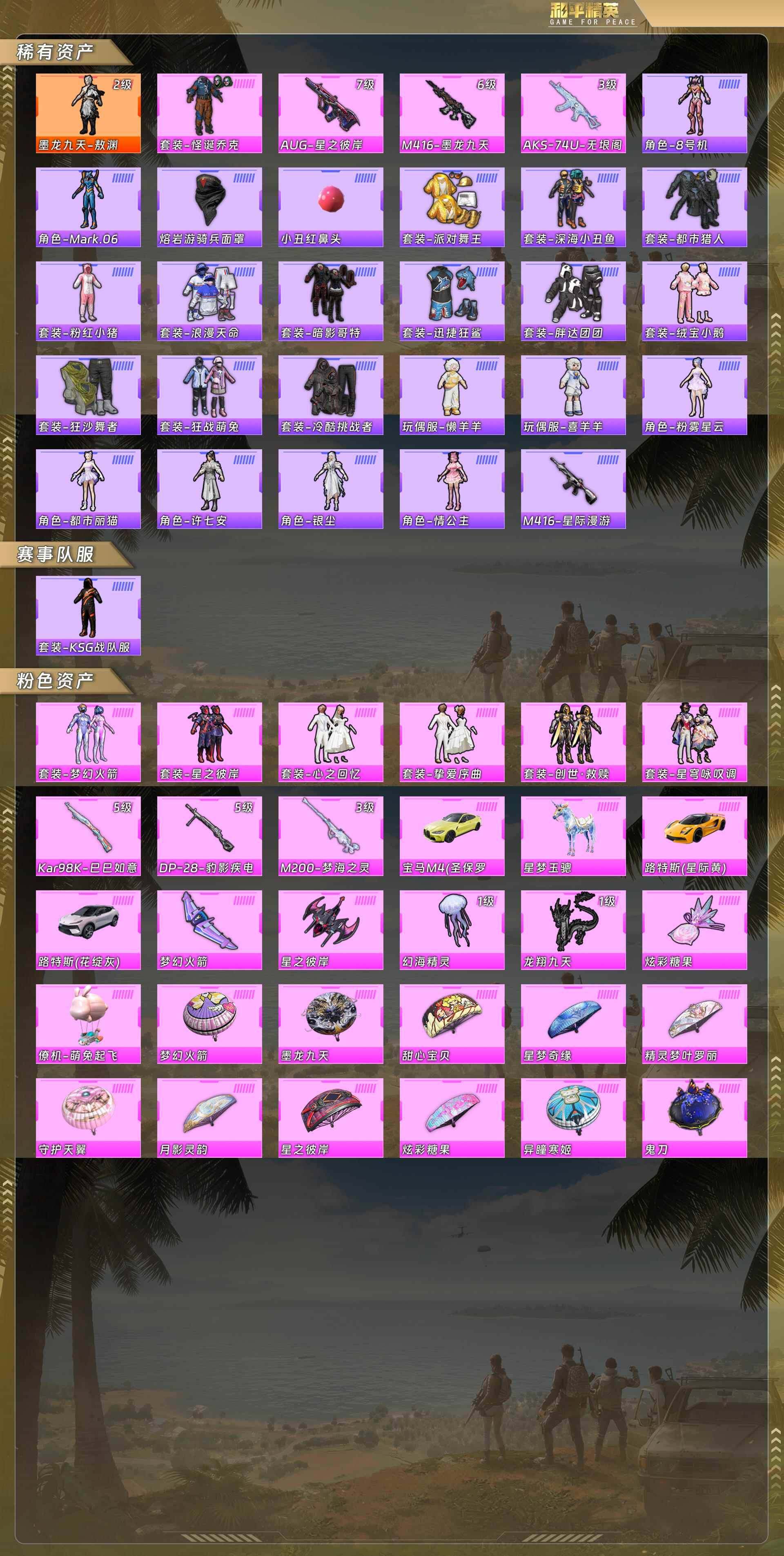 身法号-墨龙九天-敖渊[2级]/怪诞乔克/小丑红鼻头/派对舞王/深海小丑鱼/都市猎人/浪漫天命/暗影哥特/胖达团团/狂沙舞者/粉雾星云/m416-星际漫游/ksg战队服/梦幻火箭/星之彼岸/挚爱序曲/aug-星之彼岸[7级]/m416-墨龙九天[6级]/aks-74u-无垠阁[3级]/m200-梦海之灵[3级]宝马圣保罗黄/星梦玉骢/路特斯星际黄/路特斯花绽灰没战神框 hp4385 【红色角色神装】:墨龙九天-敖渊 【热门品类】:粉装-怪诞乔克,粉装-梦幻火箭,套装-浪漫天命,套装-都市猎人,套装-派对舞王,套装-深海小丑鱼,套装-小丑鱼,套装-胖达团团,套装-暗影哥特,套装-粉红小猪,角色-8号机,角色-mark.06,m416-星际漫游,熔岩游骑兵连帽夹克 【粉色载具】:路特斯evija(星际黄),路特斯eletre(花绽灰),宝马m4(圣保罗黄),僚机-萌兔起飞,星梦玉骢 【粉色套装】:粉装-怪诞乔克,粉装-梦幻火箭,粉装-星之彼岸,粉装-心之回忆,粉装-挚爱序曲,套装-创世·救赎,粉装-星穹咏叹调 【粉色呛皮等级】:m416-墨龙九天六级,aug-星之彼岸七级,aks-74u-无垠阁三级,kar98k-巳巳如意五级,m200-梦海之灵三级,dp-28-豹影疾电五级 【粉色呛皮】:m416-墨龙九天,aug-星之彼岸,aks-74u-无垠阁,kar98k-巳巳如意,m200-梦海之灵,dp-28-豹影疾电 【粉色飞行器】:梦幻火箭飞行器,星之彼岸飞行器,龙翔九天飞行器,幻海精灵飞行器 【粉色降落伞】:甜心宝贝降落伞,梦幻火箭降落伞,星之彼岸降落伞,精灵梦叶罗丽降落伞,墨龙九天降落伞,星梦奇缘降落伞,守护天翼降落伞,月影灵韵降落伞,鬼刀降落伞,异瞳寒姬降落伞 【稀有套装】:套装-绒宝小鹅,套装-巳巳如意,套装-雏菊兔兔,套装-萝兰蝴蝶,套装-小熊娃娃,套装-糖糖葫芦,套装-青团波波,套装-棉花软糖,角色-都市丽猫,角色-许七安,套装-燕燕于飞,套装-鱼渊荷华,套装-粉恋花,套装-紫幽梦,套装-蓝冰羽,角色-瑰梦爱神,玩偶服-懒羊羊,玩偶服-喜羊羊,角色-紫俏灵猫,套装-炫彩糖果 【稀有呛皮】:aug-冰晶雪宝,akm-影袭,akm-星之彼岸,akm-缤纷海域,akm-龙的传人,m16a4-幻世战舞者,m16a4-星际漫游,scar-l-炫彩节奏,m416-星际漫游,groza-影袭,groza-银河战甲,aug-天降萌叽,aug-甜蜜菠萝,q-彩虹符号,m762-天降萌叽,m762-彩虹符号,m762-萌物绒绒,g36c-星际漫游,g36c-星穹咏叹调,蜜獾-天降萌叽,famas-墨龙九天,uzi-天降萌叽,uzi-炫彩节奏,uzi-月影灵韵,ump45-星际漫游,ump45-生命誓言,vect-生命誓言,vect-银河战甲,vect-创世·救赎,汤姆逊-天降萌叽,kar98k-星穹咏叹调,m24-影袭,vss-星之彼岸,mini14-星际漫游,mini14-春暖花开,mini14-炫彩节奏,slr-墨龙九天,amr-墨龙九天,mk20-h-樱桃泡泡,s686-未来战士,s1897-春暖花开,s12k-玩趣呆呆,dbs-荧海星豚,m249-彩虹符号,m249-星之彼岸,dp-28-彩虹符号,mg3-幻世战舞者,短管霰弹-星穹咏叹调,燃烧瓶-甜梦桃焰 【其他套装】:套装-ss22特训,套装-ss25特训,套装-ss28特训,套装-ss29特训,套装-吉莉礼服,套装-夏日倾情,套装-幻影武者,套装-旭日情侣,套装-春日漫步,套装-暗影哥特,套装-格斗先锋,套装-森林游猎者,套装-浪漫天命,套装-海岛探路者,套装-滨海假日,套装-特战装甲,套装-特训学院,套装-狂战萌兔,套装-狂沙舞者,套装-猛禽,套装-王牌教练,套装-白色伏地魔,套装-破蛋小黄鸡,套装-福星高照,套装-竞技名士,套装-粉红小猪,套装-红色运动,套装-绮丽涂鸦,套装-绯格组合,套装-缤纷果语,套装-耀粉歌者,套装-蓝色运动,套装-街头潮人,套装-超能勇士,套装-长空猛禽,套装-雪鹰学院,套装-青年教官,套装-青涩时光,套装-魅力单车,套装-鹤鸣,套装-黄色名流,套装-黄色运动,套装-黑色伏地魔,套装-龙的传人,套装-鹰眼刺客,套装-冰冻风暴,套装-漫步者,套装-水银刺客,套装-冷酷挑战者,套装-深海小丑鱼,套装-呆萌铁蟹,套装-迅捷狂鲨,套装-弄潮海豚,套装-快乐星愿,套装-星梦畅游,角色-情公主,角色-银尘,套装-纯真浪花,套装-热情海星,套装-曼妙人鱼,套装-创世·追猎,角色-粉雾星云,角色-极地流光,角色-8号机,角色-mark.06 【稀有头盔】:银河战甲头盔3级,银河战甲头盔1级,梦幻火箭头盔2级,梦幻火箭头盔1级,深海小丑鱼头盔3级,深海小丑鱼头盔1级 【稀有背包】:梦幻火箭背包2级,梦幻火箭背包1级,深海小丑鱼背包3级,深海小丑鱼背包2级,深海小丑鱼背包1级 【营地id】:964939691