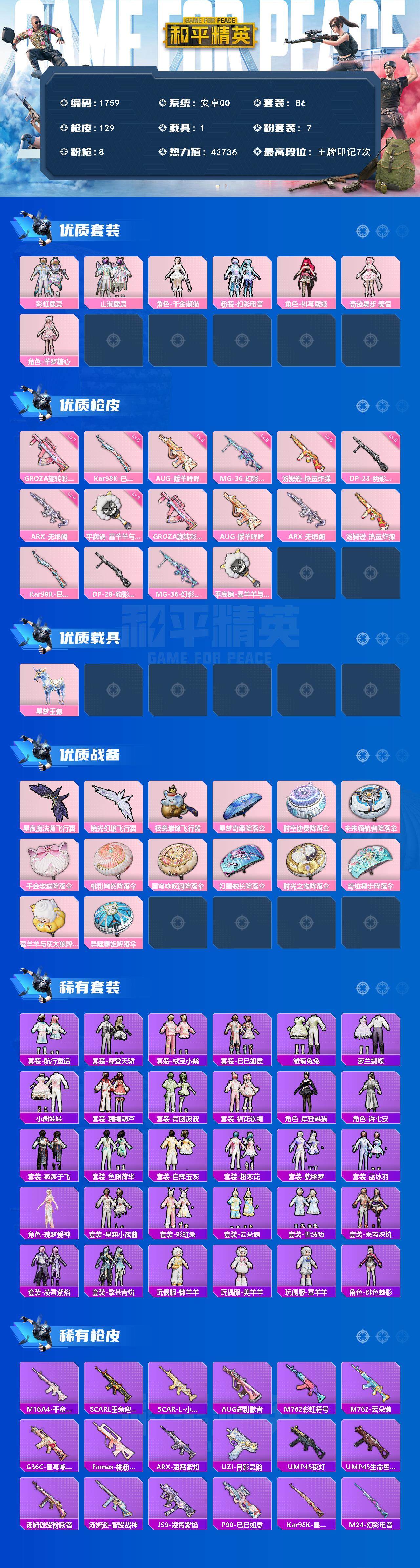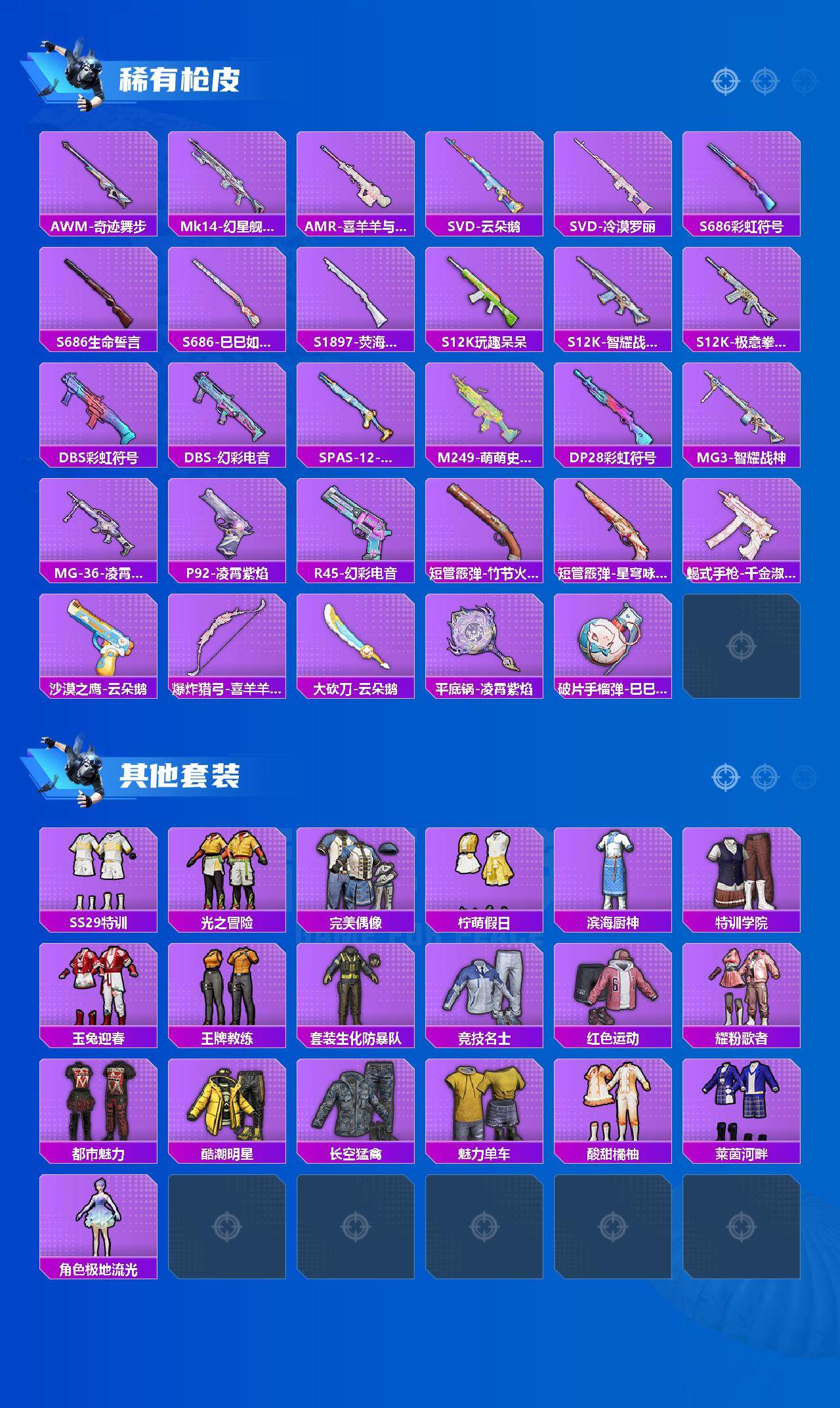 1载具-86套装-129呛皮-86套装/呛械8/装备200/载具1/战备130/王牌印记7/热力值43736/七级groza-旋转彩虹/五级aug-暖羊咩咩/四级arx-无垠阁/五级汤姆逊-热量炸弹/五级kar98k-巳巳如意/五级dp-28-豹影疾电/五级mg-36-幻彩电音/三级平底锅-喜羊羊与灰太狼/彩虹鹿灵/山涧鹿灵/千金淑猫/粉装-幻彩电音/角色-绯穹魔姬/角色-奇迹舞步 美雪/角色-羊梦糖心/星梦玉骢/groz