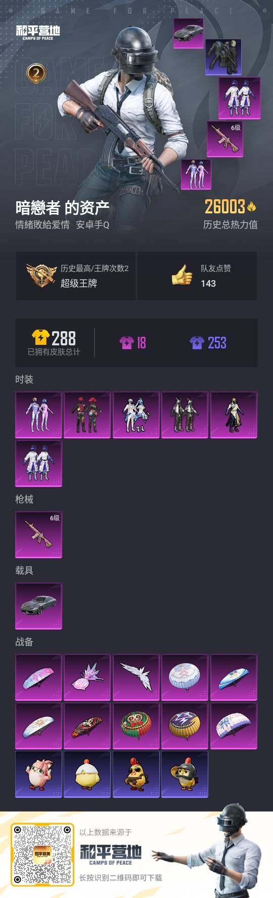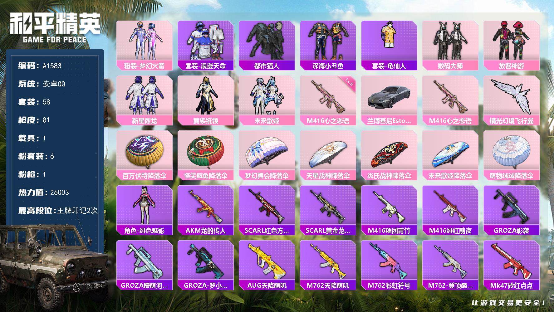 [14826265]安卓 【男神号 梦幻火箭 浪漫天命 新星烈龙 m416-心之恋语六级 兰博基尼estoque(银翼灰)】手q-6粉装-1特效呛-1载具-2粉色飞行器-26003热力值-2王牌印记-58套装-81呛皮 【热门品类】:粉装-梦幻火箭,套装-浪漫天命,套装-都市猎人,套装-深海小丑鱼,套装-龟仙人 【粉色套装】:粉装-数码大师,粉装-梦幻火箭,粉装-放客神游,粉装-新星烈龙,粉装-黄族统领,粉装-未来歌姬 【粉色呛皮等级】:m416-心之恋语六级 【粉色载具】:兰博基尼estoque(银翼灰) 【粉色呛皮】:m416-心之恋语 【粉色飞行器】:镜光幻境飞行翼 【粉色降落伞】:百万伏特降落伞,怪笑疯兔降落伞,梦幻舞会降落伞,天星战神降落伞,炎氏战神降落伞,未来歌姬降落伞,萌物绒绒降落伞 【稀有套装】:套装-龟仙人,角色-绯色魅影,套装-炫彩糖果 【稀有呛皮】:aug-冰晶雪宝,akm-龙的传人,scar-l-红色方程式,scar-l-黄金龙骨,m416-糯团青竹,m416-绯红前夜,groza-影袭,groza-懵萌河马,groza-罗小黑,aug-天降萌叽,m762-天降萌叽,m762-彩虹符号,m762-登顶巅峰,mk47-妙红点点,mk47-摩登王国,mk47-百万伏特,g36c-懵萌河马,蜜獾-天降萌叽,uzi-影袭,ump45-生命誓言,ump45-极意拳锋,vect-彩虹符号,vect-生命誓言,汤姆逊-天降萌叽,汤姆逊-奇异狩猎者,kar98k-2b战斗服款,kar98k-梦幻火箭,m24-影袭,m24-拂晓神骑,m24-仲夏莫吉托,m24-奇异狩猎者,awm-音爆索尼克,sks-迅猛狂鲨,vss-彩虹符号,vss-绿野极光,mini14-梦幻火箭,mini14-炫彩节奏,mini14-穿刺龙虾,win94-萝萝小趴兔,莫辛纳甘-懵萌河马,amr-妙红点点,m417-惊鸿侠骨,m200-仲夏莫吉托,m200-惊鸿侠骨,s686-奇异狩猎者,s1897-百万伏特,s12k-玩趣呆呆,s12k-童趣迷兔,dbs-黑白懵懵牛,m249-四圣焕新,m249-妙红点点,m249-百万伏特,mg3-妙红点点,mg3-幻世战舞者,mg3-惊鸿侠骨,mg3-第五大道,mg3-萝萝小趴兔,pkm-懵萌河马,p18c-百万伏特,tmp-9-江南烟雨,爆炸猎弓-惊