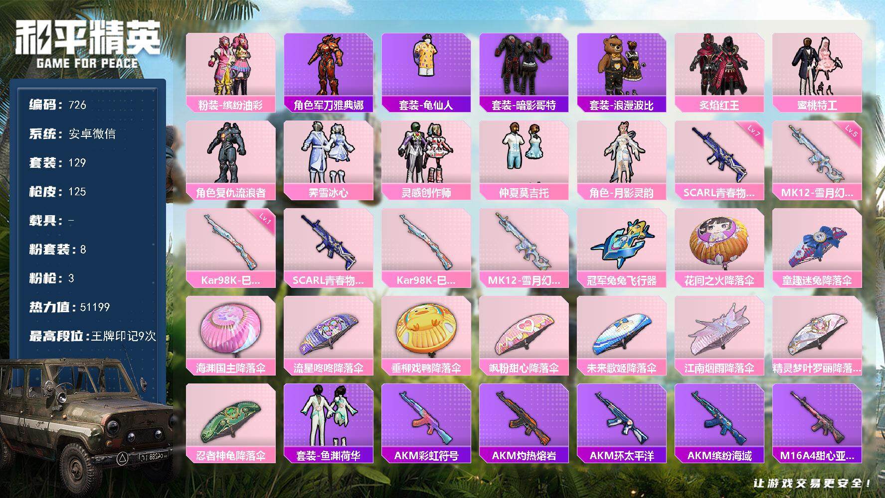 [14830197]安卓 微信-8粉装-3特效呛-0载具-1粉色飞行器-51199热力值-9王牌印记-129套装-125呛皮 【热门品类】:粉装-缤纷油彩,角色-军刀雅典娜,套装-龟仙人,套装-暗影哥特,套装-浪漫波比 【粉色套装】:粉装-缤纷油彩,粉装-炙焰红王,粉装-蜜桃特工,角色-复仇流浪者,粉装-霁雪冰心,粉装-灵感创作师,粉装-仲夏莫吉托,角色-月影灵韵 【粉色呛皮等级】:scar-l-青春物语七级,kar98k-巳巳如意一级,mk12-雪月幻音五级 【粉色呛皮】:scar-l-青春物语,kar98k-巳巳如意,mk12-雪月幻音 【粉色飞行器】:冠军兔兔飞行器 【粉色降落伞】:花间之火降落伞,童趣迷兔降落伞,海渊国主降落伞,流星咚咚降落伞,垂柳戏鸭降落伞,飒粉甜心降落伞,未来歌姬降落伞,江南烟雨降落伞,精灵梦叶罗丽降落伞,忍者神龟降落伞 【稀有套装】:套装-龟仙人,套装-鱼渊荷华 【稀有呛皮】:akm-彩虹符号,akm-灼热熔岩,akm-环太平洋,akm-缤纷海域,m16a4-甜心亚梦,scar-l-玉兔迎春,scar-l-碧影闪光,m416-糯团青竹,groza-异彩先驱,groza-懵萌河马,groza-田园牧歌,groza-蓝莓炮弹,aug-天降萌叽,aug-灵符少年,q-飞驰魅影,m762-天降萌叽,m762-暗夜鎏金,m762-瑞龙福将,m762-绒雪飘舞,mk47-妙红点点,g36c-懵萌河马,ac-val-天降萌叽,ac-val-甜心亚梦,蜜獾-垂柳戏鸭,蜜獾-娇憨猪猪,uzi-天降萌叽,uzi-娇憨猪猪,uzi-影袭,ump45-灵符少年,ump45-生命誓言,vect-田园牧歌,汤姆逊-异彩先驱,汤姆逊-炫彩节奏,mp5k-异彩先驱,mp5k-蓝莓炮弹,p90-飞驰魅影,p90-巳巳如意,kar98k-影袭,kar98k-灵符少年,kar98k-炫彩节奏,kar98k-王子的夏天,kar98k-飞驰魅影,m24-炫彩节奏,awm-垂柳戏鸭,sks-未来歌姬,sks-迅猛狂鲨,vss-彩虹符号,vss-田园牧歌,mini14-异彩先驱,mk14-童趣迷兔,win94-瑞龙福将,slr-娇憨猪猪,slr-彩虹符号,莫辛纳甘-懵萌河马,amr-妙红点点,s686-生命誓言,s1897-暗夜鎏金,s1897-炫彩节奏,s1897-飞驰魅影,s