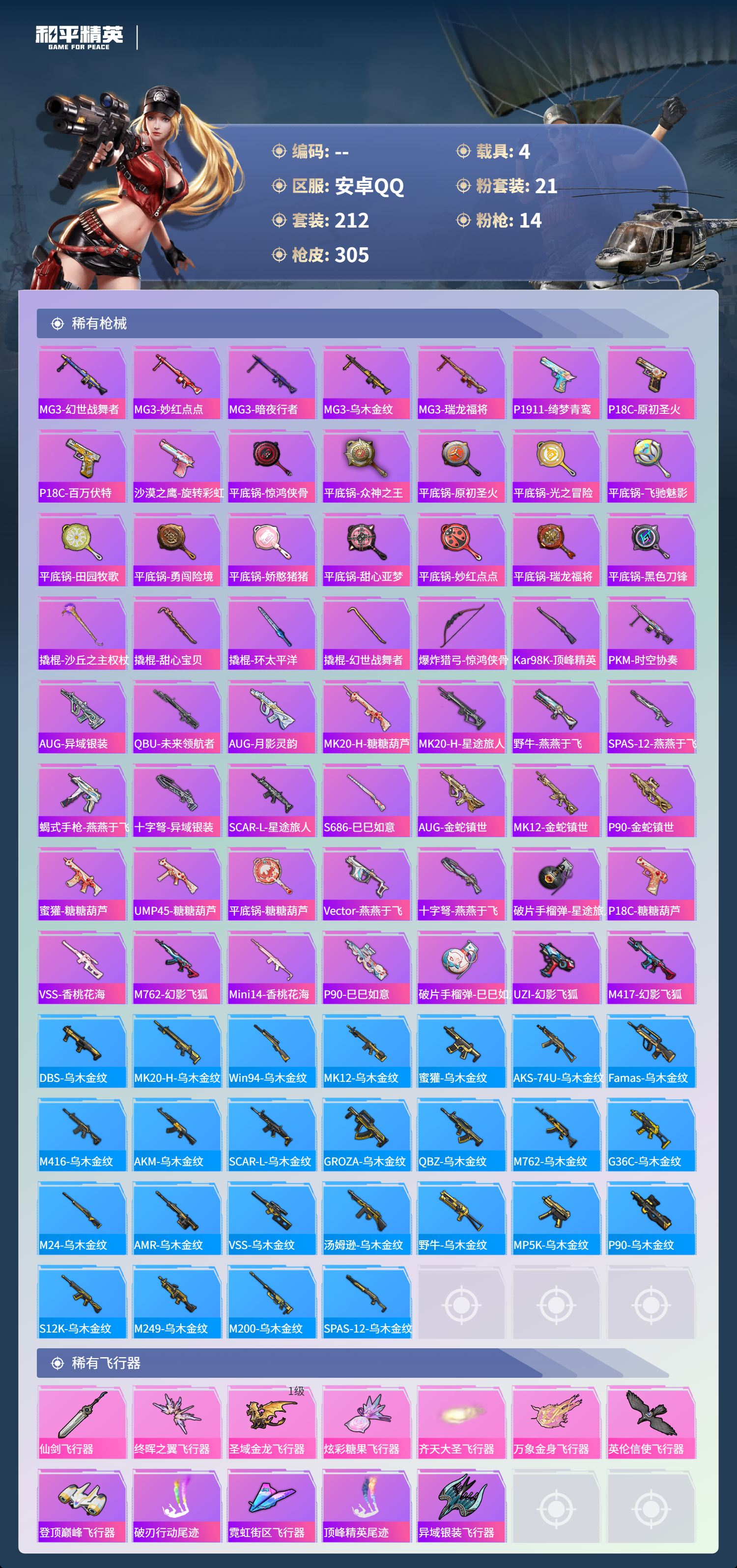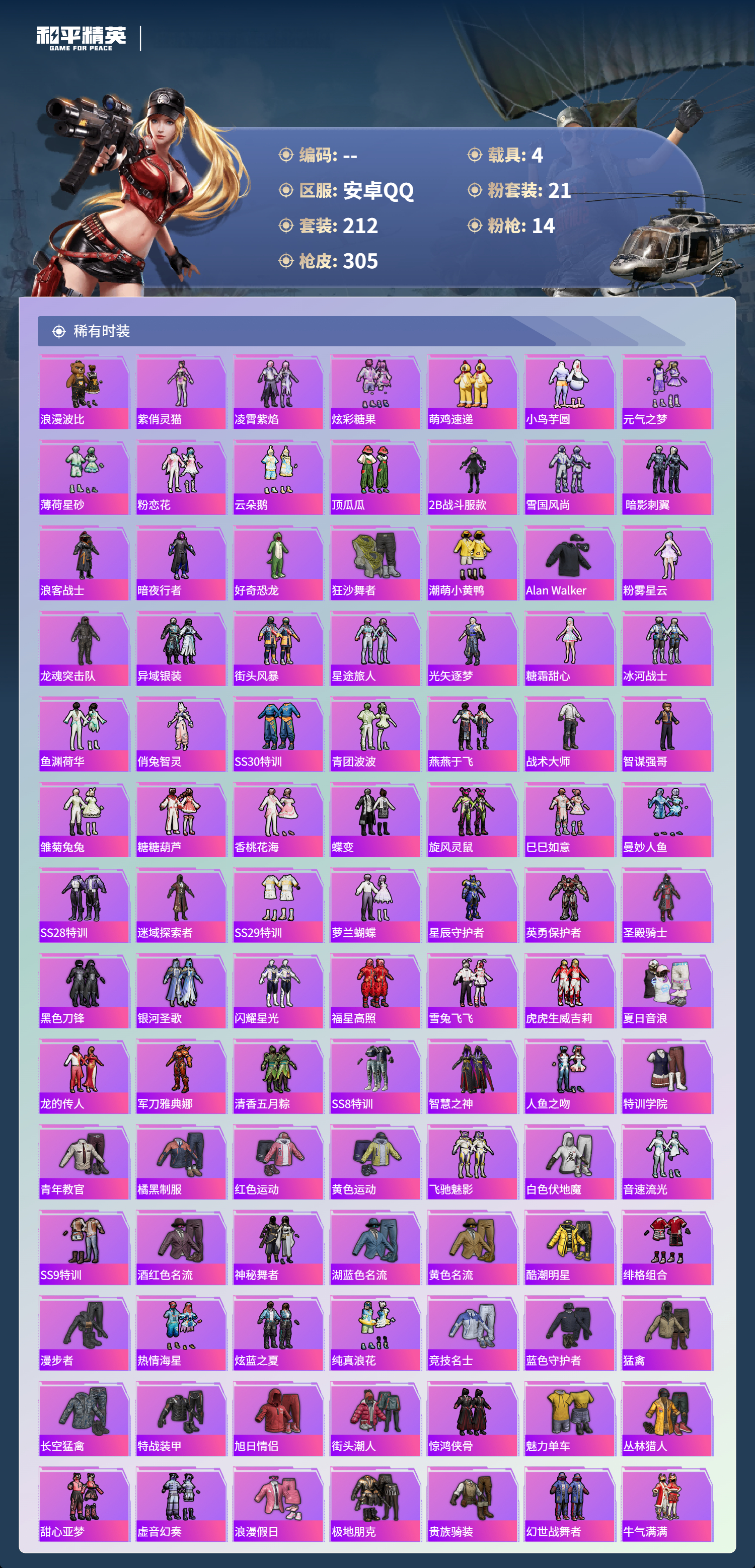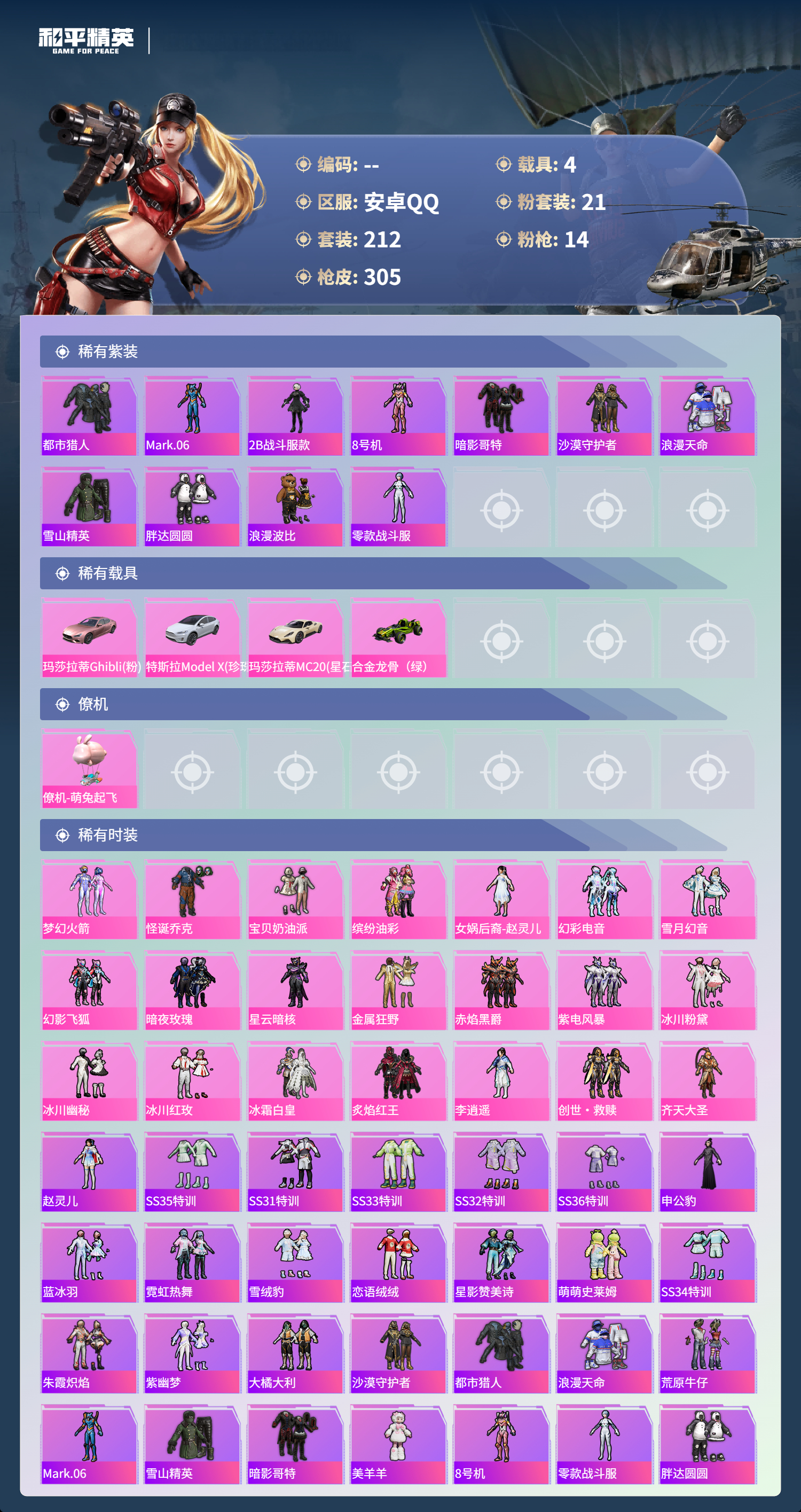 4载具-212套装-305呛皮-安卓手q-小丑-赵灵儿-黑丝-新101-蓝口罩-浪客战士-李-猪脸-僚机-红眼罩-13王牌印记-21粉装-14特效呛-4载具-热力值-212套装-305呛皮-3卓越印记