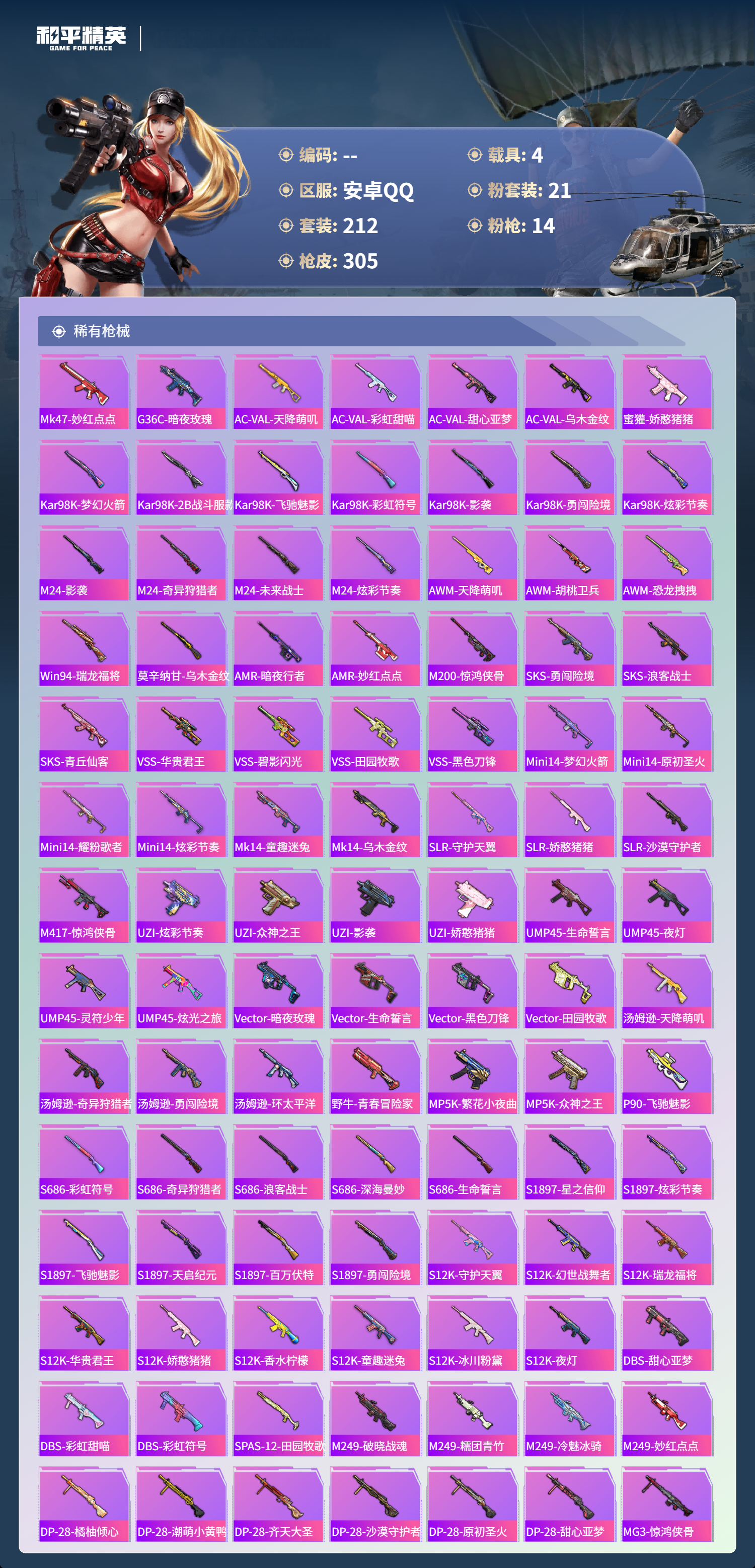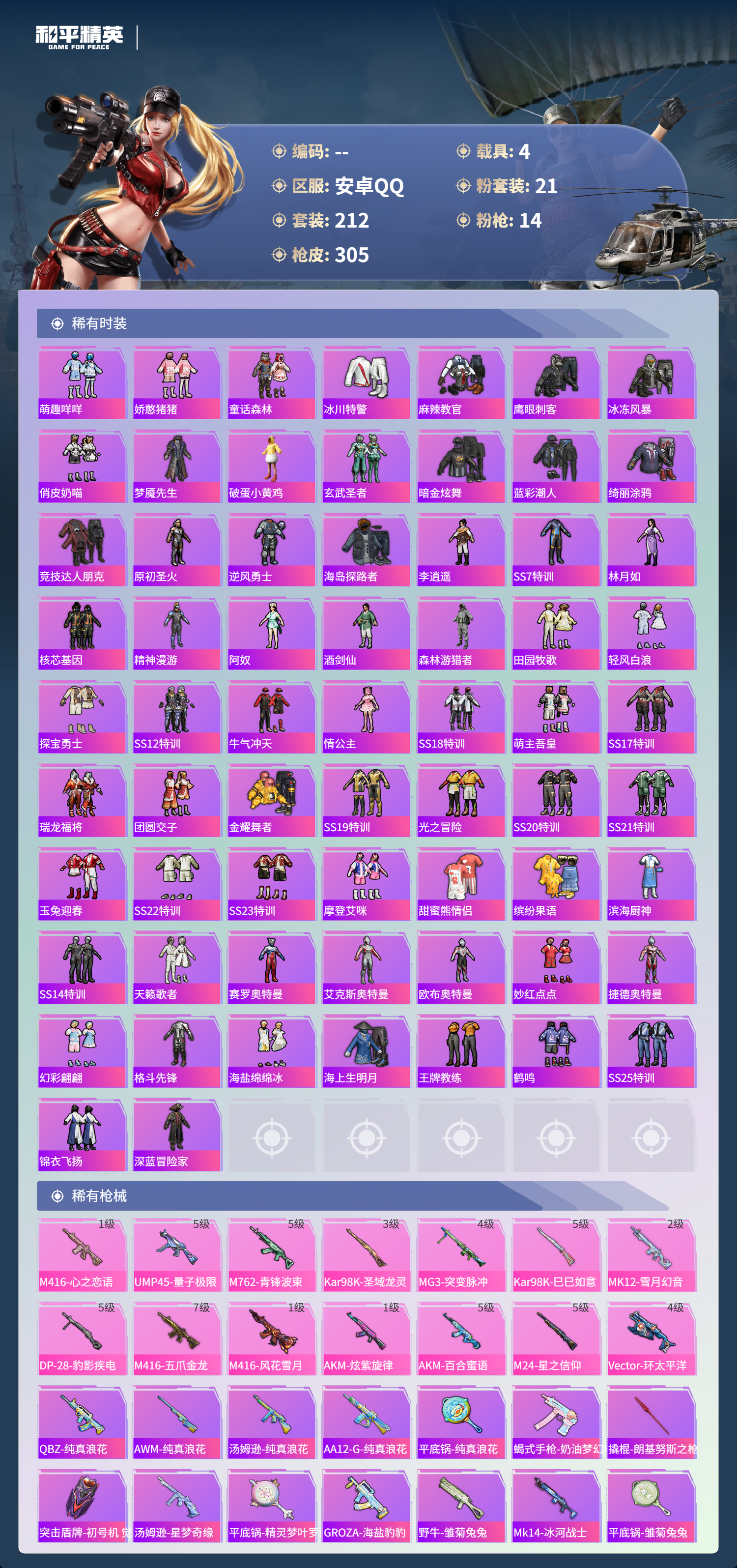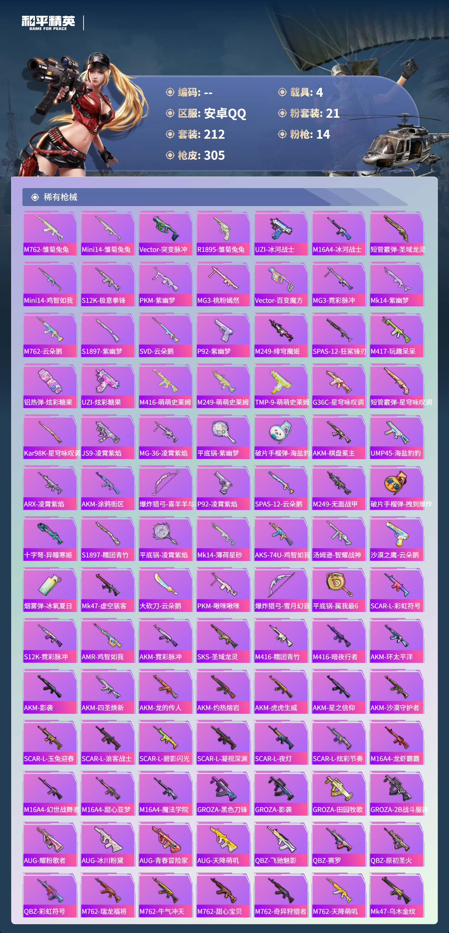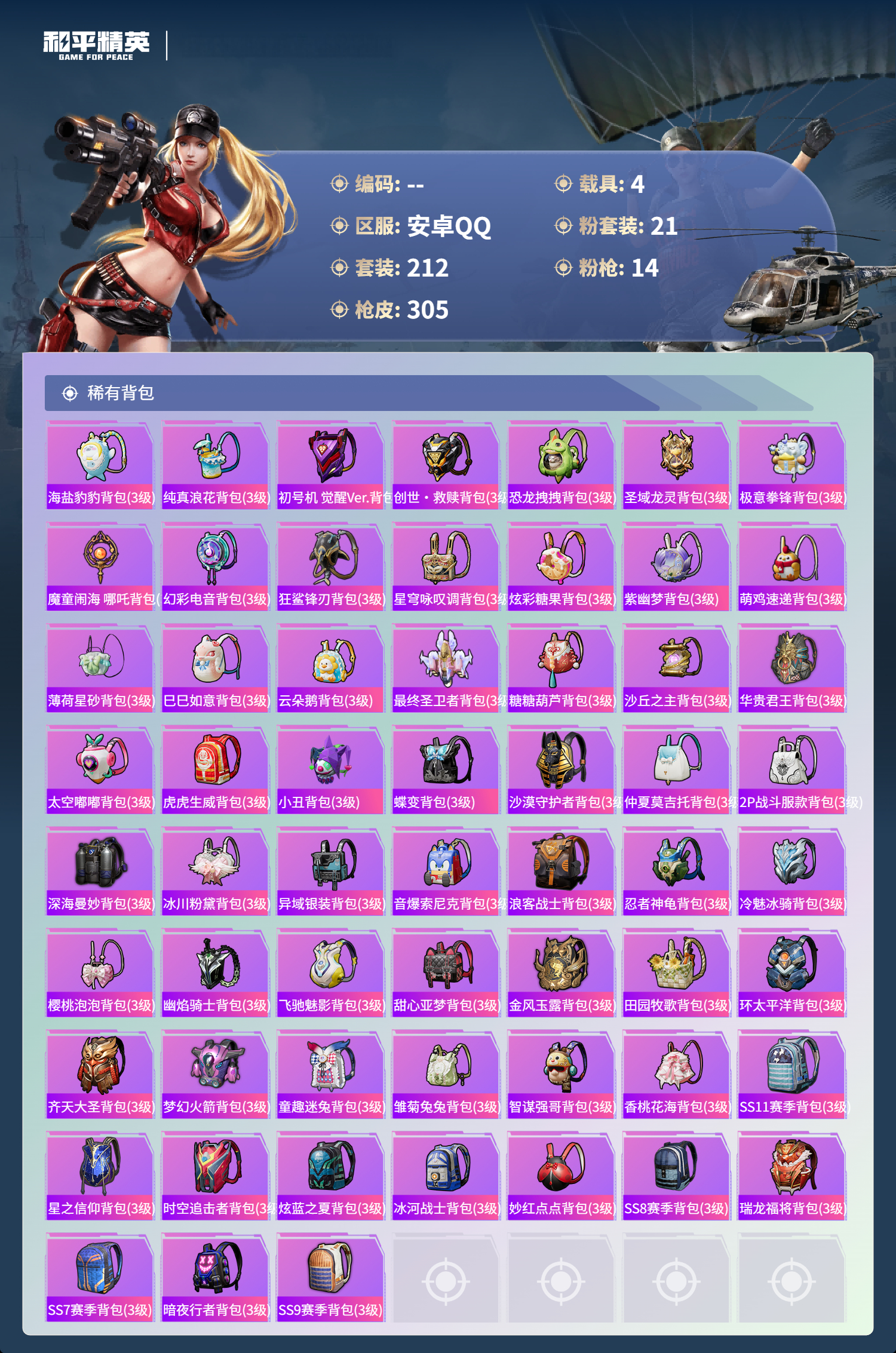 4载具-212套装-305呛皮-安卓手q-小丑-赵灵儿-黑丝-新101-蓝口罩-浪客战士-李-猪脸-僚机-红眼罩-13王牌印记-21粉装-14特效呛-4载具-热力值-212套装-305呛皮-3卓越印记