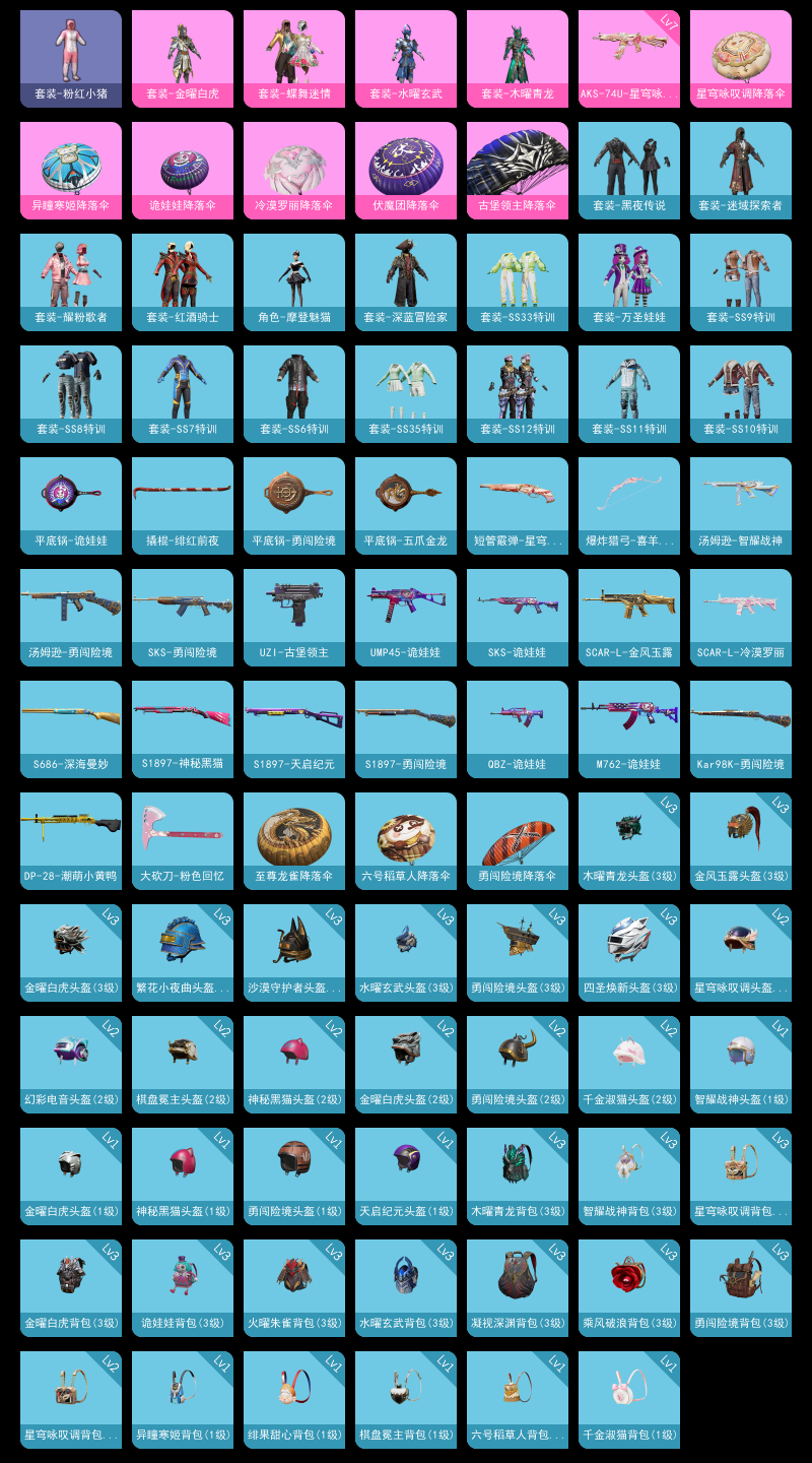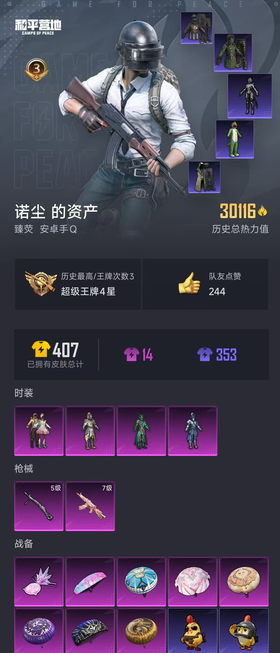 【和平精英】【lyhp18405】3w热力值4粉装2特效呛 蝶舞迷情 金曜白虎 满级aks-74u 4粉装,2特效呛,0载具,历史最高段位:超级王牌4星 王牌印记3次 热力值:30116,96套装,104呛械,129装备,58战备;套装:套装-金曜白虎,套装-木曜青龙,套装-水曜玄武,套装-蝶舞迷情,套装-特训学院,套装-红色运动,套装-黄色运动,套装-蓝色运动,套装-白色伏地魔,套装-骑行爱好者,套装-深海格斗者,套装-深蓝色名流,套装-猛禽,套装-竞技勇士朋克,套装-黎明保卫者,套装-沙漠探路者,套装-旭日情侣,套装-六六大吉,套装-冷焰舞者,套装-青羽突袭者,套装-刚毅裁决者,套装-特战装甲,套装-浪漫假日,套装-突袭者,套装-青春校园,套装-甜蜜告白,套装-迎春赐吉,套装-龙腾端午,套装-燃烧卡路里,套装-完美偶像,套装-暗金炫舞,套装-怒火燎原,套装-雪山征服者,套装-坚韧舞者,套装-野性战魂,套装-幻世保卫者,套装-风行保卫者,套装-沙漠兵团,套装-丛林猎人,套装-雪山精英,套装-传奇侦探,套装-甜蜜熊情侣,套装-格斗先锋,套装-ss4特训,套装-梦魇先生,套装-万圣娃娃,套装-黑夜传说,套装-粉红小猪,套装-破蛋小黄鸡,套装-疯狂小兔子,套装-深蓝冒险家,套装-迷域探索者,套装-ss5特训,套装-圣诞大吉,套装-熔岩使者,套装-凛冬战士,套装-好奇恐龙,套装-红酒骑士,套装-金鼠迎春,套装-北国孤狼,套装-ss6特训,套装-跃动心情,套装-ss7特训,套装-鹤鸣,套装-霓虹街区,套装-ss10特训,套装-ss8特训,套装-白熊同盟,套装-夏日音浪,套装-ss9特训,套装-探宝勇士,套装-牛气满满,套装-ss11特训,套装-ss12特训,套装-牛气冲天,套装-耀粉歌者,套装-飞行日记,套装-玉兔迎春,套装-王牌教练,套装-柠萌假日,套装-漫游都市,套装-云魄琉璃,角色-无面战甲,角色-摩登魅猫,套装-ss33特训,套装-ss32特训,套装-顶瓜瓜,套装-大橘大利,套装-炫彩糖果,套装-元气之梦,套装-ss34特训,套装-游乐,套装-薄荷星砂,套装-ss35特训,套装-粉黛兰香,套装-萌鸡速递;呛皮:m416-夜灯,m416-红色方程式,m416-乌木金纹,q-诡娃娃,q-乌木金纹,m762-诡娃娃,m762-牛气冲天,m762-乌木金纹,蜜獾-乌木金纹,groza-生命誓言,groza-无面战甲,groza-乌木金纹,aug-异域银装,aug-紫晶流影,aug-乌木金纹,akm-灼热熔岩,akm-玉龙,akm-霓虹街区,akm-涂鸦街区,akm-霓彩脉冲,akm-乌木金纹,scar-l-金风玉露,scar-l-冷漠罗丽,scar-l-乌木金纹,famas-霓彩脉冲,famas-乌木金纹,m16a4-夜灯,m16a4-乌木金纹,kar98k-红色方程式,kar98k-勇闯险境,win94-乌木金纹,m24-冰封烈焰,sks-诡娃娃,sks-夜灯,sks-勇闯险境,mini14-金鼠迎春,mini14-炫彩节奏,mini14-乌木金纹,vss-彩虹符号,vss-乌木金纹,slr-霓彩脉冲,mk14-薄荷星砂,mk20-h-狂鲨锋刃,uzi-红色方程式,uzi-古堡领主,uzi-逆行者qq,uzi-匠心至美oppo,uzi-活力四射vivo,uzi-聚米为谷小米,uzi-极光之刃应用宝,uzi-天降萌叽,uzi-炫彩糖果,uzi-乌木金纹,vect-生命誓言,vect-乌木金纹,ump45-夜灯,ump45-蓝色火焰,ump45-生命誓言,ump45-诡娃娃,ump45-海盐豹豹,汤姆逊-勇闯险境,汤姆逊-智耀战神,汤姆逊-乌木金纹,7级aks-74u-星穹咏叹调,aks-74u-鸡智如我,aks-74u-乌木金纹,s12k-破晓战魂,s12k-夜灯,s12k-幻世战舞者,s12k-霓彩脉冲,s12k-乌木金纹,s1897-天启纪元,s1897-勇闯险境,s1897-神秘黑猫,s1897-糯团青竹,s686-生命誓言,s686-冰封烈焰,s686-深海曼妙,s686-乌木金纹,dbs-彩虹符号,5级dp-28-豹影疾电,dp-28-潮萌小黄鸭,dp-28-乌木金纹,m249-破晓战魂,m249-彩虹符号,m249-无面战甲,mg3-幻世战舞者,p1911-冰封烈焰,p1911-无面战甲,短管霰弹-星穹咏叹调,大砍刀-粉色回忆,平底锅-诡娃娃,平底锅-冰封烈焰,平底锅-五爪金龙,平底锅-勇闯险境,平底锅-缤纷糖果,平底锅-属我最6,撬棍-绯红前夜,撬棍-传奇侦探,破片手留单-海盐豹豹,破片手留单-拽到爆炸,爆炸猎弓-喜羊羊与灰太狼,铝热弹-炫彩糖果,盐雾蛋-冰氧夏日;降落伞:炫彩糖果飞行器,紫色滑翔尾迹,破刃行动尾迹,鸡智如我飞行器; 详情看图