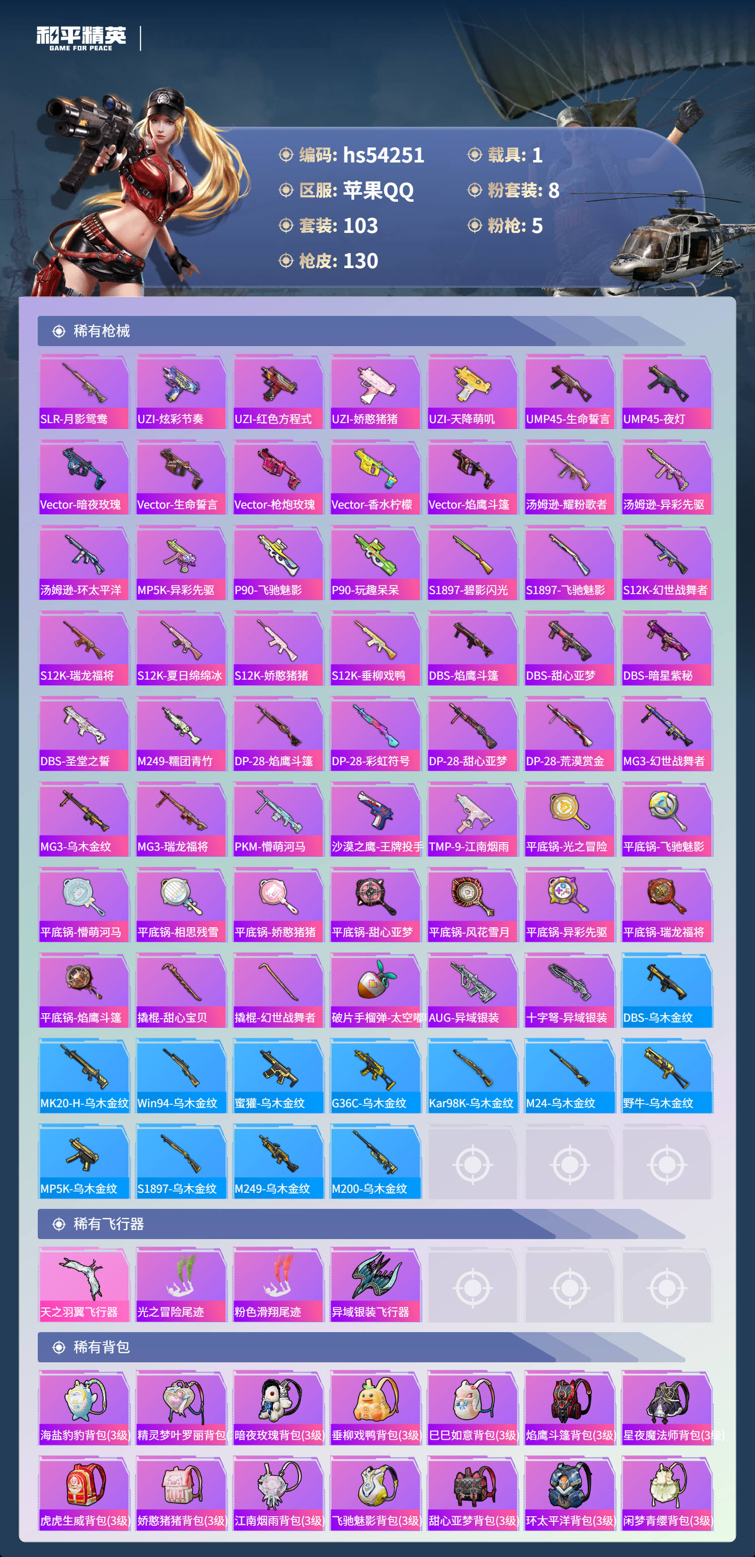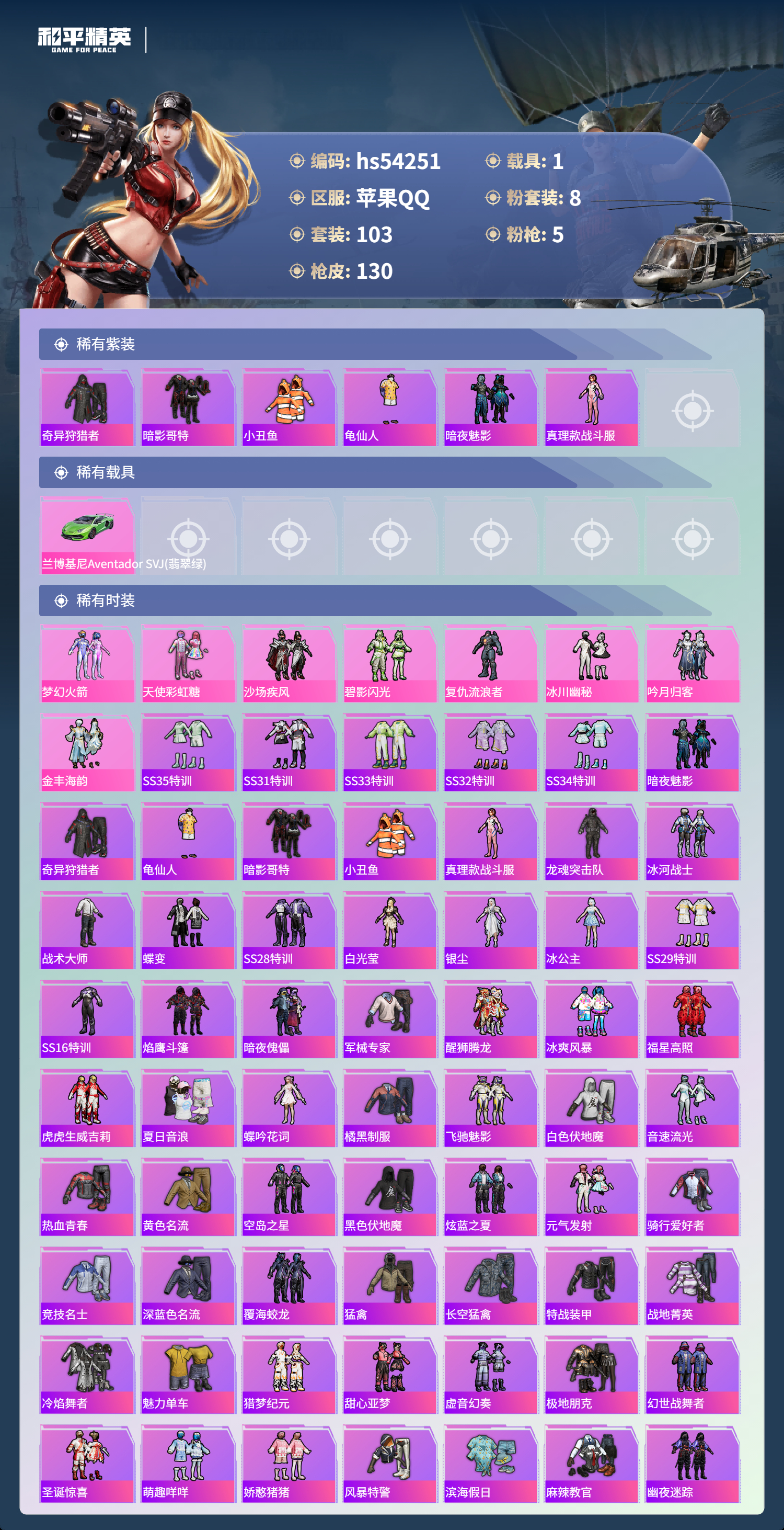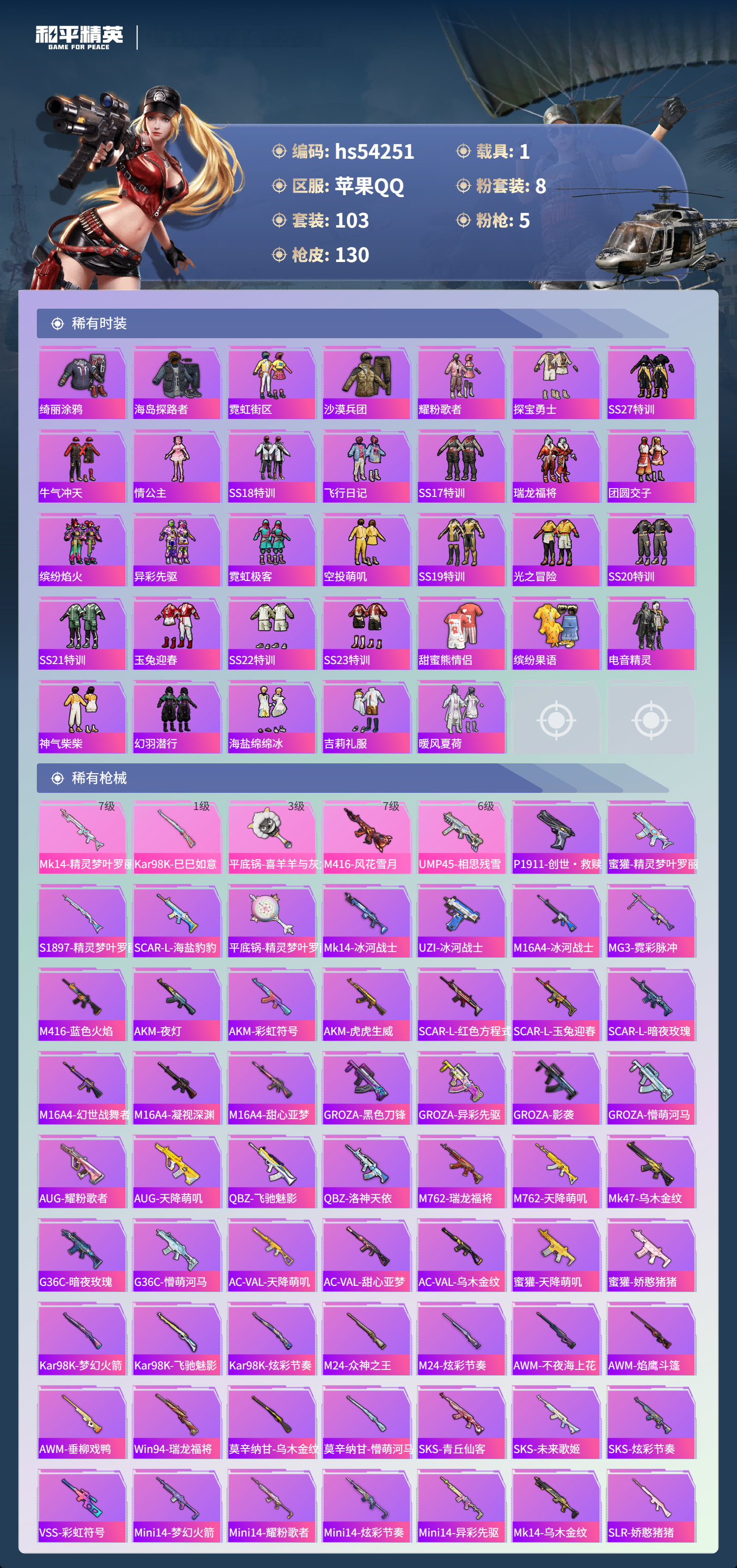 hs54251 苹果手q-8王牌印记-8粉装-5特效呛-1载具-48214热力值-103套装-130呛皮-1卓越印记【8粉装】套装-冰川幽秘角色-复仇流浪者套装-天使彩虹糖套装-吟月归客套装-碧影闪光套装-梦幻火箭套装-金丰海韵套装-沙场疾风【5特效呛】mk14-精灵梦叶罗丽/7级平底锅-喜羊羊与灰太狼/3级ump45-相思残雪/6级m416-风花雪月/7级kar98k-