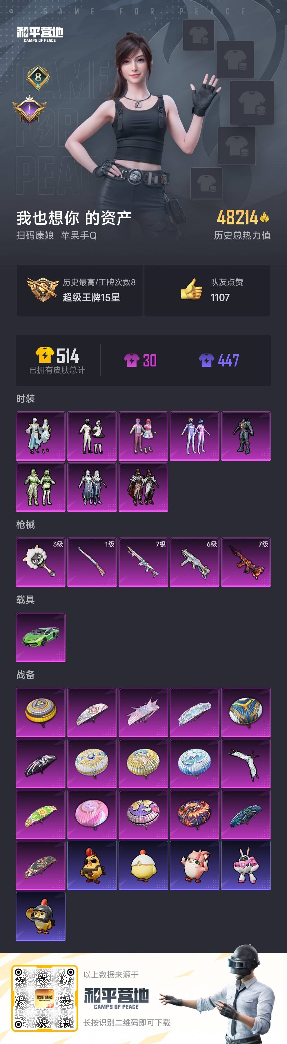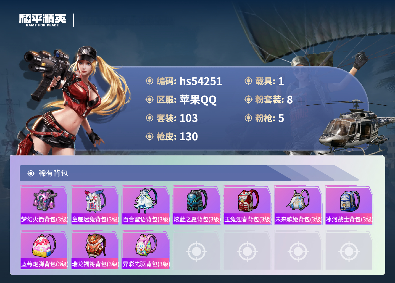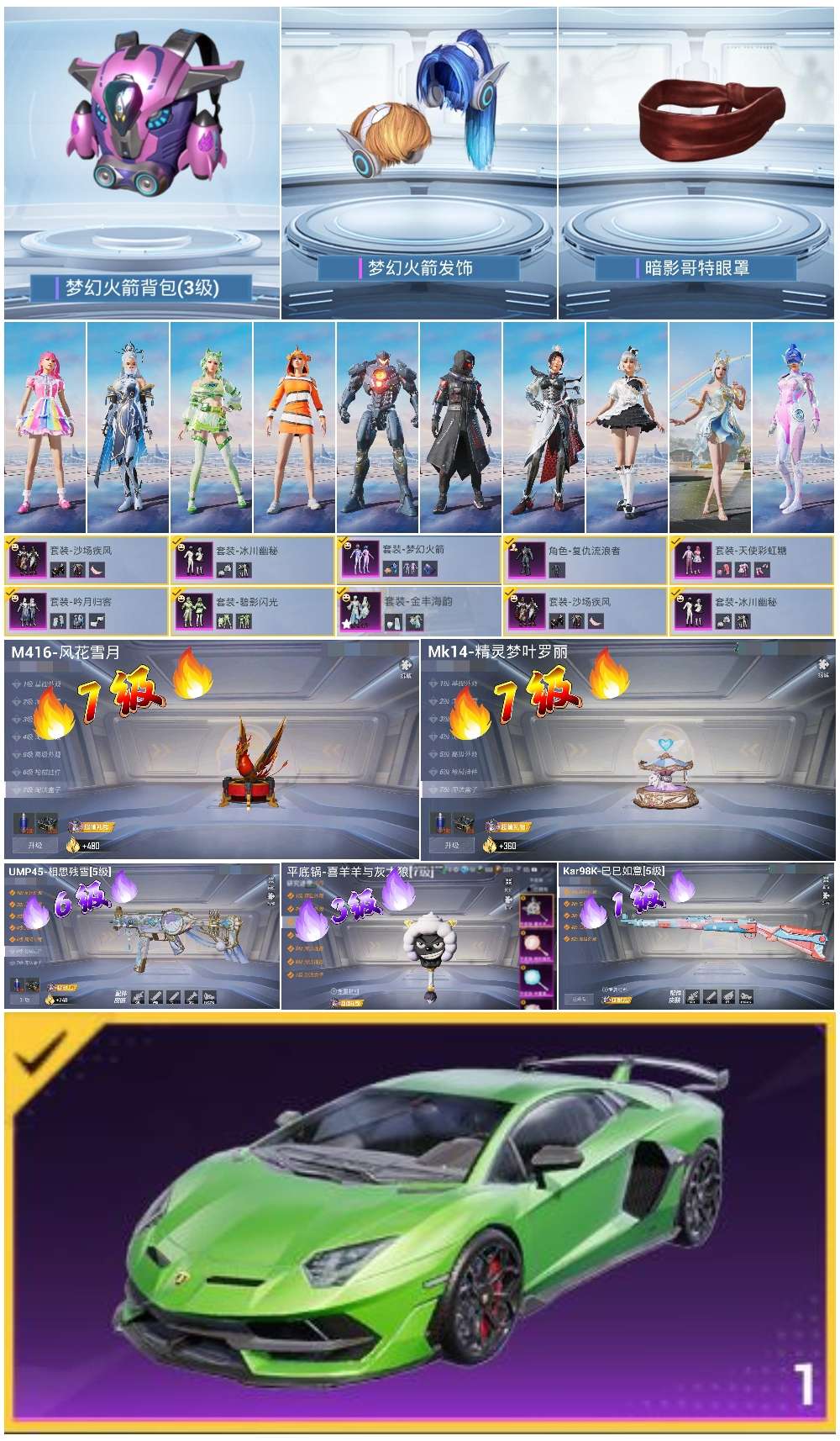 hs54251 苹果手q-8王牌印记-8粉装-5特效呛-1载具-48214热力值-103套装-130呛皮-1卓越印记【8粉装】套装-冰川幽秘角色-复仇流浪者套装-天使彩虹糖套装-吟月归客套装-碧影闪光套装-梦幻火箭套装-金丰海韵套装-沙场疾风【5特效呛】mk14-精灵梦叶罗丽/7级平底锅-喜羊羊与灰太狼/3级ump45-相思残雪/6级m416-风花雪月/7级kar98k-