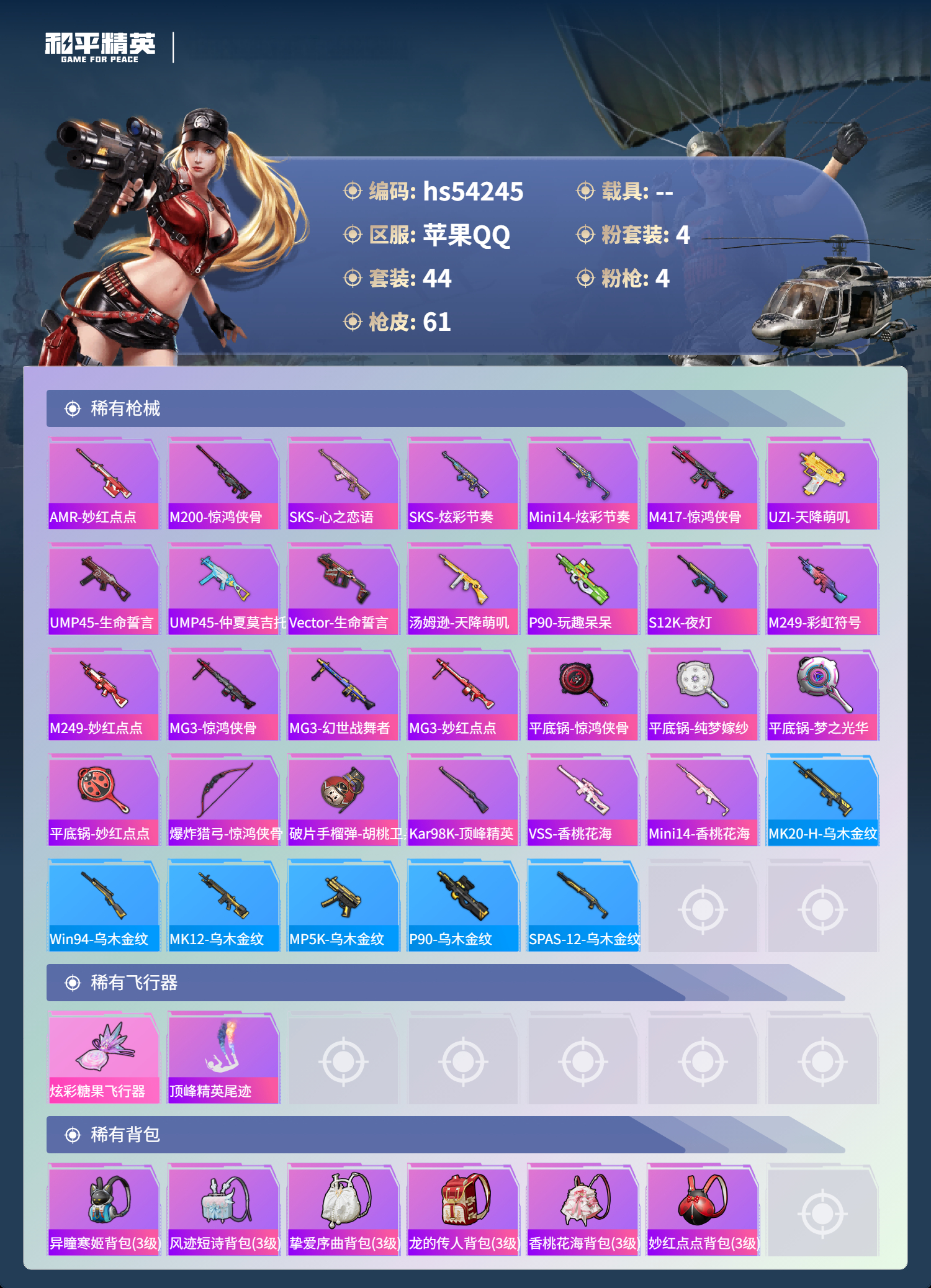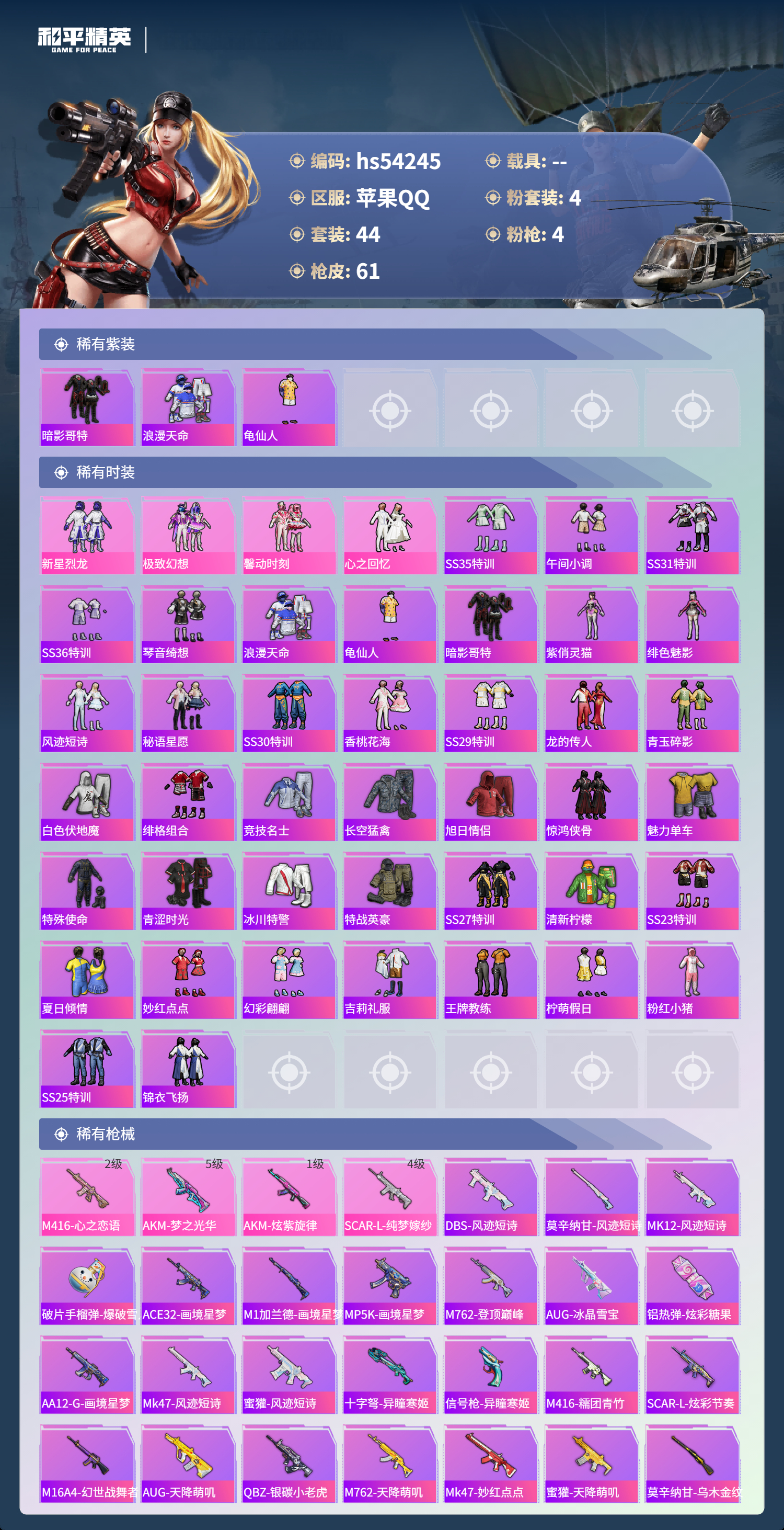 hs54245 苹果手q-2王牌印记-4粉装-4特效呛-19188热力值-44套装-61呛皮【4粉装】套装-心之回忆套装-新星烈龙套装-极致幻想套装-馨动时刻【4特效呛】akm-梦之光华/5级scar-l-纯梦嫁纱/4级m416-心之恋语/2级akm-炫紫旋律/1级【3稀有紫装】暗影哥特浪漫天命龟仙人【44稀有时装】新星烈龙ss35特训午间小调ss31特训ss36特