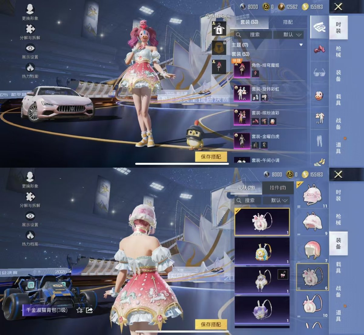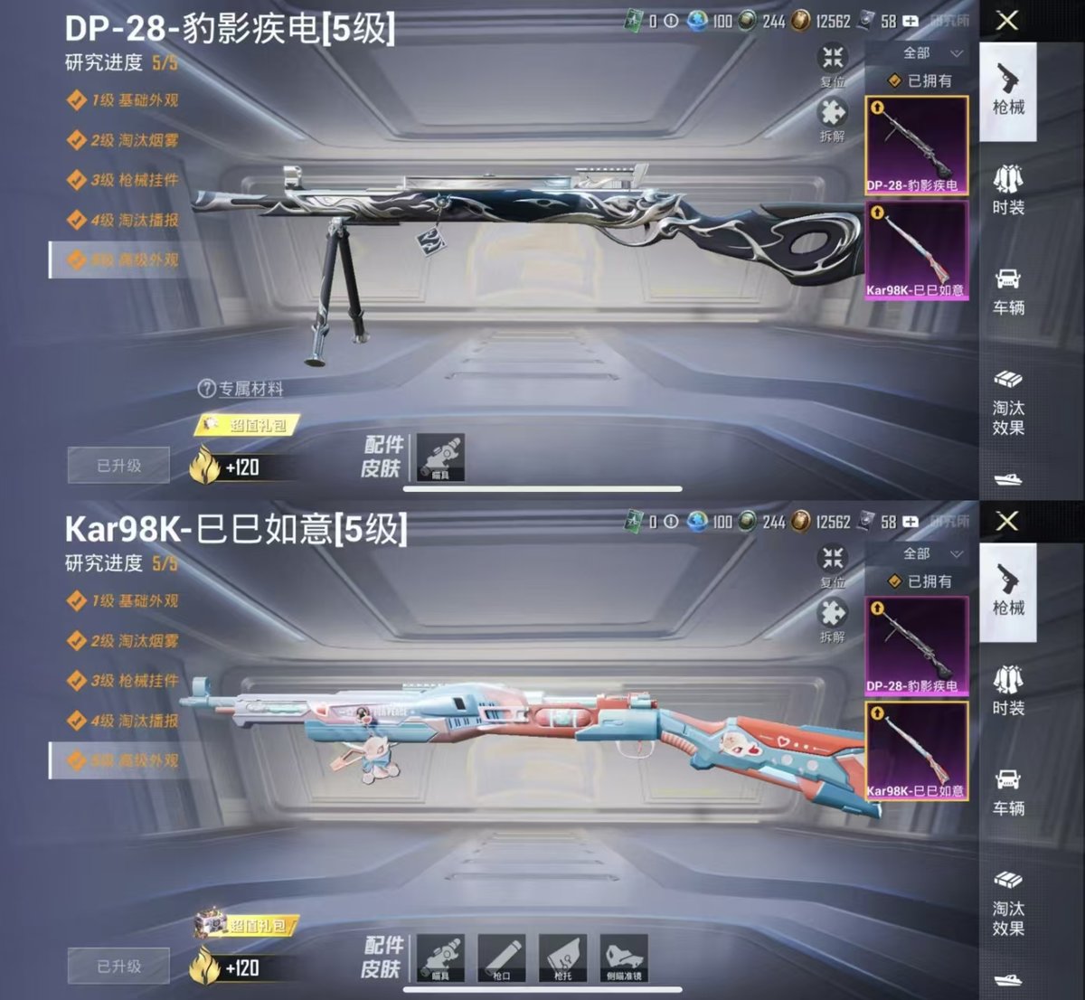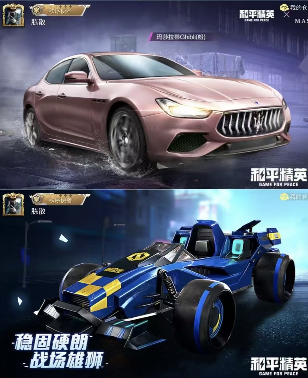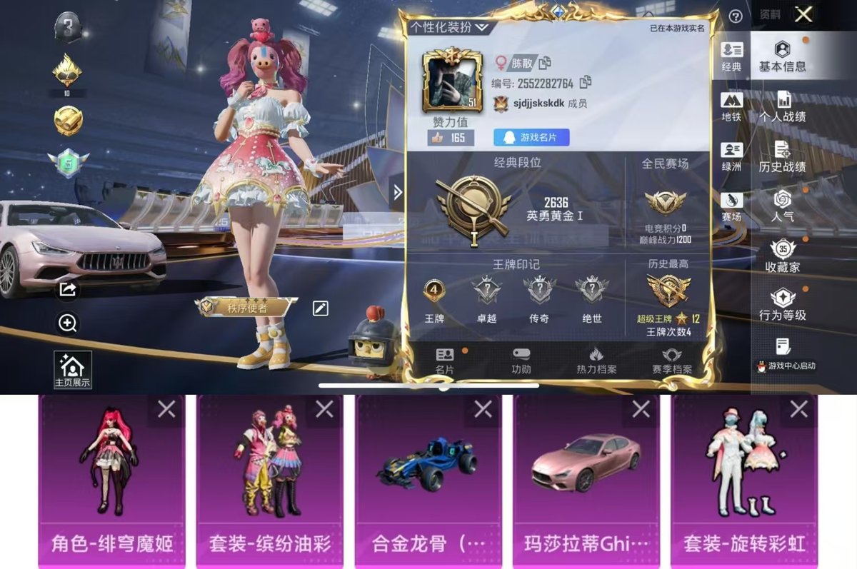 2318813-实名: 可修改 时装数: 200 载具数: 2 呛械数: 81 战备数: 57 热门装扮: 金曜白虎缤纷油彩旋转彩虹绯穹魔姬 载具: 玛莎拉蒂ghibli粉合金龙骨(蓝) 稀有呛皮: kar98k-巳巳如意dp-28-豹影疾电