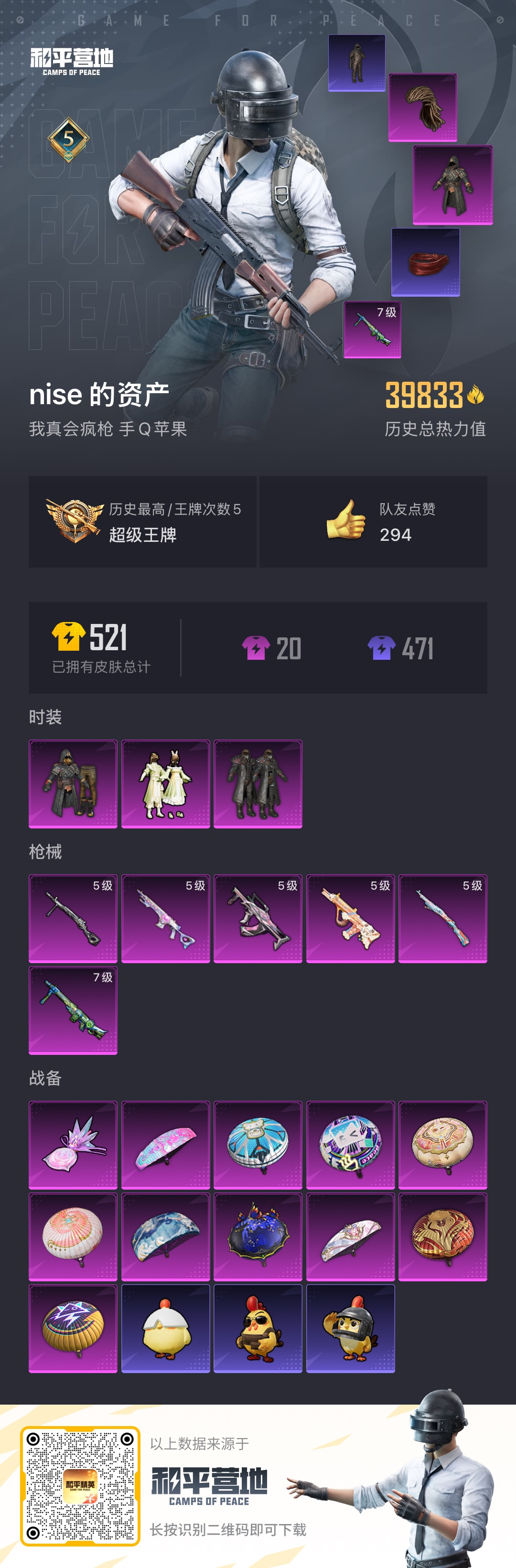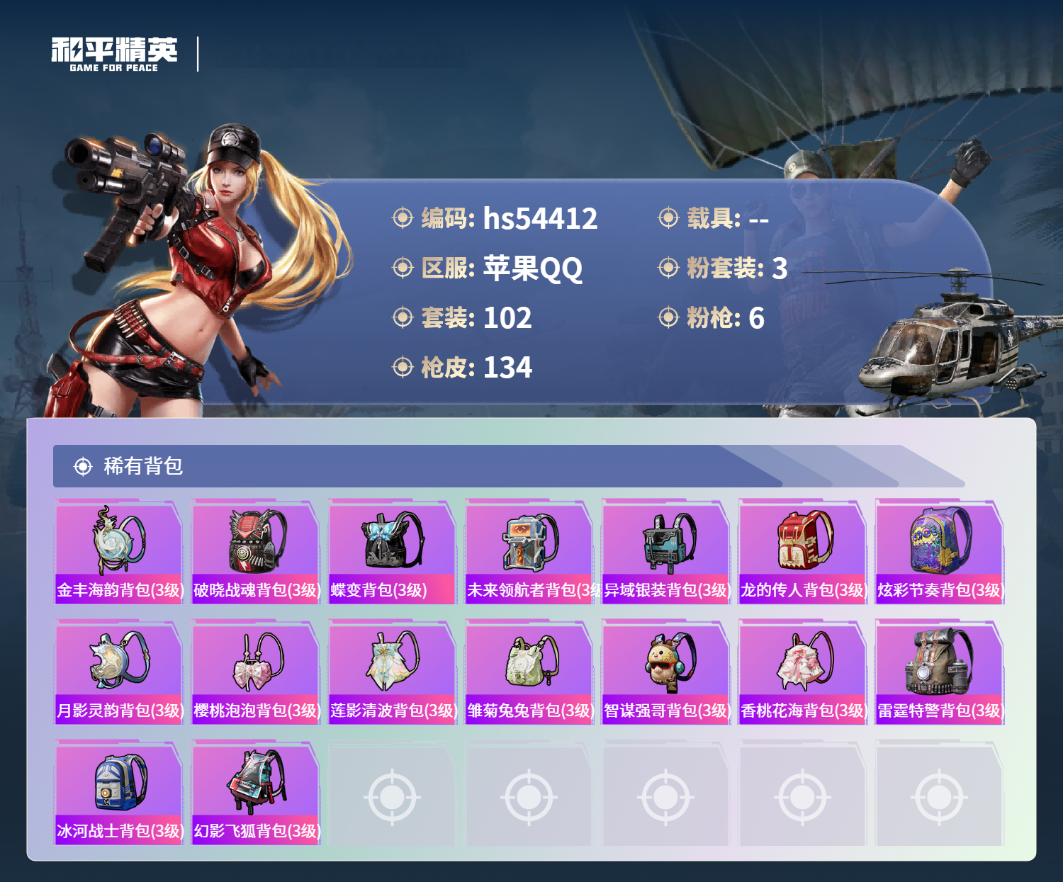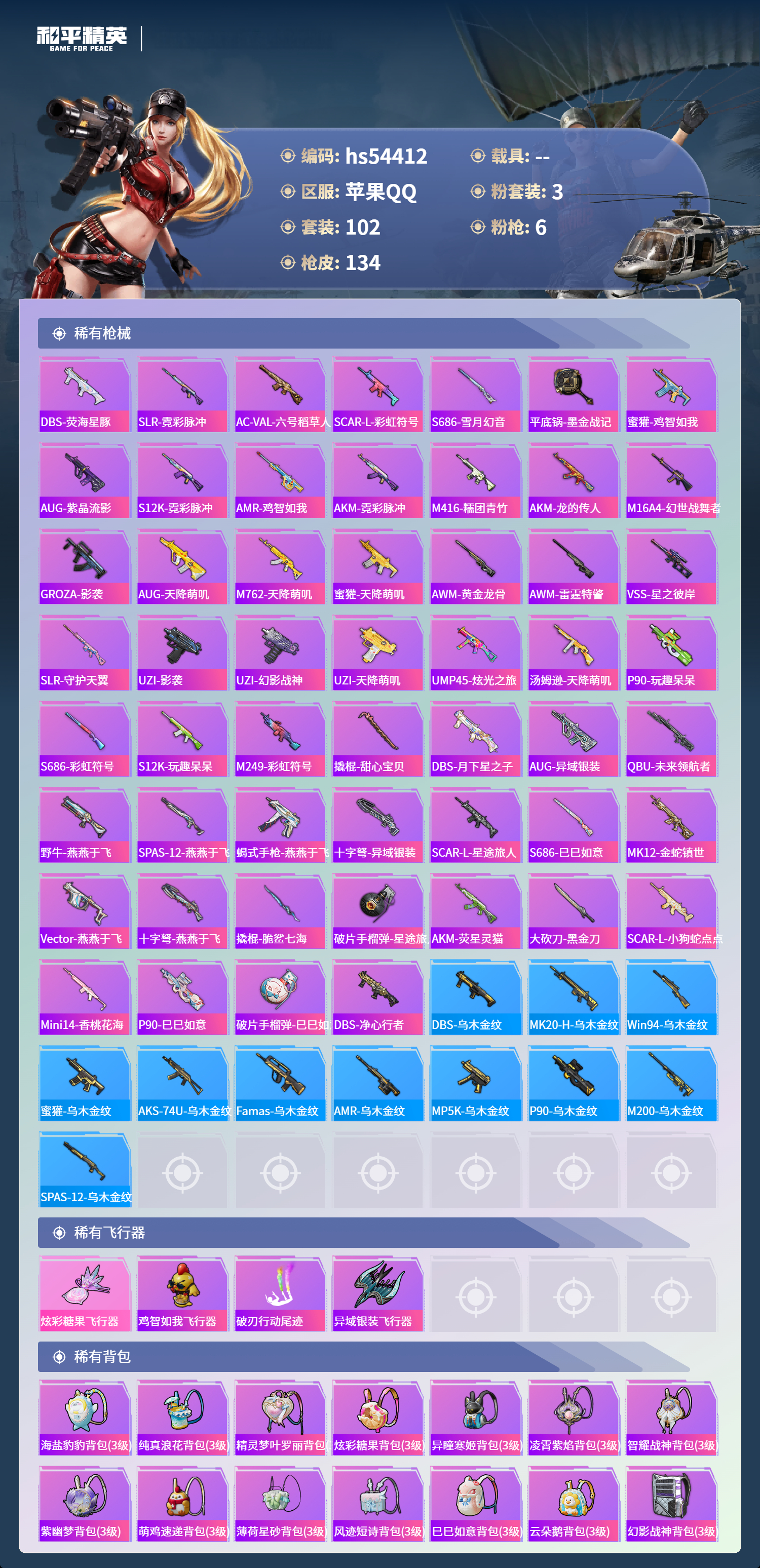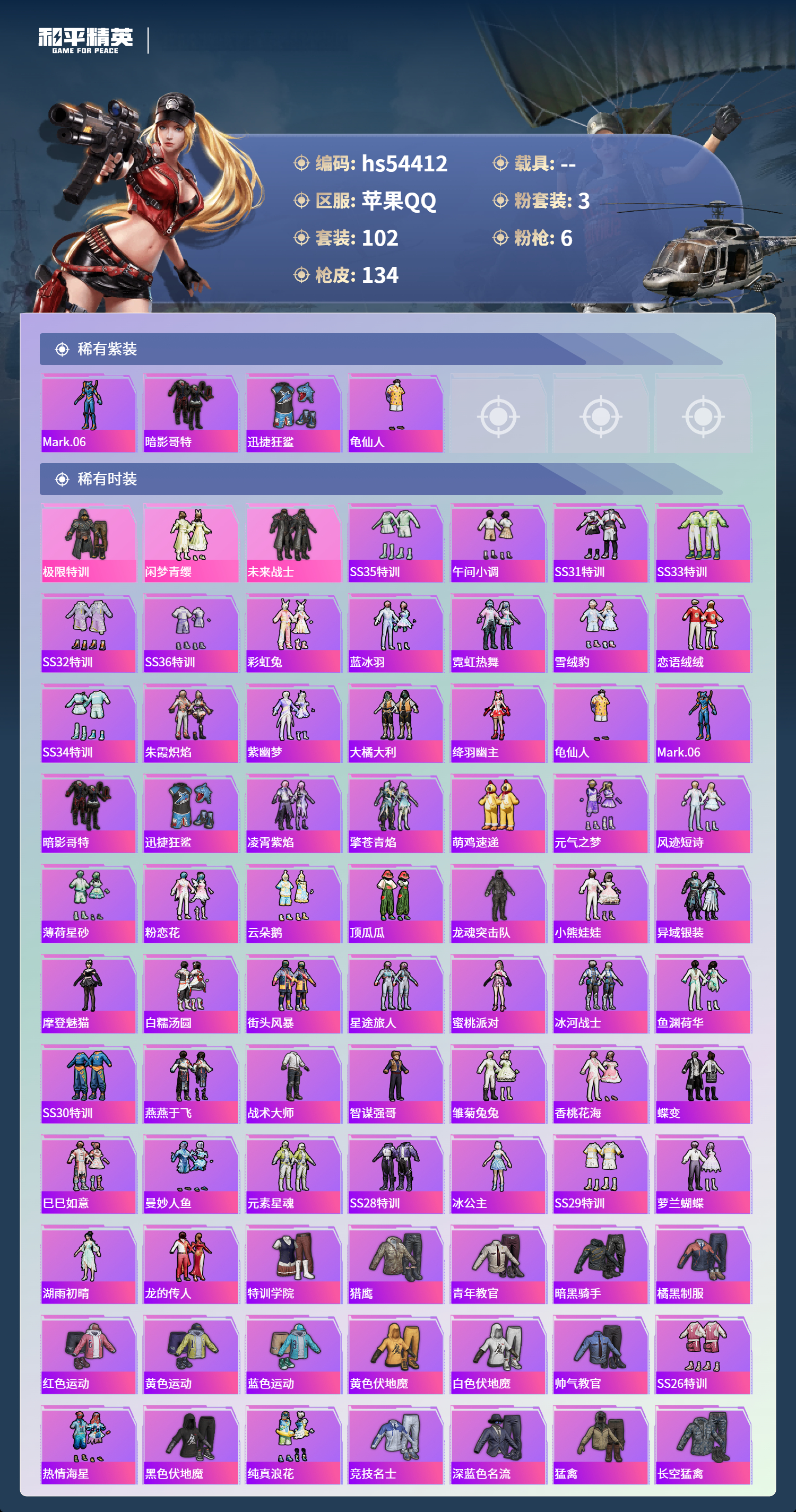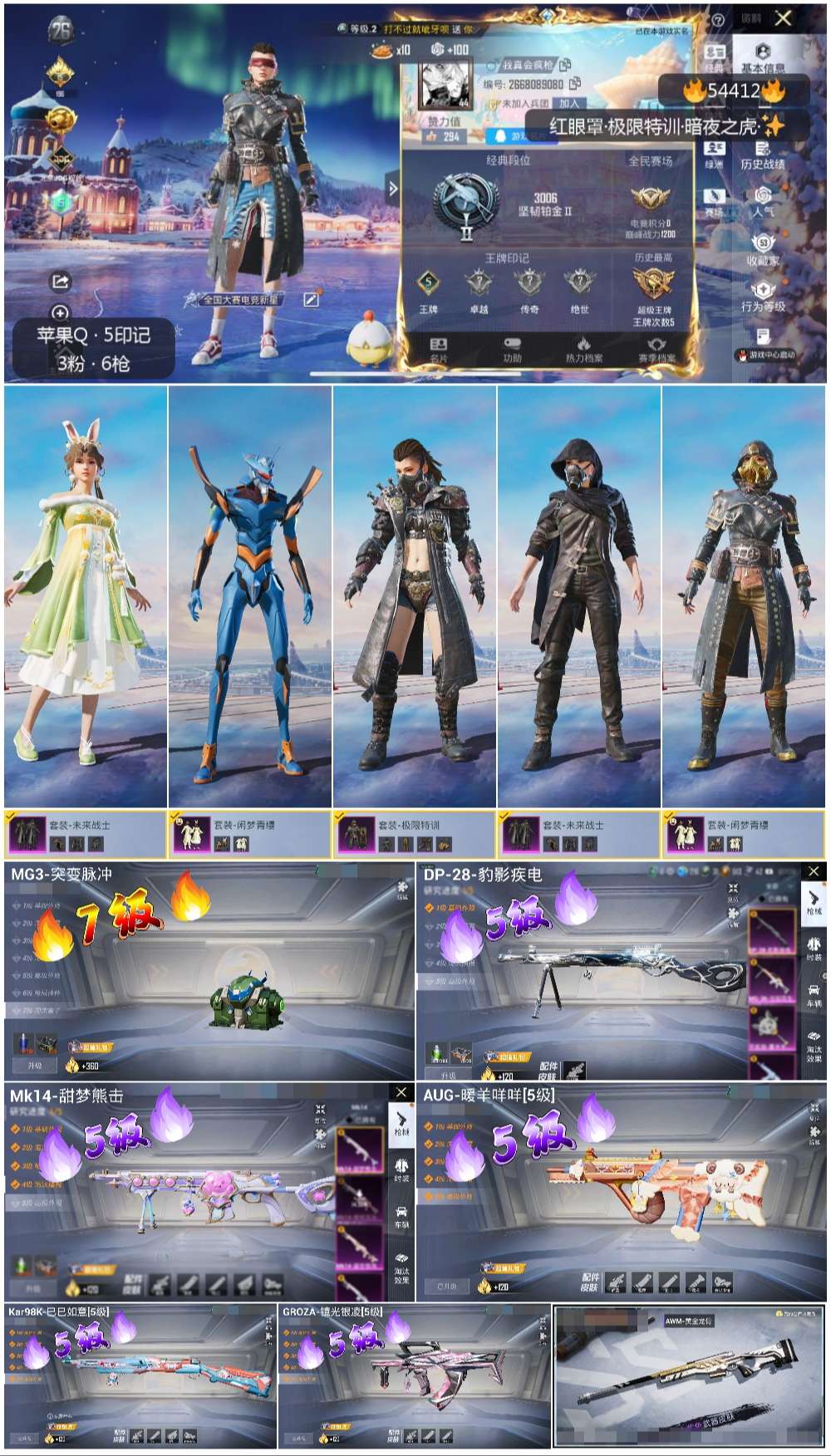 hs54412 苹果手q-5王牌印记-3粉装-6特效呛-39833热力值-102套装-134呛皮【3粉装】套装-未来战士套装-闲梦青缨套装-极限特训【6特效呛】mg3-突变脉冲/7级dp-28-豹影疾电/5级mk14-甜梦熊击/5级groza-镜光银凌/5级kar98k-巳巳如意/5级aug-暖羊咩咩/5级【4稀有紫装】mark.06暗影哥特迅捷狂鲨龟仙人【102稀有时