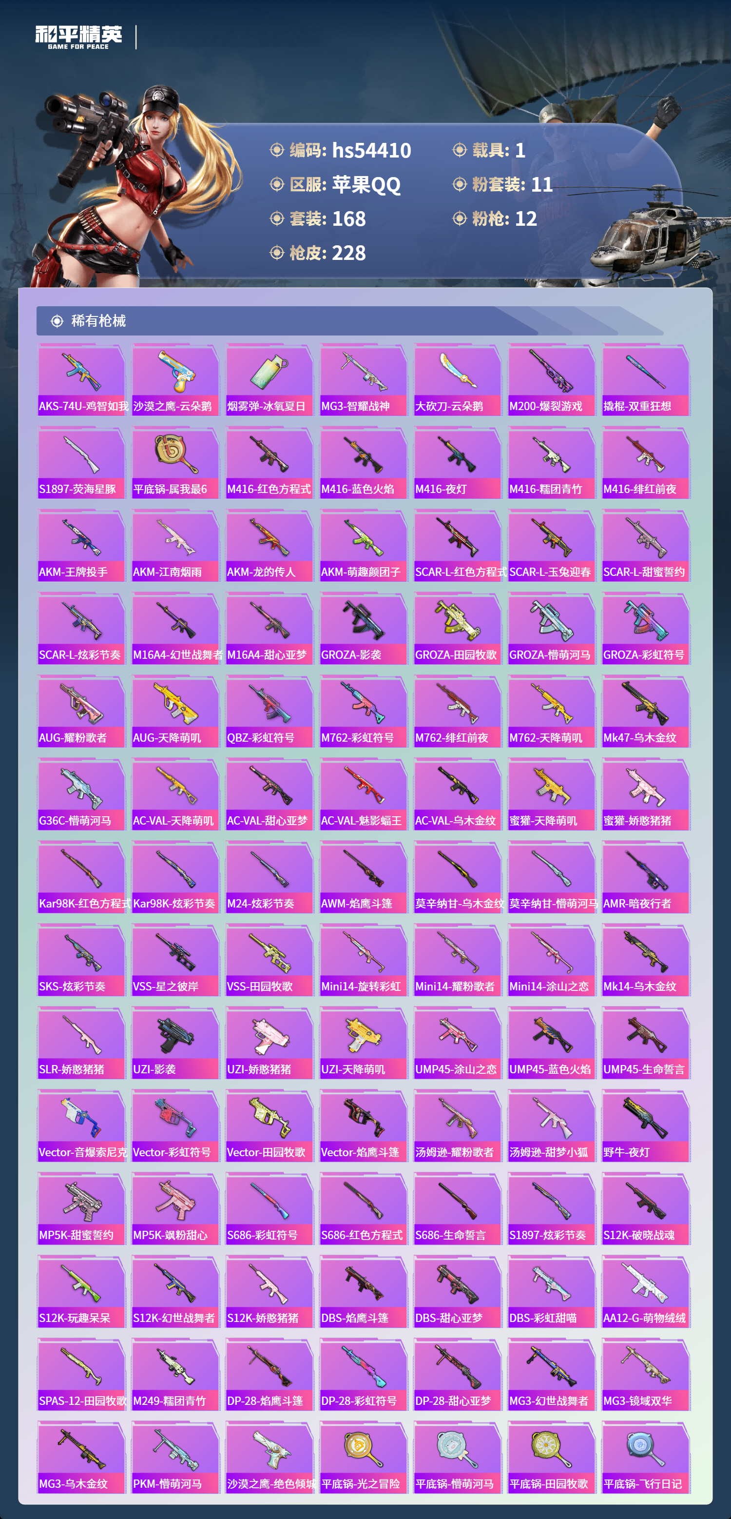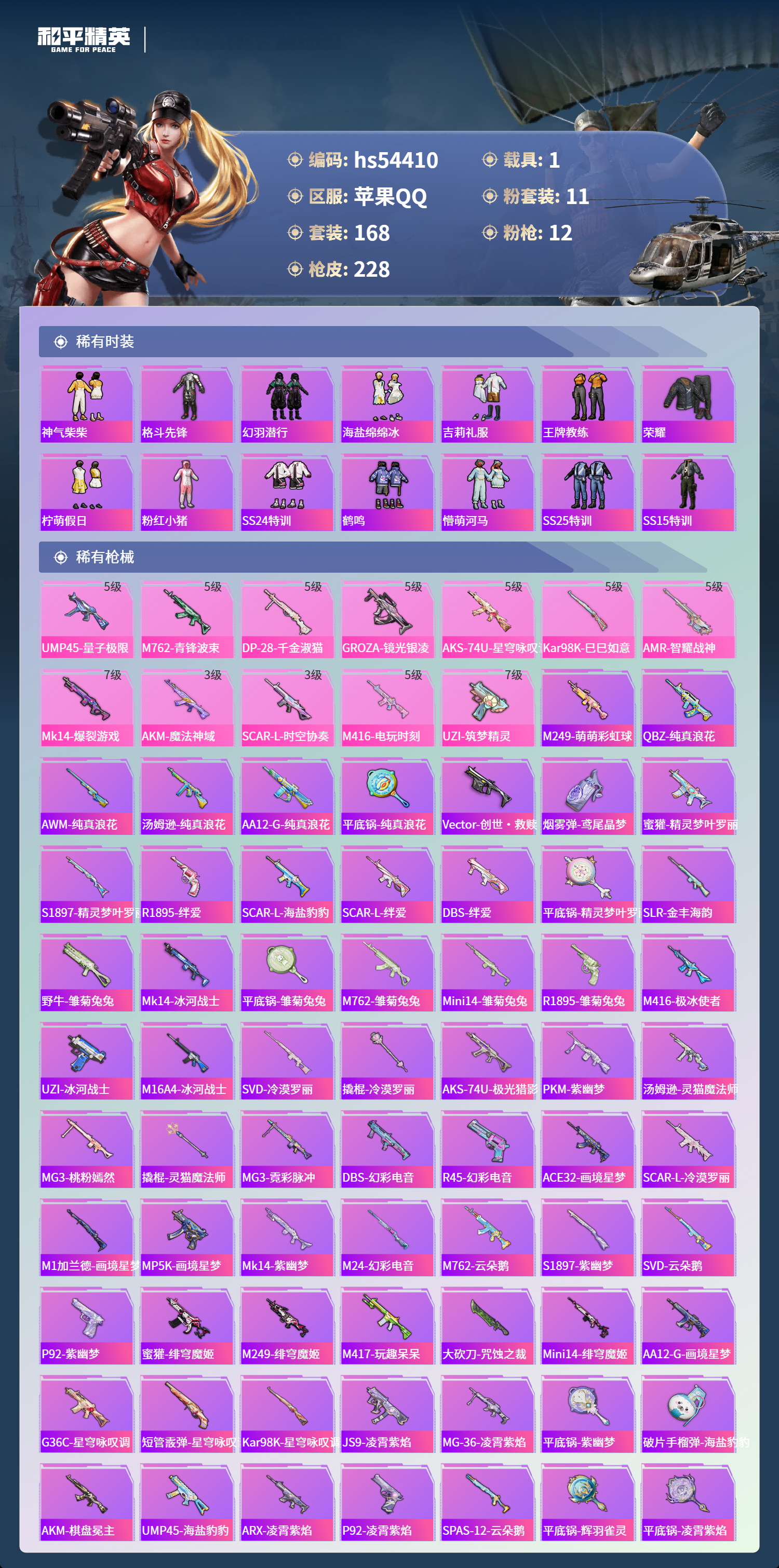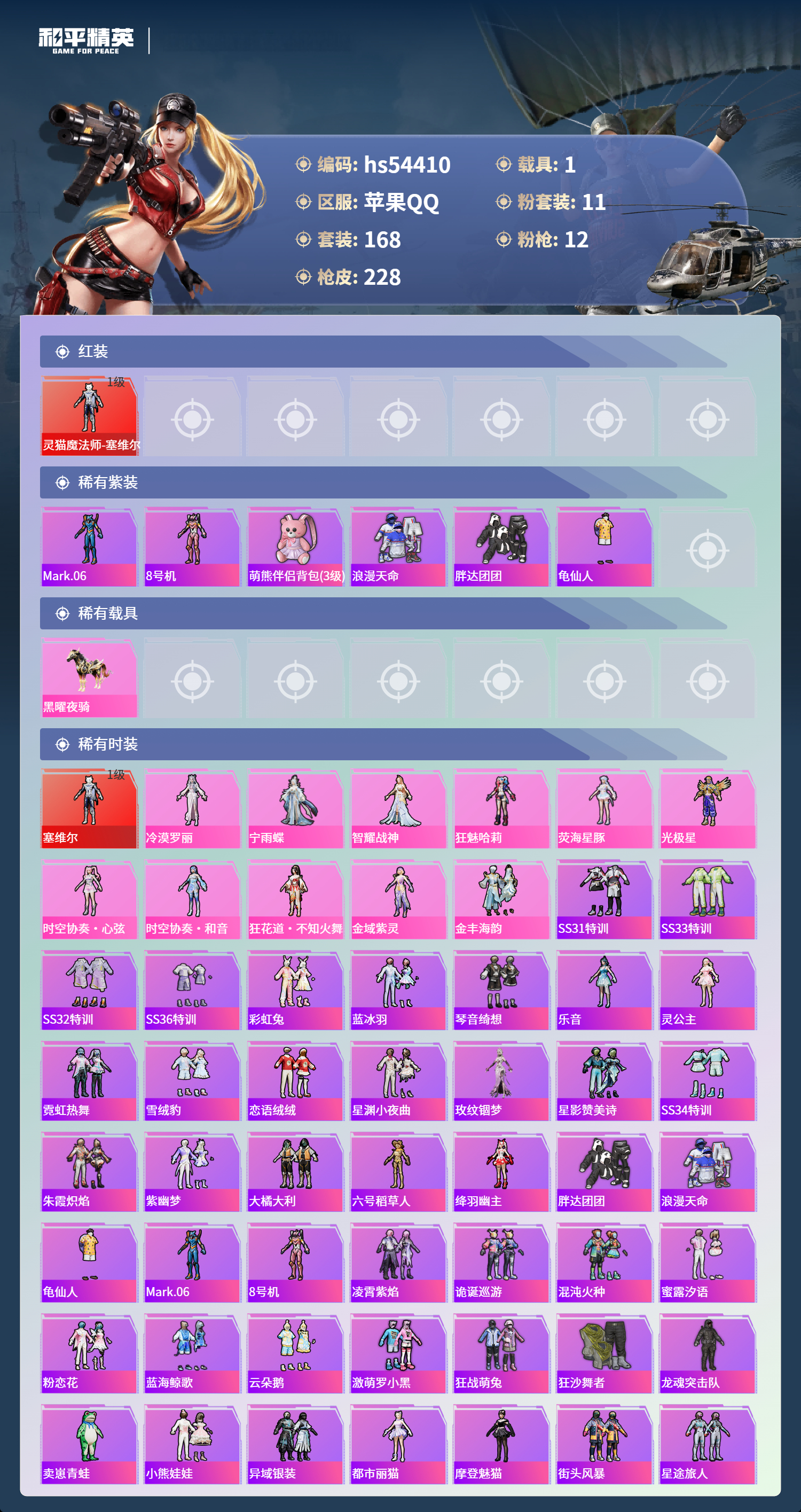 hs54410 苹果手q-11王牌印记-1红装-11粉装-12特效呛-1载具-79273热力值-168套装-228呛皮-4卓越印记-3传奇印记【1红装】灵猫魔法师-塞维尔/1级【11粉装】角色-狂花道·不知火舞角色-冷漠罗丽套装-金丰海韵角色-金域紫灵时空协奏·心弦角色-宁雨蝶时空协奏·和音角色-狂魅哈莉角色-智耀战神角色-光极星角色-荧海星豚【12特效呛】kar98k-