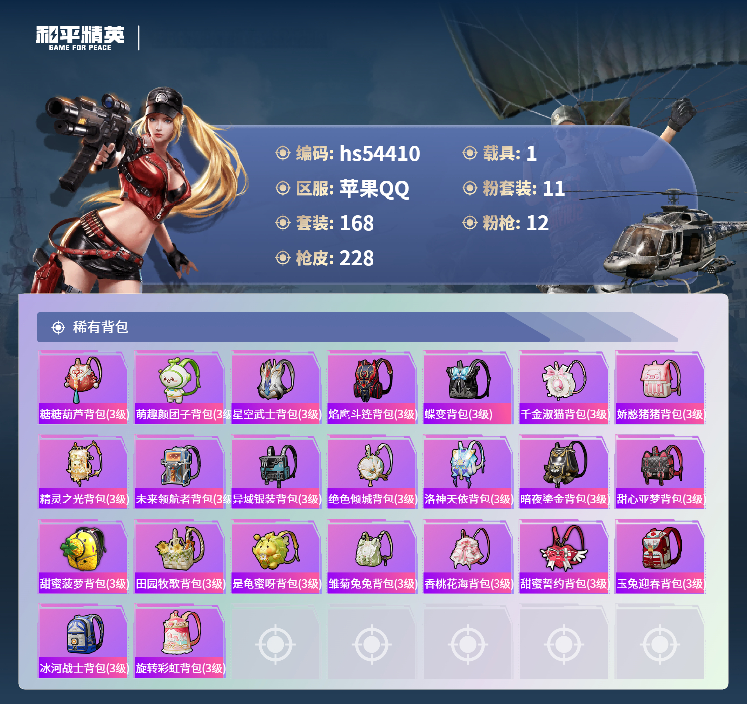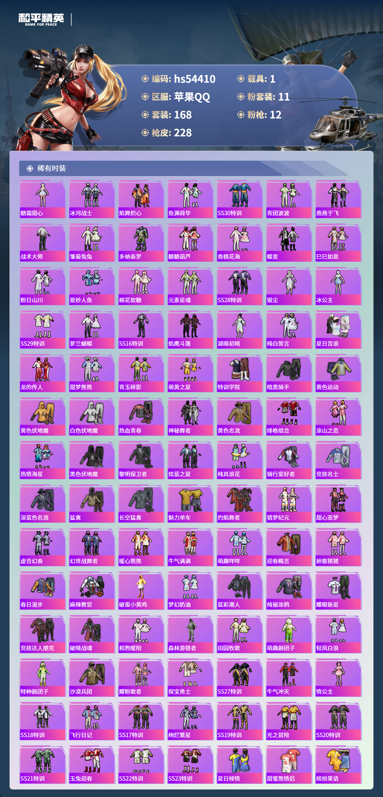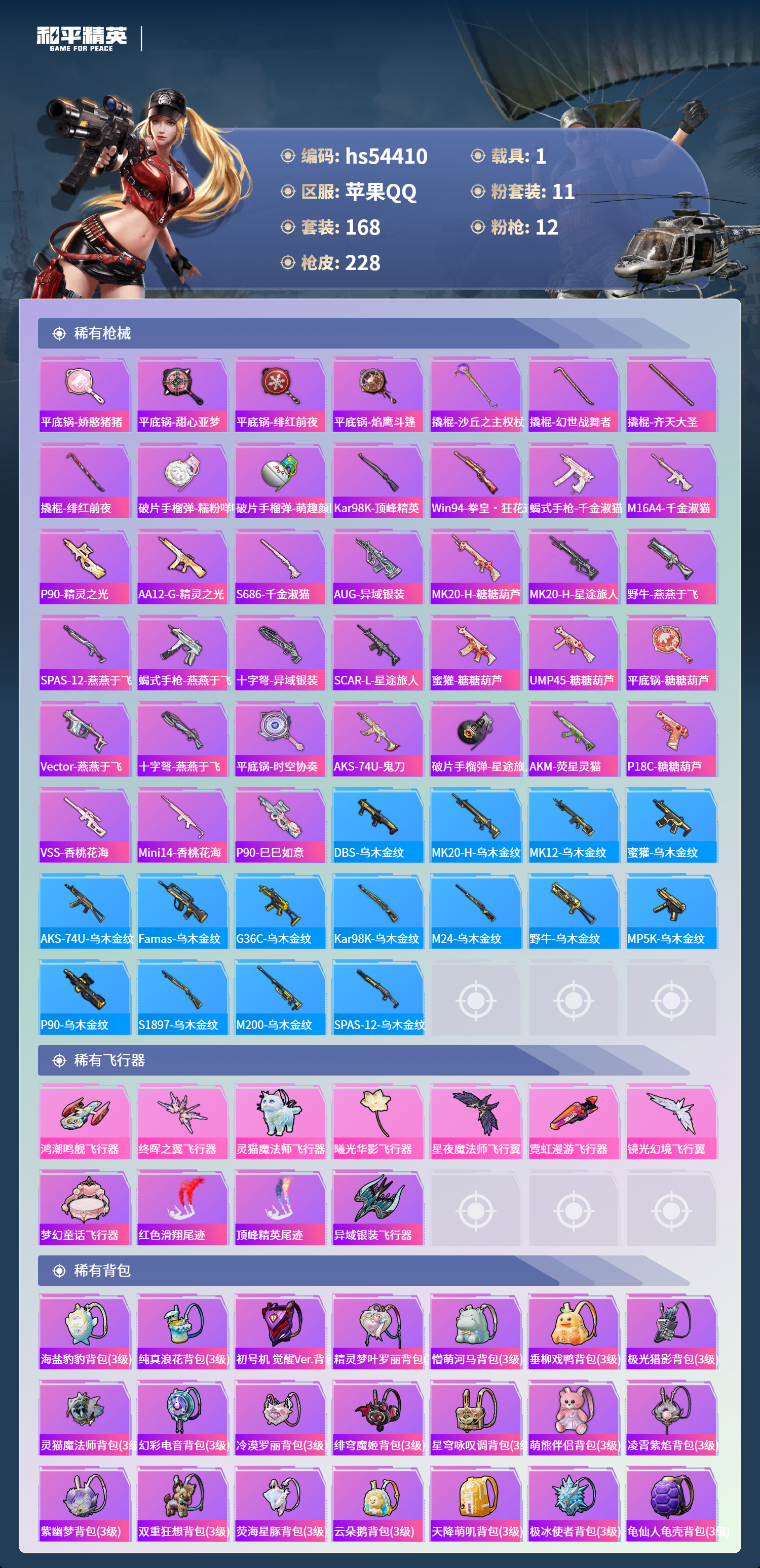 hs54410 苹果手q-11王牌印记-1红装-11粉装-12特效呛-1载具-79273热力值-168套装-228呛皮-4卓越印记-3传奇印记【1红装】灵猫魔法师-塞维尔/1级【11粉装】角色-狂花道·不知火舞角色-冷漠罗丽套装-金丰海韵角色-金域紫灵时空协奏·心弦角色-宁雨蝶时空协奏·和音角色-狂魅哈莉角色-智耀战神角色-光极星角色-荧海星豚【12特效呛】kar98k-