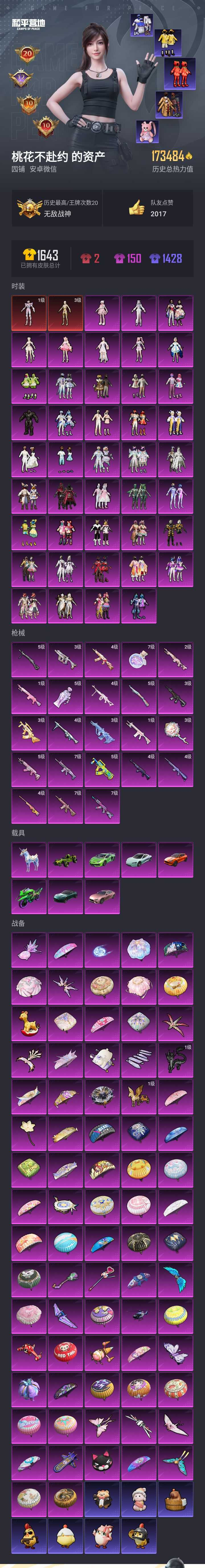 【和平精英】【lyhp19057】高印记 17w热力值 无敌战神 2红装42粉装23特效呛 8载具含1僚机 3级图卡盟 1级帕修斯 羊梦糖心 洛天依 樱桃泡泡 三巧克力 第五大道 仲夏莫吉托 梦幻火箭 蝶舞迷情 缤纷油彩(红熊茄茄 潮萌小黄鸭 青涩年华 浪漫天命 粉熊背包)满级死噶梦幻火箭 5级m762甜蜜誓约 3级狗杂精灵之光 满级m4心之恋语 3级m4墨龙九天 3级aug星梦奇缘 满级akm炫紫旋律 mk14盛世惊鸿 3级vect最终圣卫者 满级手蕾 满级盐雾蛋 玛莎拉蒂 星空马 合金龙骨 42粉装,23特效呛,8载具,历史最高段位:无敌战神 王牌印记20次 热力值:173484,336套装,380呛械,607装备,277战备;套装:沙丘之主-图卡盟,最终圣卫者-帕修斯,套装-甜心巧克力,套装-宝贝奶油派,套装-天使彩虹糖,套装-梦幻火箭,套装-蝶舞迷情,套装-甜蜜誓约,套装-深海曼妙,套装-潮汐统领,套装-黄蜂伯爵,套装-鳞翅贤者,套装-缤纷油彩,套装-草莓生巧,套装-迷蝶贵族,套装-星点战士,套装-花间之火,套装-极致幻想,套装-甜梦冰蝶,套装-心之恋语,套装-俏皮狐尾,套装-冰霜白皇,套装-童趣迷兔,套装-炙焰红王,套装-彩虹鹿灵,套装-山涧鹿灵,套装-翡翠骑士,套装-香水柠檬,角色-洛天依,套装-恐龙拽拽,套装-精灵娃娃,套装-霞光圣骑,套装-挚爱序曲,套装-第五大道,套装-仲夏莫吉托,角色-猩猩队长,套装-未来歌姬,角色-烟云彩露,时空协奏·心弦,角色-樱桃泡泡,角色-翎光蝶翼,角色-冷漠罗丽,套装-星穹咏叹调,角色-羊梦糖心,套装-特训学院,套装-青年教官,套装-竞技名士,套装-湖蓝色名流,套装-长空猛禽,套装-竞技勇士朋克,套装-雪鹰学院,套装-海岛探路者,套装-西部风情,套装-旭日情侣,套装-冷焰舞者,套装-刚毅裁决者,套装-浪漫天命,套装-特战装甲,套装-战地菁英,套装-缤纷假日,套装-浪漫假日,套装-街舞之王,套装-街舞达人,套装-青春校园,套装-灰色格斗者,套装-甜蜜告白,套装-春日漫步,套装-潮流先锋,套装-龙腾端午,套装-燃烧卡路里,套装-完美偶像,套装-人气偶像,套装-海滨突袭者,套装-千禧之恋,套装-神秘领域,套装-怒火燎原,套装-决胜时刻,套装-魅力单车,套装-s6赛事,套装-耀眼新星,套装-狂战萌兔,套装-雪山征服者,套装-坚韧舞者,套装-朋克治安官,套装-夜莺强袭者,套装-都市漫游者,套装-野性战心,套装-ss1特训,套装-都市魅力,套装-荣耀,套装-热血青春,套装-沙漠兵团,套装-丛林猎人,套装-ss2特训,套装-雪山精英,套装-传奇侦探,套装-甜蜜菠萝,套装-冰凉西瓜,套装-半糖蓝莓,套装-机械哨兵,套装-向日葵先生,套装-呆萌铁蟹,套装-甜蜜熊情侣,套装-青涩时光,套装-缤纷果语,套装-龙魂突击队,套装-冰川特警,套装-耀动青春,套装-青涩年华,套装-灿烂千阳,套装-格斗先锋,套装-冷血极客,套装-wifi精灵,套装-海上生明月,套装-ss3特训,套装-初雨海棠,套装-金环蜂王,套装-ss4特训,套装-梦魇先生,套装-万圣娃娃,套装-黑夜传说,套装-粉红小猪,套装-破蛋小黄鸡,套装-疯狂小兔子,套装-森林猎手,套装-幻世猎手,套装-深蓝冒险家,套装-迷域探索者,套装-机械征服者,套装-阳光火鸡,套装-ss5特训,套装-圣诞大吉,套装-冰原使者,套装-凛冬战士,套装-爱崽白熊,套装-浪漫波比,套装-军械专家,套装-北国孤狼,套装-ss6特训,套装-拳皇97八神庵,套装-炽焰拳师,套装-格斗专家,套装-星光纪元,套装-奇迹天团,套装-仓鼠灰灰,套装-蔷薇魔法师,套装-云纹魔法士,套装-淡雅花蕊,套装-玲珑飞花,套装-跃动心情,套装-黑色刀锋,套装-核芯基因,套装-精神漫游,套装-新侠客行,套装-银河圣歌,套装-闪耀星光,套装-鹤鸣,套装-霓虹街区,套装-暗夜契约,套装-纯白誓言,套装-激萌罗小黑,套装-赛博空间,套装-五号元素,套装-ss10特训,套装-潮萌小黄鸭,套装-ss8特训,套装-众神之王,套装-智慧之神,套装-神秘黑猫,套装-大橘为重,套装-萌黄之夏,套装-隐空刺,套装-影双刃,套装-摇滚狂鲨,套装-深海来使,套装-夏日音浪,套装-ss9特训,套装-风华少年志,套装-白月香洋装,套装-神秘舞者,套装-顽皮玉兔,套装-抹茶蜜豆,套装-薄荷蓝莓,套装-安第斯皇冠,套装-探宝勇士,套装-本愿之火,套装-辉星之火,套装-蓝甜马卡龙,套装-牛气满满,套装-玫瑰恋情,套装-韶华初心,套装-梦之呓语,套装-ss11特训,套装-玄武圣者,套装-原初圣火,套装-逆风勇士,套装-静谧青瓷,套装-娴静芝兰,套装-战术大师,套装-ss12特训,套装-闪金天王,套装-镭射皇者,套装-银白舞王,套装-耀粉歌者,套装-暗黑裁决,套装-迅捷之星,套装-治愈之星,套装-科技之星,套装-萌主吾皇,套装-飞行日记,套装-ss13特训,套装-曼妙人鱼,套装-热情海星,套装-纯真浪花,套装-冰爽海盐,套装-浪漫樱花,套装-ss14特训,套装-天籁歌者,套装-电音精灵,套装-豚鼠丹丹,套装-异彩先驱,套装-粉团憨憨,套装-荷畔雨呱,套装-红熊茄茄,套装-灵动马戏师,套装-俏皮奶喵,套装-ss22特训,套装-和煦暖阳,套装-田园牧歌,套装-轻风白浪,套装-艾菲玫瑰,套装-绚烂繁星,套装-光之冒险,套装-绯格组合,套装-ss23特训,套装-莱茵河畔,套装-香榭午后,套装-白兰地假日,套装-龙舌兰冰茶,套装-霓彩缤纷,套装-甜梦熊熊,套装-神气柴柴,套装-懵萌河马,套装-灵蜜圈圈,套装-妙红点点,套装-幻彩翩翩,套装-跃动晴空,套装-王牌教练,套装-柠萌假日,套装-青玉碎影,套装-ss24特训,套装-荧惑魅影,套装-恋恋初桃,套装-龟仙人,套装-涂山之恋,套装-ss25特训,套装-惊鸿侠骨,套装-锦衣飞扬,套装-晨曦薄雾,套装-香桃花海,套装-牛仔情诗