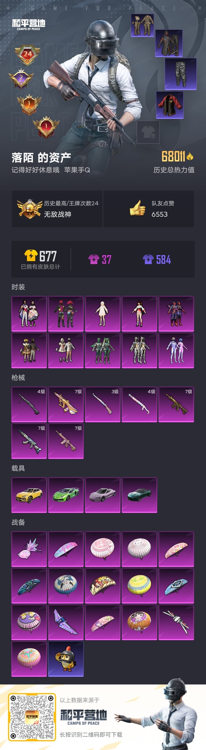 【和平精英】【txhp5715】10粉装,7特效呛,4载具,历史最高段位:无敌战神 王牌印记24次 热力值:68011,150套装,171呛械,226装备,98战备;套装:套装-甜心巧克力,套装-宝贝奶油派,套装-梦幻火箭,套装-放客神游,套装-翡翠骑士,套装-绚金战神,套装-星之彼岸,角色-小可学妹,角色-白勺歌姬,套装-星穹咏叹调,套装-特训学院,套装-猎鹰,套装-青年教官,套装-橘黑制服,套装-红色运动,套装-黄色运动,套装-蓝色运动,套装-黄色伏地魔,套装-白色伏地魔,套装-黑色伏地魔,套装-登山爱好者,套装-竞技名士,套装-深蓝色名流,套装-酒红色名流,套装-湖蓝色名流,套装-猛禽,套装-游猎者,套装-长空猛禽,套装-漫步者,套装-竞技勇士朋克,套装-黎明保卫者,套装-旭日情侣,套装-寒蝎幽灵,套装-灼焰舞者,套装-特战装甲,套装-战地菁英,套装-黄色格斗者,套装-灰色格斗者,套装-战地名士,套装-迎春赐吉,套装-春日漫步,套装-冰冻风暴,套装-完美偶像,套装-人气偶像,套装-蓝彩潮人,套装-千禧之恋,套装-怒火燎原,套装-魅力单车,套装-绮丽涂鸦,套装-竞技达人朋克,套装-破晓战魂,套装-幻世保卫者,套装-都市魅力,套装-热血青春,套装-沙漠兵团,套装-雪山精英,套装-酷潮明星,套装-奇异狩猎者,套装-呆萌铁蟹,套装-深海小丑鱼,套装-青涩时光,套装-缤纷果语,套装-滨海厨神,套装-极速红龙,套装-海上生明月,套装-东方飞龙,套装-破蛋小黄鸡,套装-疯狂小兔子,套装-北国孤狼,套装-ss6特训,套装-淡雅花蕊,套装-玲珑飞花,套装-ss7特训,套装-霓虹街区,套装-纯白誓言,套装-ss10特训,套装-ss8特训,套装-ss9特训,套装-牛气满满,套装-梦之呓语,套装-诡谋托雷基亚,套装-骁骑迪迦,套装-原初圣火,套装-逆风勇士,套装-战术大师,套装-ss12特训,套装-ss18特训,套装-镭射皇者,套装-银白舞王,套装-迅捷之星,套装-治愈之星,套装-科技之星,套装-飞行日记,套装-ss13特训,套装-冰爽海盐,套装-ss14特训,套装-怪兽之王,套装-ss15特训,套装-ss16特训,套装-暴风机械师,套装-时空追击者,套装-暗夜傀儡,套装-ss17特训,套装-醒狮腾龙,套装-瑞龙福将,套装-团圆交子,套装-福星高照,套装-空投萌叽,套装-炫蓝之夏,套装-ss20特训,套装-ss21特训,套装-ss22特训,套装-光之冒险,套装-绯格组合,套装-ss23特训,套装-香榭午后,套装-神气柴柴,套装-懵萌河马,套装-妙红点点,套装-幻彩翩翩,套装-王牌教练,套装-柠萌假日,套装-ss24特训,套装-龟仙人,套装-涂山之恋,套装-ss26特训,套装-快闪甜心,套装-春光漫游,套装-空岛之星,套装-贝斯之夜,套装-焰鹰斗篷,套装-幽夜迷踪,套装-幻羽潜行,套装-老实芭蕉,套装-ss31特训,套装-ss33特训,套装-云朵鹅,套装-ss32特训,套装-彩虹兔,套装-雪绒豹,套装-大橘大利,套装-炫彩糖果,套装-元气之梦,套装-ss34特训,套装-擎苍青焰,套装-朱霞炽焰,套装-凌霄紫焰,套装-薄荷星砂,套装-ss35特训,套装-萌鸡速递;呛皮:mk47-百万伏特,mk47-乌木金纹,mk47-妙红点点,q-神秘黑猫,q-原初圣火,q-赛罗,q-乌木金纹,7级m416-五爪金龙,7级m416-心之恋语,m416-红色方程式,m416-糯团青竹,7级m762-激战未来,m762-绯红前夜,m762-甜心宝贝,m762-镭射皇者,m762-瑞龙福将,m762-天降萌叽,m762-云朵鹅,arx-凌霄紫焰,akm-生命誓言,akm-百万伏特,akm-涂鸦街区,akm-彩虹符号,akm-霓彩脉冲,akm-乌木金纹,g36c-时空追击者,g36c-懵萌河马,g36c-乌木金纹,famas-霓彩脉冲,famas-乌木金纹,scar-l-炫彩节奏,scar-l-怪兽之王,scar-l-乌木金纹,蜜獾-天降萌叽,蜜獾-精灵梦叶罗丽,蜜獾-绯穹魔姬,蜜獾-乌木金纹,ac-val-乌木金纹,ac-val-快闪甜心,7级aug-圣斗士星矢,aug-异域银装,aug-乌木金纹,groza-春暖花开,groza-治愈之星,groza-彩虹符号,groza-懵萌河马,groza-乌木金纹,m16a4-幻世战舞者,3级kar98k-巳巳如意,kar98k-梦幻火箭,kar98k-终极赛罗,kar98k-炫彩节奏,kar98k-乌木金纹,awm-垂柳戏鸭,awm-圣堂之誓,awm-焰鹰斗篷,awm-乌木金纹,m24-影袭,m24-治愈之星,m24-乌木金纹,amr-妙红点点,amr-白勺歌姬,amr-乌木金纹,svd-云朵鹅,svd-霓彩脉冲,m200-乌木金纹,莫辛纳甘-乌木金纹,莫辛纳甘-懵萌河马,win94-怪笑疯兔,win94-瑞龙福将,win94-乌木金纹,vss-镭射皇者,sks-心之恋语,sks-怪兽之王,sks-时空追击者,sks-乌木金纹,mini14-生命誓言,mini14-原初圣火,mk20-h-快闪甜心,mk20-h-狂鲨锋刃,mk20-h-乌木金纹,slr-霓彩脉冲,mk14-治愈之星,mk14-乌木金纹,uzi-生命誓言,uzi-炫彩节奏,uzi-天降萌叽,uzi-幽秘魅影,uzi-炫彩糖果,汤姆逊-幻影战神,汤姆逊-银刃赛罗,汤姆逊-乌木金纹,vect-生命誓言,vect-治愈之星,vect-暗夜玫瑰,vect-焰鹰斗篷,vect-乌木金纹,mp5k-乌木金纹,ump45-生命誓言,ump45-春暖花开,ump45-怪兽之王,ump45-时空追击者,ump45-涂山之恋,ump45-海盐豹豹,p90-快闪甜心,p90-玩趣呆呆,p90-乌木金纹,aks-74u-乌木金纹,野牛-乌木金纹,js9-凌霄紫焰,s686-生命誓言,s686-白勺歌姬,dbs-时空追击者,dbs-第五大道,dbs-焰鹰斗篷,dbs-乌木金纹,s12k-香水柠檬,s12k-瑞龙福将,s12k-霓彩脉冲,s12k-乌木金纹,4级spas-12-蜜语绒猫,spas-12-狂鲨锋刃,spas-12-云朵鹅,spas-12-乌木金纹,s1897-镭射皇者,s1897-乌木金纹,m249-镭射皇者,m249-糯团青竹,m249-妙红点点,m249-乌木金纹,4级dp-28-豹影疾电,dp-28-甜心宝贝,dp-28-原初圣火,dp-28-甜心首席,dp-28-焰鹰斗篷,dp-28-乌木金纹,pkm-懵萌河马,pkm-啾咪啾咪,mg3-瑞龙福将,mg3-幻世战舞者,mg3-乌木金纹,mg3-妙红点点,mg-36-凌霄紫焰,tmp-9-江南烟雨,p92-凌霄紫焰,p18c-原初圣火,信号呛-异瞳寒姬,沙墨之鹦-快闪甜心,沙墨之鹦-云朵鹅,平底锅-缤纷糖果,平底
