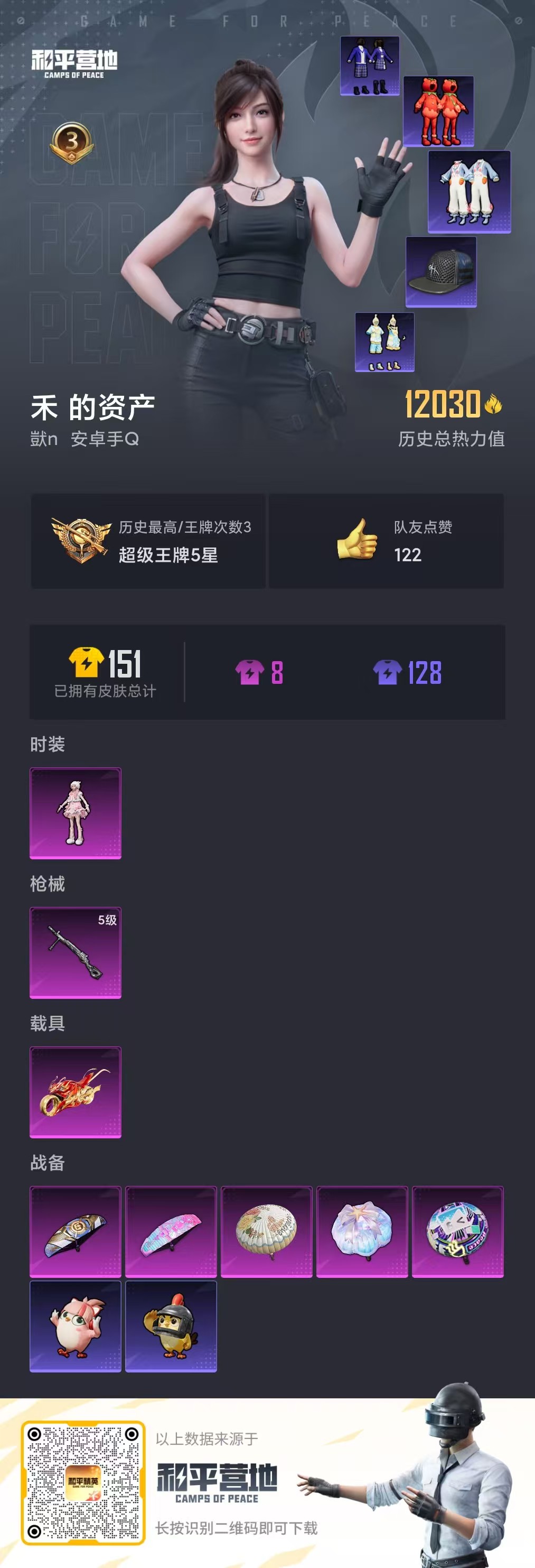 【和平精英】【txhp5802】1粉装,1特效呛,1载具,历史最高段位:超级王牌5星 王牌印记3次 热力值:12030,24套装,35呛械,53装备,27战备;套装:角色-羊梦糖心,套装-特训学院,套装-蓝彩潮人,套装-魅力单车,套装-淡雅花蕊,套装-玲珑飞花,套装-白糯汤圆,套装-兔兔白日梦,套装-红熊茄茄,套装-莱茵河畔,套装-王牌教练,角色-都市丽猫,套装-ss33特训,套装-云朵鹅,套装-彩虹兔,套装-雪绒豹,套装-ss34特训,套装-朱霞炽焰,套装-游乐,套装-凌霄紫焰,套装-薄荷星砂,套装-ss35特训,套装-ss36特训,套装-萌鸡速递;呛皮:famas-乌木金纹,arx-凌霄紫焰,groza-春暖花开,akm-春暖花开,aug-冰晶雪宝,m762-云朵鹅,amr-喜羊羊与灰太狼,svd-云朵鹅,win94-乌木金纹,mk14-薄荷星砂,mk20-h-狂鲨锋刃,mk12-乌木金纹,mini14-春暖花开,uzi-炫彩糖果,ump45-春暖花开,js9-凌霄紫焰,汤姆逊-灵猫魔法师,aks-74u-乌木金纹,s686-千金淑猫,s686-时光之誓,s12k-冰川粉黛,spas-12-狂鲨锋刃,spas-12-云朵鹅,s1897-春暖花开,5级dp-28-豹影疾电,m249-糯团青竹,mg-36-凌霄紫焰,沙墨之鹦-云朵鹅,p92-凌霄紫焰,平底锅-凌霄紫焰,大砍刀-云朵鹅,破片手留单-爆破雪人,十子怒-异域银装,盐雾蛋-冰氧夏日,铝热弹-炫彩糖果;载具:踏焰逐风摩托车;降落伞:甜茶絮语飞行器; 详情看图3王牌印记-1.2w热力值 羊梦糖心-番茄-兔鞋 踏焰逐风