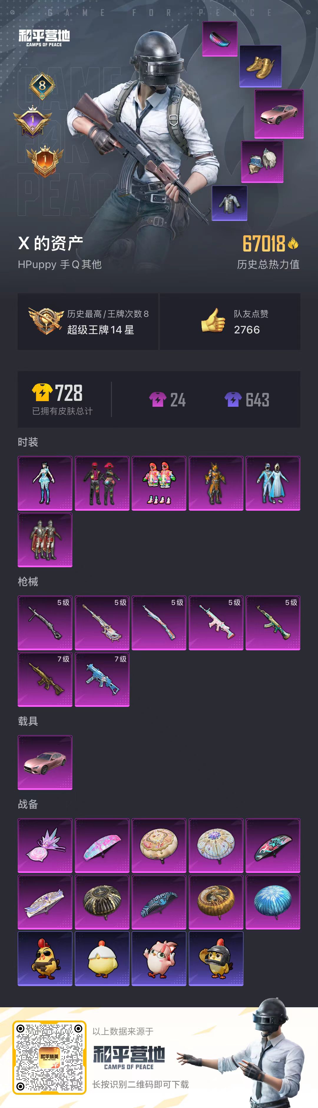 【和平精英】【txhp5863】6粉装,7特效呛,1载具,历史最高段位:超级王牌14星 王牌印记8次 热力值:67018,184套装,200呛械,200装备,112战备;套装:套装-土曜战麒,套装-雪国幻梦,套装-守护骑士,套装-放客神游,套装-炫光之旅,角色-异瞳寒姬,套装-特训学院,套装-猎鹰,套装-青年教官,套装-红色运动,套装-黄色运动,套装-蓝色运动,套装-黄色伏地魔,套装-白色伏地魔,套装-黑色伏地魔,套装-骑行爱好者,套装-登山爱好者,套装-竞技名士,套装-深蓝色名流,套装-酒红色名流,套装-湖蓝色名流,套装-黄色名流,套装-猛禽,套装-游猎者,套装-长空猛禽,套装-漫步者,套装-竞技勇士朋克,套装-蓝色守护者,套装-雨林探路者,套装-旭日情侣,套装-破晓情侣,套装-冷焰舞者,套装-灼焰舞者,套装-浪漫天命,套装-特战装甲,套装-战地菁英,套装-贵族骑装,套装-战地督导,套装-甜蜜告白,套装-战地名士,套装-迎春赐吉,套装-春日漫步,套装-龙腾端午,套装-燃烧卡路里,套装-滨海假日,套装-完美偶像,套装-人气偶像,套装-幻影武者,套装-海滨突袭者,套装-蓝彩潮人,套装-千禧之恋,套装-怒火燎原,套装-决胜时刻,套装-魅力单车,套装-绮丽涂鸦,套装-耀眼新星,套装-雪山征服者,套装-坚韧舞者,套装-竞技达人朋克,套装-夜莺强袭者,套装-野性战心,套装-野性战魂,套装-破晓战魂,套装-都市魅力,套装-热血青春,套装-沙漠兵团,套装-派对舞王,套装-丛林猎人,套装-ss2特训,套装-火舞潮人,套装-派对绅士,套装-雪山精英,套装-传奇侦探,套装-极地朋克,套装-幻世战舞者,套装-半糖蓝莓,套装-奇异狩猎者,套装-金耀舞者,套装-精密机核,套装-恒星战甲,套装-夏日倾情,套装-青涩时光,套装-缤纷果语,套装-alan walker,套装-特种空勤,套装-和平特警,套装-风暴特警,套装-冰川特警,套装-雷霆特警,套装-元素星魂,套装-极速红龙,套装-格斗先锋,套装-太极红客,套装-ss3特训,套装-ss4特训,套装-粉红小猪,套装-破蛋小黄鸡,套装-疯狂小兔子,套装-ss5特训,套装-圣诞大吉,套装-熔岩使者,套装-凛冬战士,套装-好奇恐龙,套装-浪漫波比,套装-维京奇缘,套装-金鼠迎春,套装-北国孤狼,套装-ss6特训,套装-拳皇97八神庵,套装-炽焰拳师,套装-格斗专家,套装-淡雅花蕊,套装-玲珑飞花,套装-跃动心情,套装-ss7特训,套装-核芯基因,套装-精神漫游,套装-鹤鸣,套装-ss10特训,套装-ss8特训,套装-ss9特训,套装-牛气满满,套装-白糯汤圆,套装-ss11特训,套装-战术大师,套装-ss12特训,套装-ss18特训,套装-耀粉歌者,套装-飞行日记,套装-ss13特训,套装-ss14特训,套装-ss17特训,套装-福星高照,套装-空投萌叽,套装-ss19特训,套装-炫蓝之夏,套装-ss20特训,套装-ss21特训,套装-玉兔迎春,套装-ss22特训,套装-绯格组合,套装-ss23特训,套装-神气柴柴,套装-懵萌河马,套装-妙红点点,套装-幻彩翩翩,套装-王牌教练,套装-柠萌假日,套装-ss24特训,套装-涂山之恋,套装-ss25特训,套装-惊鸿侠骨,套装-锦衣飞扬,套装-沙丘之歌,套装-西部谜踪,套装-果汁能量,套装-龙的传人,套装-ss26特训,玩偶服-超人强,套装-恋语绒绒,套装-街头风暴,套装-ss29特训,套装-异域银装,套装-ss30特训,套装-ss31特训,套装-鱼渊荷华,套装-燕燕于飞,套装-紫幽梦,套装-ss33特训,套装-ss32特训,套装-蓝冰羽,套装-狂鲨锋刃,套装-大橘大利,套装-炫彩糖果,套装-ss34特训,套装-朱霞炽焰,套装-游乐,套装-凌霄紫焰,套装-薄荷星砂,套装-ss35特训,套装-粉黛兰香,套装-ss36特训,套装-雪国风尚,套装-萌鸡速递;呛皮:groza-生命誓言,groza-雷霆特警,groza-银河战甲,groza-春暖花开,groza-黑色刀锋,groza-懵萌河马,groza-2b战斗服款,groza-无面战甲,groza-乌木金纹,5级akm-绿萝繁花,akm-生命誓言,akm-破晓战魂,akm-夜灯,akm-霓彩脉冲,akm-乌木金纹,aug-甜蜜菠萝,aug-耀粉歌者,aug-异域银装,aug-冰晶雪宝,aug-乌木金纹,7级m416-五爪金龙,m416-蓝色火焰,m416-红色方程式,m416-糯团青竹,m416-乌木金纹,m762-生命誓言,m762-折纸暴龙,m762-拳皇97,m762-彩虹符号,m762-天降萌叽,m762-乌木金纹,5级scar-l-锦绣绵绵,scar-l-生命誓言,scar-l-黄金龙骨,scar-l-雷霆特警,scar-l-银河战甲,scar-l-炫彩节奏,scar-l-玉兔迎春,scar-l-星途旅人,scar-l-乌木金纹,famas-霓彩脉冲,famas-乌木金纹,g36c-雪国精灵,g36c-懵萌河马,g36c-乌木金纹,q-银河战甲,q-彩虹符号,q-乌木金纹,mk47-百万伏特,mk47-乌木金纹,mk47-妙红点点,m16a4-蓝色火焰,m16a4-生命誓言,m16a4-红色方程式,ac-val-乌木金纹,ac-val-天降萌叽,ac-val-闲梦青缨,蜜獾-天降萌叽,蜜獾-乌木金纹,arx-凌霄紫焰,5级kar98k-巳巳如意,kar98k-红色方程式,kar98k-王子的夏天,kar98k-彩虹符号,kar98k-炫彩节奏,kar98k-2b战斗服款,kar98k-乌木金纹,5级amr-智耀战神,amr-妙红点点,amr-乌木金纹,awm-荒野猎神,awm-乌木金纹,m200-绿野极光,m200-惊鸿侠骨,m200-乌木金纹,m24-冰封烈焰,m24-乌木金纹,win94-乌木金纹,莫辛纳甘-乌木金纹,莫辛纳甘-懵萌河马,sks-夜灯,sks-乌木金纹,mini14-生命誓言,mini14-穿刺龙虾,mini14-银河战甲,mini14-金鼠迎春,mini14-梦幻火箭,mini14-乌木金纹,vss-雷霆特警,vss-荒野猎神,vss-华贵君王,vss-黑色刀锋,vss-绿野极光,vss-乌木金纹,mk12-金蛇镇世,mk12-乌木金纹,m417-惊鸿侠骨,m417-玩趣呆呆,mk14-乌木金纹,mk14-紫幽梦,mk14-紫晶流影,mk20-h-狂鲨锋刃,mk20-h-乌木金纹,slr-霓彩脉冲,mp5k-飒粉甜心,7级ump45-雪国精灵,ump45-夜灯,ump45-生命誓言,ump45-天启纪元,ump45-海盐豹豹,野牛-燕燕于飞,野牛-乌木金纹,汤姆逊-耀粉歌者,汤姆逊-暗夜鎏金,汤姆逊-天降萌叽,汤姆逊-