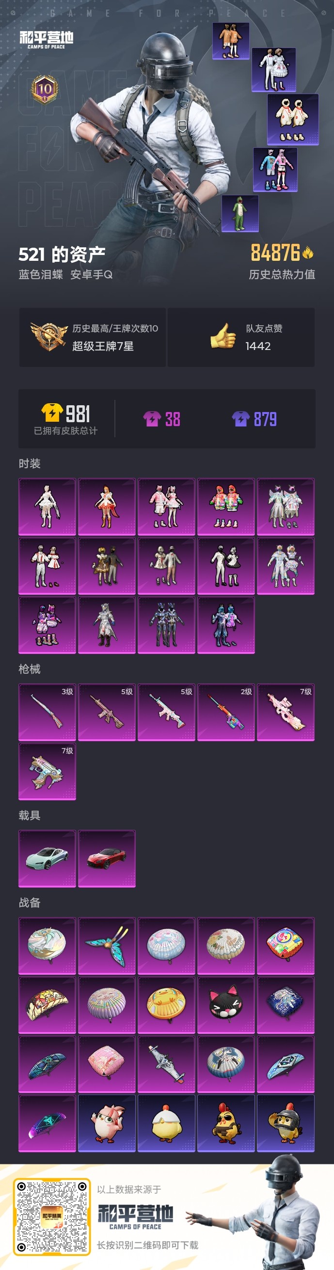 【和平精英】【txhp5815】14粉装,6特效呛,2载具,历史最高段位:超级王牌7星 王牌印记10次 热力值:84876,229套装,252呛械,298装备,167战备;套装:套装-甜心巧克力,套装-宝贝奶油派,套装-深海曼妙,套装-银刃赛罗,套装-彩虹鹿灵,套装-山涧鹿灵,套装-苍蓝魅影,套装-蓝莓炮弹,套装-彩虹甜喵,套装-冰川幽秘,套装-冰川红玫,套装-炫光之旅,角色-小蓝,角色-千金淑猫,套装-特训学院,套装-猎鹰,套装-青年教官,套装-橘黑制服,套装-红色运动,套装-黄色运动,套装-蓝色运动,套装-黄色伏地魔,套装-白色伏地魔,套装-黑色伏地魔,套装-骑行爱好者,套装-登山爱好者,套装-冰川格斗者,套装-壁垒格斗者,套装-深海格斗者,套装-竞技名士,套装-深蓝色名流,套装-酒红色名流,套装-湖蓝色名流,套装-黄色名流,套装-猛禽,套装-棕色飞行服,套装-游猎者,套装-长空猛禽,套装-竞技勇士朋克,套装-冷焰舞者,套装-灼焰舞者,套装-刚毅裁决者,套装-浪漫天命,套装-特战装甲,套装-战地菁英,套装-战地督导,套装-黄色格斗者,套装-灰色格斗者,套装-甜蜜告白,套装-迎春赐吉,套装-春日漫步,套装-潮流先锋,套装-龙腾端午,套装-燃烧卡路里,套装-滨海假日,套装-完美偶像,套装-人气偶像,套装-幻影武者,套装-海滨突袭者,套装-街头潮人,套装-蓝彩潮人,套装-千禧之恋,套装-神秘领域,套装-怒火燎原,套装-决胜时刻,套装-魅力单车,套装-绮丽涂鸦,套装-坚韧舞者,套装-竞技达人朋克,套装-夜莺强袭者,套装-野性战心,套装-野性战魂,套装-破晓战魂,套装-都市魅力,套装-沙漠兵团,套装-丛林猎人,套装-ss2特训,套装-雪山精英,套装-酷潮明星,套装-传奇侦探,套装-极地朋克,套装-摩艾涂鸦,套装-幻世战舞者,套装-奇趣章鱼,套装-金耀舞者,套装-血色贵族,套装-甜蜜熊情侣,套装-青涩时光,套装-缤纷果语,套装-滨海厨神,套装-冰川特警,套装-极速红龙,套装-格斗先锋,套装-海上生明月,套装-麻辣教官,套装-ss3特训,套装-初雨海棠,套装-ss4特训,套装-粉红小猪,套装-破蛋小黄鸡,套装-疯狂小兔子,套装-深蓝冒险家,套装-迷域探索者,套装-阳光火鸡,套装-ss5特训,套装-圣诞大吉,套装-好奇恐龙,套装-金鼠迎春,套装-军械专家,套装-北国孤狼,套装-ss6特训,套装-拳皇97草薙京,套装-炽焰拳师,套装-格斗专家,套装-淡雅花蕊,套装-玲珑飞花,套装-跃动心情,套装-ss7特训,套装-闪耀星光,套装-霓虹街区,套装-纯白誓言,套装-激萌罗小黑,套装-ss10特训,套装-ss8特训,套装-众神之王,套装-智慧之神,套装-大橘为重,套装-萌黄之夏,套装-隐空刺,套装-影双刃,套装-夏日音浪,套装-ss9特训,套装-风华少年志,套装-探宝勇士,套装-牛气满满,套装-白糯汤圆,套装-青春冒险家,套装-潮流游乐家,套装-玄武圣者,套装-诡谋托雷基亚,套装-骁骑迪迦,套装-原初圣火,套装-逆风勇士,套装-静谧青瓷,套装-娴静芝兰,套装-萌趣颜团子,套装-特种颜团子,套装-战术大师,套装-ss12特训,套装-牛气冲天,套装-ss18特训,套装-镭射皇者,套装-银白舞王,套装-耀粉歌者,套装-暗影爵士,套装-迅捷之星,套装-治愈之星,套装-科技之星,套装-ss13特训,套装-梦起落英,套装-星河入梦,套装-冰爽海盐,套装-ss14特训,套装-吉莉礼服,套装-快乐星愿,套装-星梦畅游,套装-鹤发童颜,套装-ss15特训,套装-ss16特训,套装-暴风机械师,套装-时空追击者,套装-ss17特训,套装-瑞龙福将,套装-团圆交子,套装-冰川谧蓝,套装-冰爽风暴,套装-福星高照,套装-虎虎生威吉莉,套装-缤纷焰火,套装-异彩先驱,套装-霓虹极客,套装-空投萌叽,套装-ss19特训,套装-飞驰魅影,套装-音速流光,套装-炫蓝之夏,套装-ss20特训,套装-恶魔喵喵,套装-猎梦纪元,套装-甜心亚梦,套装-虚音幻奏,套装-ss21特训,套装-俏皮奶喵,套装-玉兔迎春,套装-ss22特训,套装-田园牧歌,套装-轻风白浪,套装-光之冒险,套装-绯格组合,套装-青玉碎影,套装-ss24特训,套装-青芒树下,套装-龟仙人,套装-涂山之恋,套装-ss25特训,套装-惊鸿侠骨,套装-锦衣飞扬,套装-绝对偶像,套装-深海梦境,套装-果汁能量,套装-龙的传人,套装-ss26特训,套装-快闪甜心,套装-春光漫游,套装-空岛之星,套装-ss27特训,套装-ss28特训,玩偶服-卖崽青蛙,角色-迎夏光舞,套装-海盐绵绵冰,角色-蜜桃派对,套装-ss31特训,套装-鱼渊荷华,套装-晶辉守护,玩偶服-小狗蛇点点,套装-巳巳如意,套装-ss32特训,角色-幽澜祭司,套装-ss36特训;呛皮:akm-灼热熔岩,akm-生命誓言,akm-奇异狩猎者,akm-破晓战魂,akm-春暖花开,akm-霓虹街区,akm-夜灯,akm-彩虹符号,akm-萌趣颜团子,akm-虎虎生威,akm-王牌投手,akm-龙的传人,akm-乌木金纹,g36c-不夜海上花,g36c-时空追击者,g36c-乌木金纹,aug-诡面斩,aug-耀粉歌者,aug-青春冒险家,aug-乌木金纹,groza-生命誓言,groza-春暖花开,groza-治愈之星,groza-林间仙鹿,groza-彩虹符号,groza-异彩先驱,groza-田园牧歌,groza-乌木金纹,ac-val-甜心亚梦,ac-val-乌木金纹,ac-val-彩虹甜喵,ac-val-天降萌叽,ac-val-快闪甜心,m762-快乐主宰,m762-生命誓言,m762-拳皇97,m762-牛气冲天,m762-镭射皇者,m762-瑞龙福将,m762-乌木金纹,q-神秘黑猫,q-原初圣火,q-赛罗,q-彩虹符号,q-飞驰魅影,q-乌木金纹,5级m416-心之恋语,m416-夜灯,m416-蓝色火焰,m416-红色方程式,m416-糯团青竹,m416-乌木金纹,mk47-林间仙鹿,mk47-青春冒险家,mk47-乌木金纹,mk47-炫光之旅,m16a4-蓝色火焰,m16a4-红色方程式,m16a4-甜心亚梦,m16a4-幻世战舞者,m16a4-乌木金纹,5级scar-l-锦绣绵绵,scar-l-生命誓言,scar-l-红色方程式,scar-l-甜蜜誓约,scar-