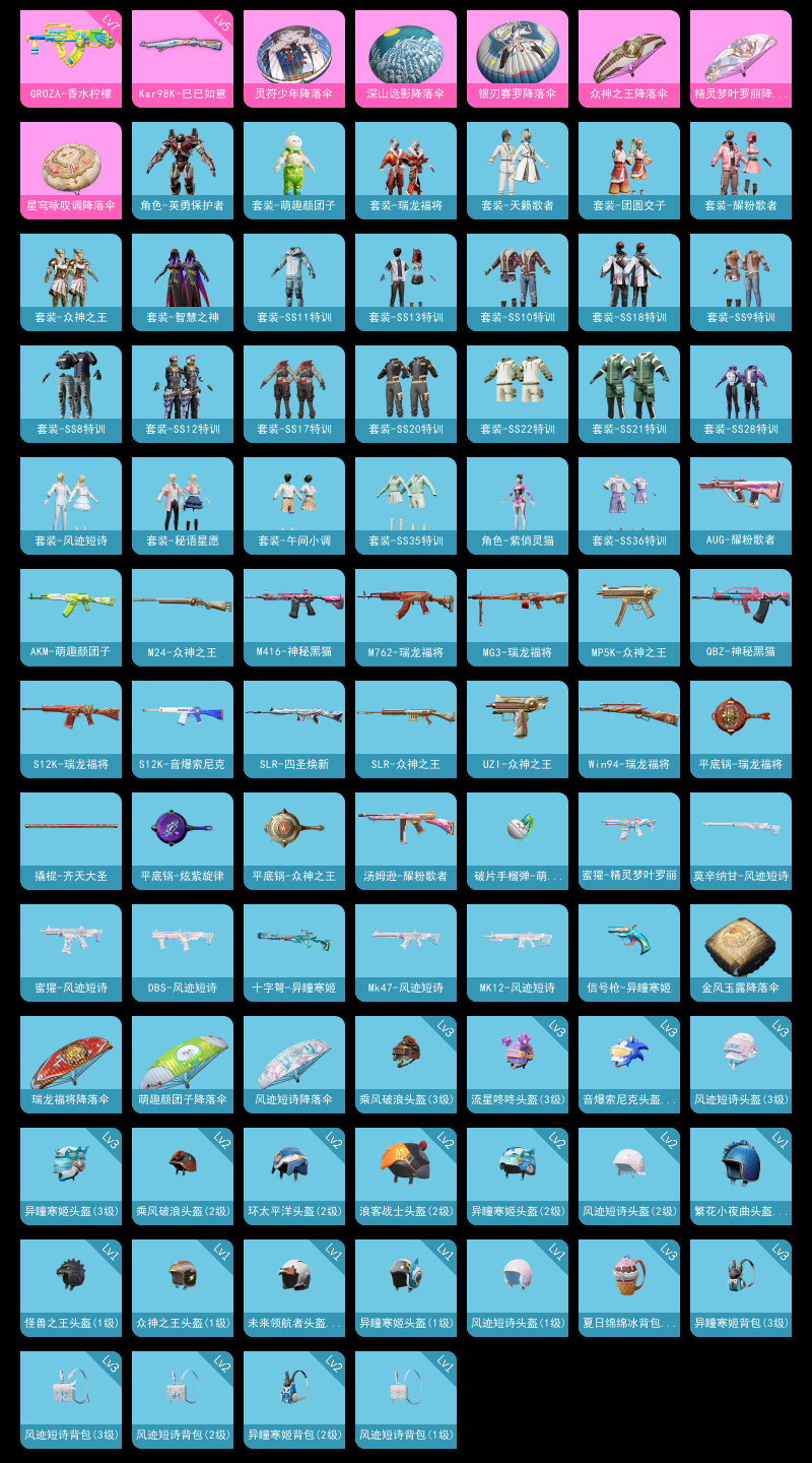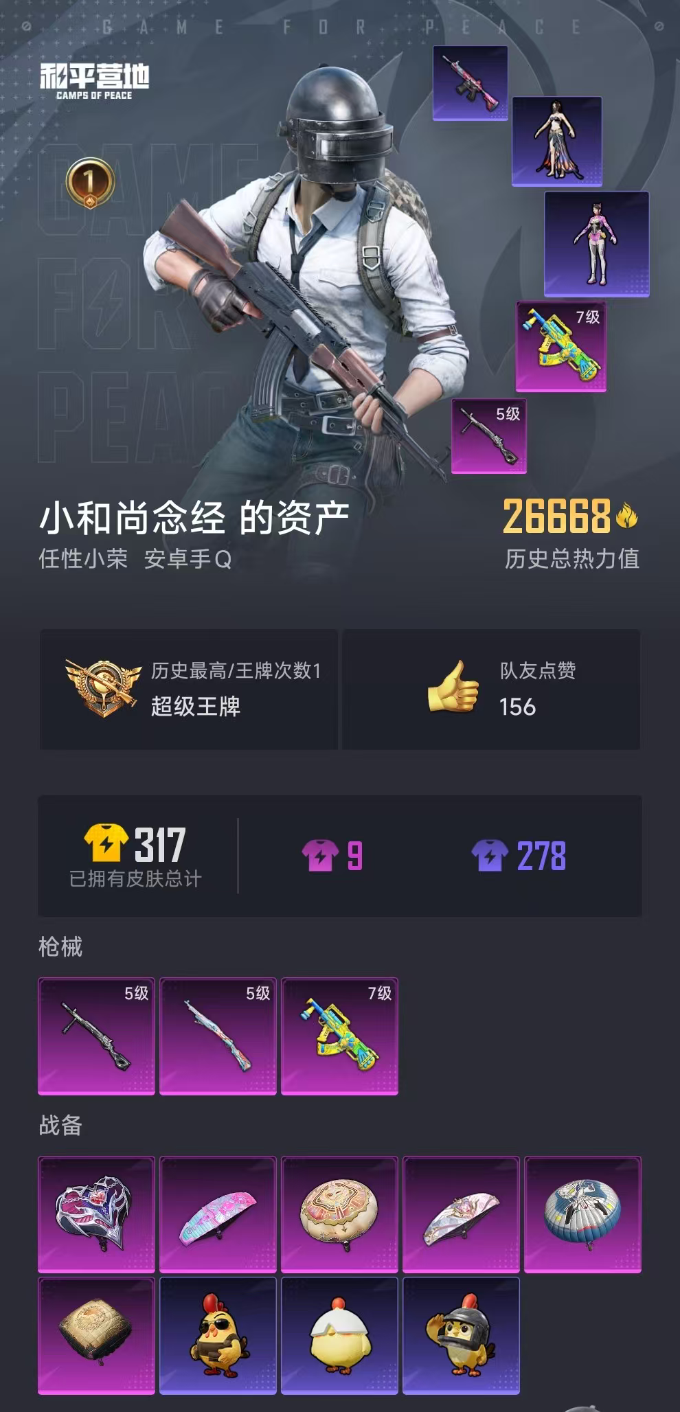 【和平精英】【lyhp20054】0粉装,3特效呛,0载具,历史最高段位:超级王牌 王牌印记1次 热力值:26668,57套装,95呛械,108装备,43战备;套装:套装-黄色伏地魔,套装-白色伏地魔,套装-黑色伏地魔,套装-骑行爱好者,套装-竞技名士,套装-长空猛禽,套装-特战装甲,套装-潮流先锋,套装-怒火燎原,套装-魅力单车,套装-风行保卫者,套装-幻世战舞者,套装-格斗先锋,套装-麻辣教官,套装-疯狂小兔子,套装-ss10特训,套装-ss8特训,套装-众神之王,套装-智慧之神,套装-夏日音浪,套装-ss9特训,套装-探宝勇士,套装-牛气满满,套装-ss11特训,套装-萌趣颜团子,套装-战术大师,套装-ss12特训,套装-牛气冲天,套装-ss18特训,套装-耀粉歌者,套装-飞行日记,套装-ss13特训,套装-天籁歌者,角色-迪迦奥特曼,角色-英勇保护者,套装-ss17特训,套装-瑞龙福将,套装-团圆交子,套装-福星高照,套装-虎虎生威吉莉,套装-ss20特训,套装-ss21特训,套装-ss22特训,套装-ss28特训,套装-街头风暴,套装-海盐绵绵冰,角色-紫俏灵猫,套装-ss31特训,角色-风玲,套装-ss34特训,套装-ss35特训,套装-午间小调,套装-秘语星愿,套装-风迹短诗,套装-粉黛兰香,套装-ss36特训,套装-萌鸡速递;呛皮:m16a4-夜灯,m16a4-幻世战舞者,scar-l-炫彩节奏,scar-l-海盐豹豹,scar-l-乌木金纹,m416-夜灯,m416-神秘黑猫,m416-乌木金纹,m762-牛气冲天,m762-瑞龙福将,m762-乌木金纹,蜜獾-天降萌叽,蜜獾-精灵梦叶罗丽,蜜獾-风迹短诗,7级groza-香水柠檬,groza-生命誓言,groza-海盐豹豹,groza-乌木金纹,famas-霓彩脉冲,mk47-乌木金纹,mk47-风迹短诗,q-神秘黑猫,q-彩虹符号,q-乌木金纹,aug-耀粉歌者,ac-val-天降萌叽,ace32-冰晶雪宝,akm-破晓战魂,akm-萌趣颜团子,akm-虎虎生威,akm-霓彩脉冲,g36c-乌木金纹,m24-众神之王,m24-炫彩节奏,win94-瑞龙福将,win94-乌木金纹,5级kar98k-巳巳如意,kar98k-红色方程式,kar98k-王子的夏天,kar98k-乌木金纹,莫辛纳甘-风迹短诗,awm-乌木金纹,m200-乌木金纹,mk20-h-狂鲨锋刃,mk14-乌木金纹,mk14-紫晶流影,slr-众神之王,slr-四圣焕新,slr-霓彩脉冲,mk12-风迹短诗,vss-乌木金纹,mini14-金鼠迎春,mini14-香桃花海,sks-夜灯,sks-炫彩节奏,汤姆逊-耀粉歌者,汤姆逊-乌木金纹,p90-巳巳如意,野牛-乌木金纹,uzi-红色方程式,uzi-众神之王,uzi-逆行者qq,uzi-炫彩节奏,uzi-天降萌叽,vect-生命誓言,vect-彩虹符号,aks-74u-乌木金纹,mp5k-众神之王,s12k-夜灯,s12k-瑞龙福将,s12k-幻世战舞者,s12k-音爆索尼克,dbs-风迹短诗,dbs-乌木金纹,s686-生命誓言,s686-巳巳如意,5级dp-28-豹影疾电,dp-28-彩虹符号,dp-28-乌木金纹,pkm-啾咪啾咪,mg3-瑞龙福将,mg3-幻世战舞者,mg-36-薄荷星砂,m249-破晓战魂,m249-彩虹符号,信号呛-异瞳寒姬,平底锅-众神之王,平底锅-炫紫旋律,平底锅-瑞龙福将,撬棍-齐天大圣,撬棍-幻世战舞者,破片手留单-萌趣颜团子,破片手留单-星途旅人,破片手留单-拽到爆炸,十子怒-异瞳寒姬;降落伞:粉色滑翔尾迹,顶峰精英尾迹,鸡智如我飞行器; 详情看图可二次实名 地铁满天赋 3特效呛 满级香水柠檬狗砸