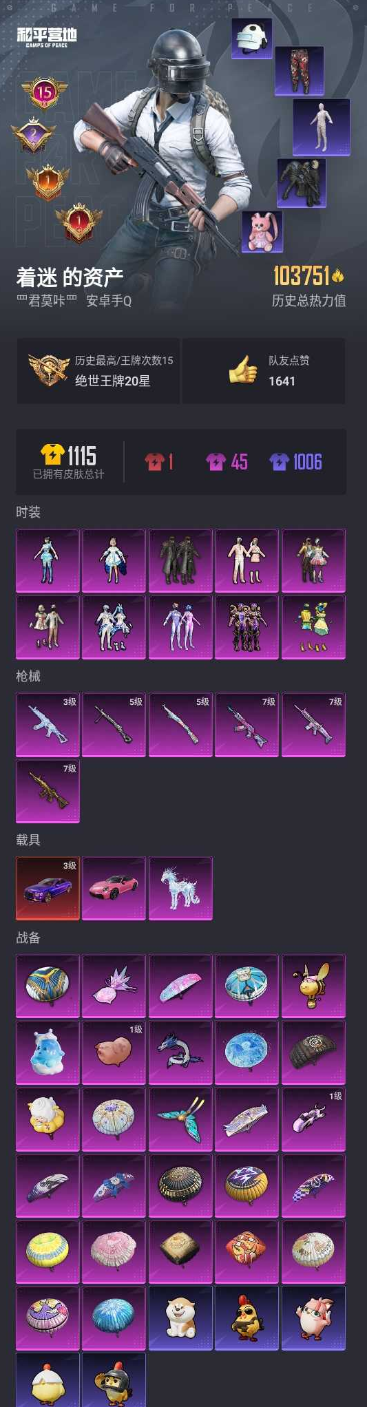 【和平精英】【lyhp20373】10粉装,6特效呛,3载具,历史最高段位:绝世王牌20星 王牌印记15次 热力值:103751,235套装,289呛械,378装备,176战备;套装:套装-未来战士,套装-宝贝奶油派,套装-梦幻火箭,套装-蝶舞迷情,套装-香水柠檬,角色-洛天依,套装-暗星紫秘,套装-第五大道,套装-未来歌姬,角色-异瞳寒姬,套装-特训学院,套装-黄色运动,套装-白色伏地魔,套装-黑色伏地魔,套装-骑行爱好者,套装-竞技名士,套装-湖蓝色名流,套装-黄色名流,套装-边境牛仔,套装-棕色飞行服,套装-长空猛禽,套装-沙漠雄狮,套装-漫步者,套装-竞技勇士朋克,套装-蓝色守护者,套装-西部风情,套装-旭日情侣,套装-六六大吉,套装-赤蝎幽灵,套装-冷焰舞者,套装-都市猎人,套装-刚毅裁决者,套装-西部牛仔,套装-浪漫天命,套装-特战装甲,套装-浪漫假日,套装-街舞达人,套装-灰色格斗者,套装-活力之心,套装-滨海假日,套装-沙漠毒蛇,套装-鹰眼刺客,套装-冰冻风暴,套装-冷酷挑战者,套装-幻影武者,套装-热血骑手,套装-摇滚舞王,套装-特战英豪,套装-蓝彩潮人,套装-怒火燎原,套装-绮丽涂鸦,套装-耀眼新星,套装-狂战萌兔,套装-坚韧舞者,套装-野性战心,套装-金羽特工,套装-狂沙舞者,套装-酷熊伴侣,套装-荣耀,套装-沙漠兵团,套装-丛林猎人,套装-雪山精英,套装-酷潮明星,套装-传奇侦探,套装-极地朋克,套装-幻世战舞者,套装-奇趣章鱼,套装-馥郁哈密,套装-奇异狩猎者,套装-金耀舞者,套装-暗影哥特,套装-弄潮海豚,套装-迅捷狂鲨,套装-呆萌铁蟹,套装-深海小丑鱼,套装-甜蜜熊情侣,套装-缤纷果语,套装-alan walker,套装-冰川特警,套装-青涩年华,套装-胖达团团,套装-胖达圆圆,套装-忍者信条,套装-极速红龙,套装-格斗先锋,套装-海上生明月,套装-麻辣教官,套装-沙暴袭击者,套装-小丑鱼,套装-东方飞龙,套装-冥河战士,套装-恶魔宝贝,套装-破蛋小黄鸡,套装-疯狂小兔子,套装-舞夜骑士,套装-深蓝冒险家,套装-迷域探索者,套装-ss5特训,套装-圣诞大吉,套装-好奇恐龙,套装-浪漫波比,套装-金鼠迎春,套装-军械专家,套装-北国孤狼,套装-ss6特训,套装-拳皇97八神庵,套装-炽焰拳师,套装-格斗专家,套装-奇迹天团,套装-云纹魔法士,套装-淡雅花蕊,套装-玲珑飞花,套装-跃动心情,套装-ss7特训,套装-核芯基因,套装-鹤鸣,套装-霓虹街区,套装-暗夜契约,套装-激萌罗小黑,套装-ss8特训,套装-白熊同盟,套装-萌黄之夏,套装-超能拳王,套装-夏日音浪,套装-顽皮玉兔,套装-探宝勇士,套装-牛气满满,套装-韶华初心,套装-青春冒险家,套装-潮流游乐家,套装-萌趣颜团子,套装-特种颜团子,套装-战术大师,套装-ss12特训,套装-牛气冲天,套装-ss18特训,套装-耀粉歌者,套装-迅捷之星,套装-治愈之星,套装-科技之星,套装-飞行日记,套装-ss13特训,套装-浪漫樱花,套装-ss14特训,套装-天籁歌者,套装-吉莉礼服,套装-ss15特训,套装-ss16特训,套装-ss17特训,套装-瑞龙福将,套装-团圆交子,套装-福星高照,套装-遗落祭司,套装-豚鼠丹丹,套装-虎虎生威吉莉,套装-异彩先驱,套装-霓虹极客,套装-空投萌叽,套装-ss19特训,套装-飞驰魅影,套装-音速流光,套装-ss20特训,套装-猎梦纪元,套装-甜心亚梦,套装-虚音幻奏,套装-ss21特训,套装-萌趣咩咩,套装-娇憨猪猪,套装-梦幻奶油,套装-玉兔迎春,套装-ss22特训,套装-和煦暖阳,套装-田园牧歌,套装-轻风白浪,套装-光之冒险,套装-绯格组合,套装-ss23特训,套装-神气柴柴,套装-懵萌河马,套装-柠萌假日,套装-青玉碎影,套装-ss24特训,套装-荧惑魅影,套装-龟仙人,套装-涂山之恋,套装-ss25特训,套装-惊鸿侠骨,套装-锦衣飞扬,套装-龙的传人,套装-ss26特训,套装-快闪甜心,套装-春光漫游,套装-漫游都市,套装-空岛之星,套装-明鸳圣池,套装-贝斯之夜,套装-焰鹰斗篷,套装-幻羽潜行,套装-ss27特训,套装-恋语绒绒,套装-老实芭蕉,套装-街头风暴,套装-湖畔霞光,角色-绯色魅影,角色-紫俏灵猫,套装-异域银装,套装-星途旅人,套装-ss30特训,套装-ss31特训,套装-智谋强哥,角色-瑰梦爱神,角色-猎影月神,套装-巳巳如意,套装-ss32特训,套装-青翼流星,套装-狂鲨锋刃,套装-大橘大利,套装-炫彩糖果,玩偶服-喜羊羊,套装-元气之梦,套装-ss34特训,套装-擎苍青焰,套装-朱霞炽焰,套装-凌霄紫焰,套装-薄荷星砂,套装-ss35特训,套装-午间小调,套装-秘语星愿,套装-风迹短诗,套装-琴音绮想,套装-粉黛兰香,套装-画境星梦,套装-ss36特训,套装-雪国风尚,套装-萌鸡速递;呛皮:ac-val-甜心亚梦,ac-val-乌木金纹,ac-val-彩虹甜喵,ac-val-天降萌叽,ac-val-快闪甜心,7级scar-l-梦幻火箭,scar-l-未来战士,scar-l-炫彩节奏,scar-l-彩虹符号,scar-l-玉兔迎春,scar-l-乌木金纹,q-神秘黑猫,q-彩虹符号,q-飞驰魅影,7级akm-炫紫旋律,akm-灼热熔岩,akm-生命誓言,akm-影袭,akm-冰凉西瓜,akm-奇异狩猎者,akm-缤纷海域,akm-星之信仰,akm-春暖花开,akm-霓虹街区,akm-夜灯,akm-四圣焕新,akm-涂鸦街区,akm-彩虹符号,akm-萌趣颜团子,akm-虎虎生威,akm-龙的传人,akm-霓彩脉冲,akm-乌木金纹,mk47-青春冒险家,mk47-乌木金纹,mk47-风迹短诗,m762-奇异狩猎者,m762-甜心宝贝,m762-拳皇97,m762-深海曼妙,m762-牛气冲天,m762-瑞龙福将,m762-彩虹符号,m762-第五大道,m762-天降萌叽,aug-幻影战神,aug-耀粉歌者,aug-青春冒险家,aug-天降萌叽,aug-异域银装,aug-乌木金纹,7级m416-五爪金龙,m416-绯红前夜,m416-红色方程式,m416-仓鼠灰灰,m416-滑板小狐,m416-糯团青竹,m416-乌木金纹,g36c-金风玉露,g36c-懵萌河马,g36c-乌木金纹
