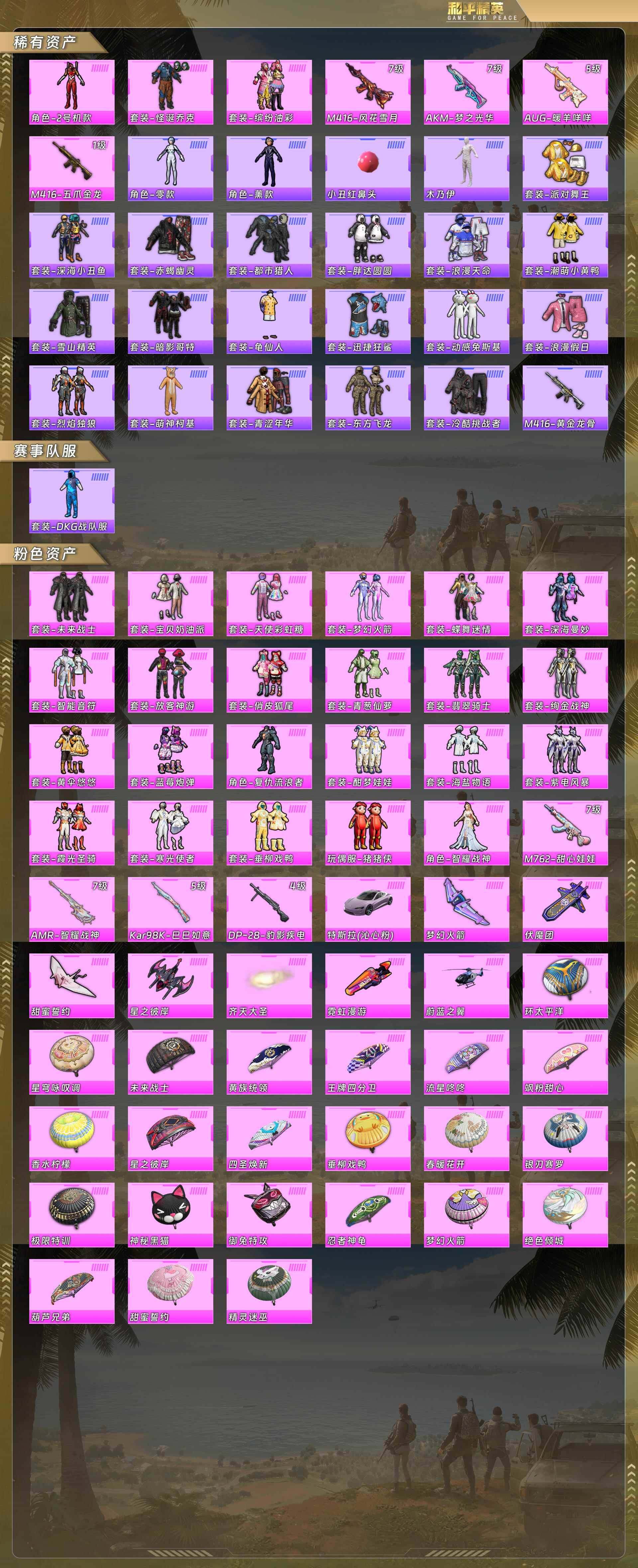 身法号-木乃伊/红螳螂/怪诞乔克/男神三件套/粉熊背包/国宝头盔/猪妹/小丑鼻/深海小丑鱼/浪漫天命/红眼罩/发光眼罩/东方飞龙/冷酷挑战者/dkg战队服/未来战士/宝贝奶油派/天使彩虹糖/梦幻火箭/蝶舞迷情/绚金战神/m416-风花雪月[7级]/akm梦之光华/aug-暖羊咩咩/m416-五爪金龙]/m762-甜心娃娃/amr-智耀战神/特斯拉/没战神框 hp5166战士,套装-派对舞王,套装-深海小丑鱼,套装-胖达圆圆,套装-金羽特工,套装-动感兔斯基人偶服,套装-龟仙人,套装-潮萌小黄鸭,套装-暗影哥特 【粉色套装】:粉装-深海曼妙,粉装-未来战士,粉装-怪诞乔克,粉装-宝贝奶油派,粉装-天使彩虹糖,粉装-蝶舞迷情,粉装-梦幻火箭,粉装-智能音符,粉装-缤纷油彩,粉装-放客神游,粉装-俏皮狐尾,粉装-翡翠骑士,粉装-绚金战神,粉装-黄伞悠悠,角色-2号机款机体服,粉装-蓝莓炮弹,粉装-青葱仙萝,粉装-酣梦娃娃,粉装-海盐物语,粉装-紫电风暴,角色-复仇流浪者,粉装-垂柳戏鸭,粉装-霞光圣骑,粉装-寒光使者,玩偶服-猪猪侠,角色-智耀战神 【粉色呛皮等级】:akm-梦之光华七级,m416-五爪金龙一级,m416-风花雪月七级,aug-暖羊咩咩五级,m762-甜心娃娃七级,kar98k-巳巳如意五级,amr-智耀战神七级,dp-28-豹影疾电四级 【粉色载具】:特斯拉roadster(沁心粉),空客h135-蔚蓝之翼 【粉色呛皮】:akm-梦之光华,m416-五爪金龙,m416-风花雪月,aug-暖羊咩咩,m762-甜心娃娃,kar98k-巳巳如意,amr-智耀战神,dp-28-豹影疾电 【粉色飞行器】:梦幻火箭飞行器,伏魔团飞行器,甜蜜誓约飞行器,星之彼岸飞行器,齐天大圣飞行器,霓虹漫游飞行器 【粉色降落伞】:极限特训降落伞,未来战士降落伞,春暖花开降落伞,精灵迷巫降落伞,梦幻火箭降落伞,神秘黑猫降落伞,甜蜜誓约降落伞,四圣焕新降落伞,银刃赛罗降落伞,香水柠檬降落伞,王牌四分卫降落伞,星之彼岸降落伞,葫芦兄弟降落伞,流星咚咚降落伞,环太平洋降落伞,垂柳戏鸭降落伞,飒粉甜心降落伞,黄族统领降落伞,绝色倾城降落伞,忍者神龟降落伞,星穹咏叹调降落伞,御兔特攻降落伞 【稀有套装】:套装-龟仙人,套装-燕燕于飞,套装-鱼渊荷华,角色-糖霜甜心,套装-烈焰独狼,套装-粉恋花,套装-紫幽梦,套装-蓝冰羽,套装-星渊小夜曲 【稀有呛皮】:akm-夜灯,akm-彩虹符号,akm-影袭,akm-春暖花开,akm-生命誓言,akm-萌趣颜团子,akm-虎虎生威,akm-霓虹街区,akm-龙的传人,akm-棋盘冕主,m16a4-冥河战士,m16a4-幻世战舞者,m16a4-甜心亚梦,scar-l-暗夜玫瑰,scar-l-炫彩节奏,scar-l-玉兔迎春,scar-l-甜蜜誓约,scar-l-红色方程式,m416-糯团青竹,m416-红色方程式,m416-蓝色火焰,m416-黄金龙骨,groza-异彩先驱,groza-彩虹符号,groza-影袭,groza-懵萌河马,groza-春暖花开,groza-治愈之星,groza-田园牧歌,aug-天降萌叽,aug-怪笑疯兔,aug-甜蜜菠萝,aug-耀粉歌者,aug-青春冒险家,q-原初圣火,q-彩虹符号,q-未来歌姬,q-洛神天依,q-电玩视界,q-神秘黑猫,q-飞驰魅影,m762-天降萌叽,m762-牛气冲天,m762-瑞龙福将,m762-甜心宝贝,m762-镭射皇者,mk47-粉色回忆,mk47-青春冒险家,g36c-冷魅冰骑,g36c-懵萌河马,g36c-时空追击者,g36c-星穹咏叹调,ac-val-天降萌叽,ac-val-快闪甜心,ac-val-甜心亚梦,蜜獾-千面幻镜,蜜獾-垂柳戏鸭,蜜獾-天降萌叽,蜜獾-娇憨猪猪,uzi-啾咪啾咪,uzi-天降萌叽,uzi-娇憨猪猪,uzi-影袭,uzi-炫彩节奏,uzi-金玉无双,uzi-魔法学院,ump45-繁龙极客,ump45-怪兽之王,ump45-时空追击者,ump45-涂山之恋,ump45-灵符少年,ump45-生命誓言,ump45-金玉无双,vect-暗夜玫瑰,vect-治愈之星,vect-生命誓言,vect-田园牧歌,vect-金玉无双,汤姆逊-天降萌叽,汤姆逊-异彩先驱,汤姆逊-炫彩节奏,汤姆逊-环太平洋,汤姆逊-耀粉歌者,汤姆逊-银刃赛罗,汤姆逊-樱桃泡泡,汤姆逊-智耀战神,野牛-夜灯,野牛-王牌四分卫,野牛-电玩视界,野牛-青春冒险家,mp5k-异彩先驱,mp5k-甜蜜誓约,mp5k-蓝莓炮弹,p90-快闪甜心,p90-飞驰魅影,p90-魔法小松鼠,kar98k-彩虹符号,kar98k-影袭,kar98k-梦幻火箭,kar98k-深海曼妙,kar98k-灵符少年,kar98k-炫彩节奏,kar98k-蓝莓炮弹,kar98k-金玉无双,kar98k-飞驰魅影,kar98k-黑白懵懵牛,kar98k-星穹咏叹调,m24-影袭,m24-未来战士,m24-治愈之星,m24-香水柠檬,awm-垂柳戏鸭,awm-王牌四分卫,awm-黄金龙骨,sks-时空追击者,sks-未来歌姬,sks-炫彩节奏,sks-糯团青竹,sks-迅猛狂鲨,sks-金玉无双,vss-彩虹符号,vss-未来战士,vss-田园牧歌,vss-镭射皇者,mini14-原初圣火,mini14-异彩先驱,mini14-春暖花开,mini14-梦幻火箭,mini14-涂山之恋,mini14-炫彩节奏,mini14-耀粉歌者,mini14-金玉无双,mini14-辉羽雀灵,mk14-暗星紫秘,mk14-治愈之星,mk14-红伞翩翩,win94-怪笑疯兔,win94-瑞龙福将,slr-娇憨猪猪,slr-彩虹符号,qbu-烈焰拳霸,qbu-青春冒险家,莫辛纳甘-懵萌河马,m417-惊鸿侠骨,mk20-h-快闪甜心,mk20-h-樱桃泡泡,m200-惊鸿侠骨,s686-未来战士,s686-生命誓言,s1897-星之信仰,s1897-炫彩节奏,s1897-镭射皇者,s1897-飞驰魅影,s12k-玩趣呆呆,s12k-瑞龙福将,s12k-音爆索尼克,s12k-垂柳戏鸭,s12k-夏日绵绵冰,s12k-娇憨猪猪,s12k-幻世战舞者,dbs-彩虹符号,dbs-时空追击者,dbs-甜心亚梦,dbs-第五大道,spas-12-田园牧歌,m249-四圣焕新,m249-彩虹符号,m249-糯团青竹,m249-镭射皇者,dp-28-原初圣火,dp-28-未来战士,dp-28-甜心亚梦,dp-28-甜心宝贝,dp-28-锦绣火鲤,dp-28-齐天大圣,mg3-幻世战舞者,mg3-惊鸿侠骨,mg3-瑞龙福将,pkm-懵萌河马,p92-红伞翩翩,p18c-原初圣火,p18c-百万伏特,短管霰弹-圣域龙灵,短管霰弹-星穹咏叹调,沙墨之鹦-全功率超战,沙墨之鹦-快闪甜心,沙墨之鹦-旋转彩虹,tmp