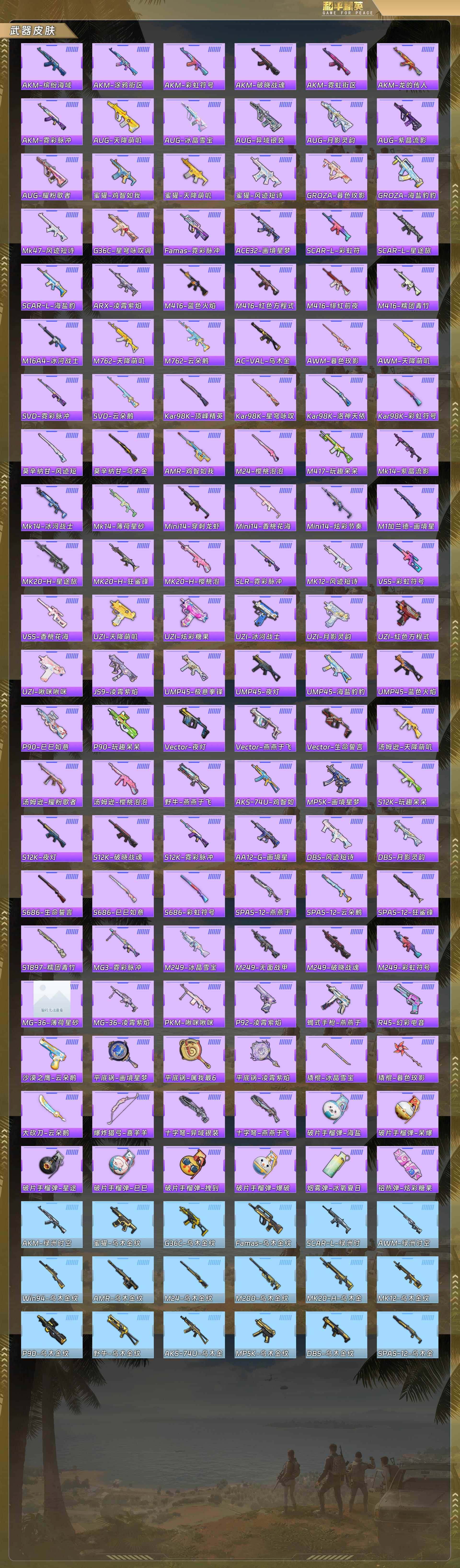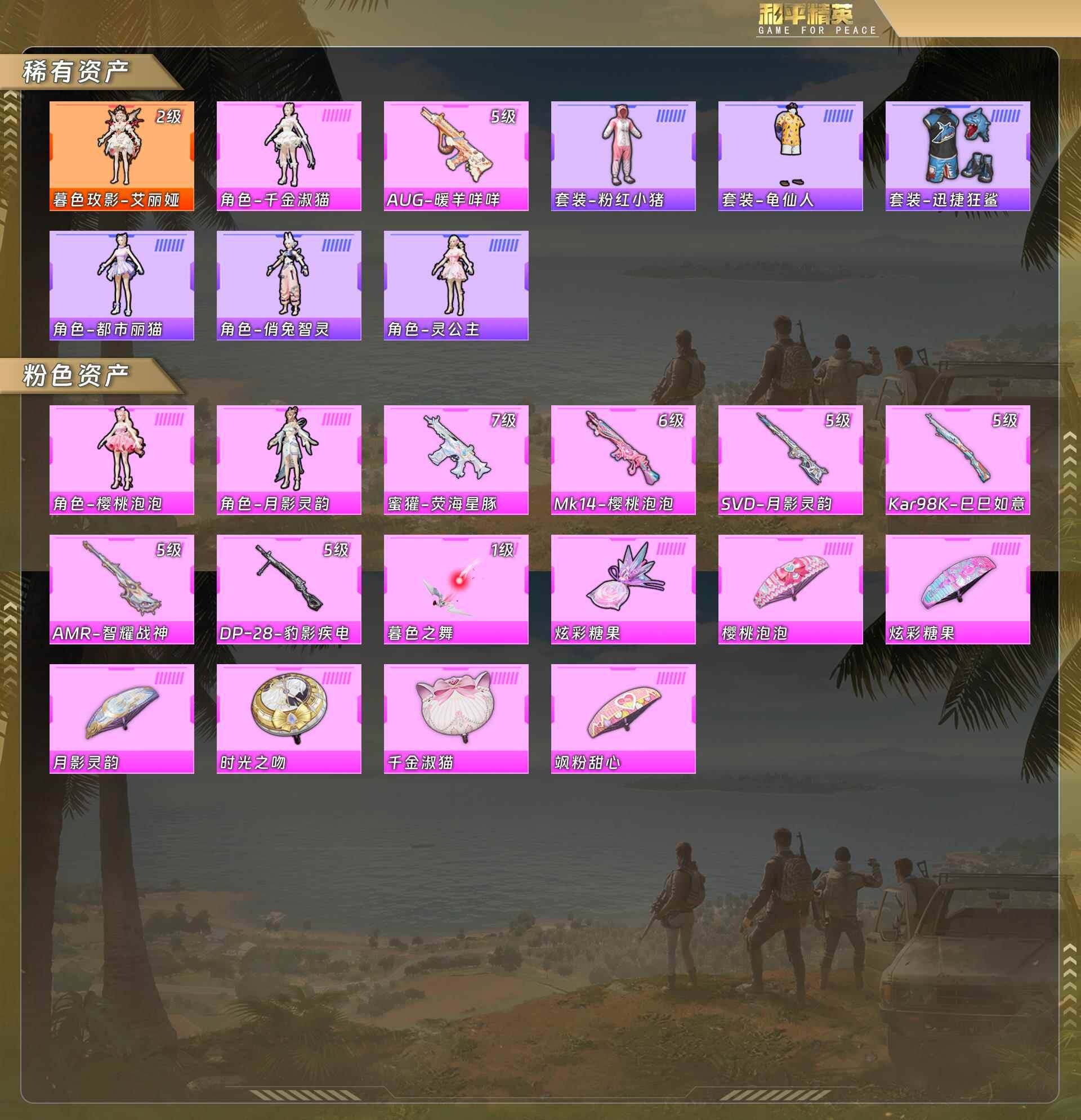 公主号/艾丽娅2级/千金淑猫/粉红小猪/龟仙人/迅捷狂鲨/都市丽猫/俏兔智灵/灵公主/樱桃泡泡/月影灵韵/aug-暖羊咩咩5级/蜜獾-荧海星豚7级/mk14-樱桃泡泡6级/svd-月影灵韵5级/98k如意5级/amr智耀战神5级/dp28豹影疾电5级/ 没战神框(1神装-3粉装-7粉呛)hp5175-2粉色飞行器-44414热力值-4王牌印记-88套装-151呛皮 【红色神装等级】:暮色玫影-艾丽娅二级 【红色角色神装】:暮色玫影-艾丽娅 【热门品类】:套装-小丑鱼,套装-龟仙人,套装-粉红小猪 【粉色套装】:角色-千金淑猫,角色-月影灵韵,角色-樱桃泡泡 【粉色呛皮等级】:aug-暖羊咩咩五级,蜜獾-荧海星豚七级,kar98k-巳巳如意五级,mk14-樱桃泡泡六级,amr-智耀战神五级,svd-月影灵韵五级,dp-28-豹影疾电五级 【粉色呛皮】:aug-暖羊咩咩,蜜獾-荧海星豚,kar98k-巳巳如意,mk14-樱桃泡泡,amr-智耀战神,svd-月影灵韵,dp-28-豹影疾电 【粉色飞行器】:暮色之舞飞行器 【粉色降落伞】:飒粉甜心降落伞,千金淑猫降落伞,月影灵韵降落伞,樱桃泡泡降落伞,时光之吻降落伞,炫彩糖果降落伞 【稀有套装】:套装-龟仙人,套装-巳巳如意,套装-雪国风尚,角色-都市丽猫,角色-俏兔智灵,套装-燕燕于飞,套装-鱼渊荷华,角色-糖霜甜心,角色-蜜桃派对,套装-星影赞美诗,套装-彩虹兔,套装-云朵鹅,套装-雪绒豹,角色-灵公主,套装-朱霞炽焰,套装-凌霄紫焰,套装-擎苍青焰,套装-书海巡游,套装-画境星梦,套装-琴音绮想,套装-炫彩糖果 【稀有呛皮】:aug-冰晶雪宝,akm-彩虹符号,akm-破晓战魂,akm-缤纷海域,akm-霓虹街区,akm-龙的传人,m416-糯团青竹,m416-红色方程式,m416-绯红前夜,m416-蓝色火焰,groza-暮色玫影,aug-天降萌叽,aug-耀粉歌者,aug-月影灵韵,m762-天降萌叽,m762-云朵鹅,g36c-星穹咏叹调,蜜獾-天降萌叽,ace32-画境星梦,arx-凌霄紫焰,uzi-啾咪啾咪,uzi-天降萌叽,uzi-红色方程式,uzi-月影灵韵,ump45-夜灯,ump45-蓝色火焰,ump45-极意拳锋,vect-夜灯,vect-生命誓言,汤姆逊-天降萌叽,汤姆逊-耀粉歌者,汤姆逊-樱桃泡泡,mp5k-画境星梦,js9-凌霄紫焰,p90-巳巳如意,kar98k-彩虹符号,kar98k-洛神天依,kar98k-星穹咏叹调,m24-樱桃泡泡,awm-暮色玫影,vss-彩虹符号,mini14-炫彩节奏,mini14-穿刺龙虾,mk20-h-樱桃泡泡,svd-云朵鹅,m1加兰德-画境星梦,s686-彩虹符号,s686-生命誓言,s686-巳巳如意,s12k-玩趣呆呆,s12k-破晓战魂,s12k-夜灯,dbs-月影灵韵,aa12-g-画境星梦,spas-12-云朵鹅,m249-彩虹符号,m249-破晓战魂,mg-36-凌霄紫焰,p92-凌霄紫焰,r45-幻彩电音,沙墨之鹦-云朵鹅,爆炸猎弓-喜羊羊与灰太狼,大砍刀-云朵鹅,撬棍-暮色玫影,平底锅-凌霄紫焰,平底锅-画境星梦,破片手留单-巳巳如意 【其他套装】:套装-ss18特训,套装-ss19特训,套装-ss23特训,套装-ss24特训,套装-ss25特训,套装-ss26特训,套装-ss27特训,套装-光之冒险,套装-幻世战舞者,套装-旭日情侣,套装-春日漫步,套装-暗黑骑手,套装-柠萌假日,套装-海岛探路者,套装-滨海厨神,套装-特战装甲,套装-王牌教练,套装-甜蜜告白,套装-白色伏地魔,套装-破蛋小黄鸡,套装-空岛之星,套装-竞技名士,套装-粉红小猪,套装-缤纷果语,套装-街头潮人,套装-长空猛禽,套装-霓虹街区,套装-青涩时光,套装-魅力单车,套装-黑色伏地魔,套装-龙的传人,套装-龟仙人,套装-迅捷狂鲨 【稀有头盔】:深海小丑鱼头盔1级 【营地id】:962693894
